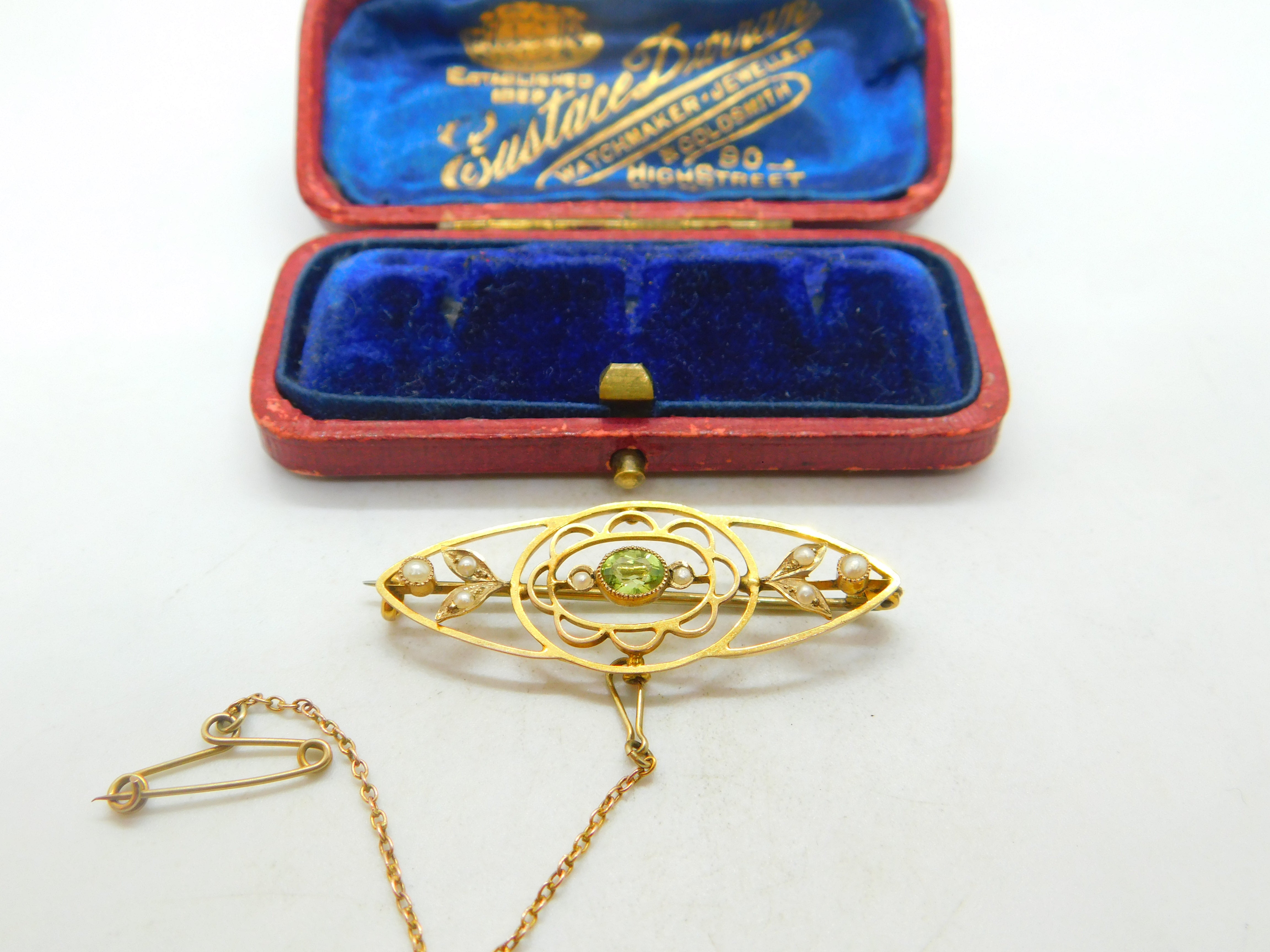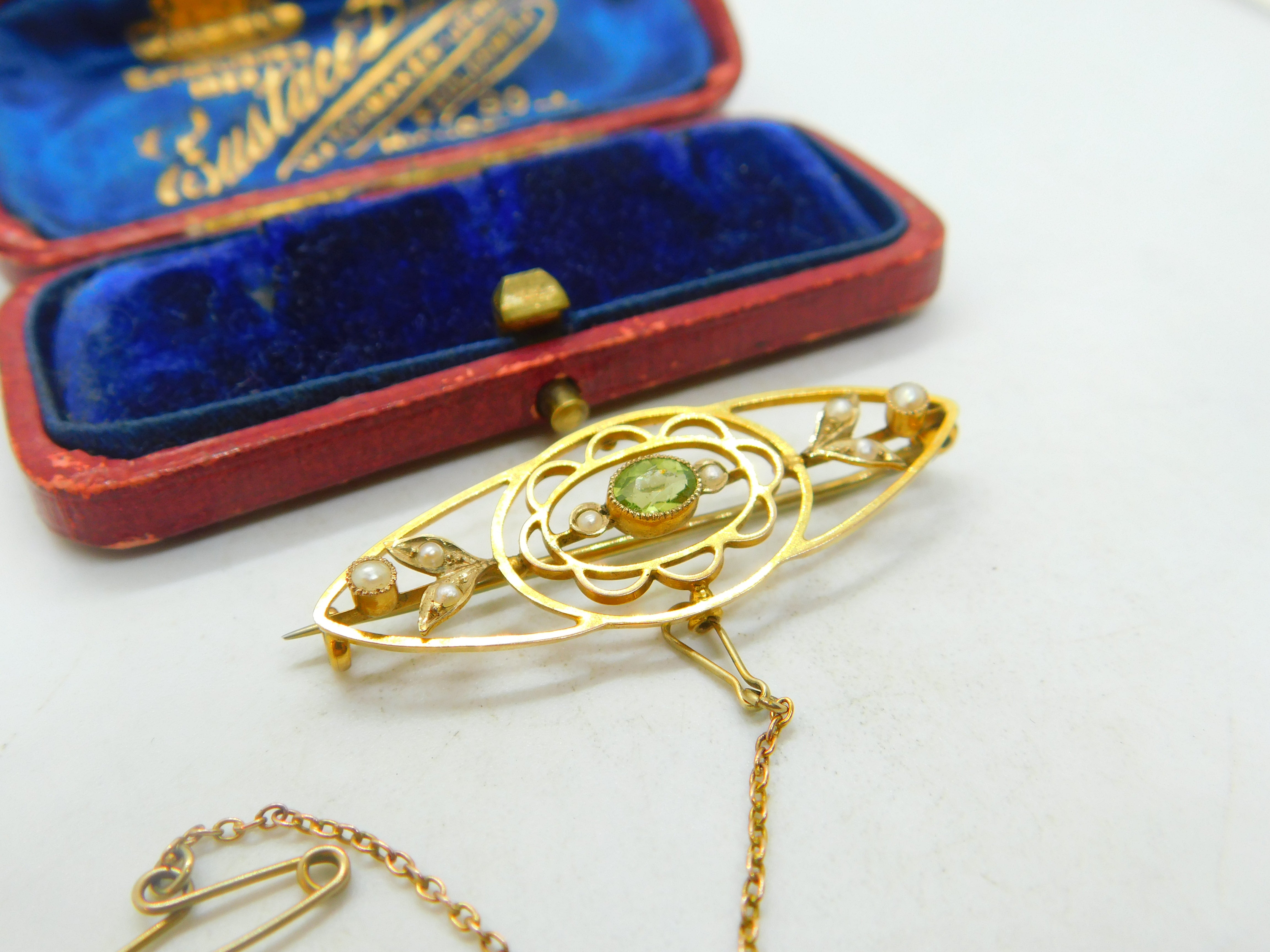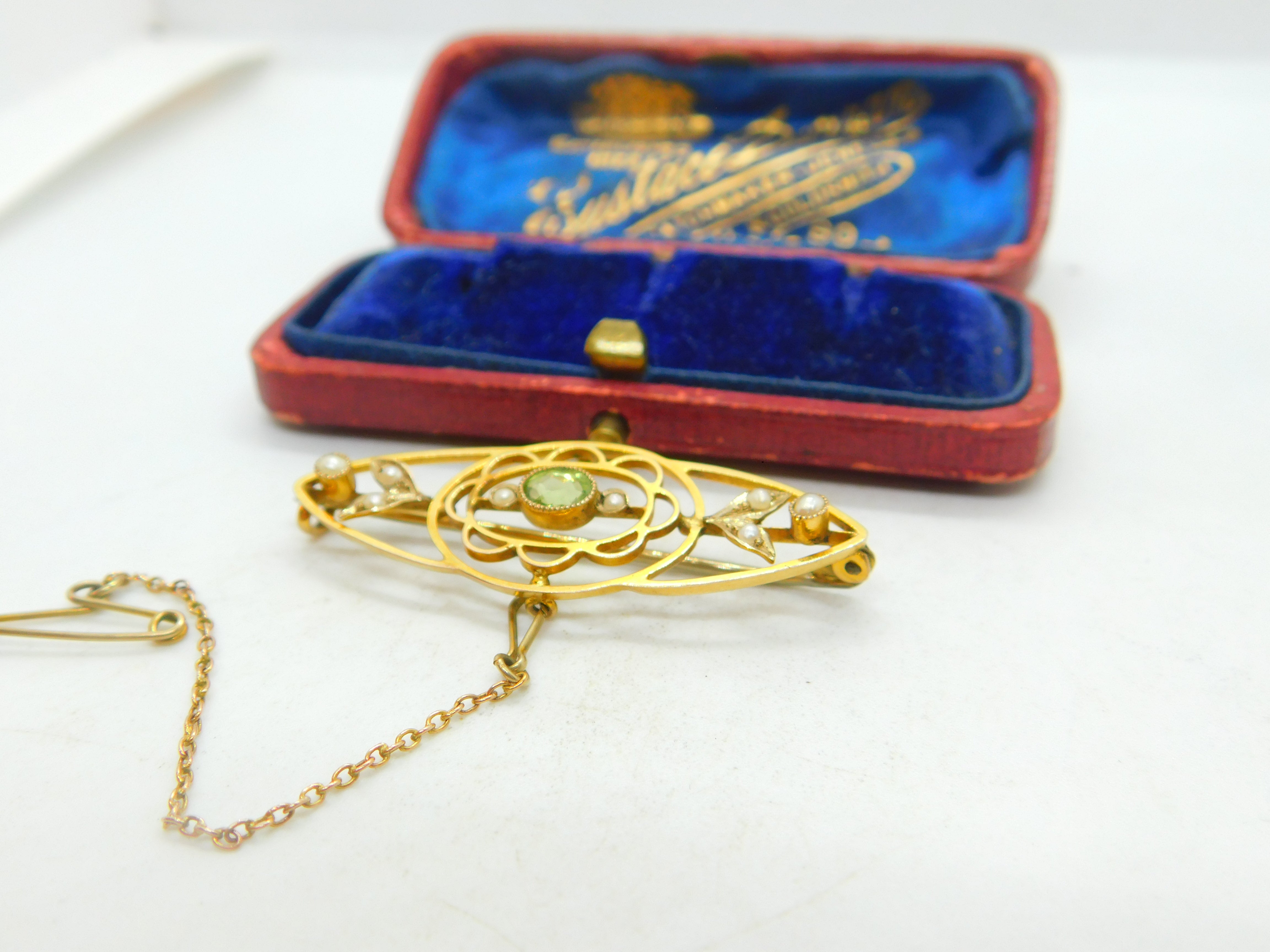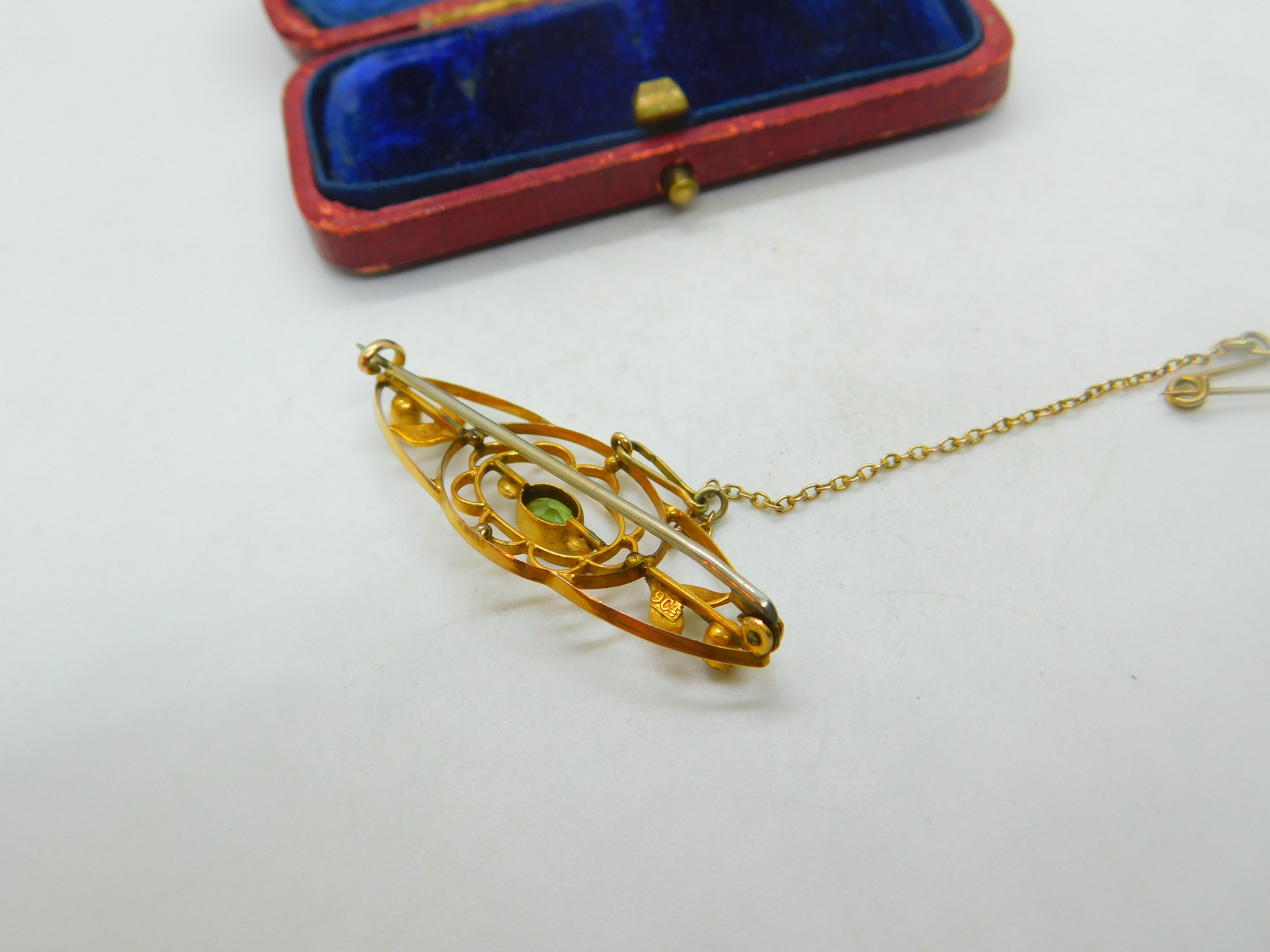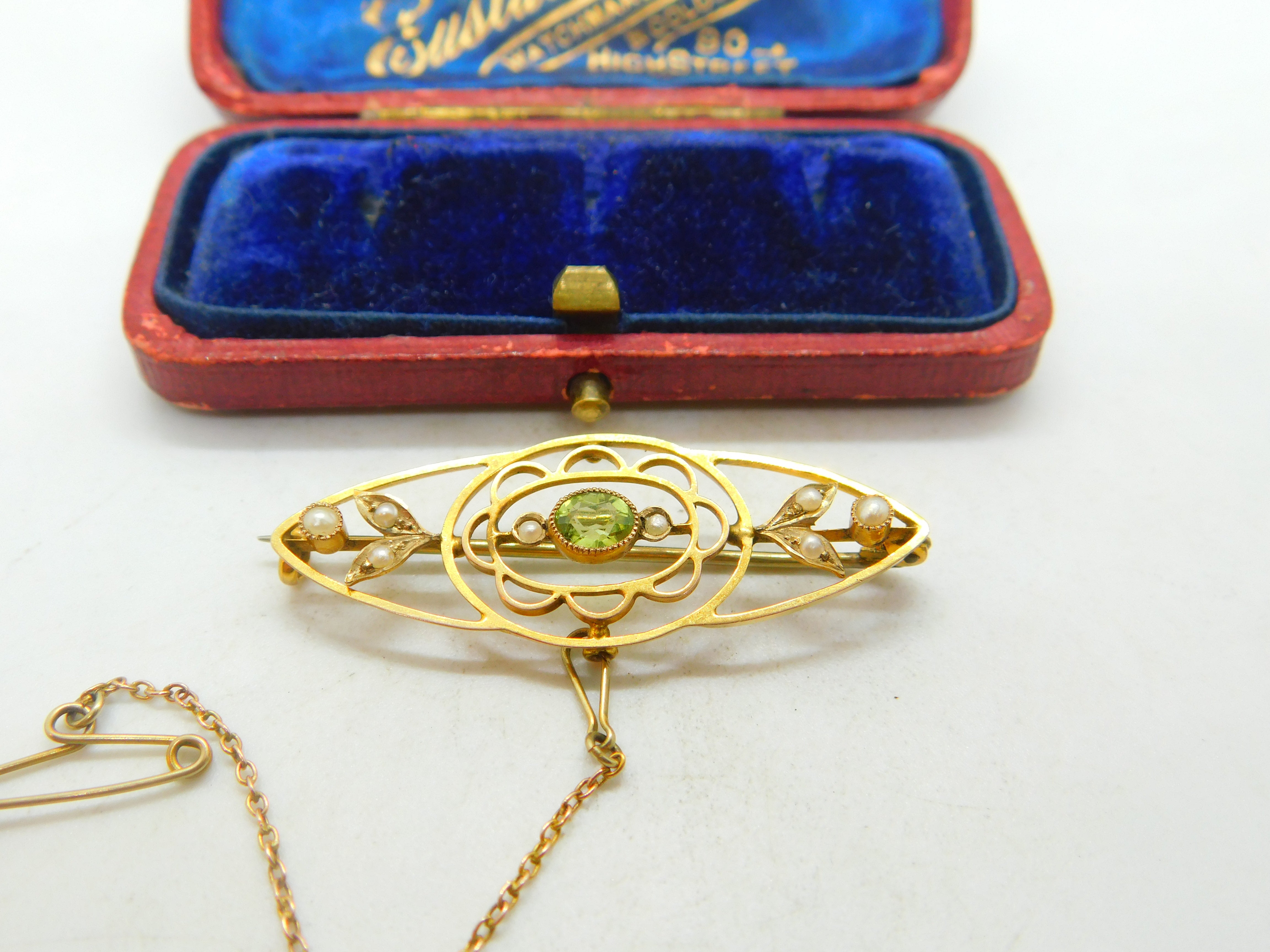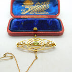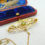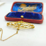 9ct Yellow Gold, Peridot & Seed Pearl Sweetheart Brooch Antique c1910 Edwardian