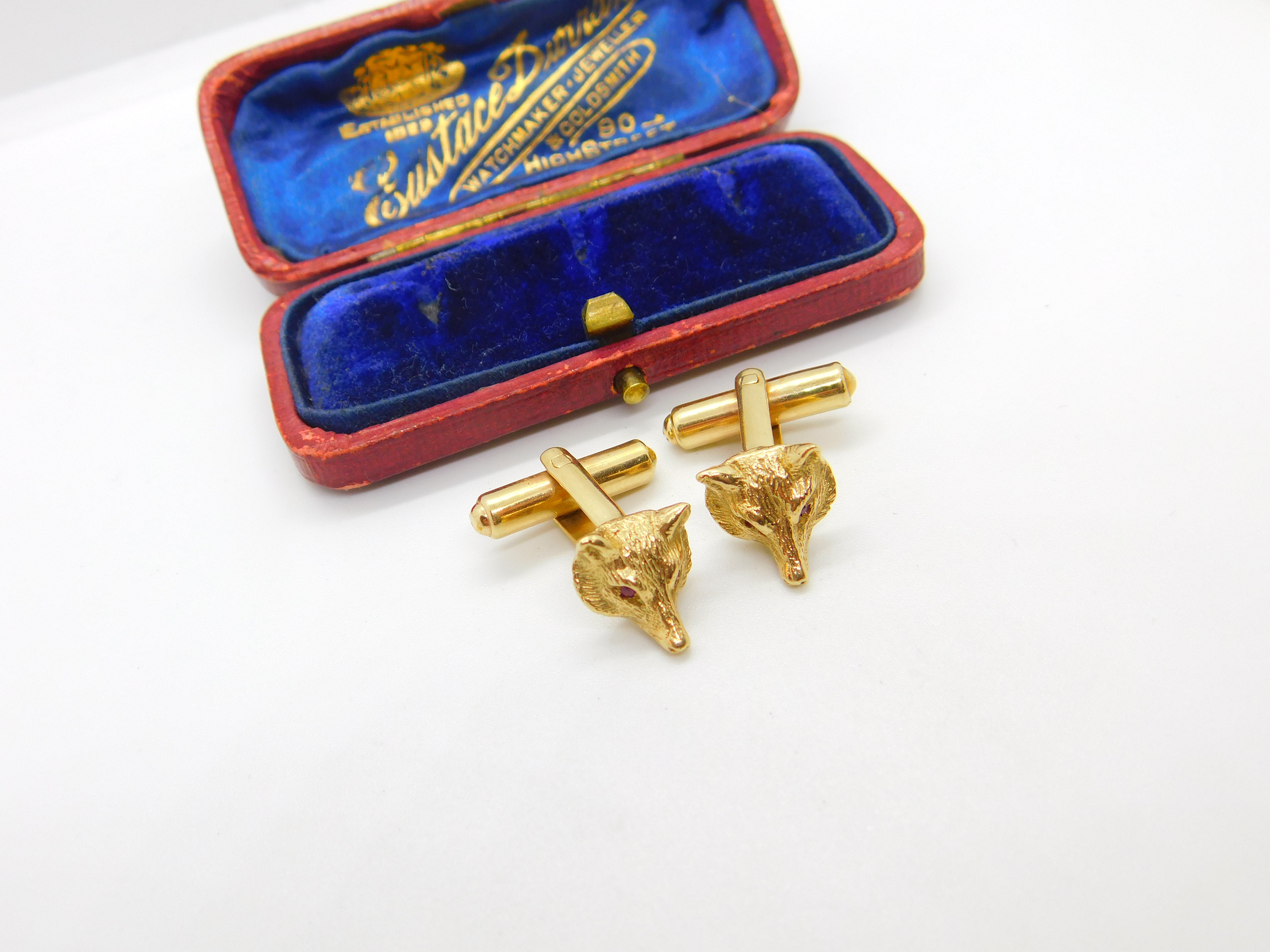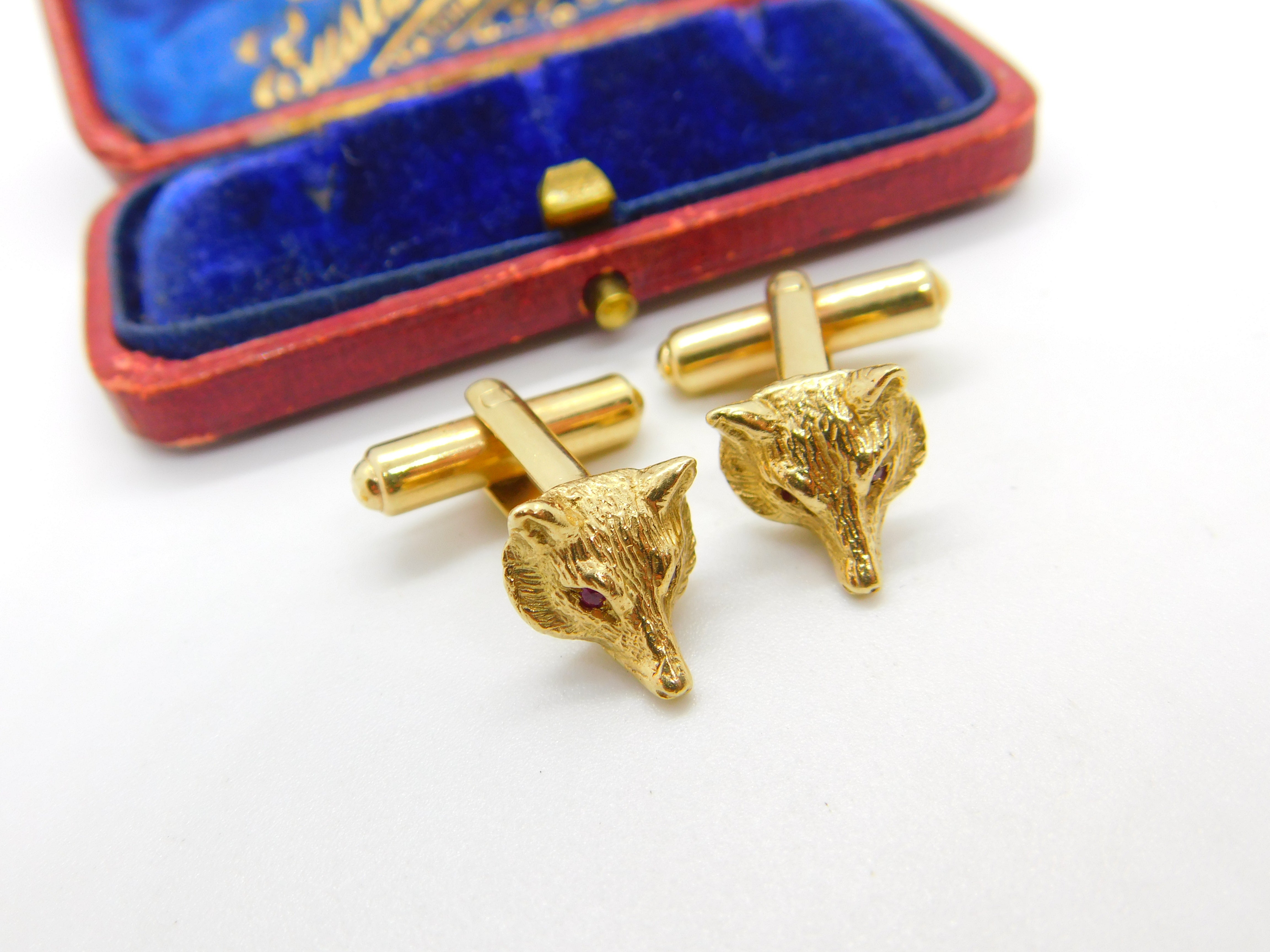 Details: A fantastic and wonderfully designed pair of vintage 9ct yellow gold gents fox mask hunting interest cufflinks with the foxes heads set with rubies to the eyes hallmarked to the reverse c1980. This is a wonderful item that would make a perfect gift or addition to any collection. The BOX pictured is for PRESENTATION ONLY and is NOT included in the listings but used to frame the pictures unless specifically stated otherwise.