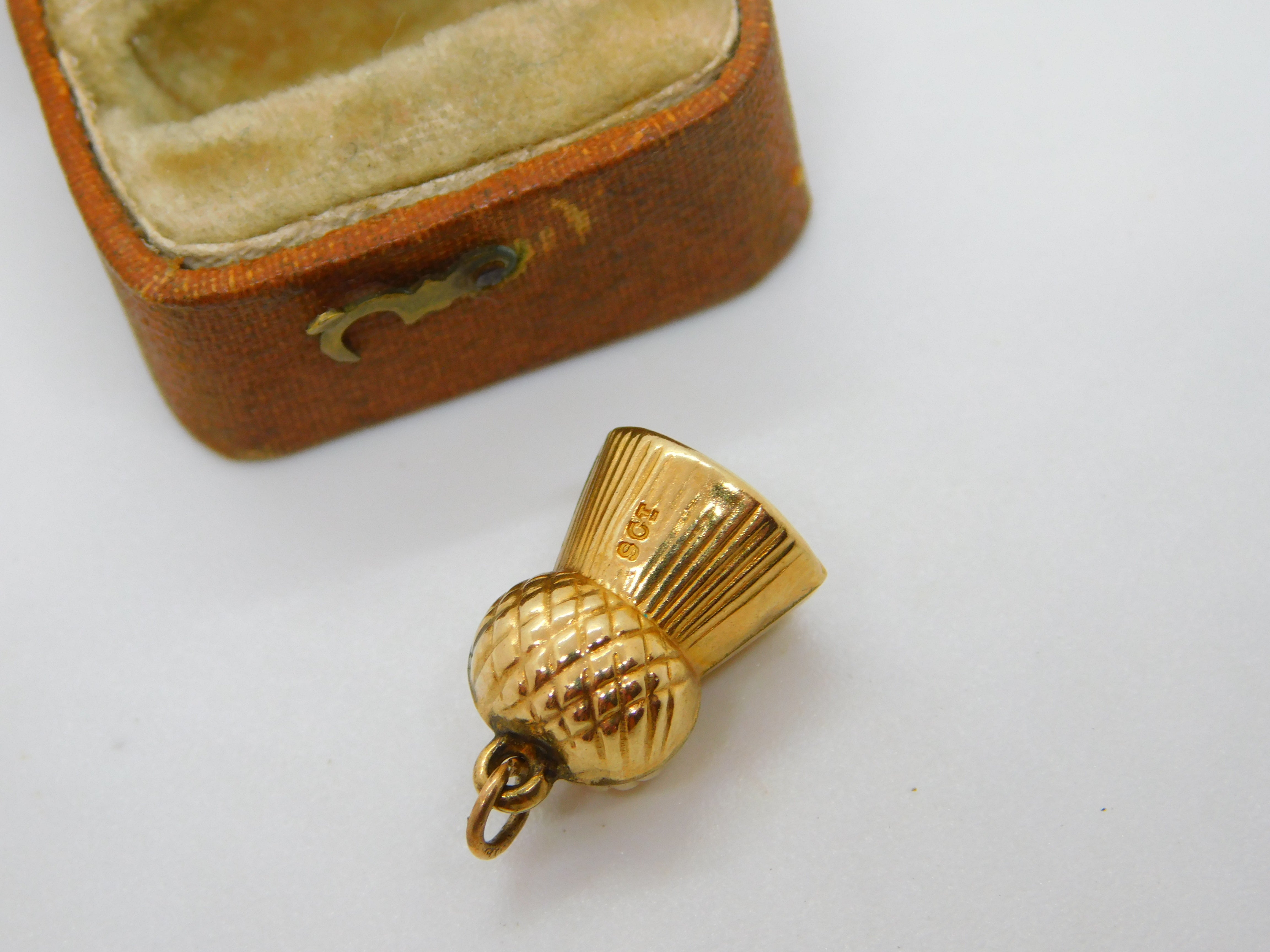 Details: A fantastic and wonderfully designed vintage 9ct yellow gold Scottish thistle charm pendant hallmarked London 1955 to the edge. This is a wonderful item that would make a perfect gift or addition to any collection. The BOX pictured is for PRESENTATION ONLY and is NOT included in the listings but used to frame the pictures unless specifically stated otherwise.
