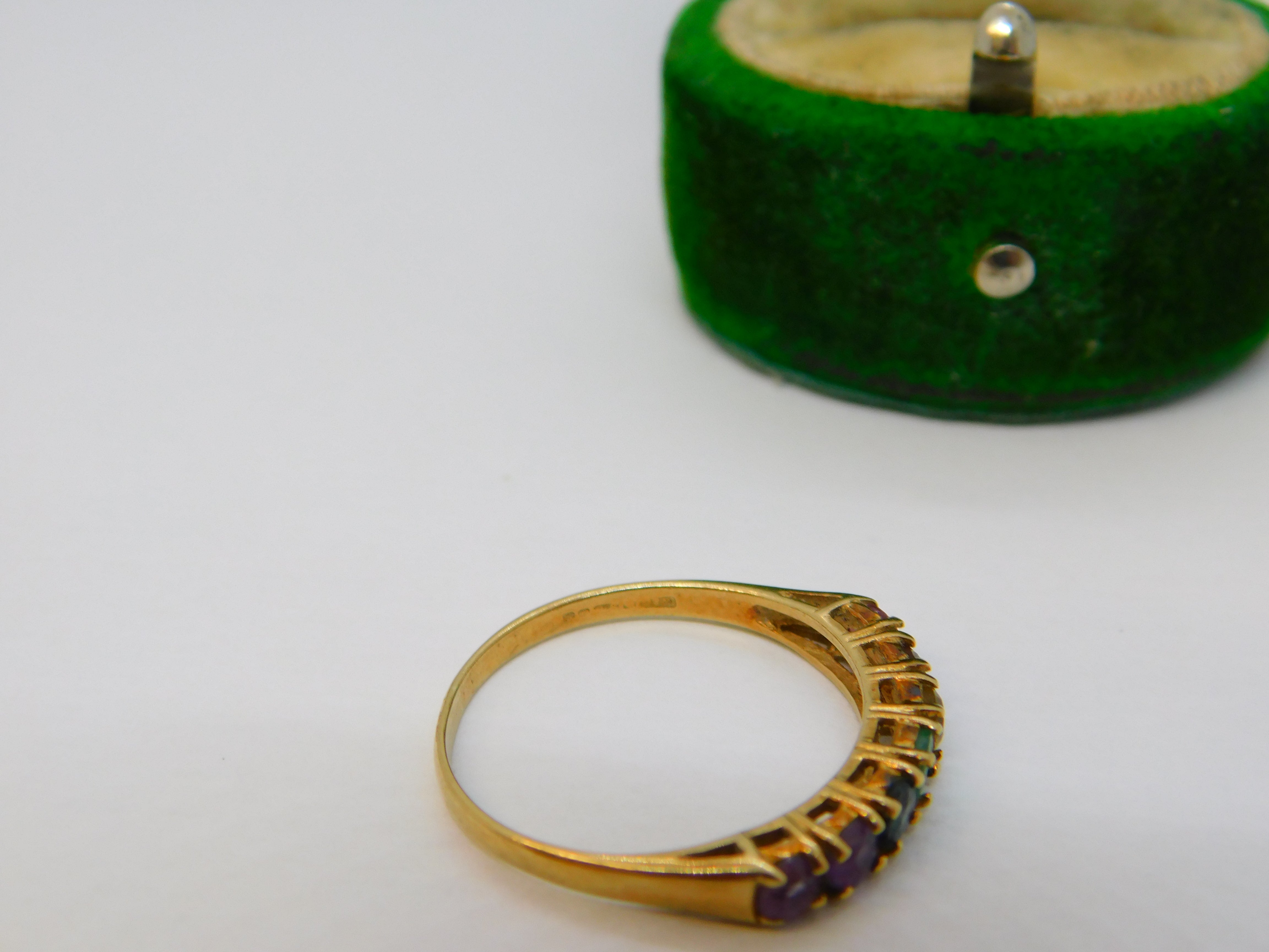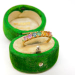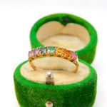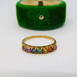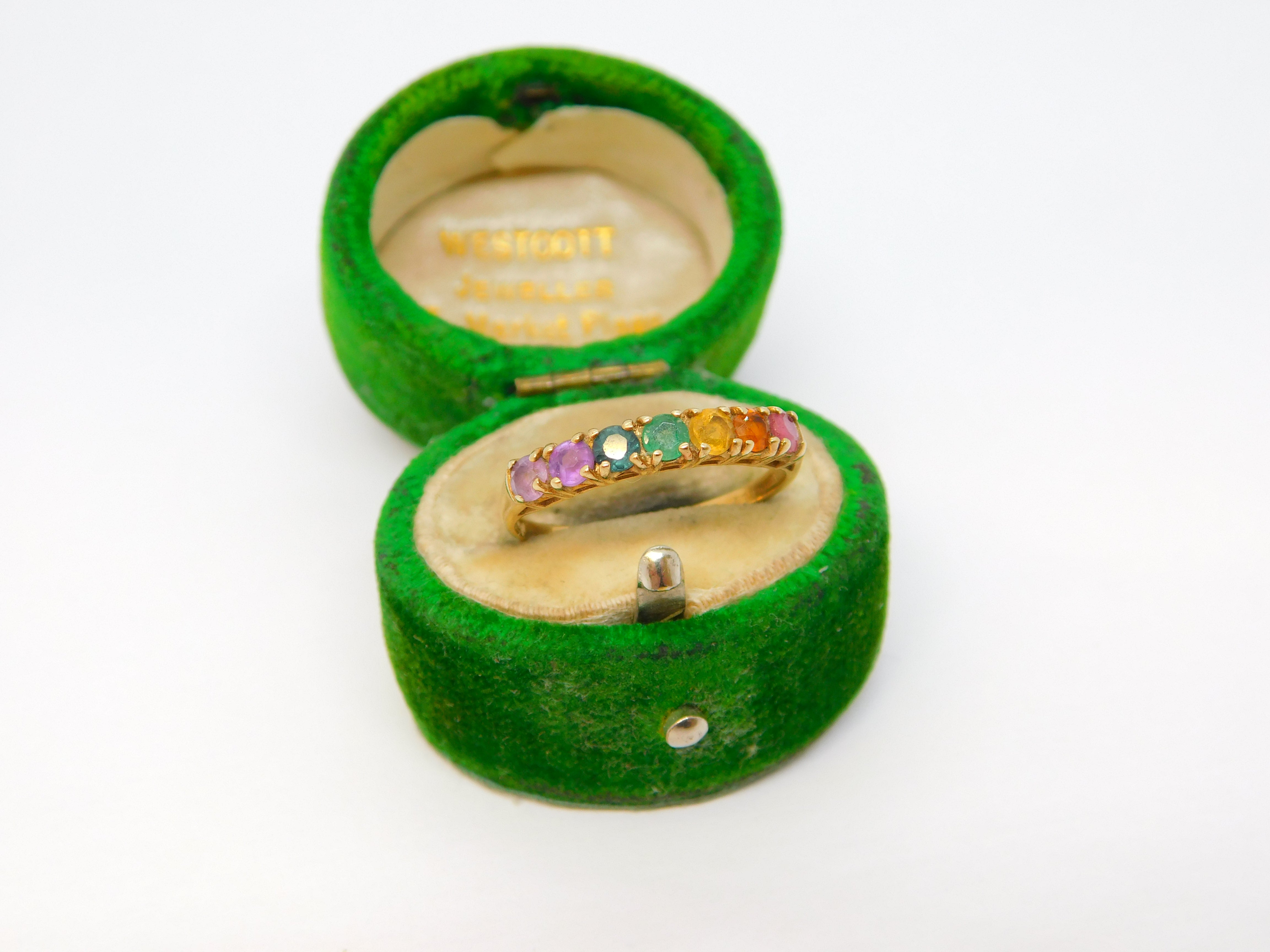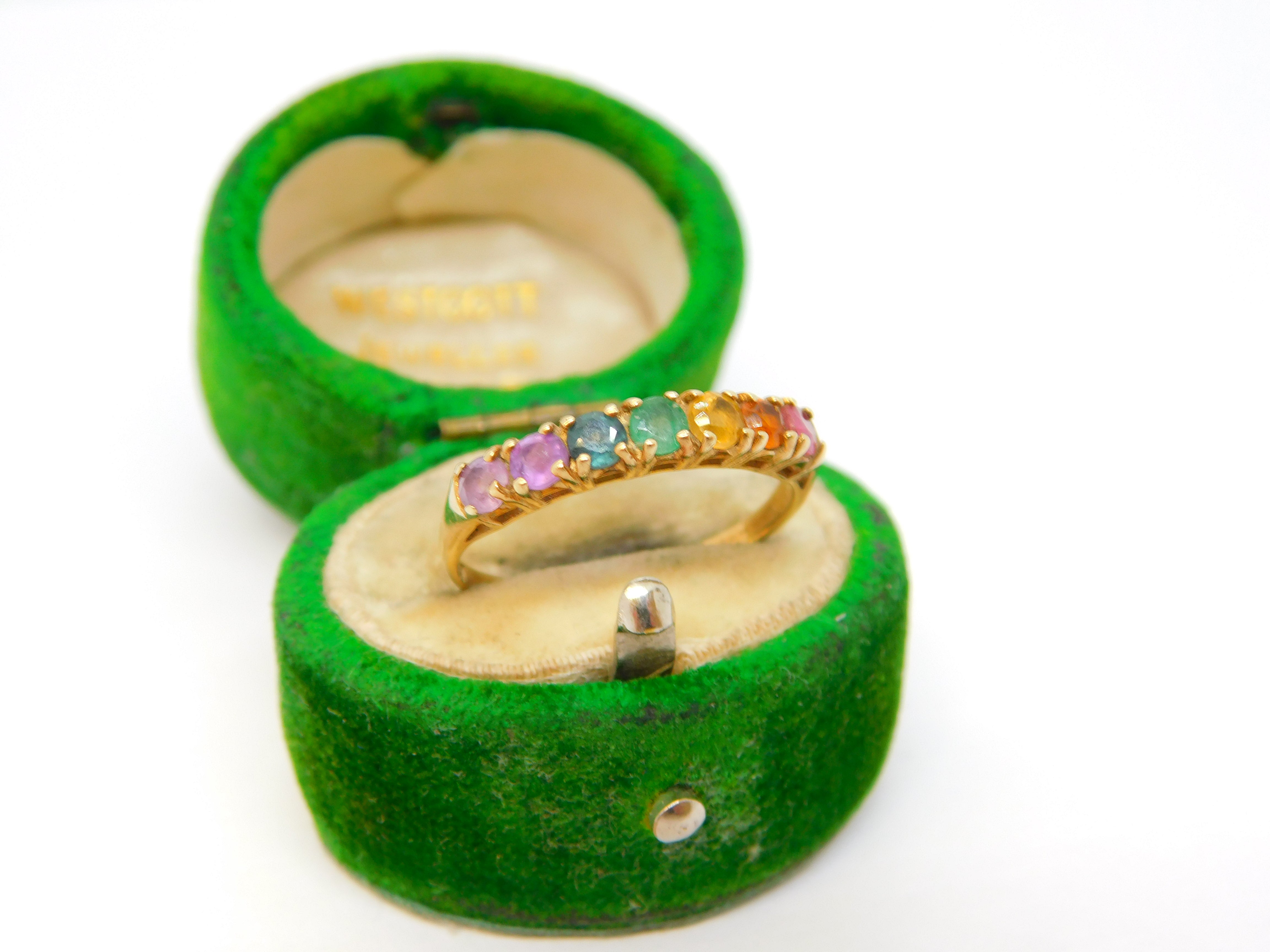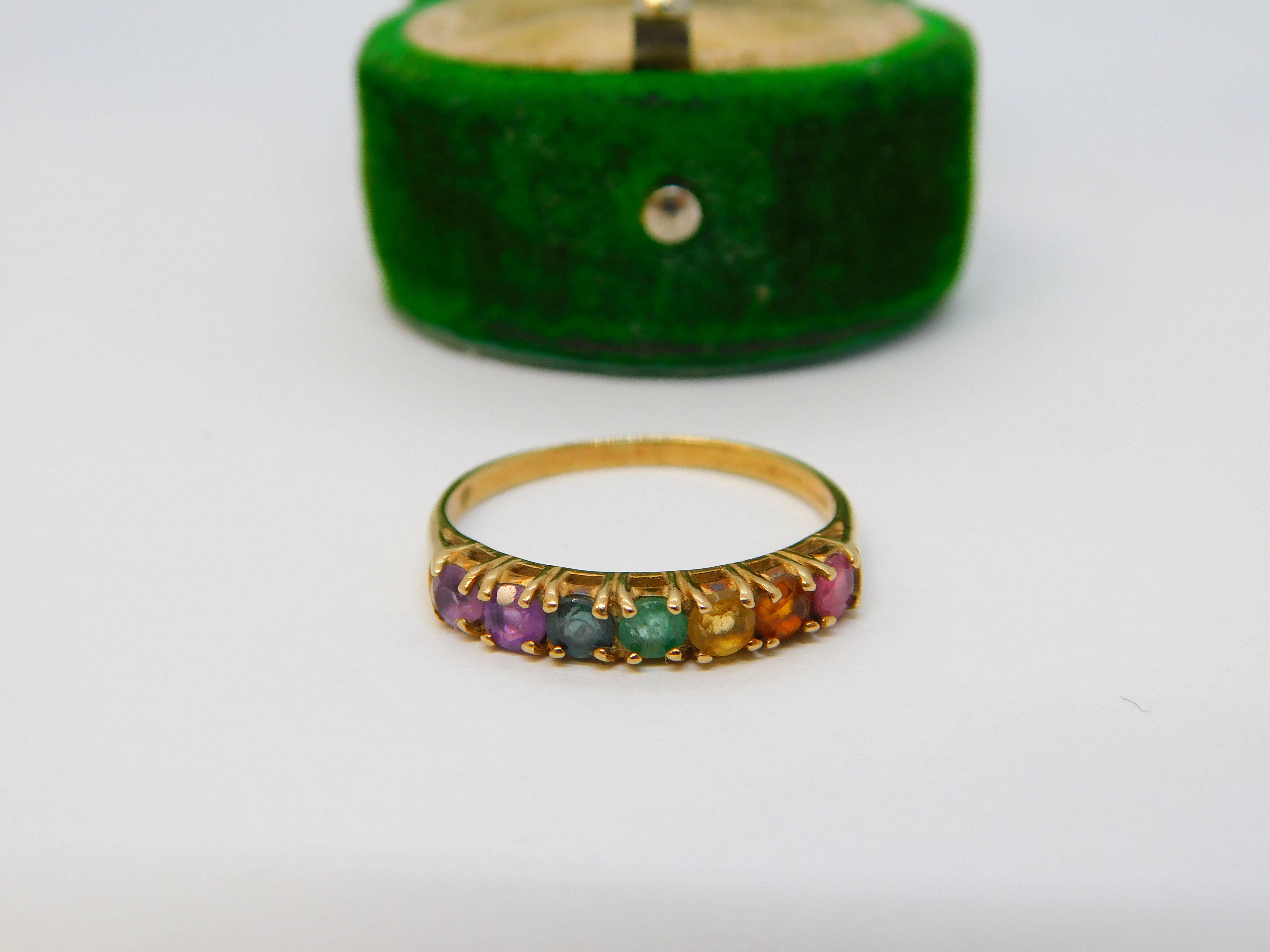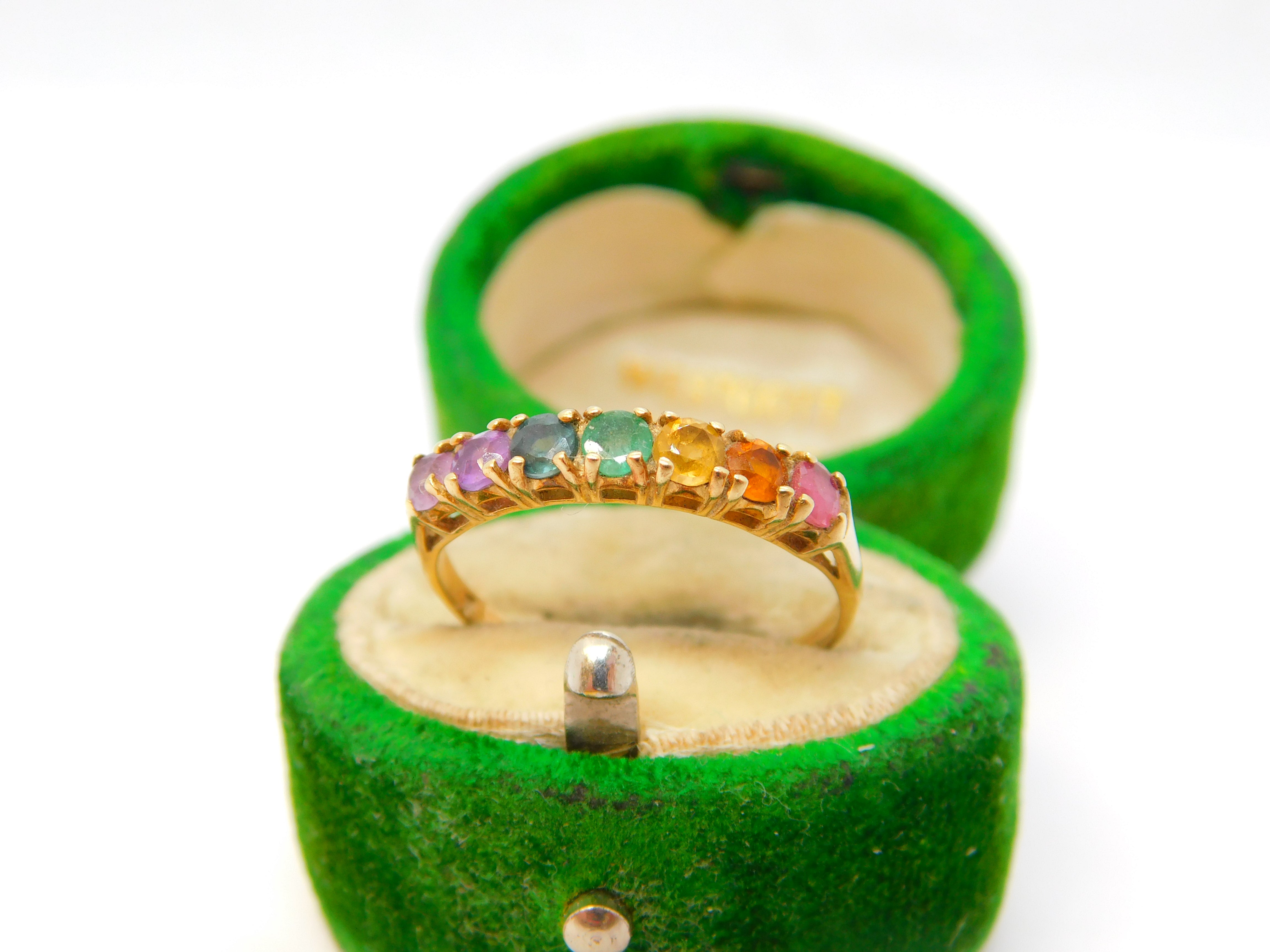 Details: A fantastic and wonderfully designed vintage 9ct yellow gold dress ring set with seven stones noting the seven colours of the rainbow - Ruby for Red, Topaz for Orange, Citrine for Yellow, Emerald for Green, Sapphire for Blue , Amethyst for Indigo & Lighter amethyst for Violet, hallmarked Birmingham 1991 to the interior, the stones have been tested. This is a wonderful item that would make a perfect gift or addition to any collection. The BOX pictured is for PRESENTATION ONLY and is NOT included in the listings but used to frame the pictures unless specifically stated otherwise.