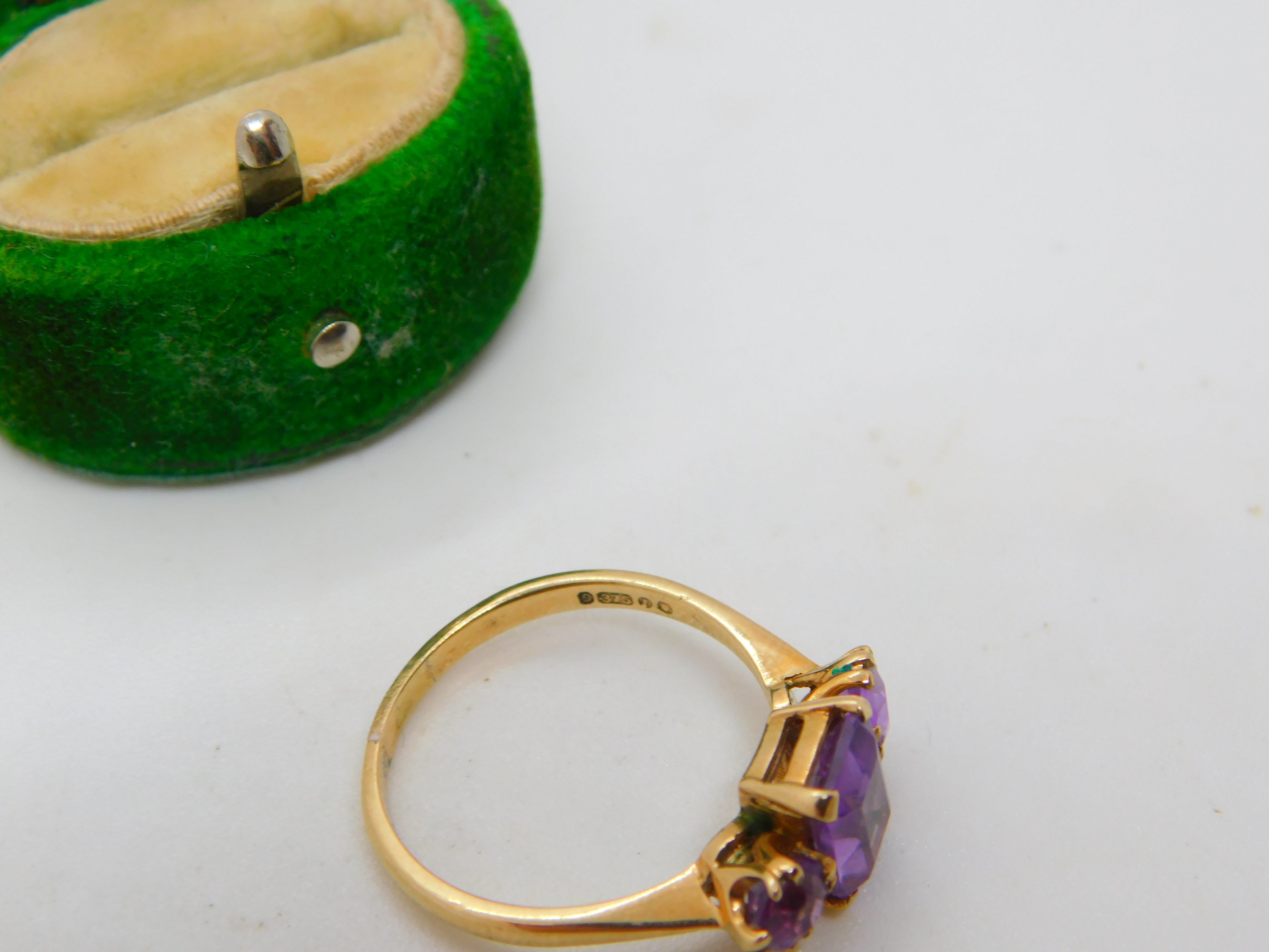 Details: A fantastic and wonderfully designed vintage 9ct yellow gold three-stone amethyst dress ring hallmarked London 1966 to the interior. This is a wonderful item that would make a perfect gift or addition to any collection. The BOX pictured is for PRESENTATION ONLY and is NOT included in the listings but used to frame the pictures unless specifically stated otherwise.