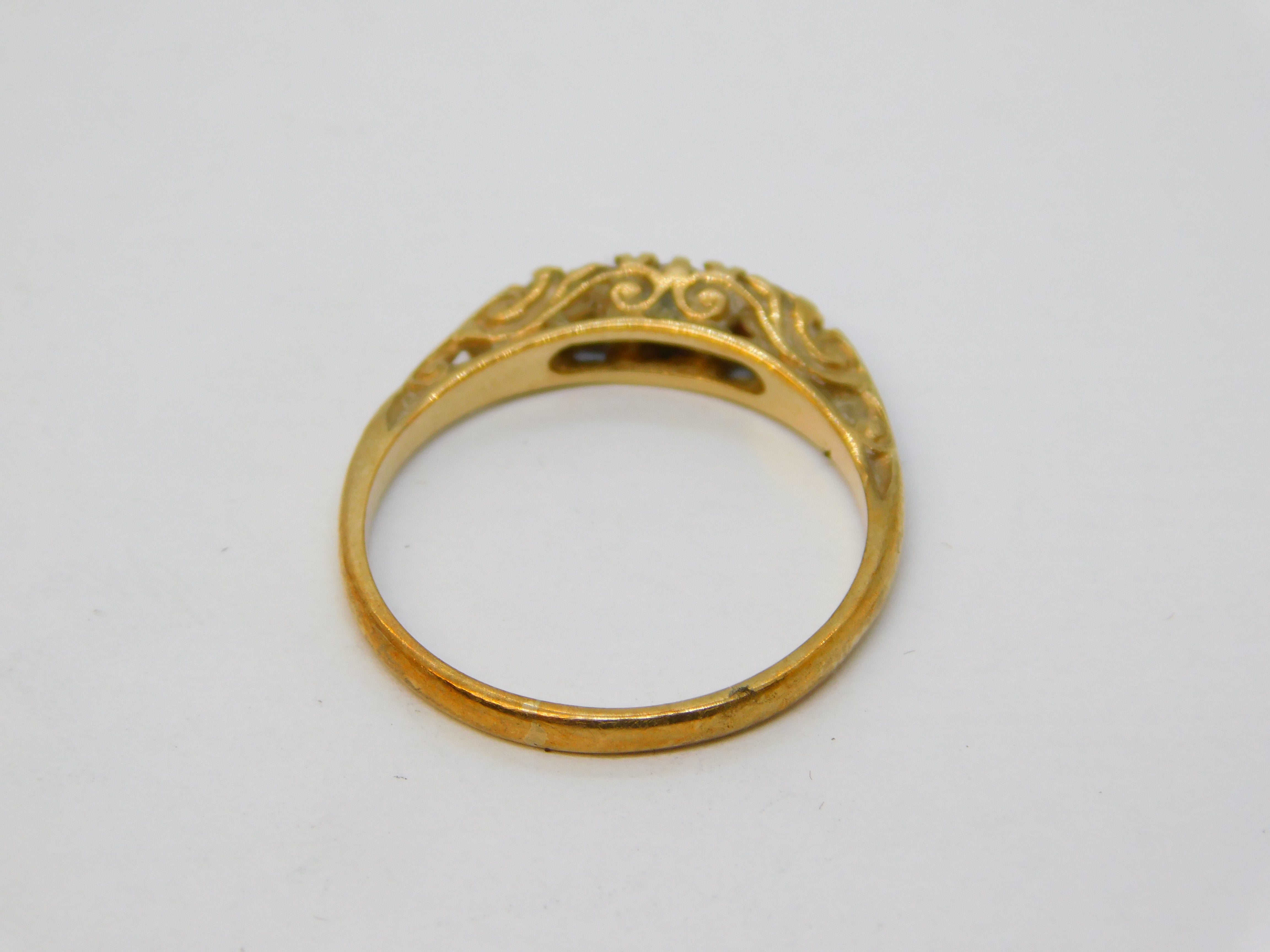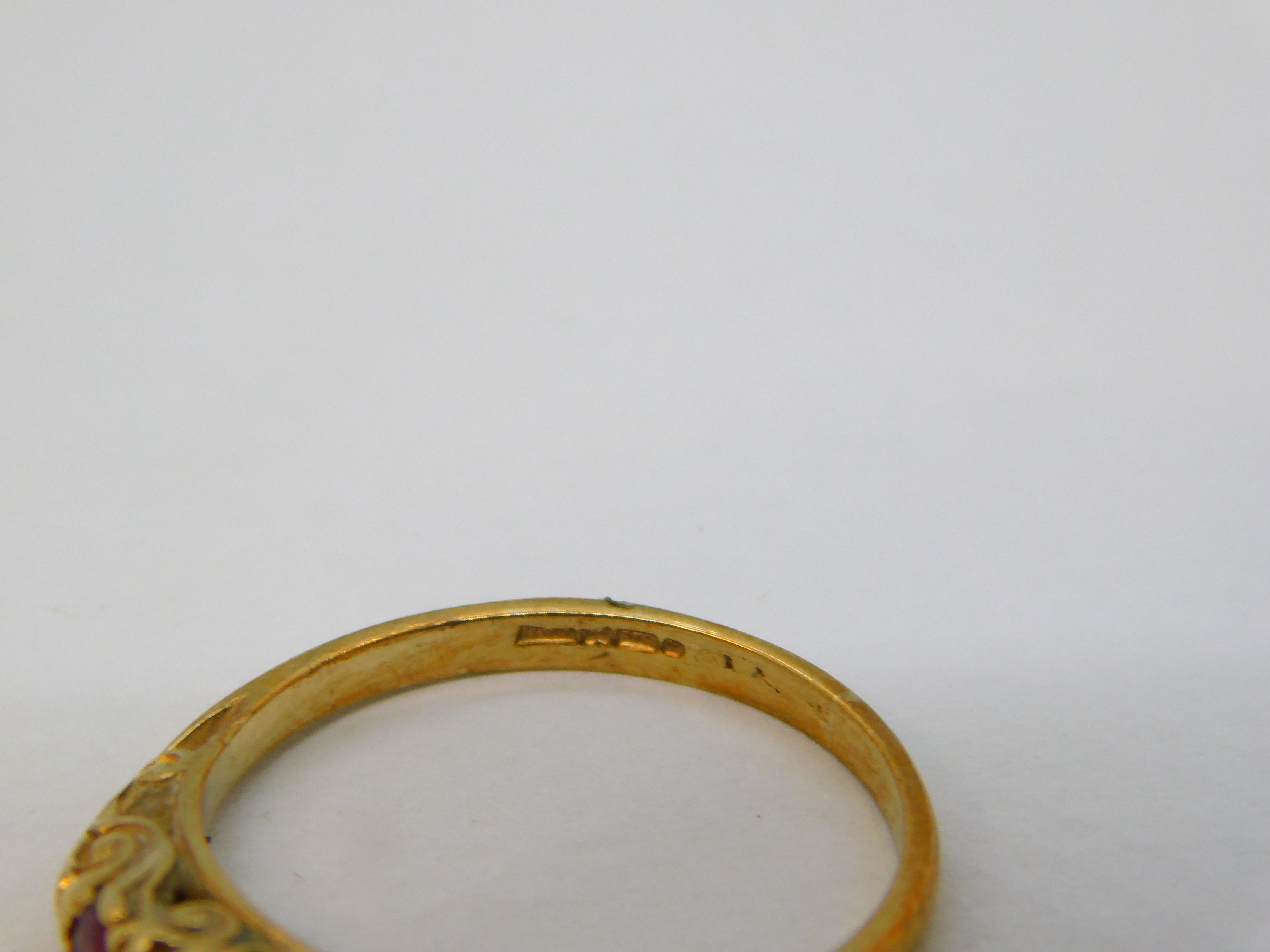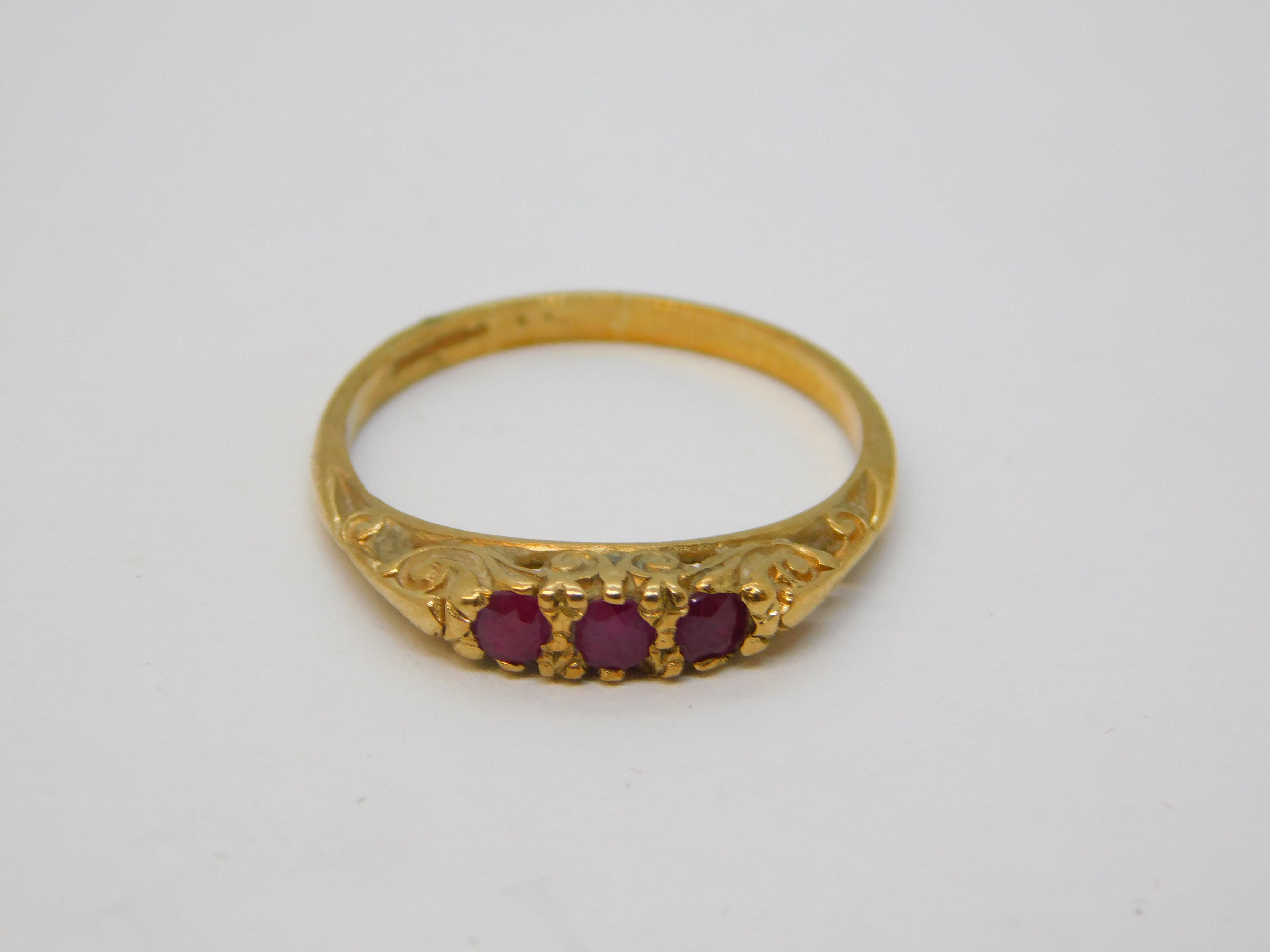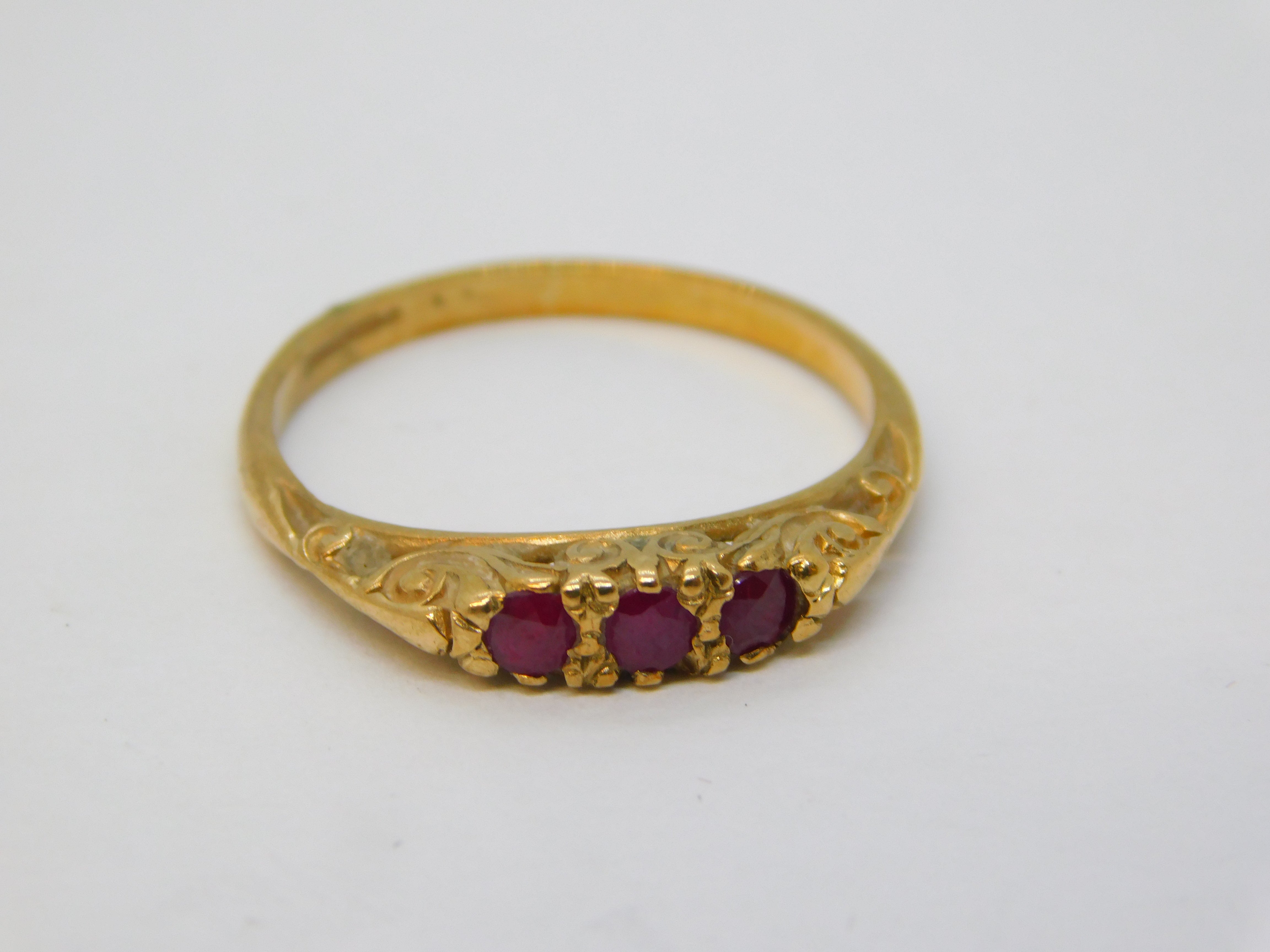 Details: A fantastic and wonderfully designed vintage 9ct yellow gold three-stone ruby ring with lovely detailing hallmarked Birmingham c1990 to the interior band, the rubies have been tested. This is a wonderful item that would make a perfect gift or addition to any collection.