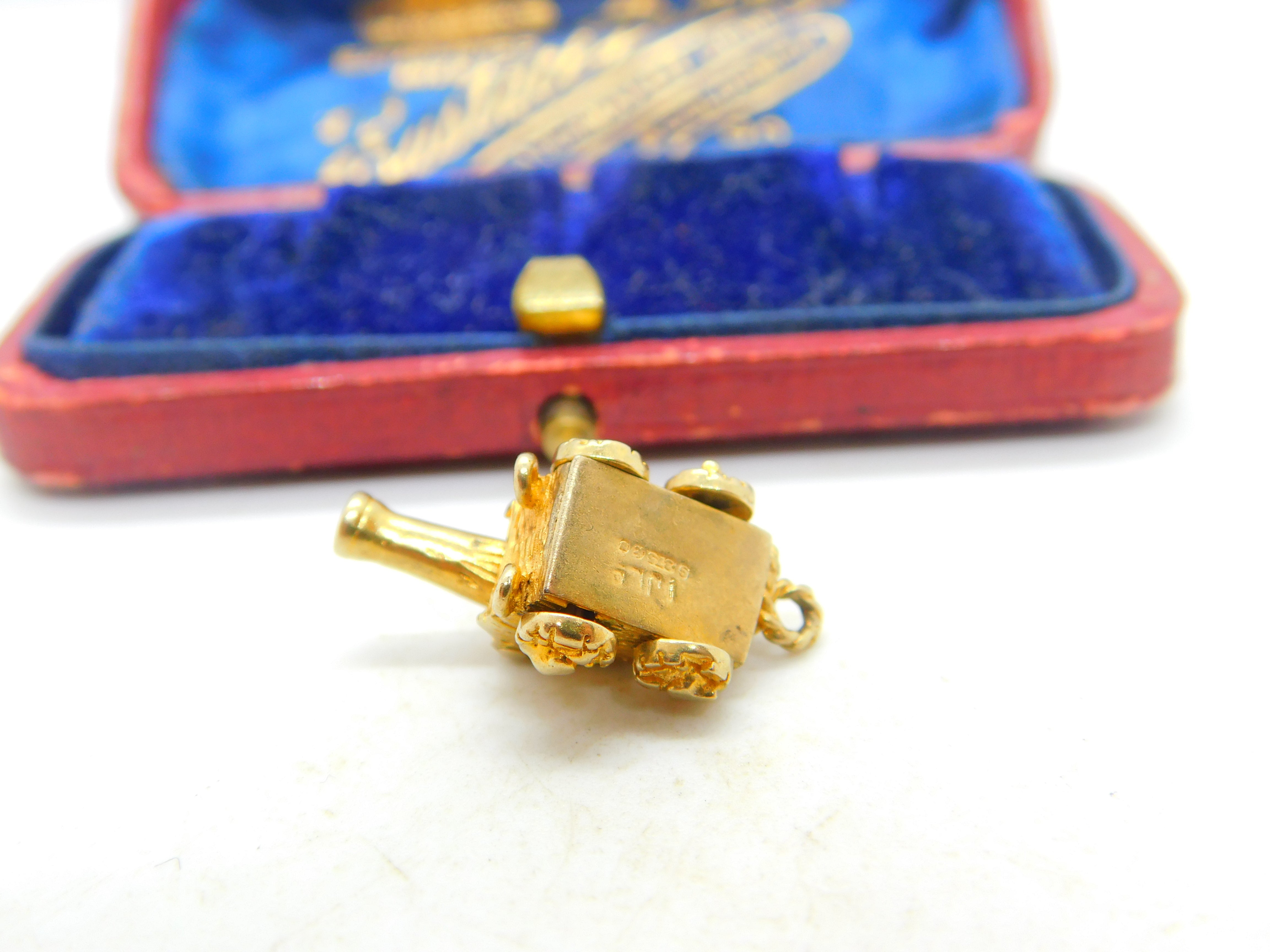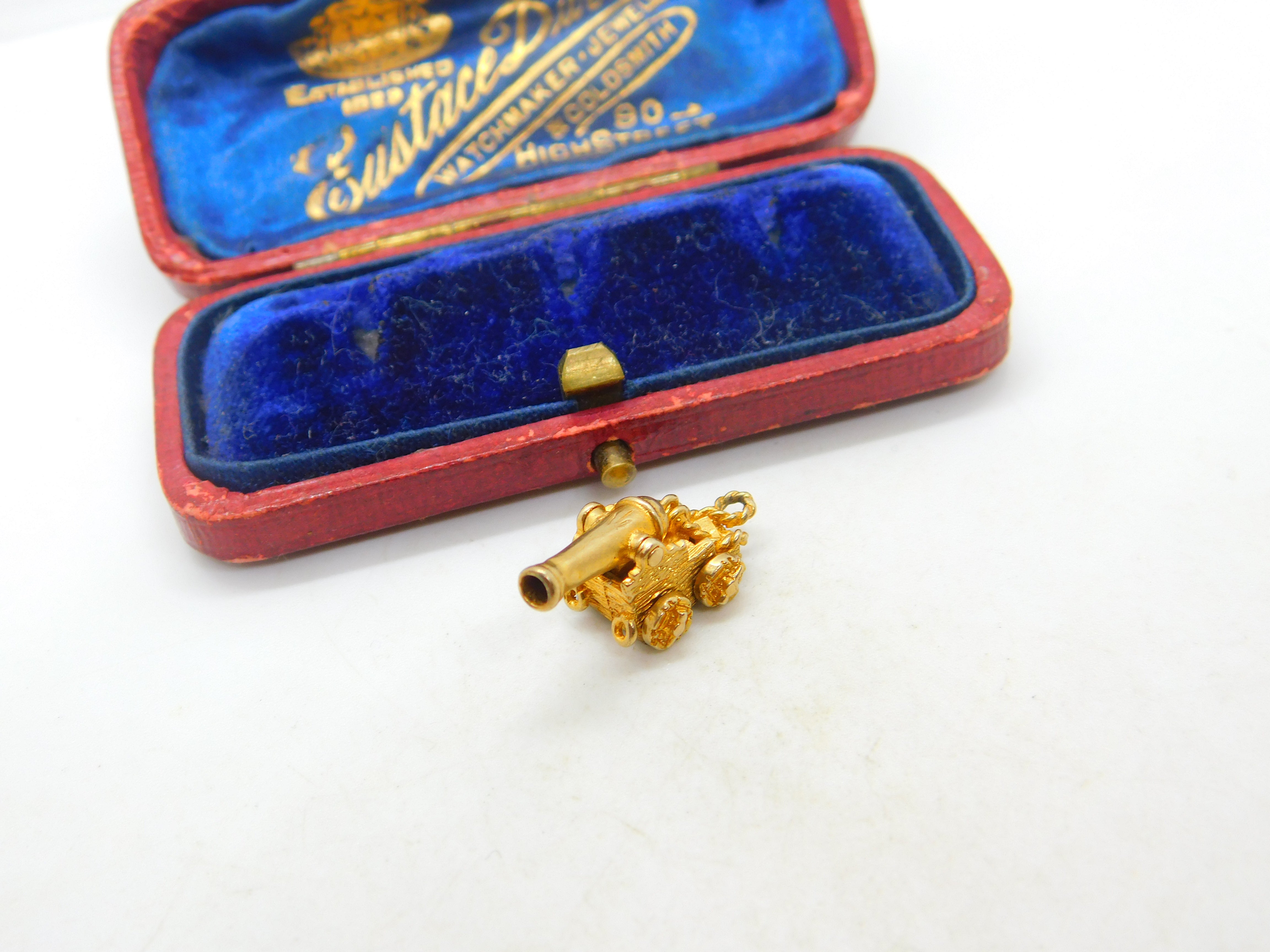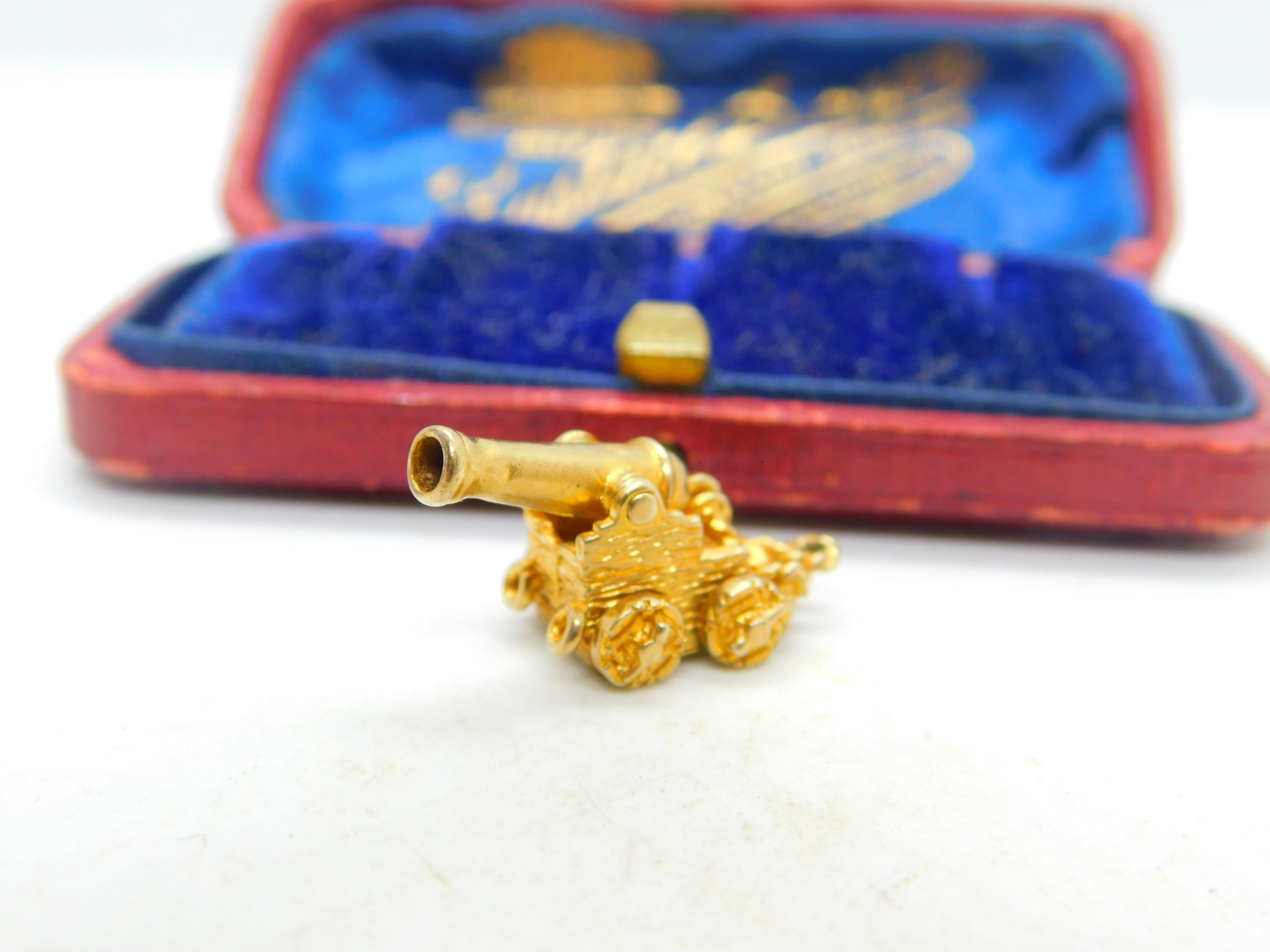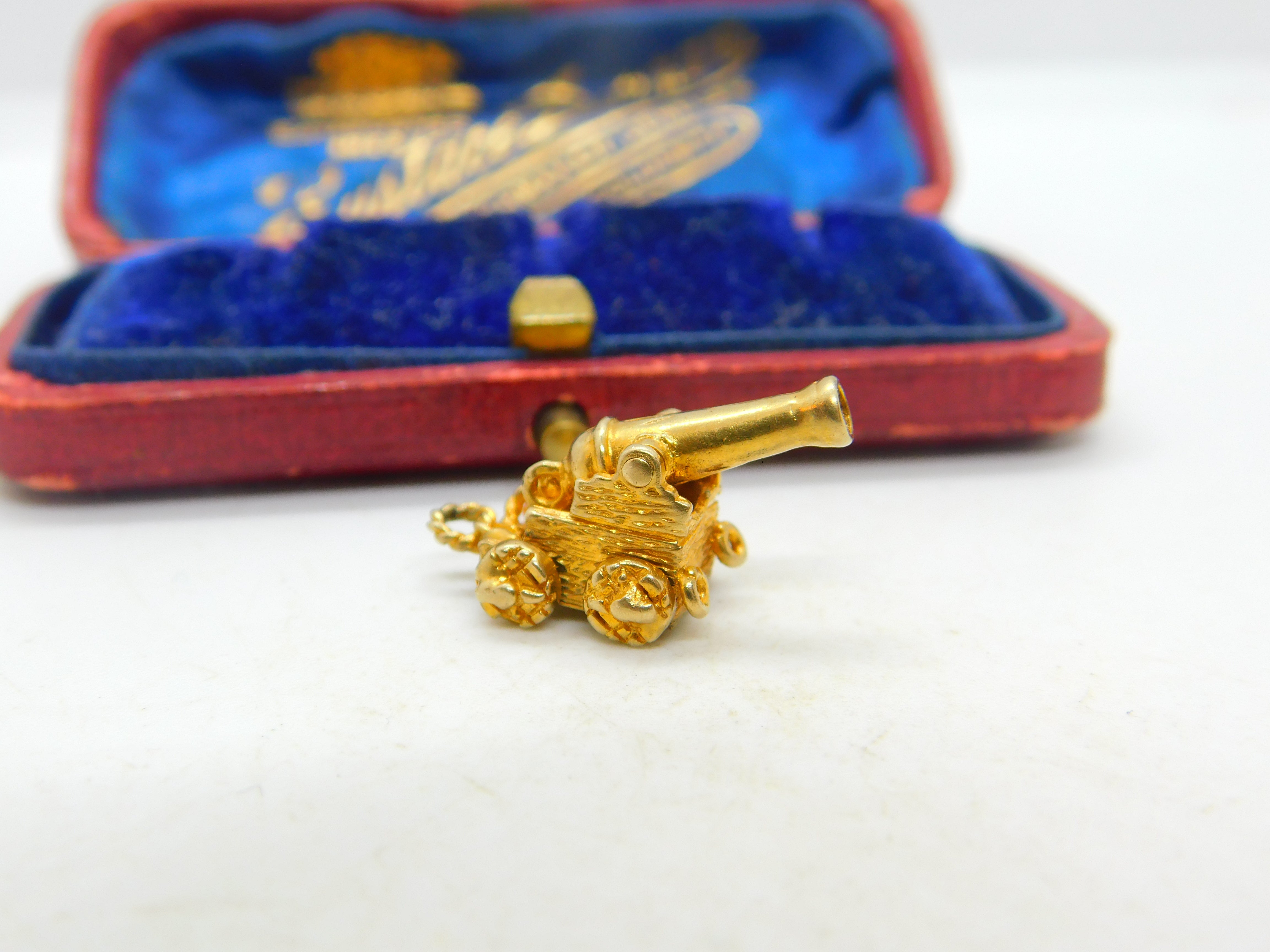 Details: A fantastic and wonderfully designed vintage 9ct yellow gold charm pendant in the form of a traditional cannon with great articulated design hallmarked London 1965 to the base. This is a wonderful item that would make a perfect gift or addition to any collection. The BOX pictured is for PRESENTATION ONLY and is NOT included in the listings but used to frame the pictures unless specifically stated otherwise.