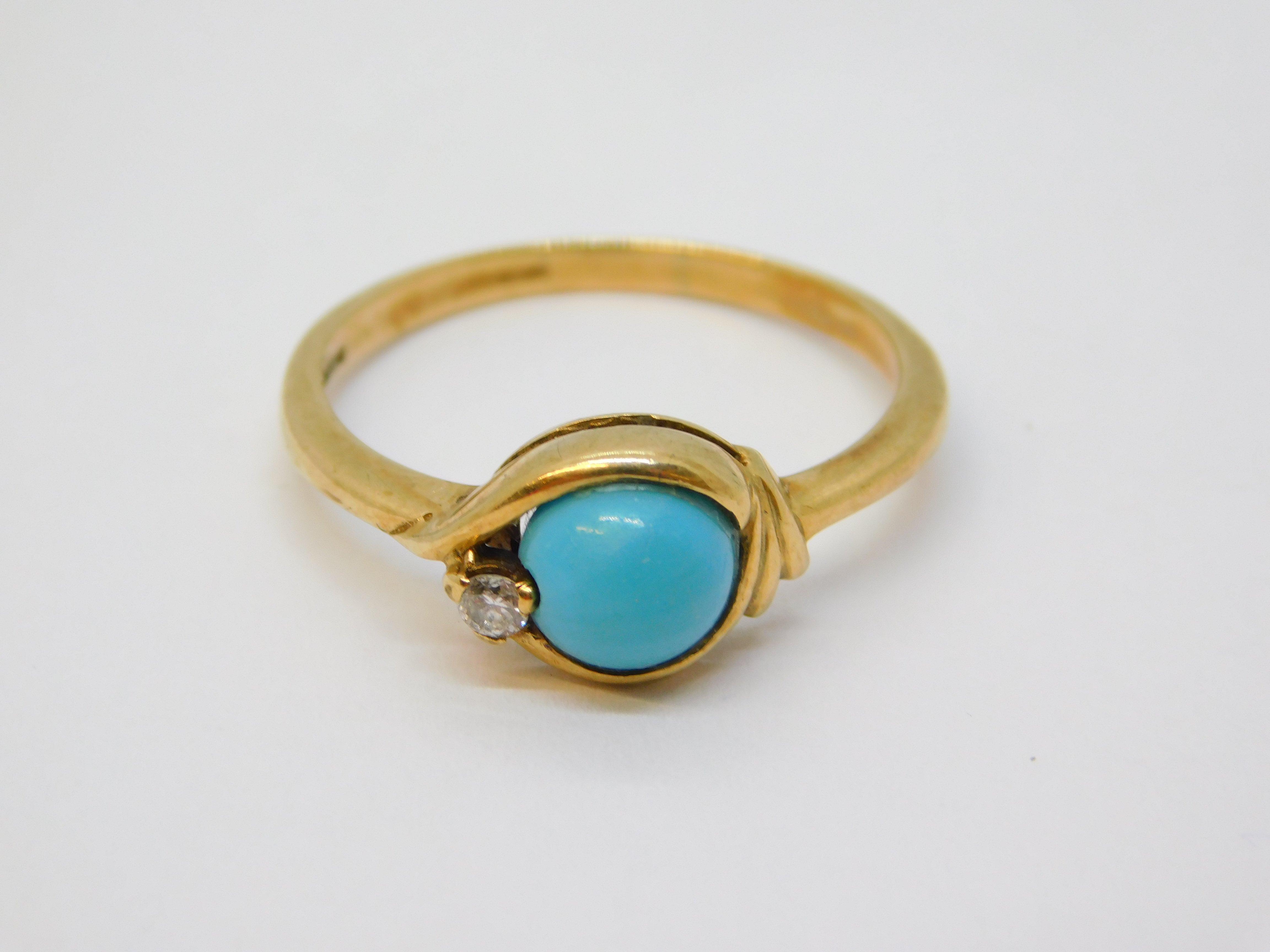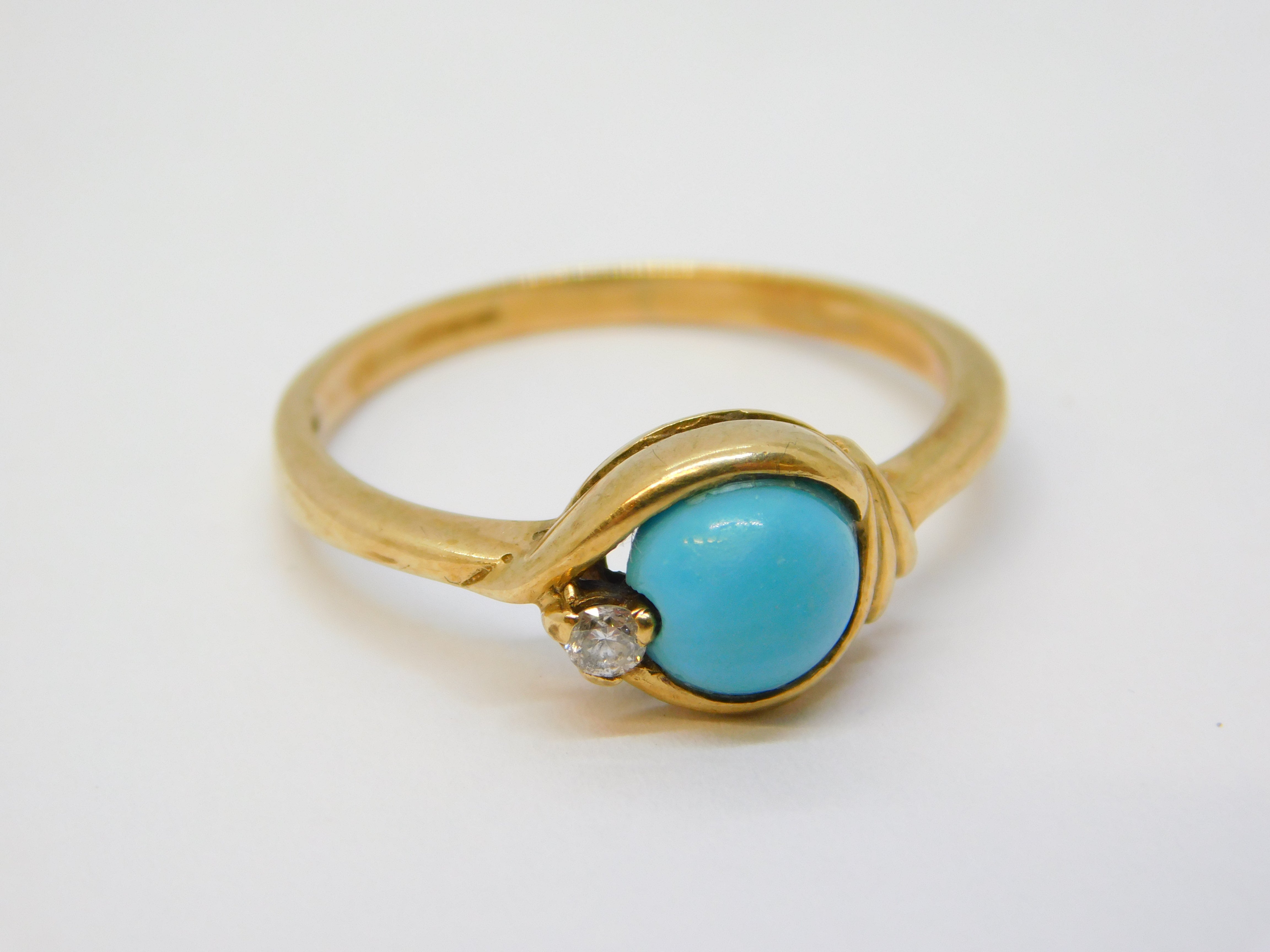Details: A fantastic and wonderfully designed vintage 9ct yellow gold dress ring set with central blue tuquoise & small diamonds hallmarked Birmingham 1973 to the interior, the diamond has been tested. This is a wonderful item that would make a perfect gift or addition to any collection. We are more than happy to provide XRF reports for items upon request.