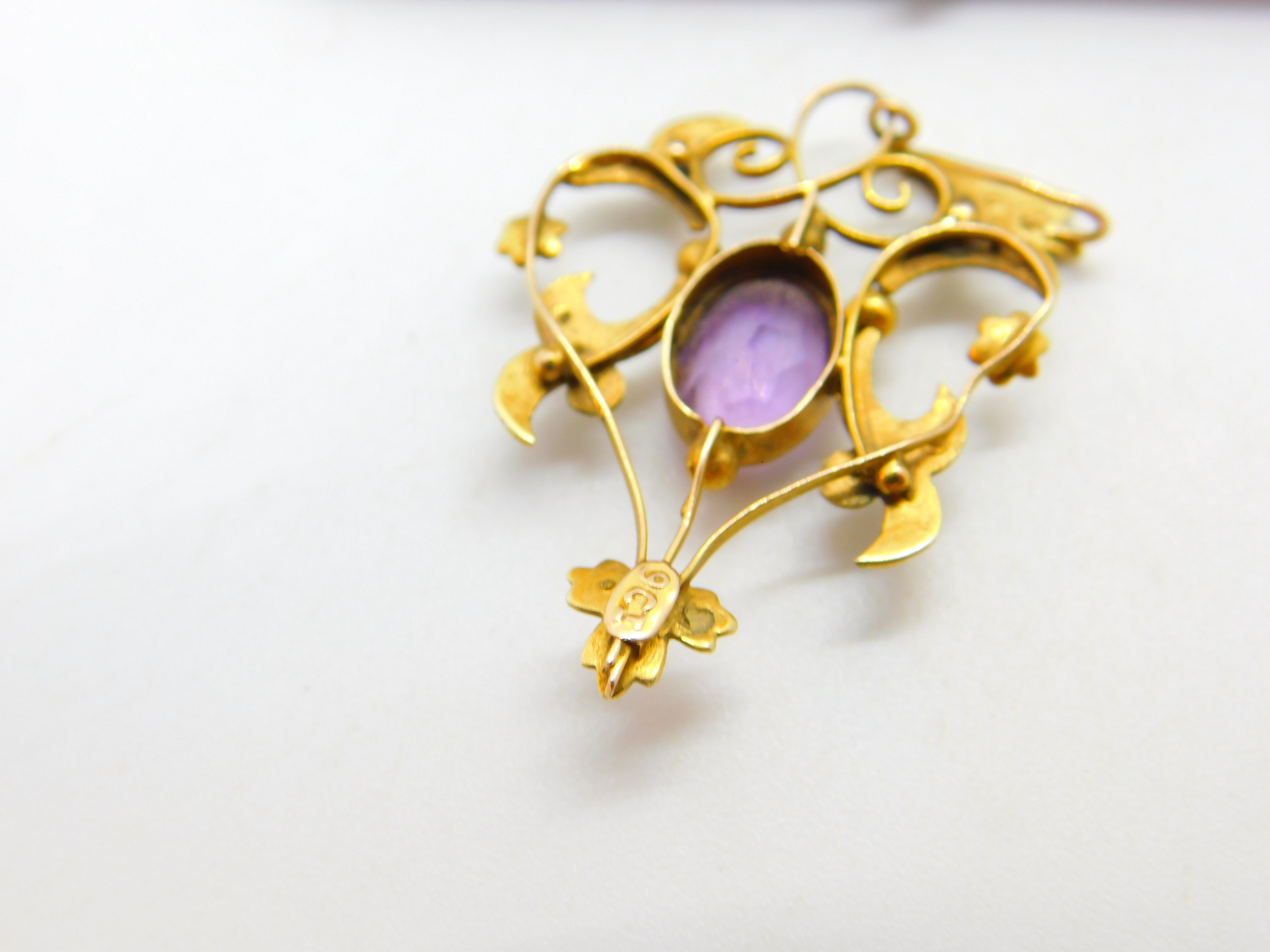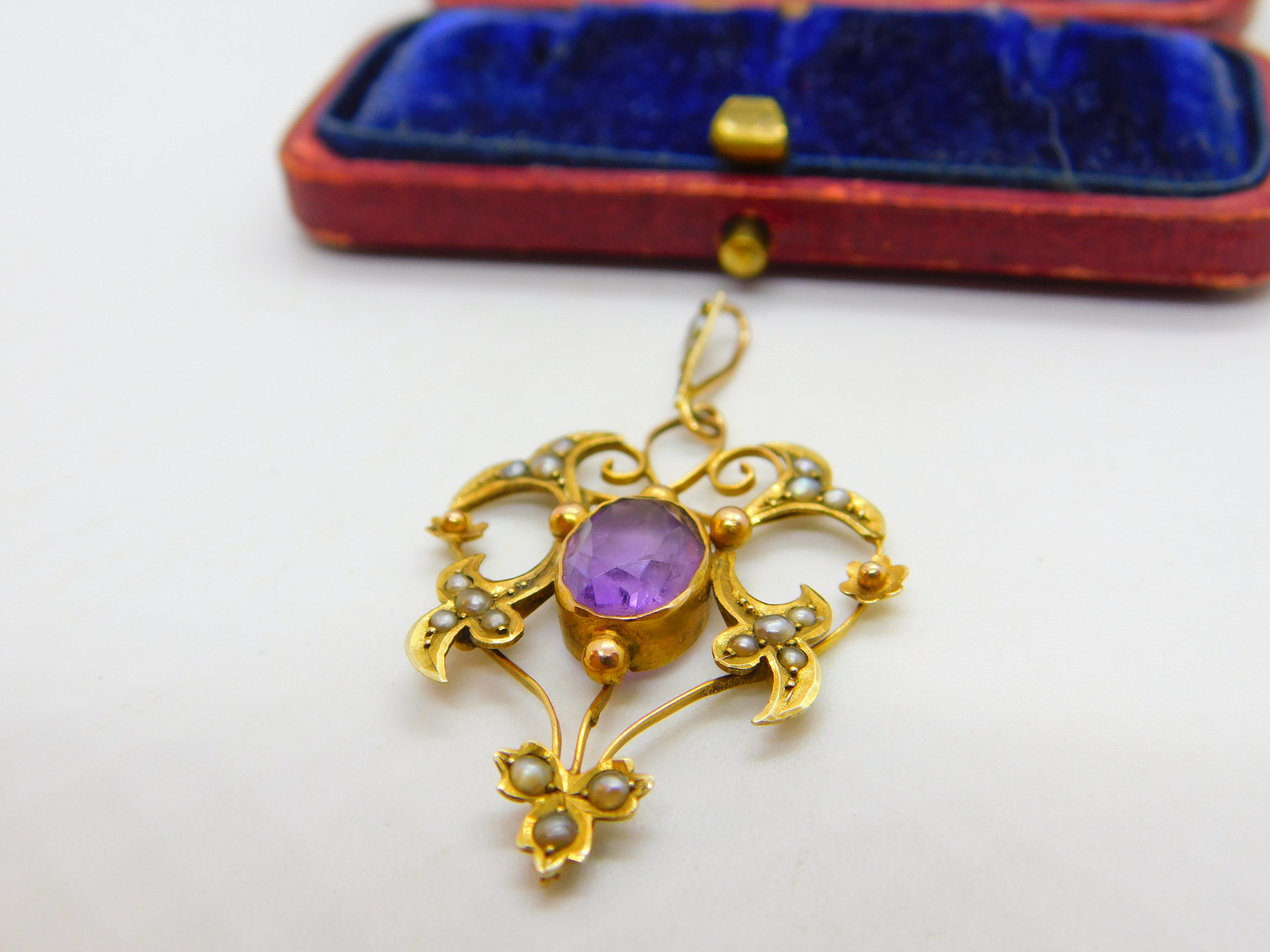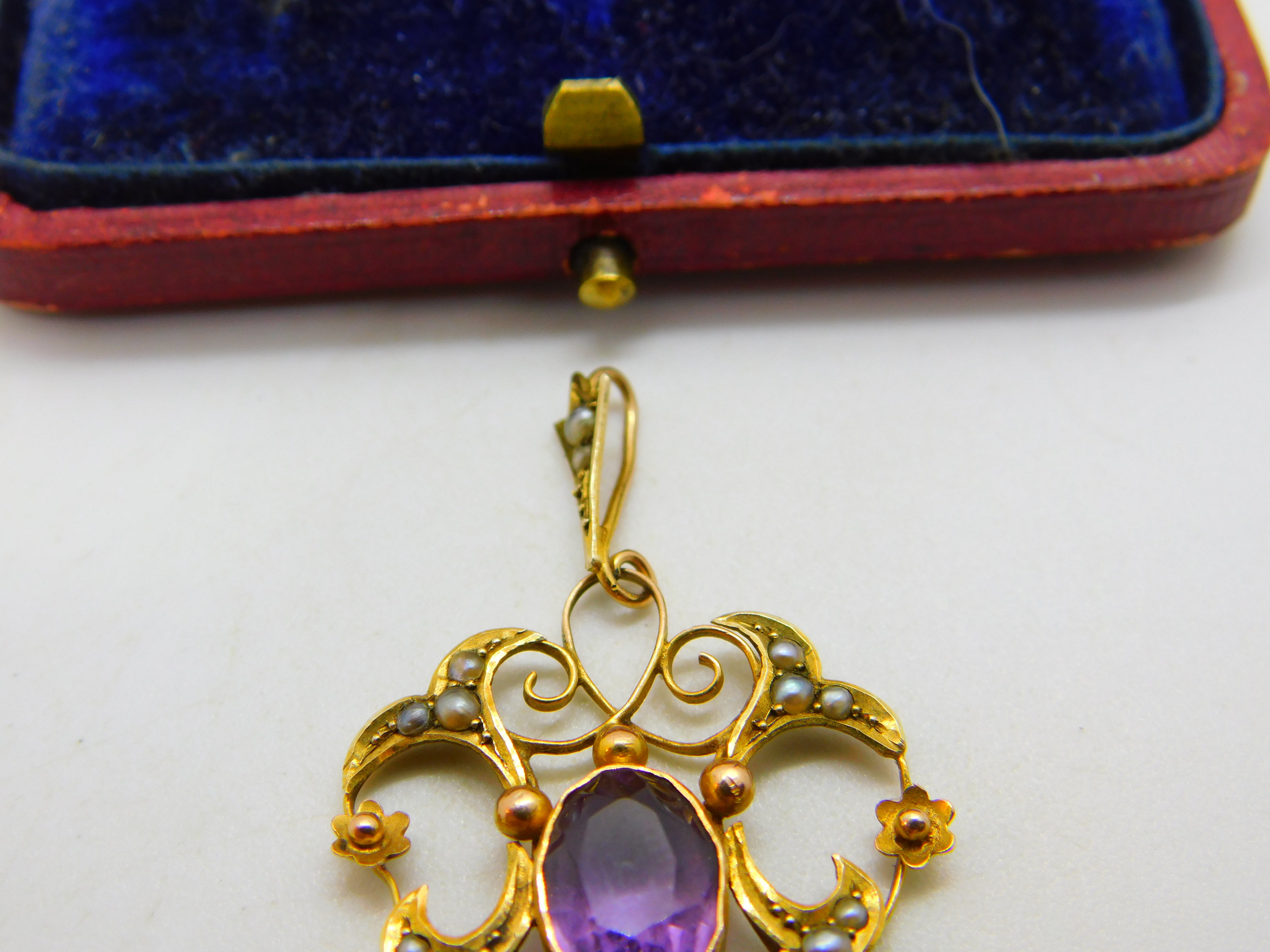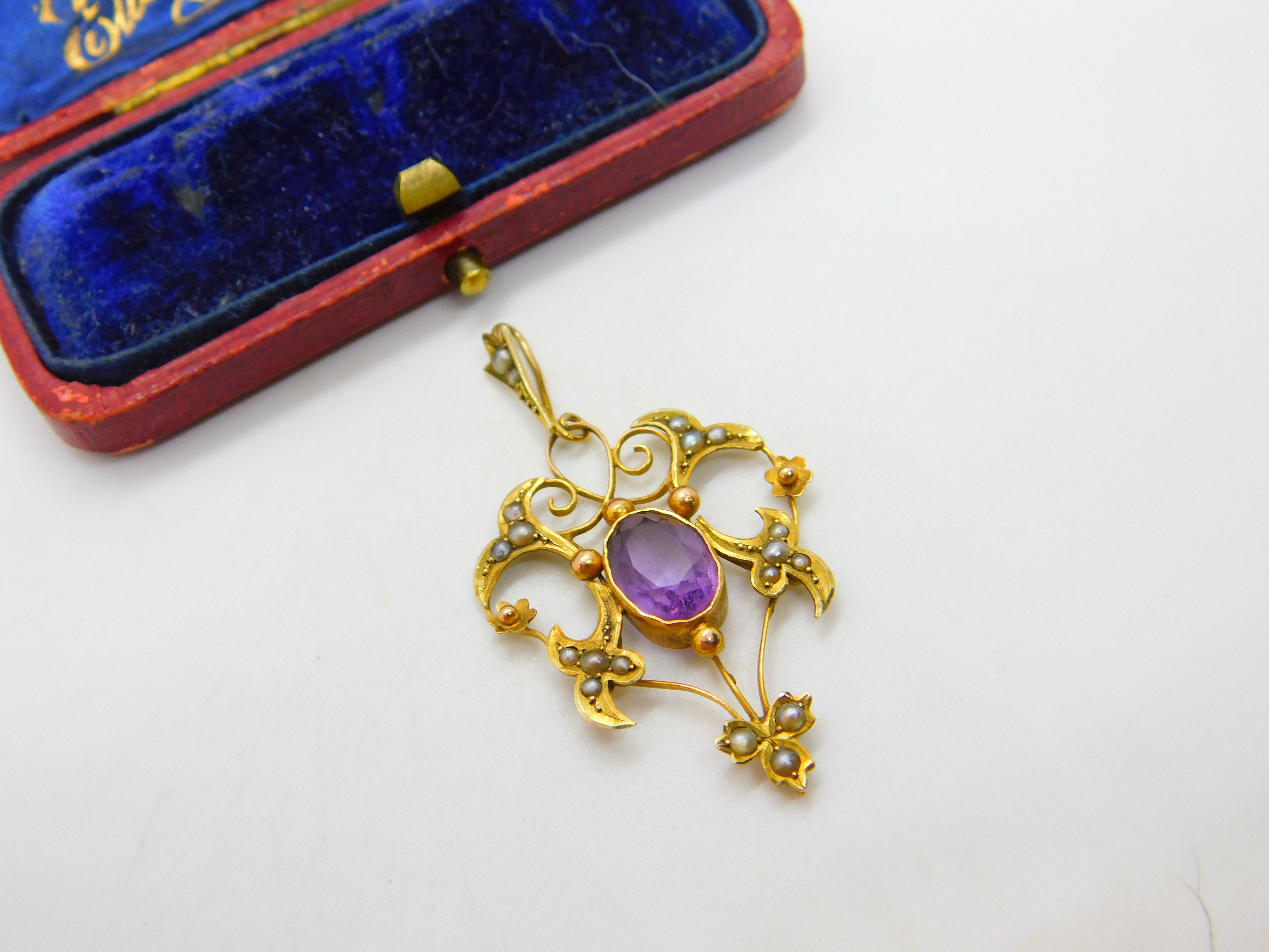 Pretty antique 9ct yellow gold dangling pendant or lavalier set with an amethyst stone and seed pearls dating from the late Victorian period. The gold is marked to a tag to the rear, this mark reads "9ct". The amethyst stone has been tested as real, is in good order and a good colour, all the seed pearls are present, some slight darkening please see the pictures. A wonderful and charming Victorian pendant.