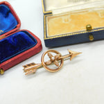 Charming antique brooch or pin depicting an arrow being shot through a flower in 14ct yellow gold dating from the late Victorian period. To the centre of the flower petals is a seed pearl. Good secure clasp and pin. There are tiny air holes to the rear, these are the product of the manufacture as the brooch is hollow. The flower spins on it's axis. Wonderful detailing.