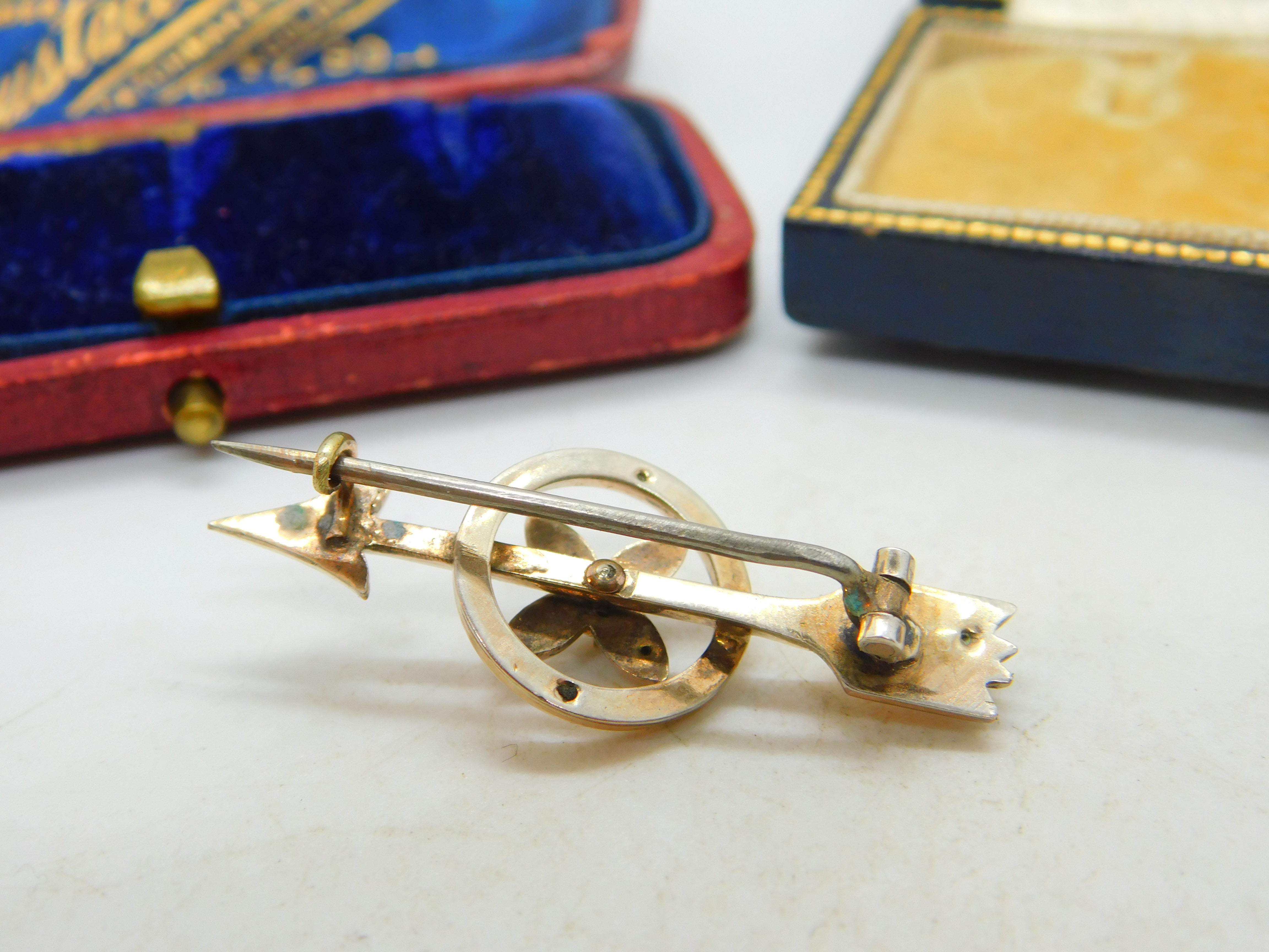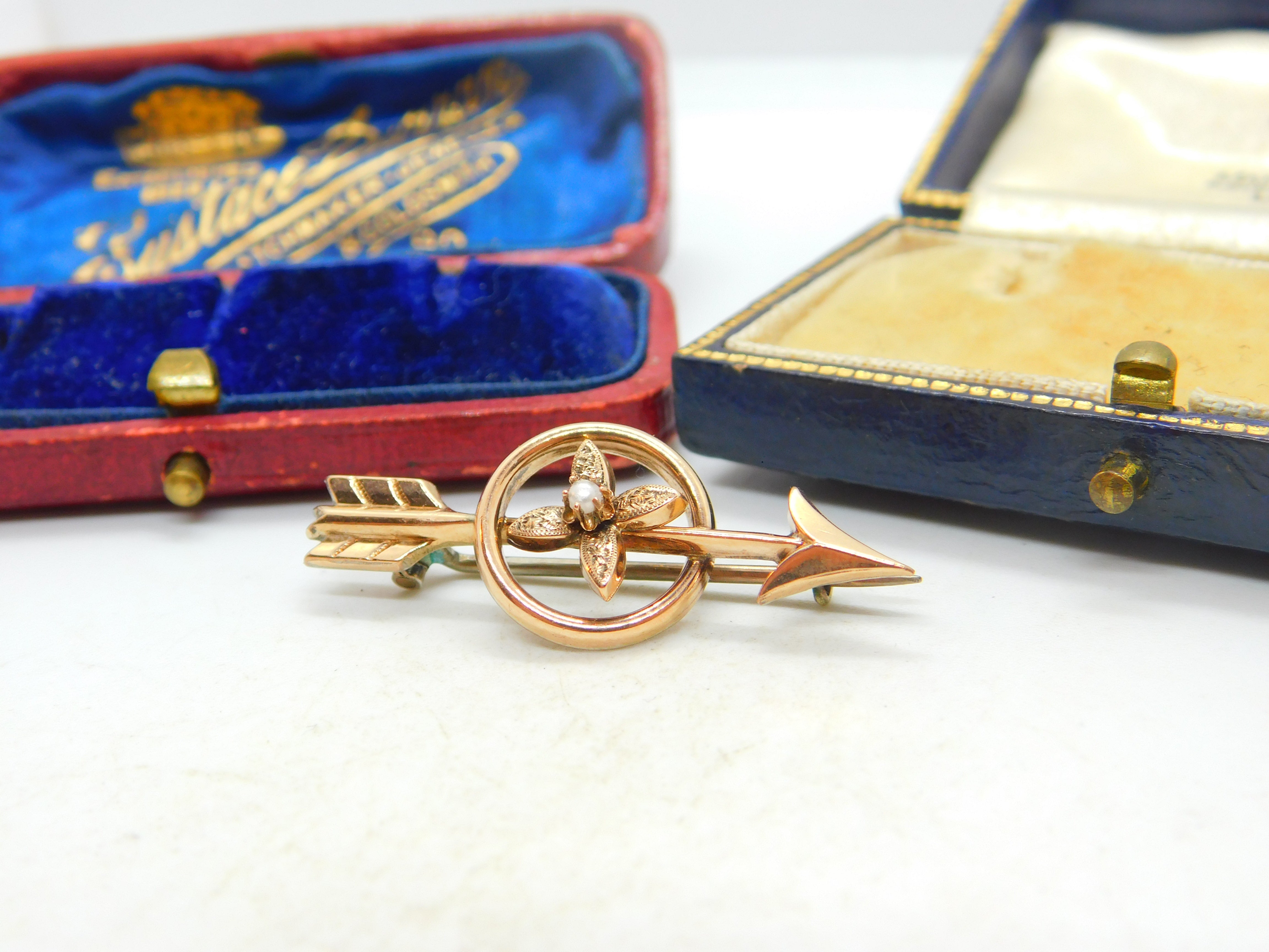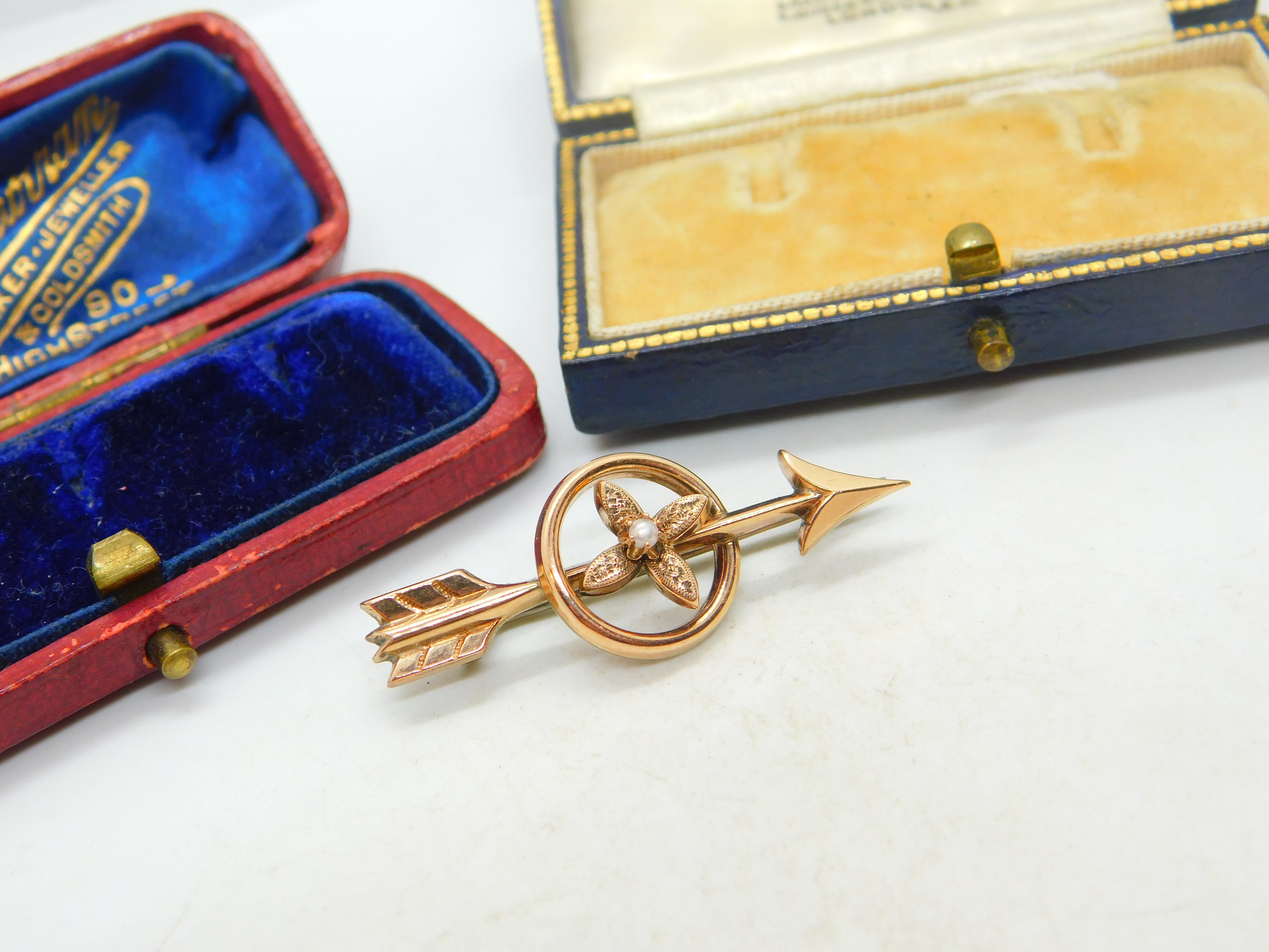 Arrow and Seed Pearl Flower 14ct Gold Brooch Pin Antique Victorian c1890