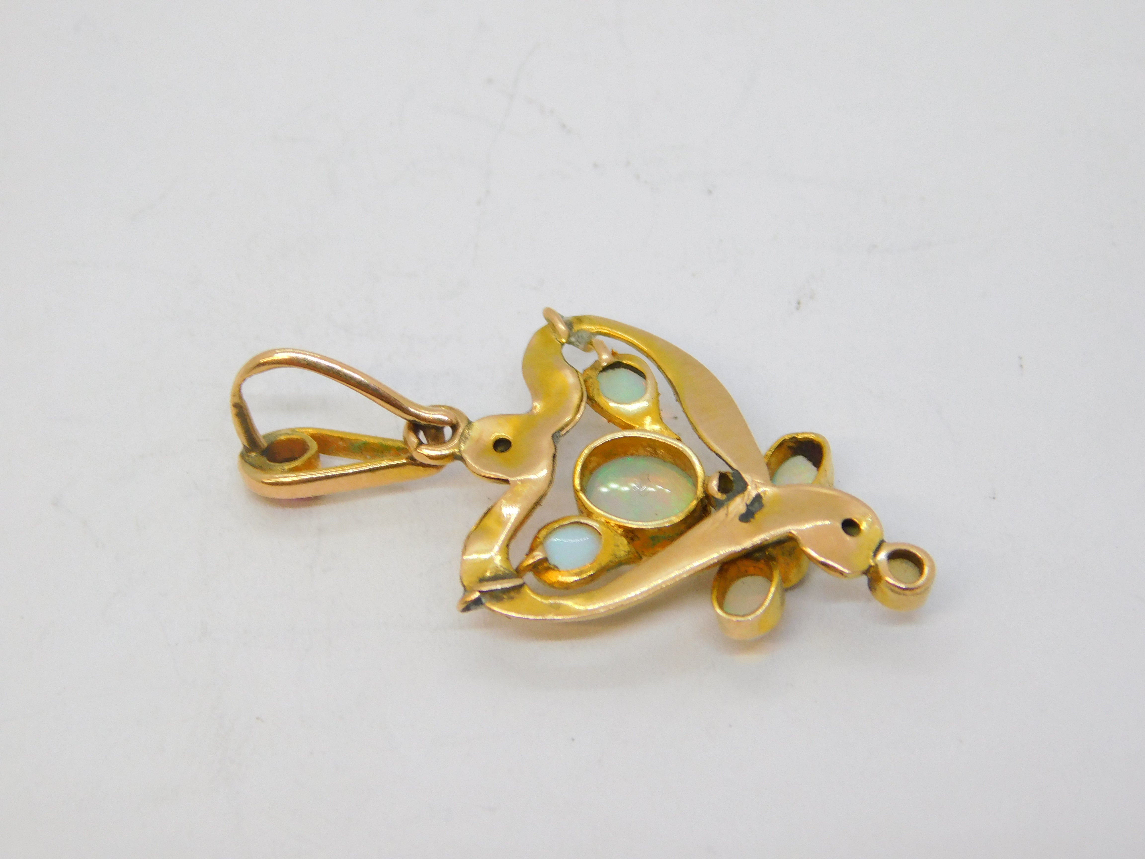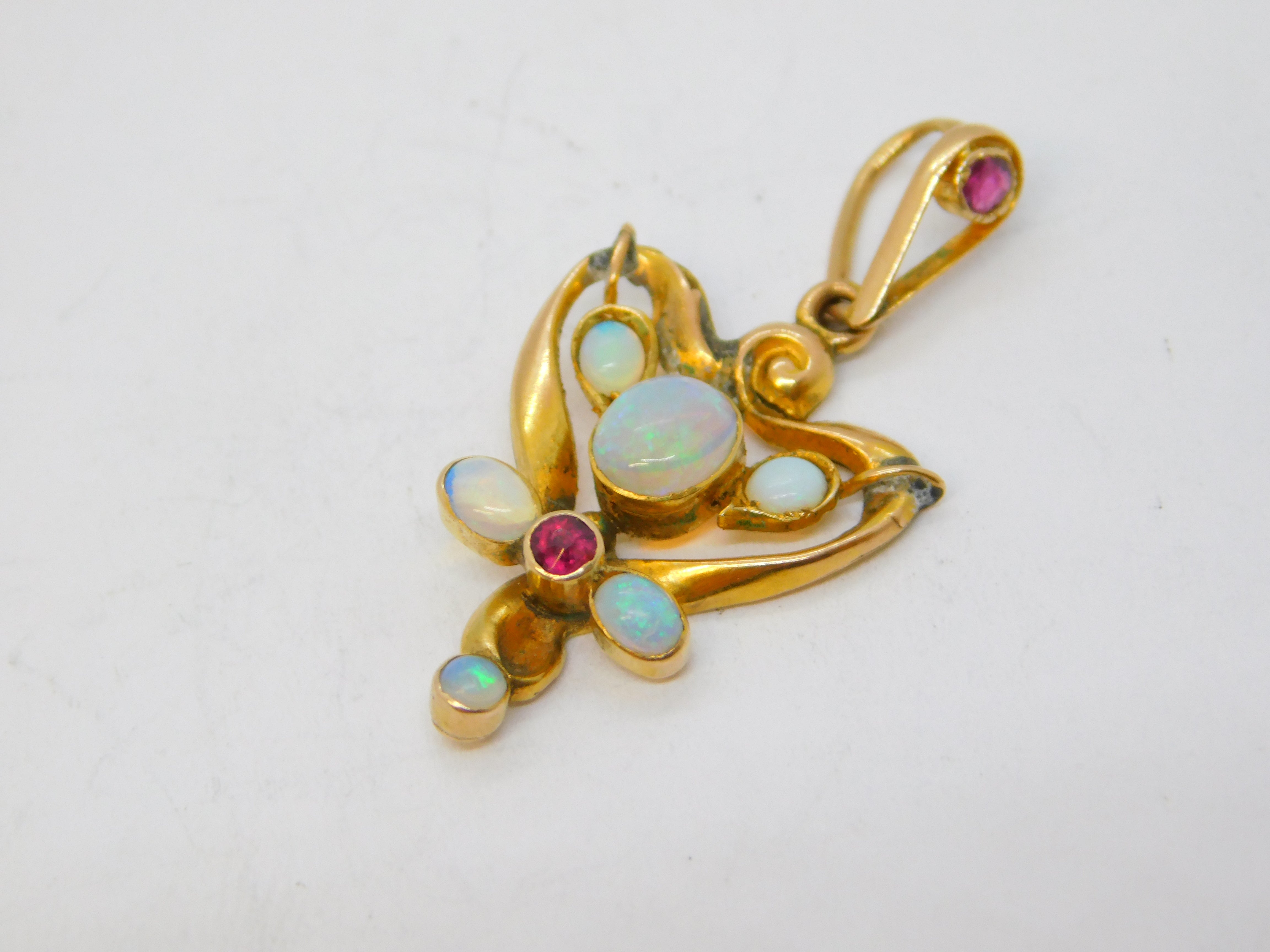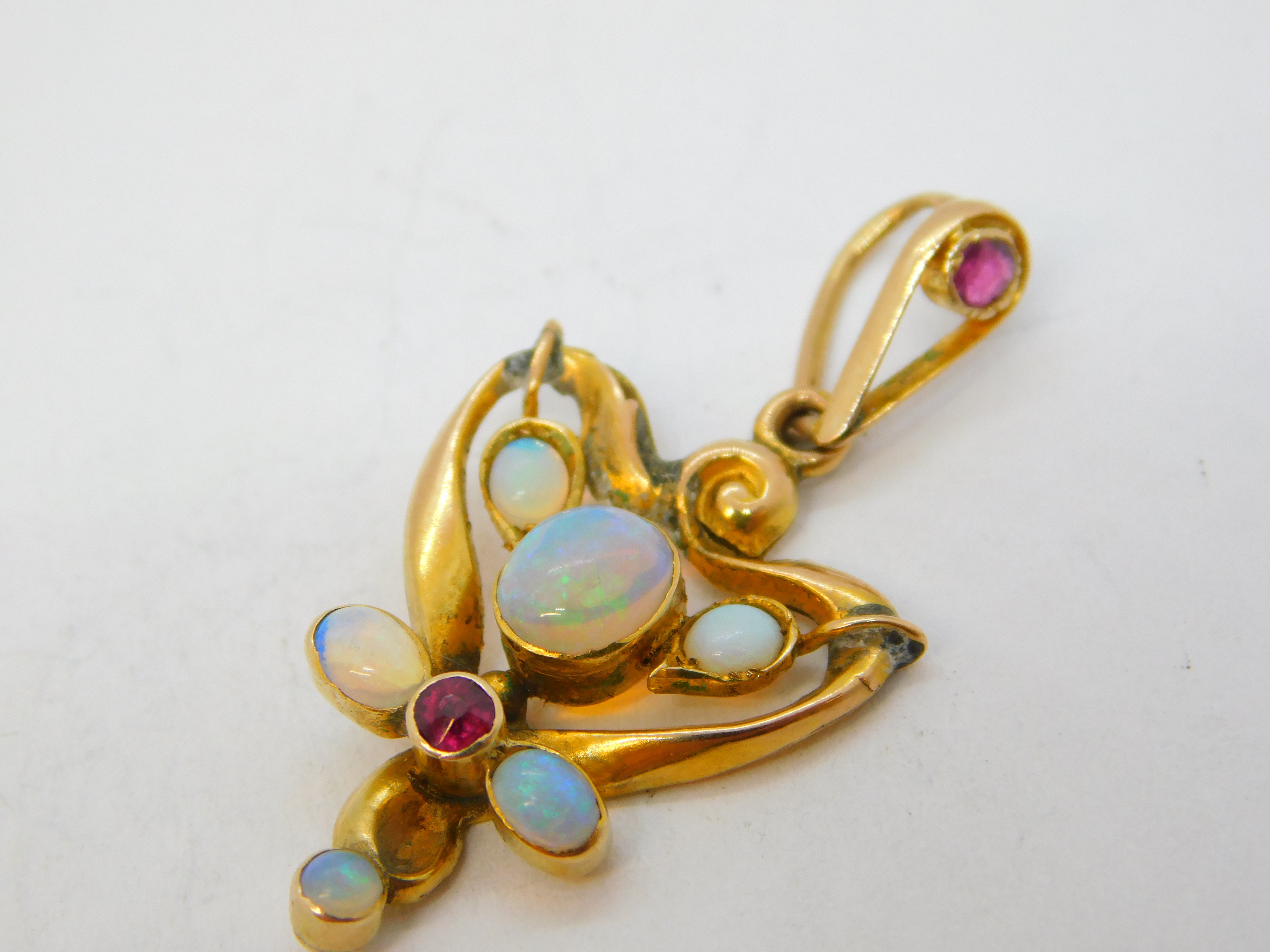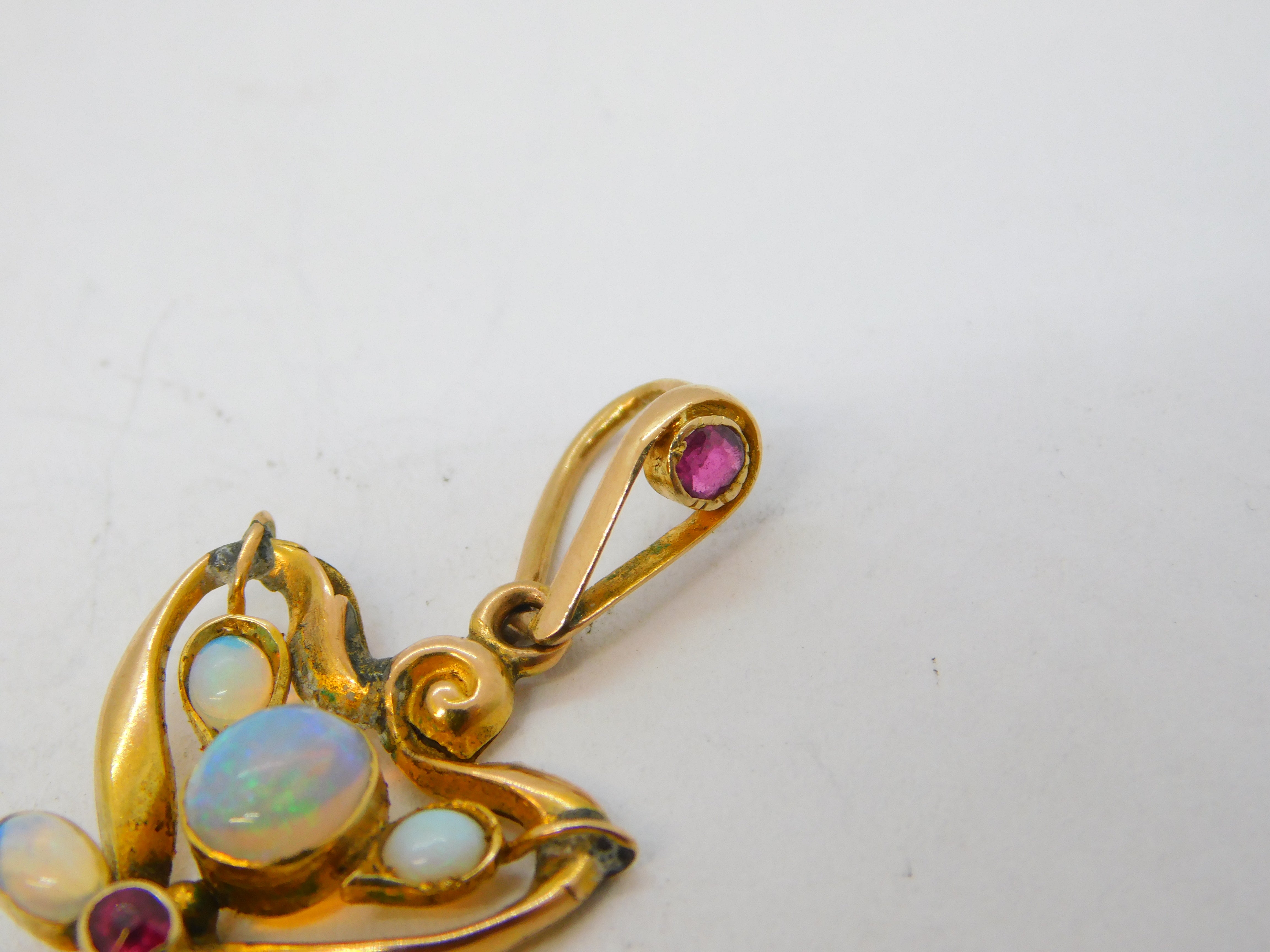 Details: A fantastic and wonderfully designed antique art nouveau 9ct yellow gold lavalier pendant set with rubies and cabochon cut opals c1910 in the style or Murrle Bennett, the gold has been XRF tested as it is unmarked, splits to the side of the top edge and relatively worn. This is a wonderful item that would make a perfect gift or addition to any collection. We are more than happy to provide XRF reports for items upon request.