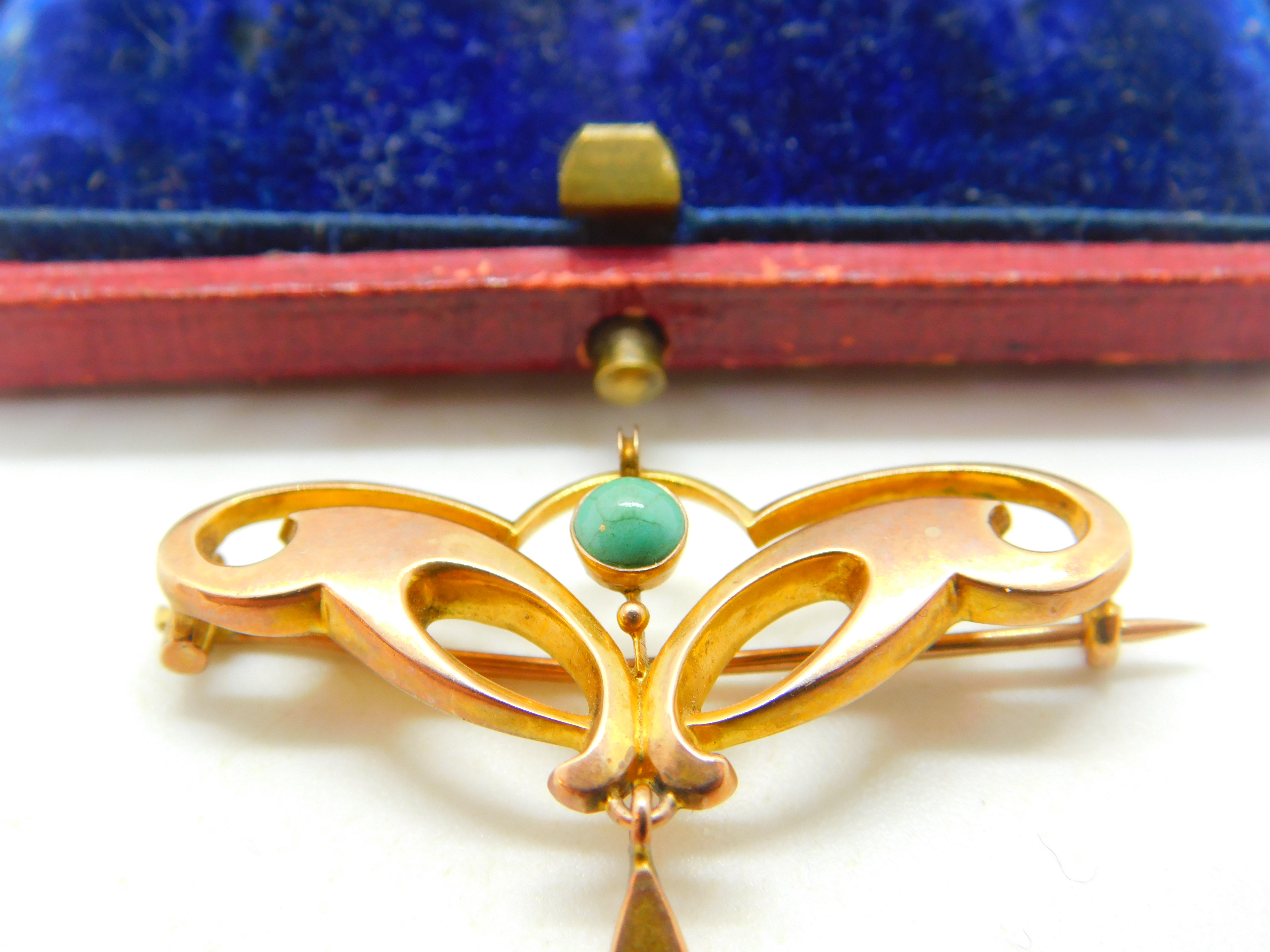 Details: A fantastic and wonderfully designed antique Edwardian 9ct yellow-rose gold true art nouveau brooch in the style of Murrle, Bennett & Co. (although unmarked) set with a turquoise stone to the top and adorned with a pearl drop hallmarked 9ct to the reverse c1910. This is a wonderful item that would make a perfect gift or addition to any collection. The BOX pictured is for PRESENTATION ONLY and is NOT included in the listings but used to frame the pictures unless specifically stated otherwise.