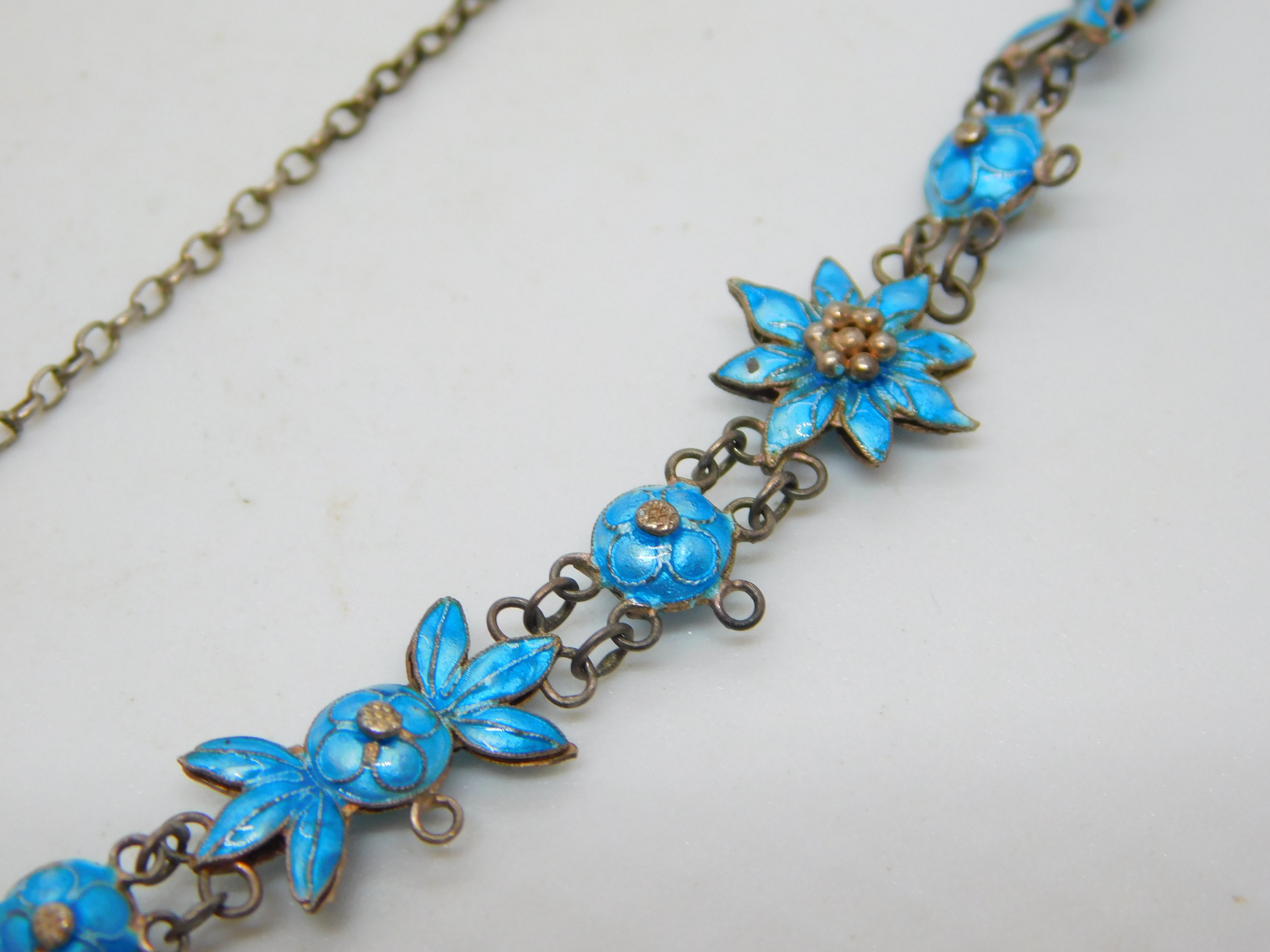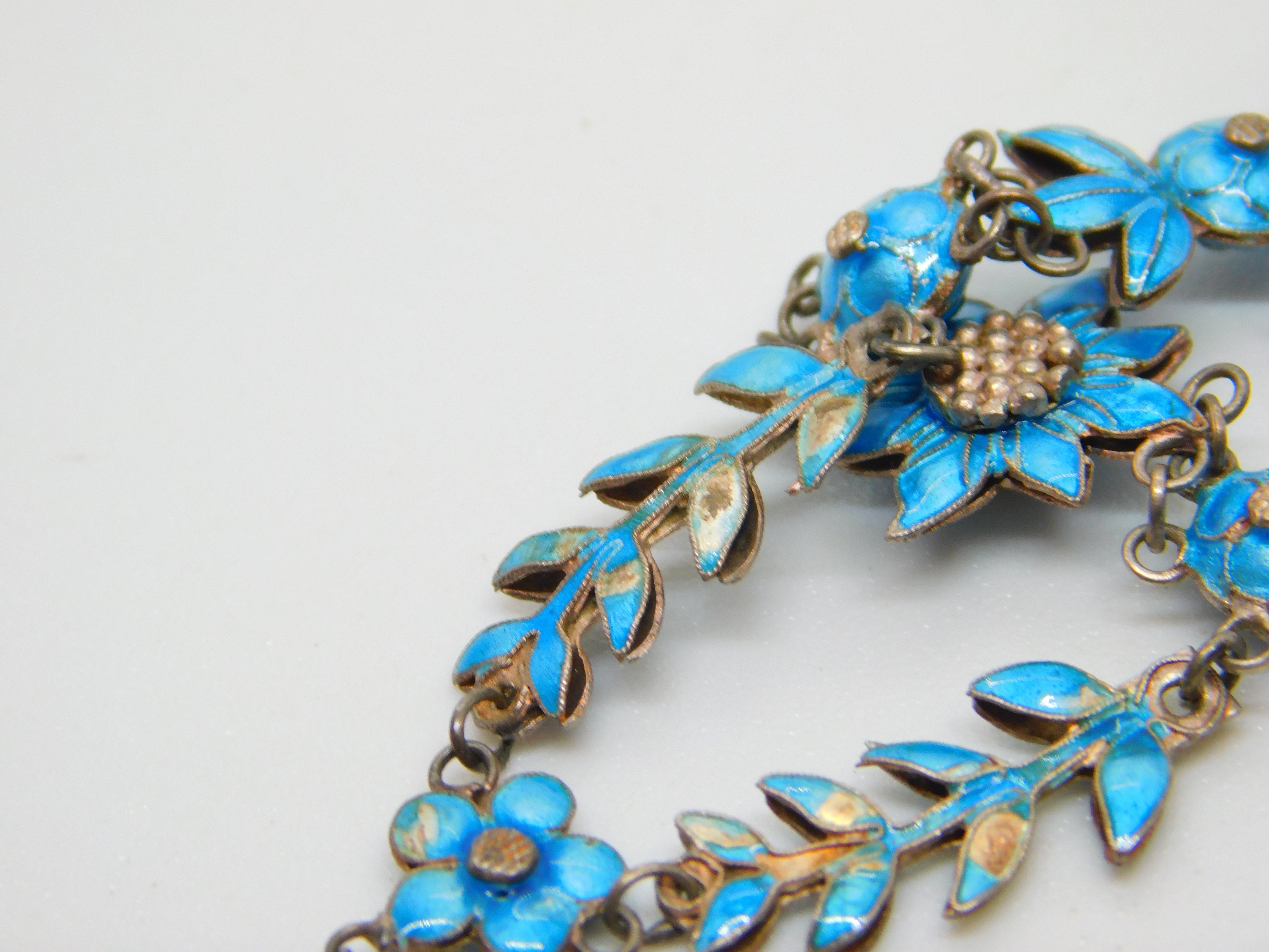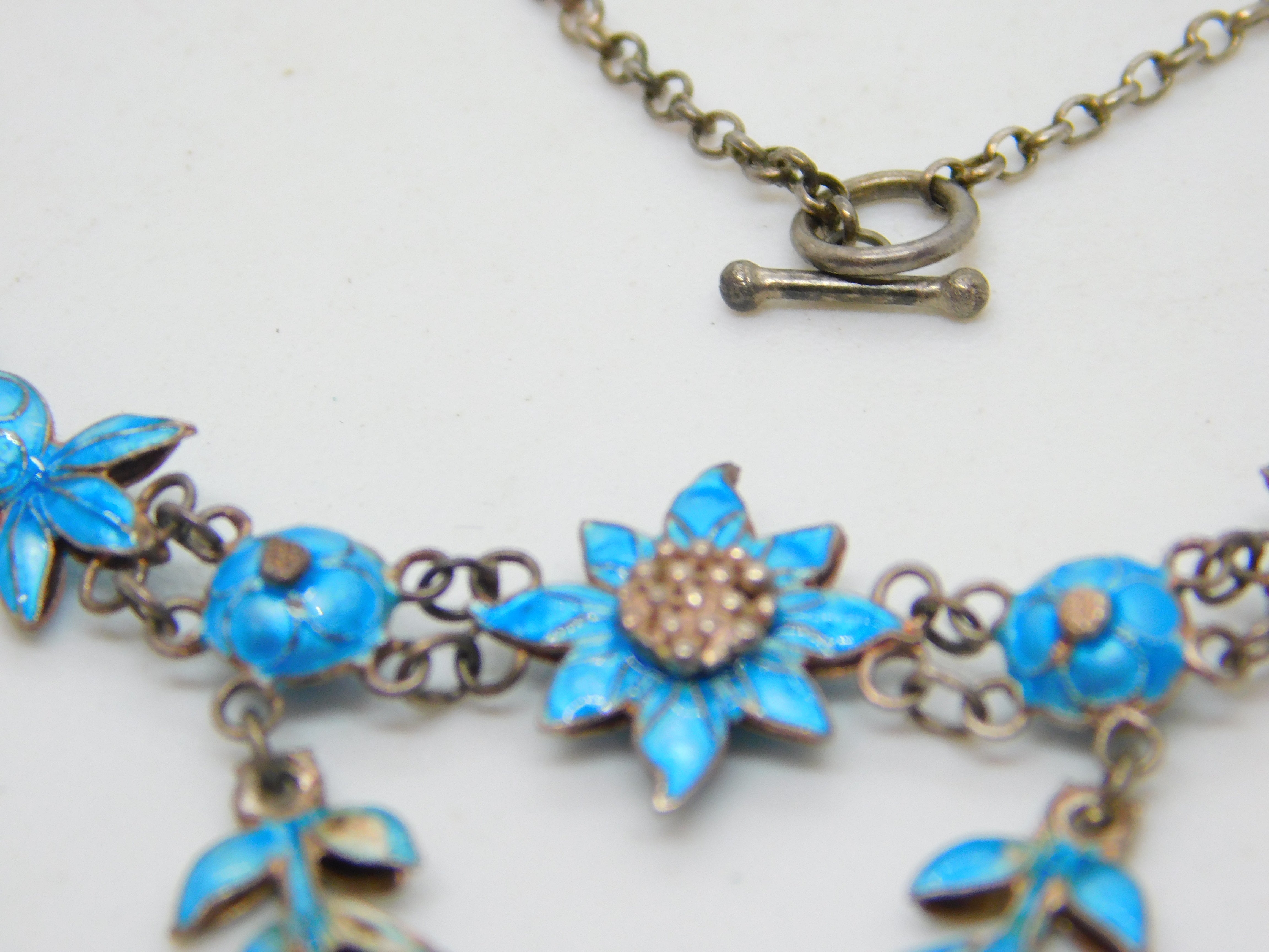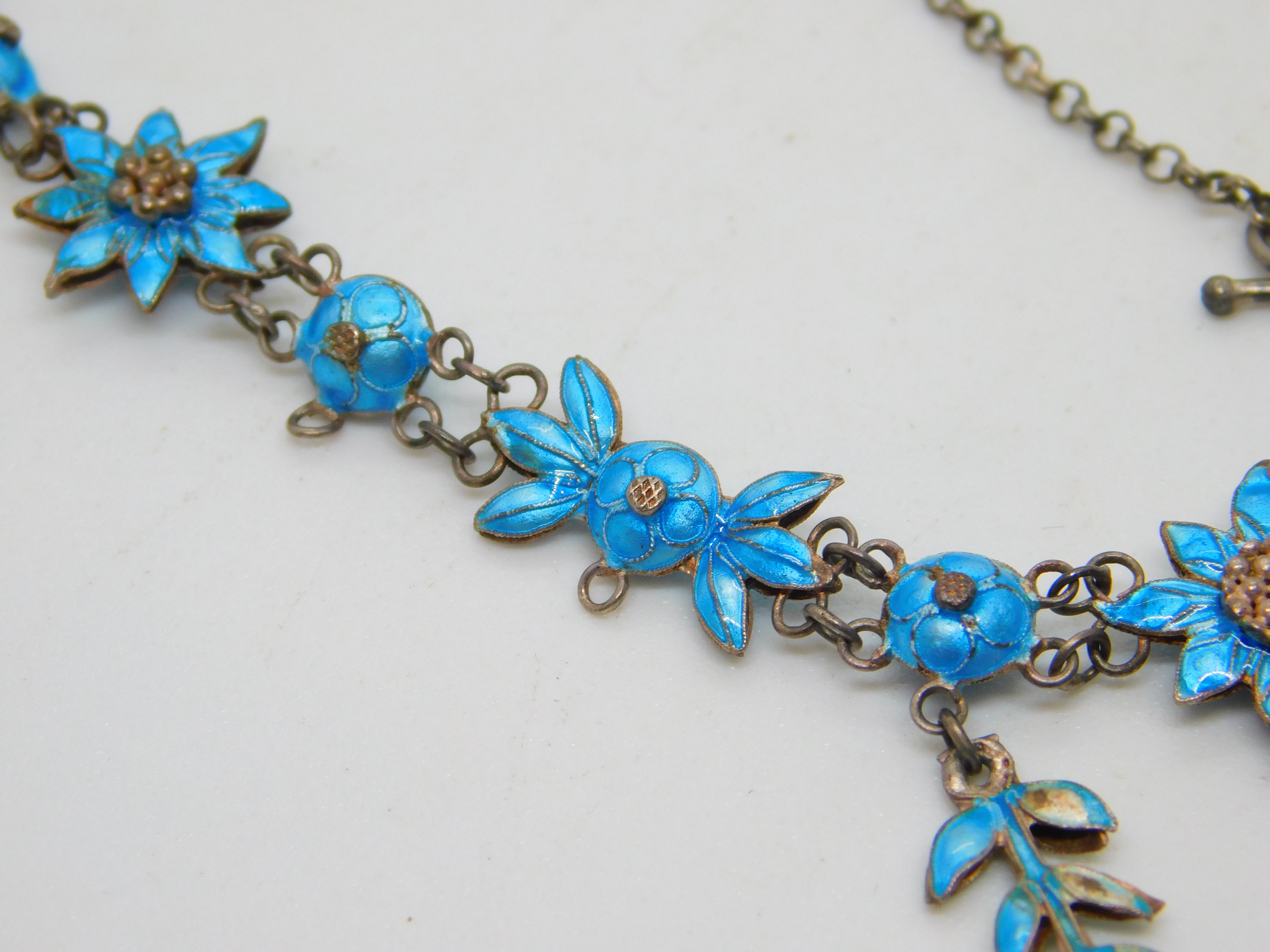 Art Nouveau Sterling Silver & Blue Enamel Floral Drop Necklace Antique c1880