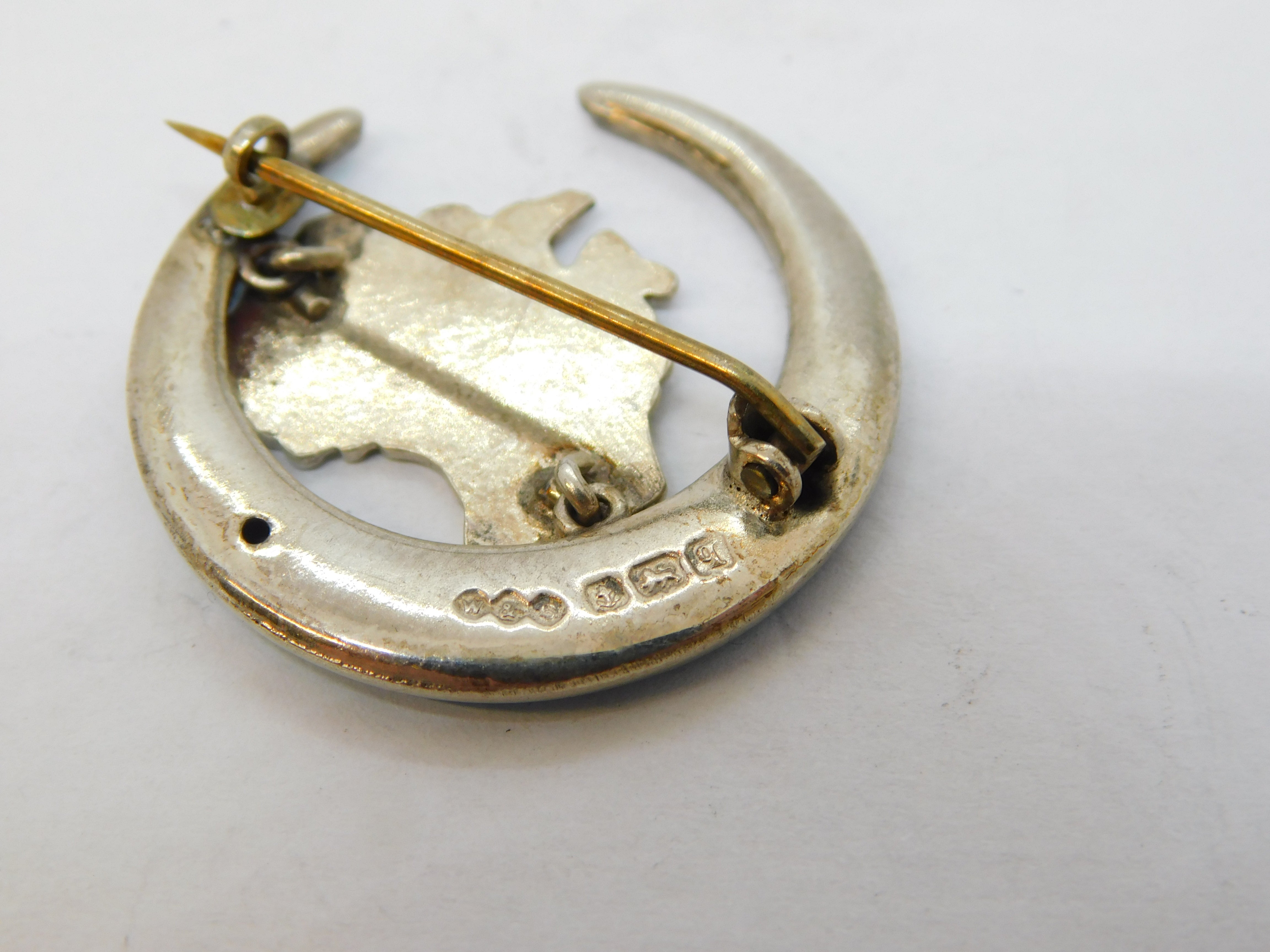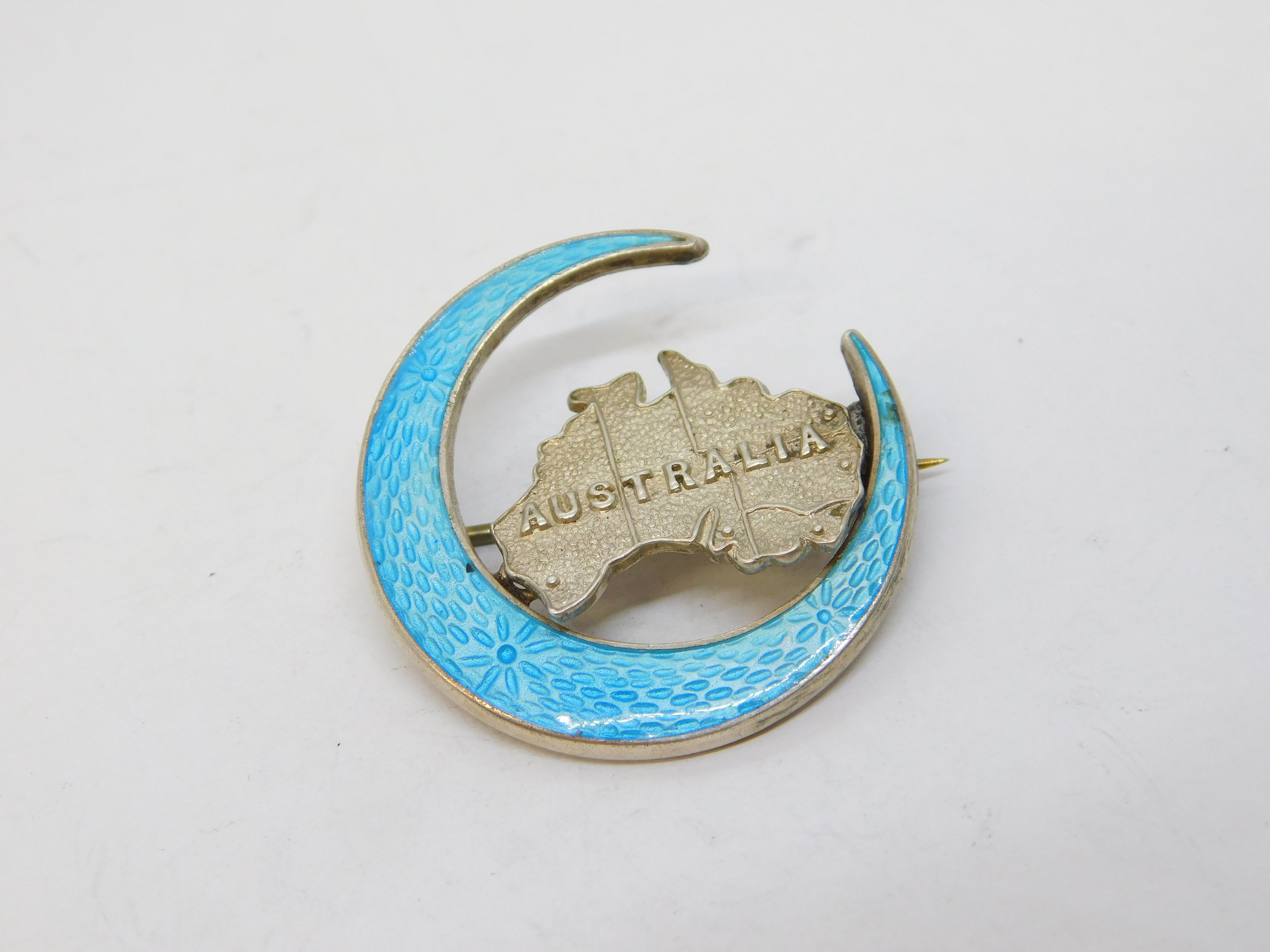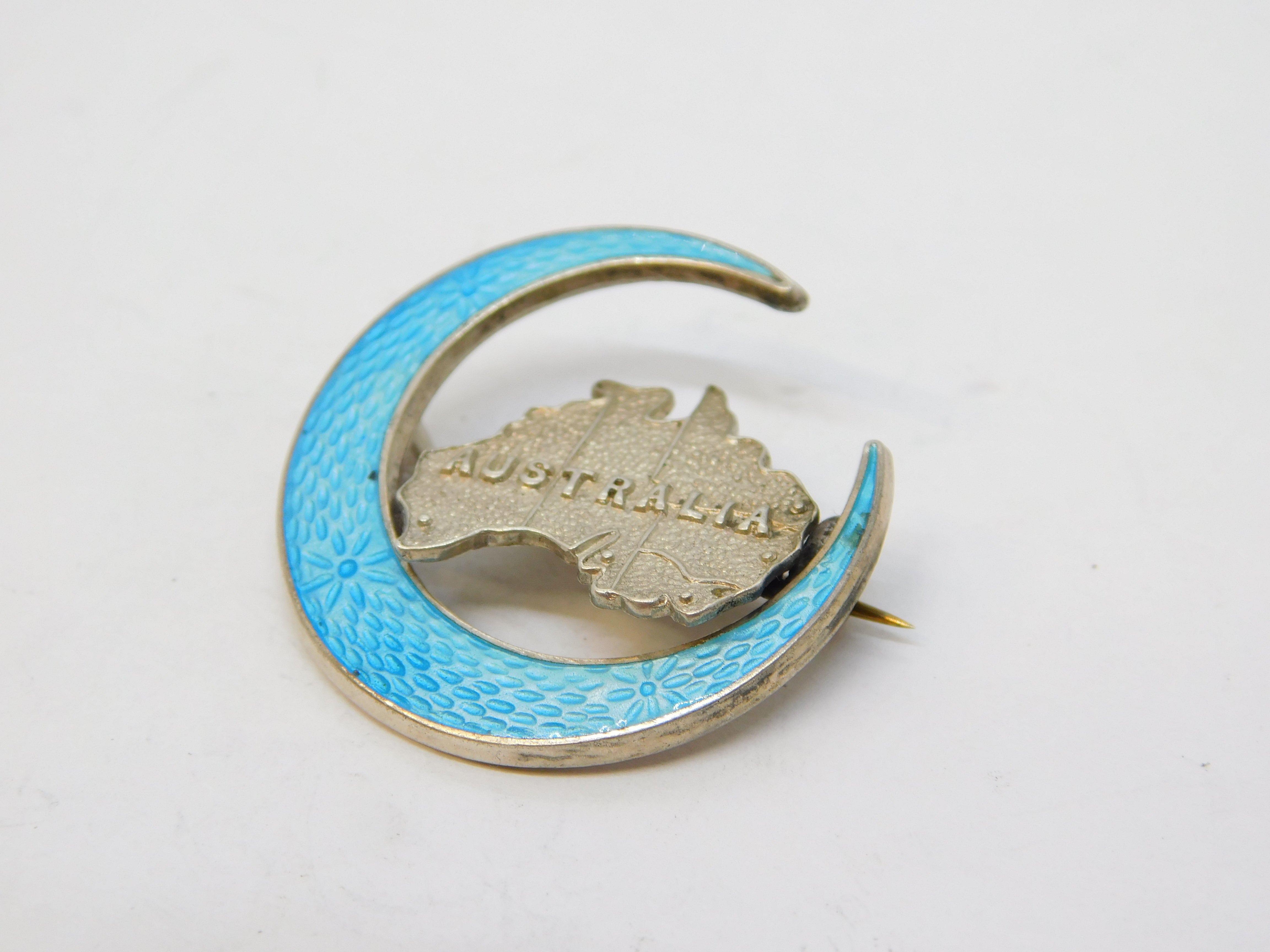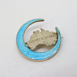 Details: A fantastic and wonderfully designed antique art deco sterling silver blue guilloche enamel set crescent moon Australia souvenir or sweetheart brooch hallmarked Birmingham 1915 to the reverse. This is a wonderful item that would make a perfect gift or addition to any collection.