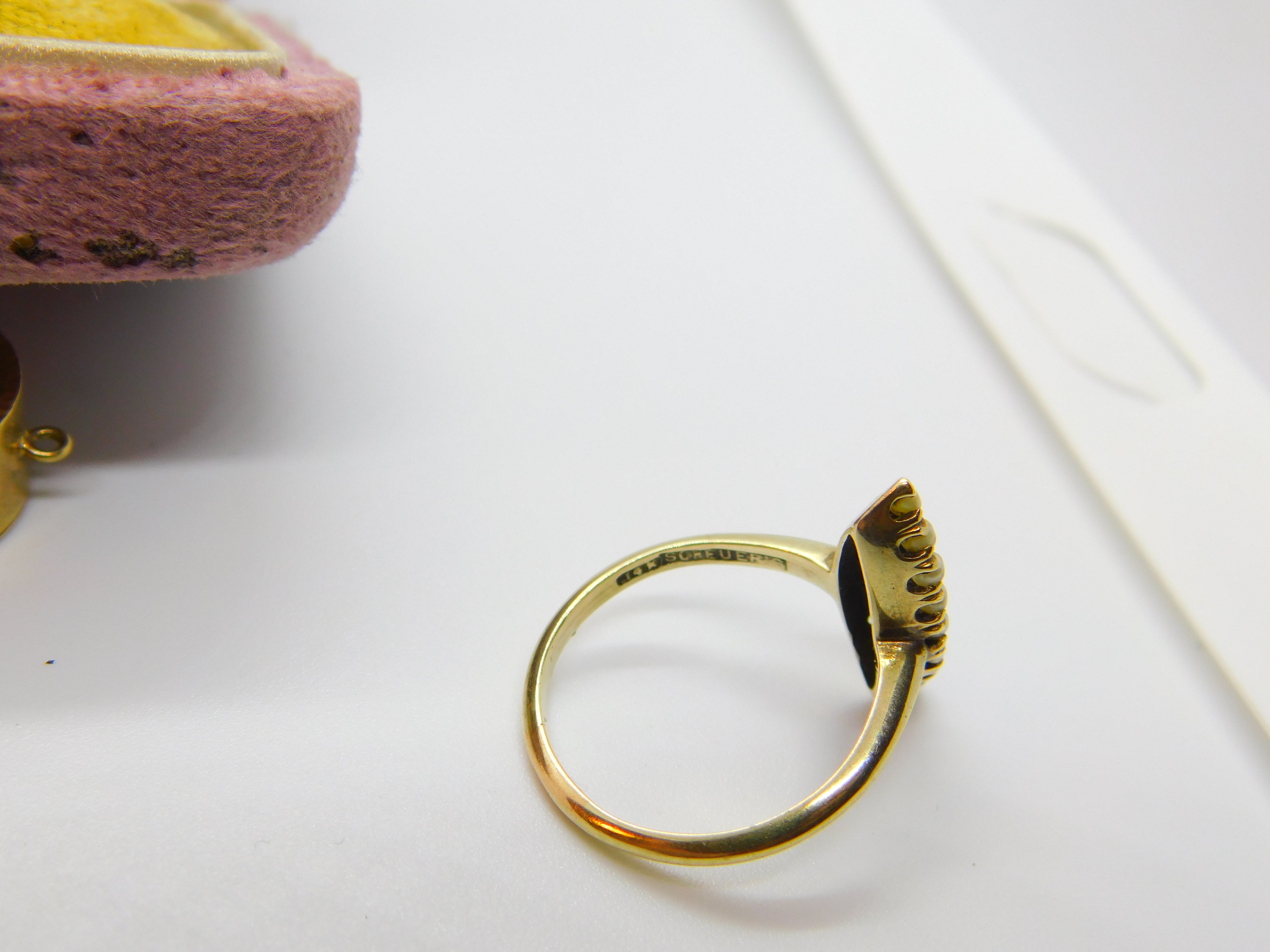 Details: A fantastic and wonderfully designed antique art deco Austro-Hungarian 14ct yellow gold marquise form dress ring set with seed pearls and sapphires marked 14k to the inner band alongside a makers mark c1920. Superb detail. This is a wonderful item that would make a perfect gift or addition to any collection. The BOX pictured is for PRESENTATION ONLY and is NOT included in the listings but used to frame the pictures unless specifically stated otherwise.