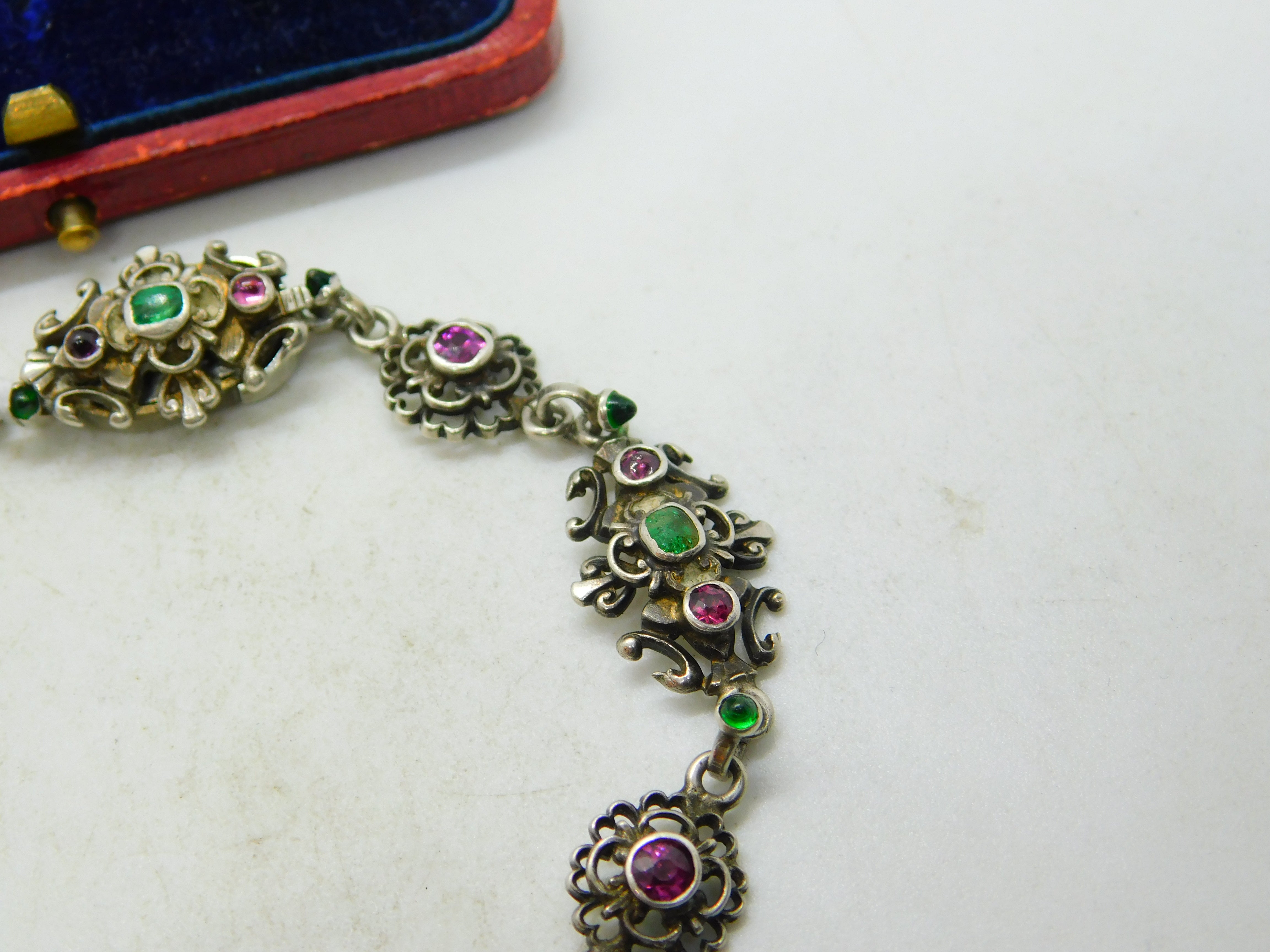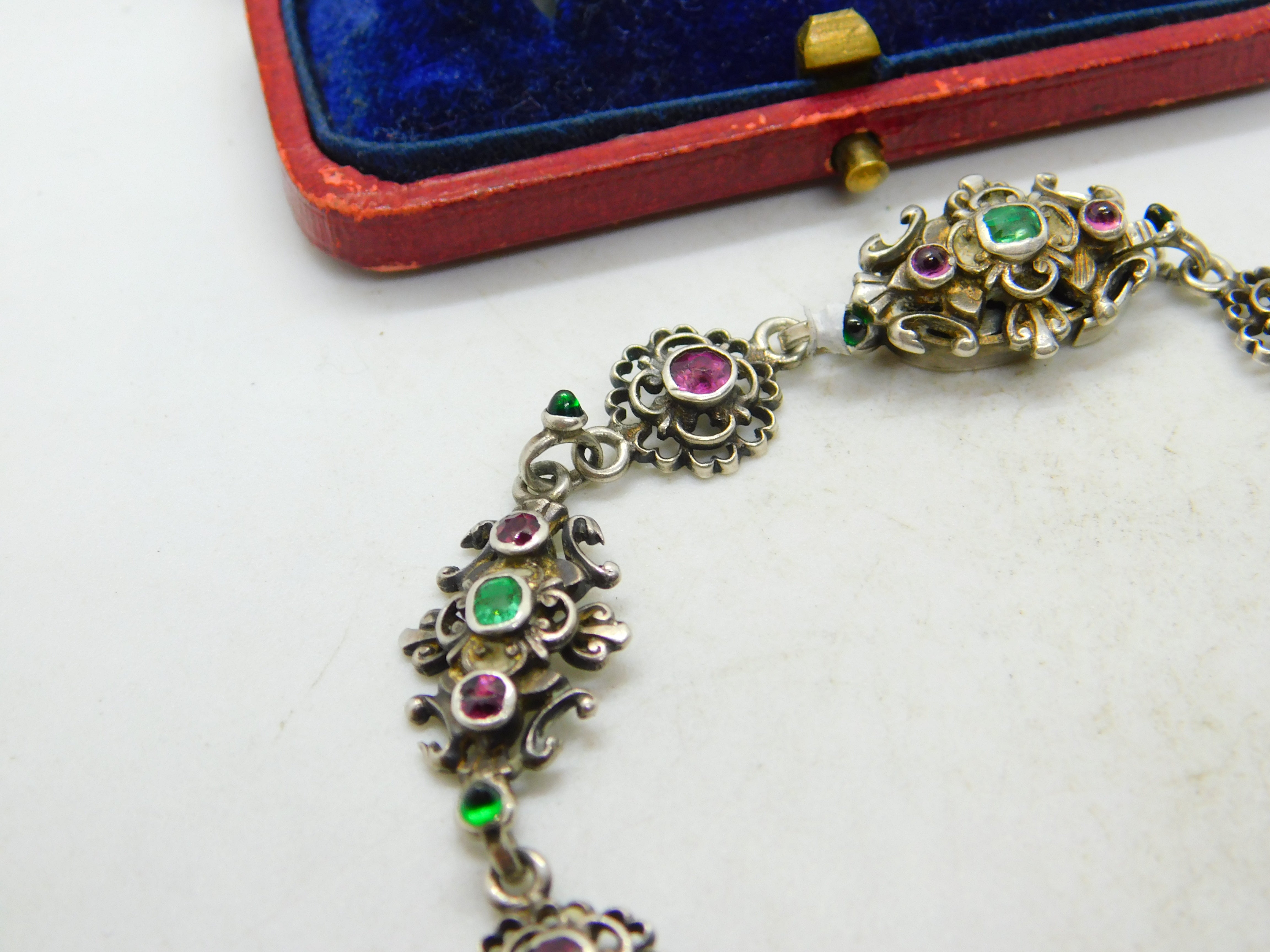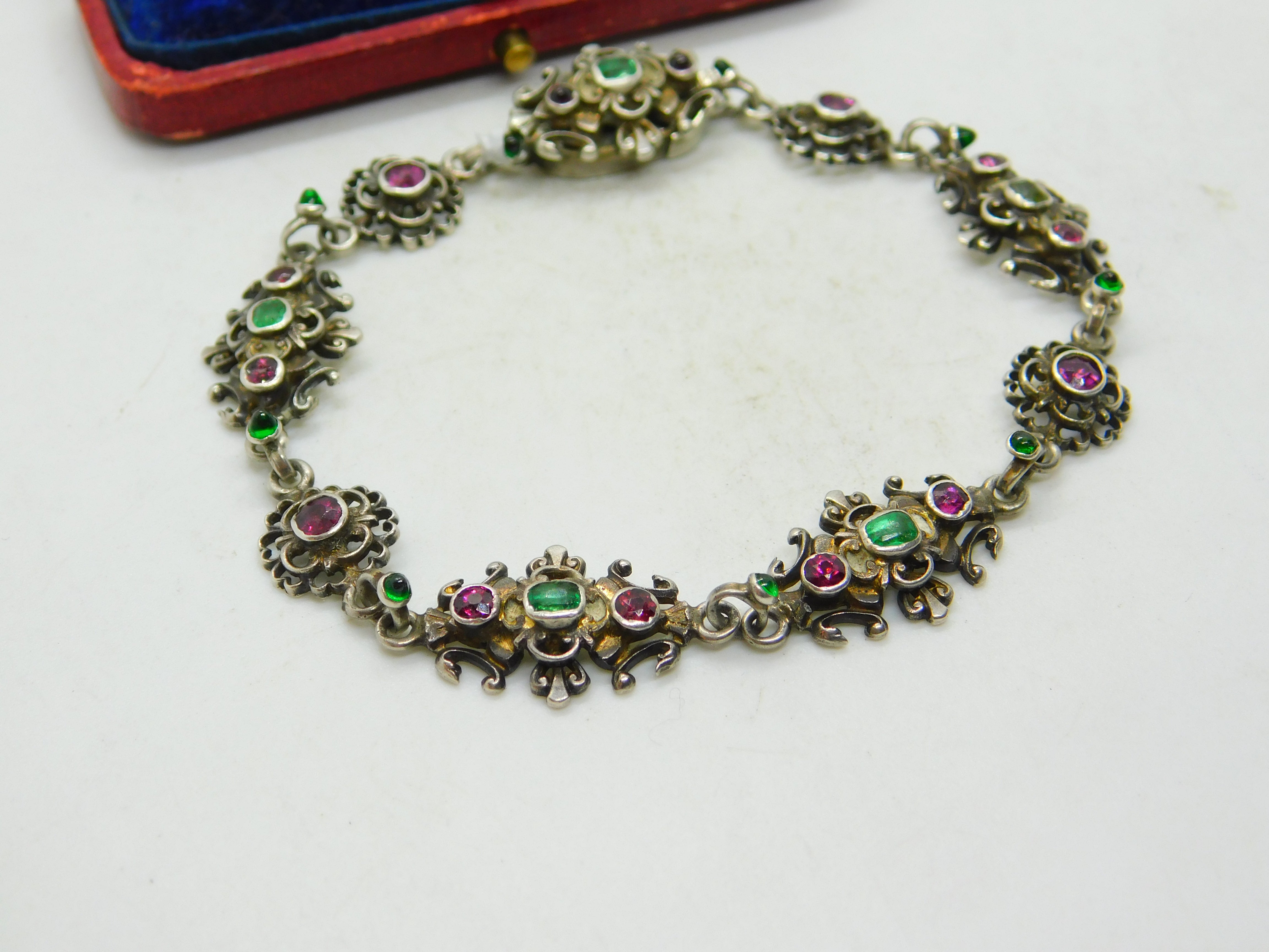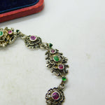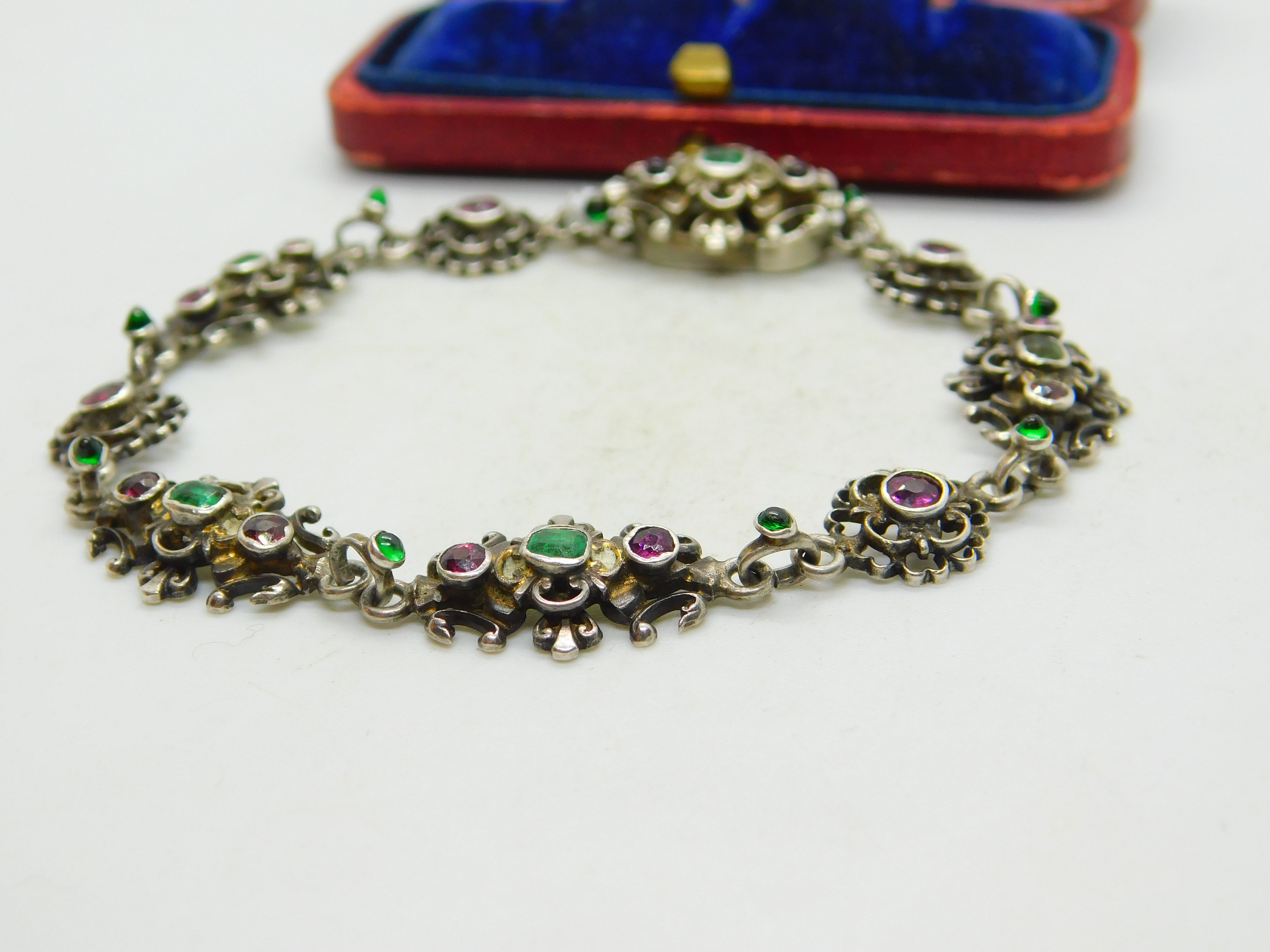 Austro Hungarian Emerald and Amethyst Paste Sterling Silver Bracelet Antique c1860