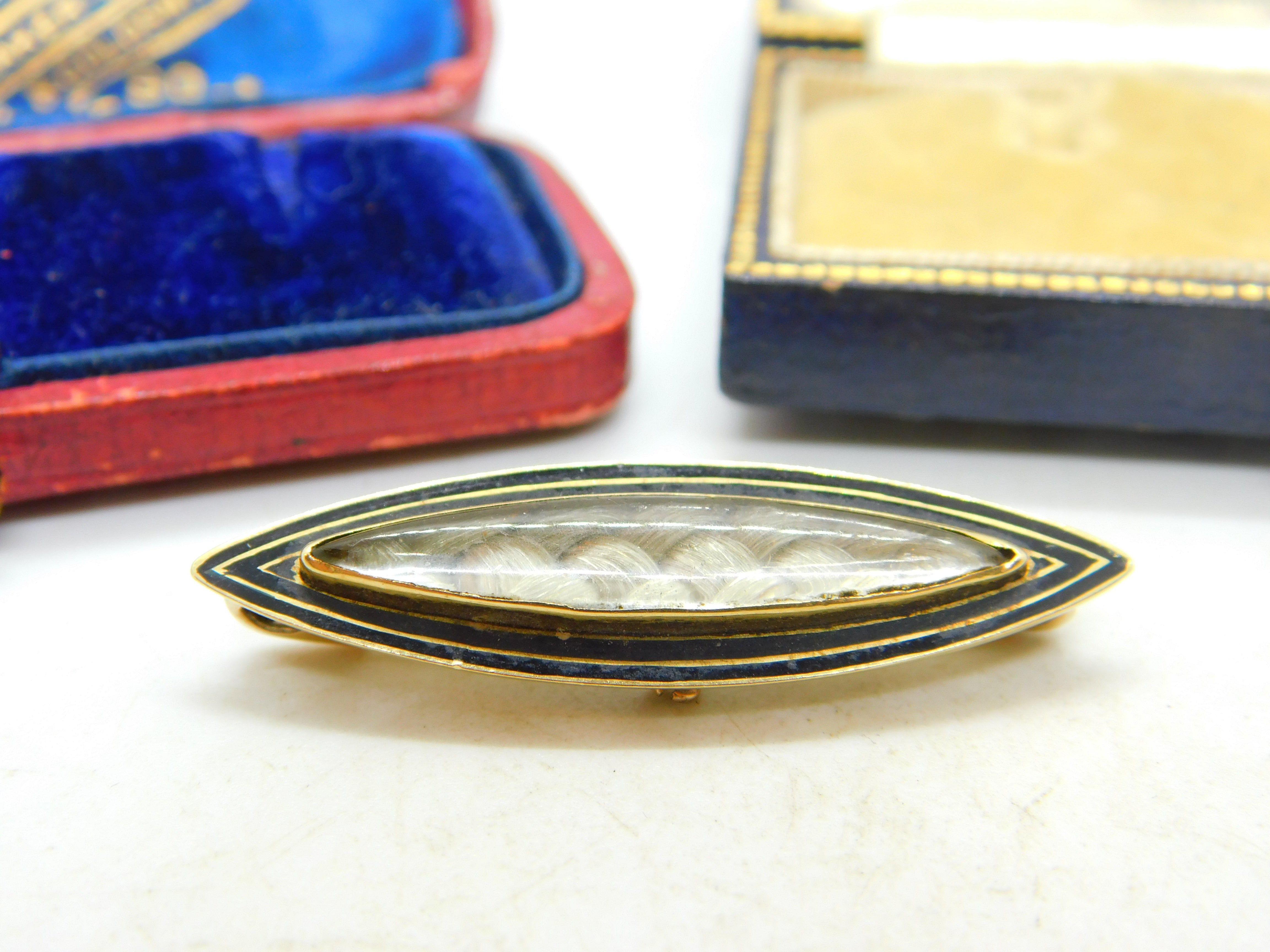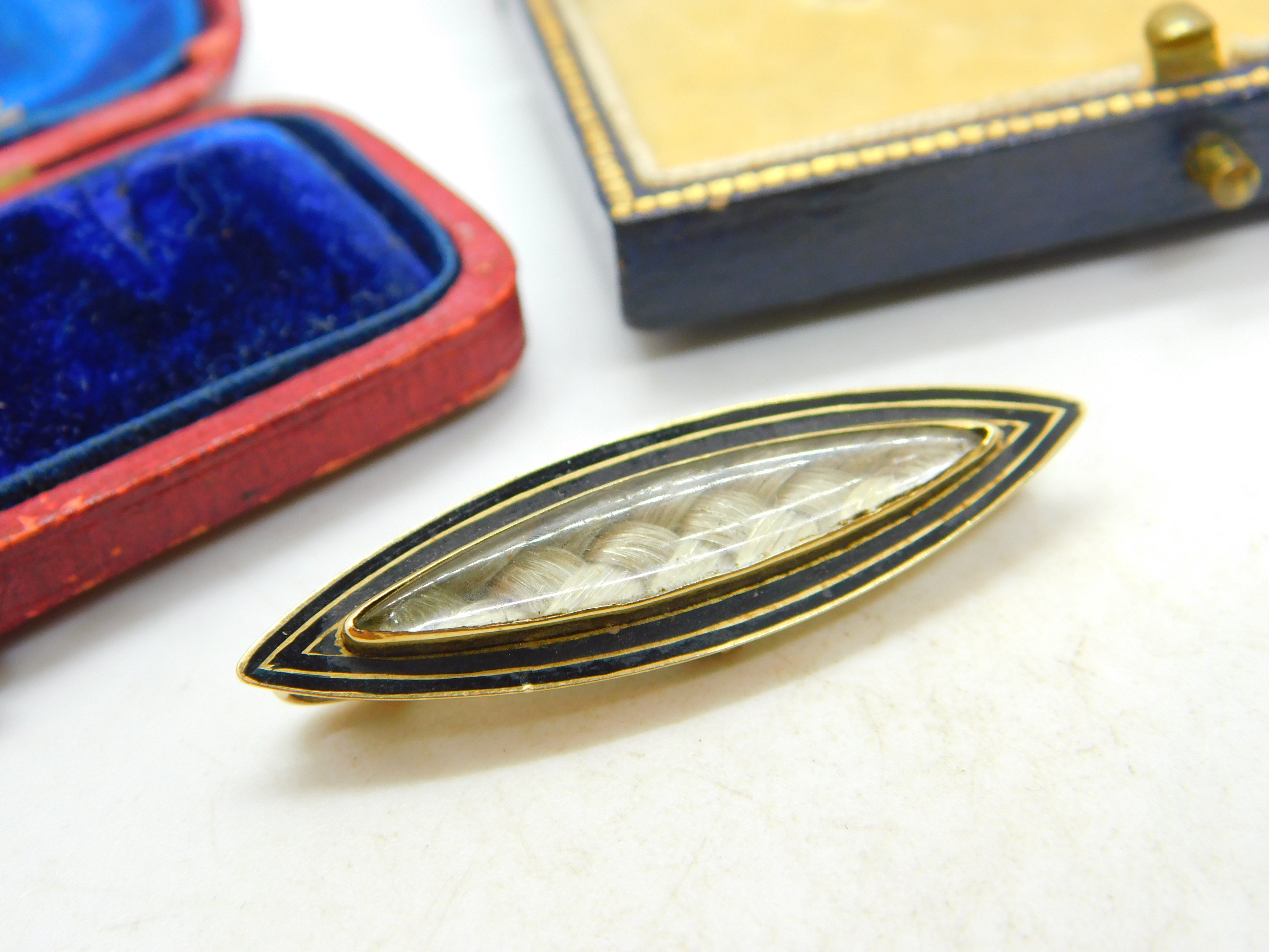 A simply wonderful antique mourning brooch or pin dating from the Edwardian era. Made from 9ct yellow gold tested as there are no marks, to the front a black enamel border to the braided blonde hair behind the lens. All seems to be in good order, good secure clasp and pin. Simply wonderful memento to Eliza Bentley.