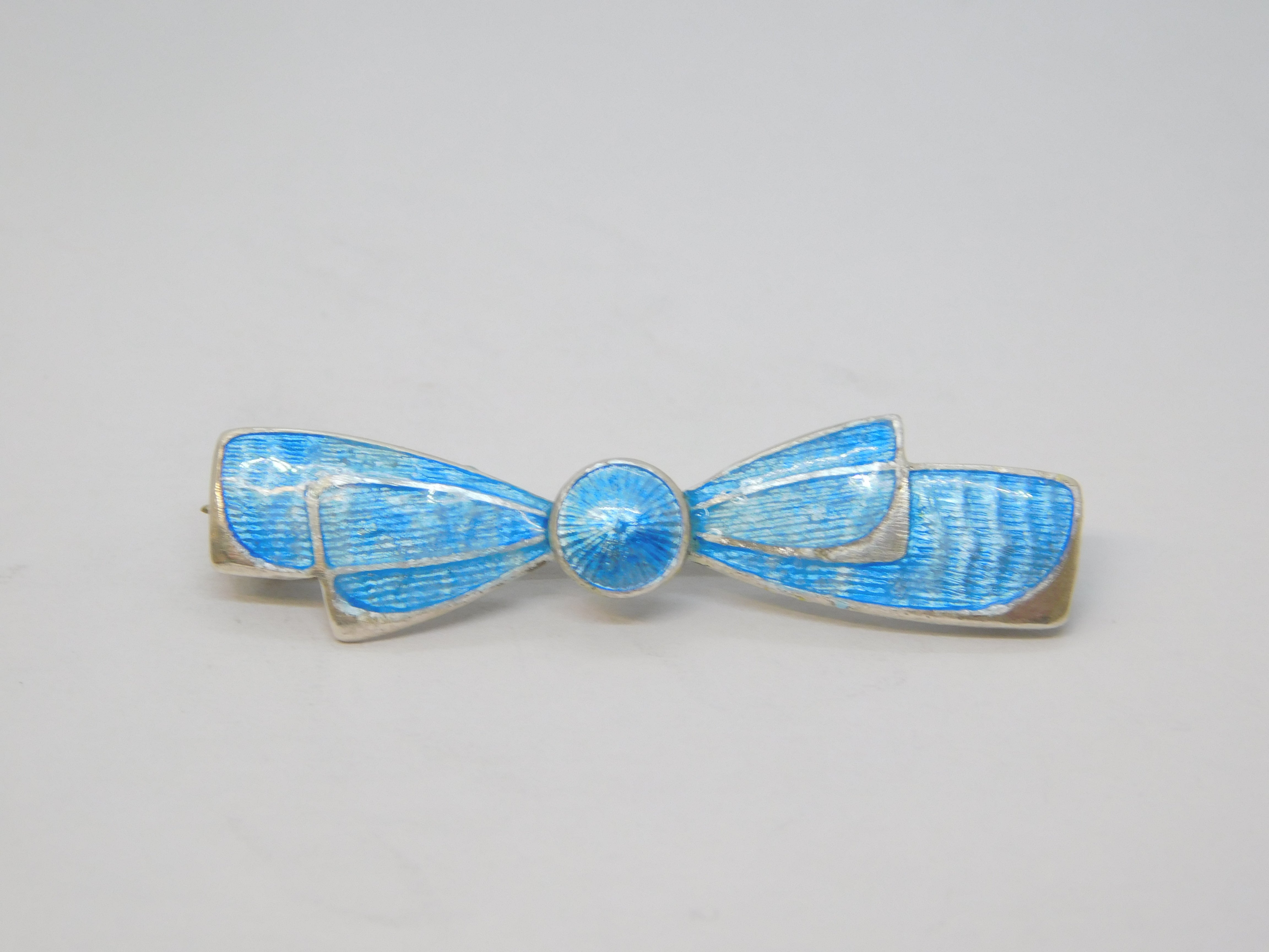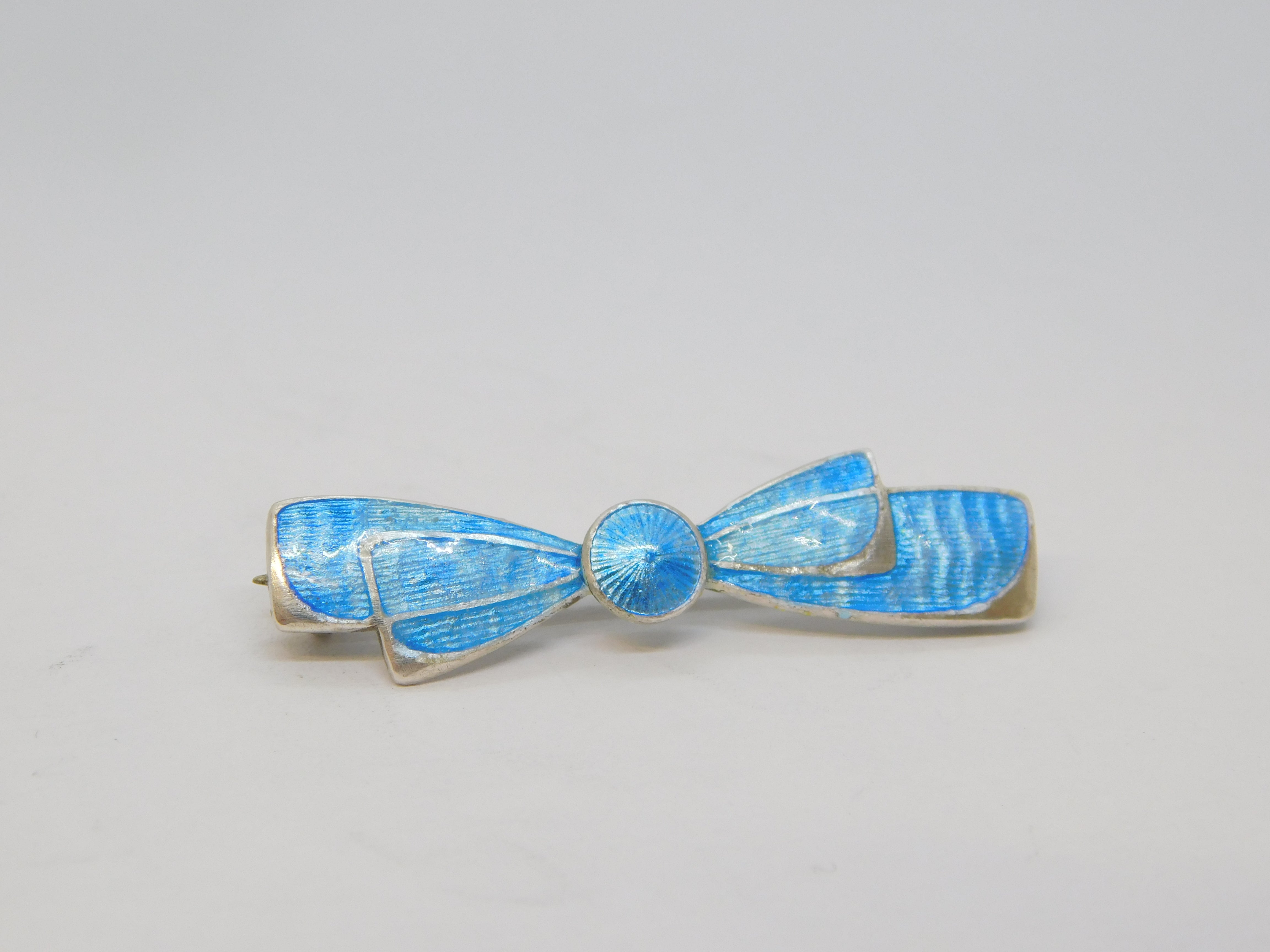Details: A fantastic and wonderfully designed antique art deco sterling silver blue guilloche enamel bow tie brooch with lovely detailing hallmarked to the reverse by Charles Horner c1920. This is a wonderful item that would make a perfect gift or addition to any collection.