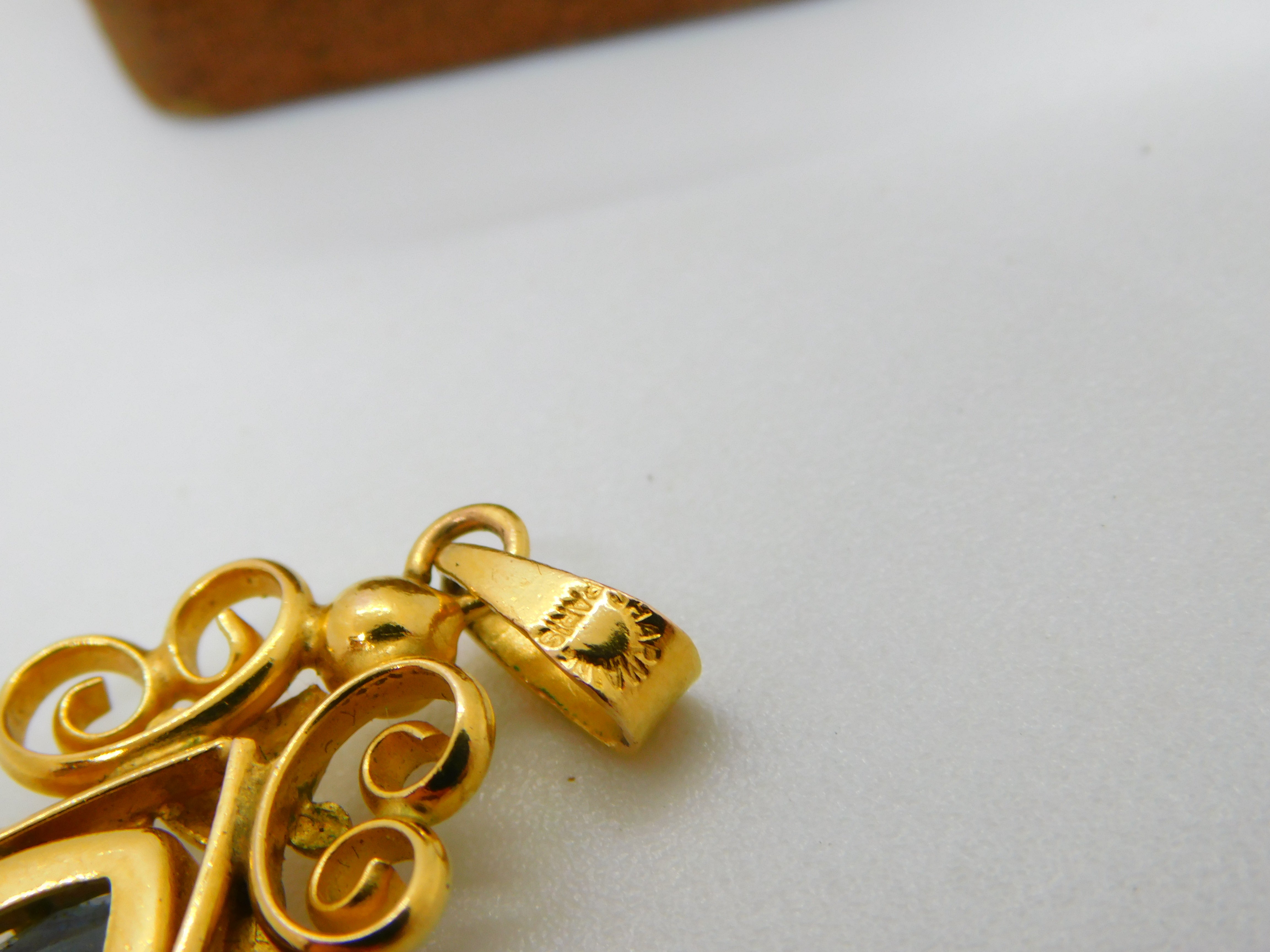 Details: A fantastic and wonderfully designed vintage 15ct rolled gold large drop pendant set with imperial blue topaz hallmarked to the bale by Charmaine Paris c1960. XRF tests as 15ct gold but sold as rolled gold. This is a wonderful item that would make a perfect gift or addition to any collection. The BOX pictured is for PRESENTATION ONLY and is NOT included in the listings but used to frame the pictures unless specifically stated otherwise.