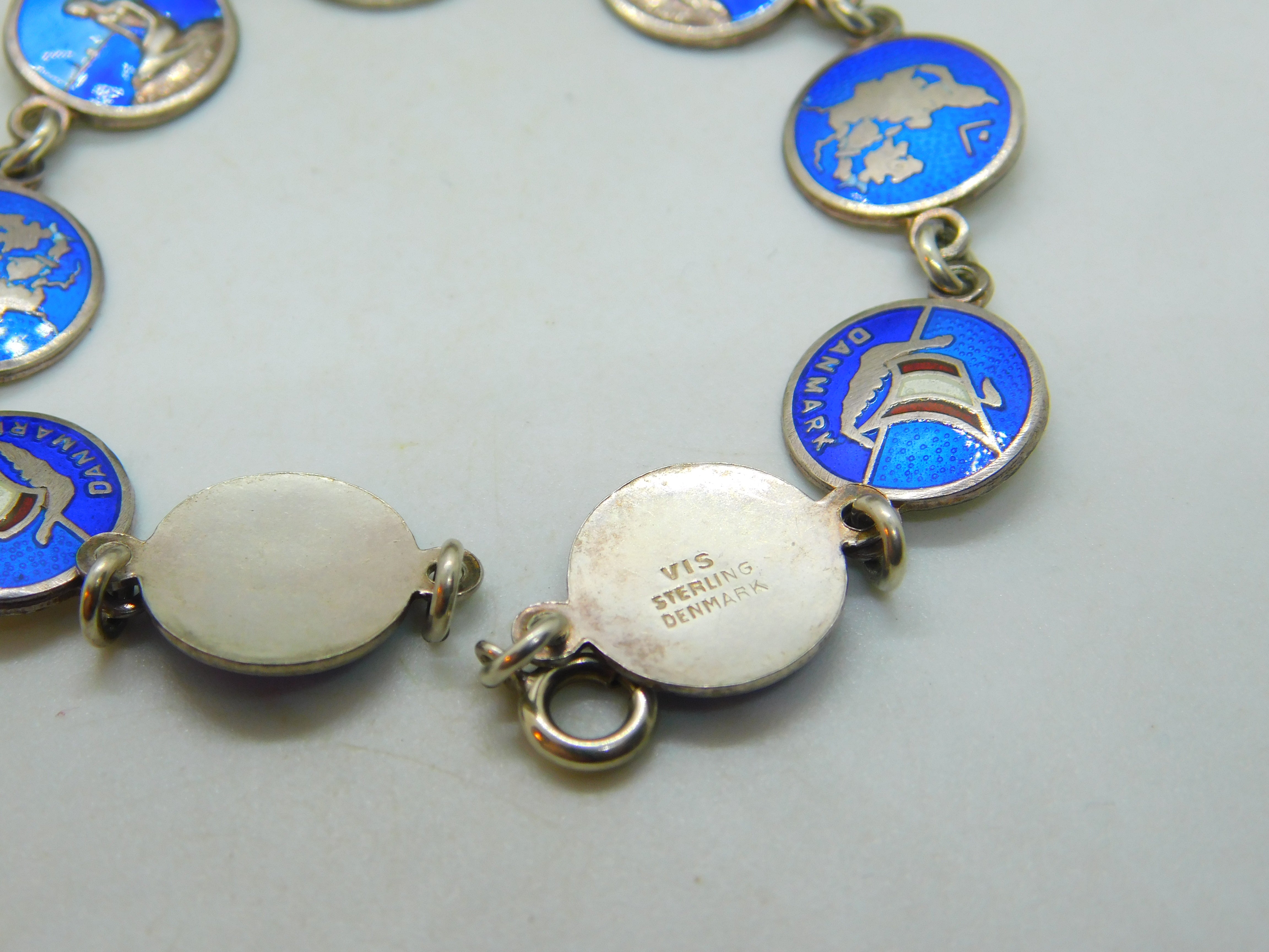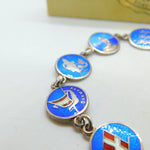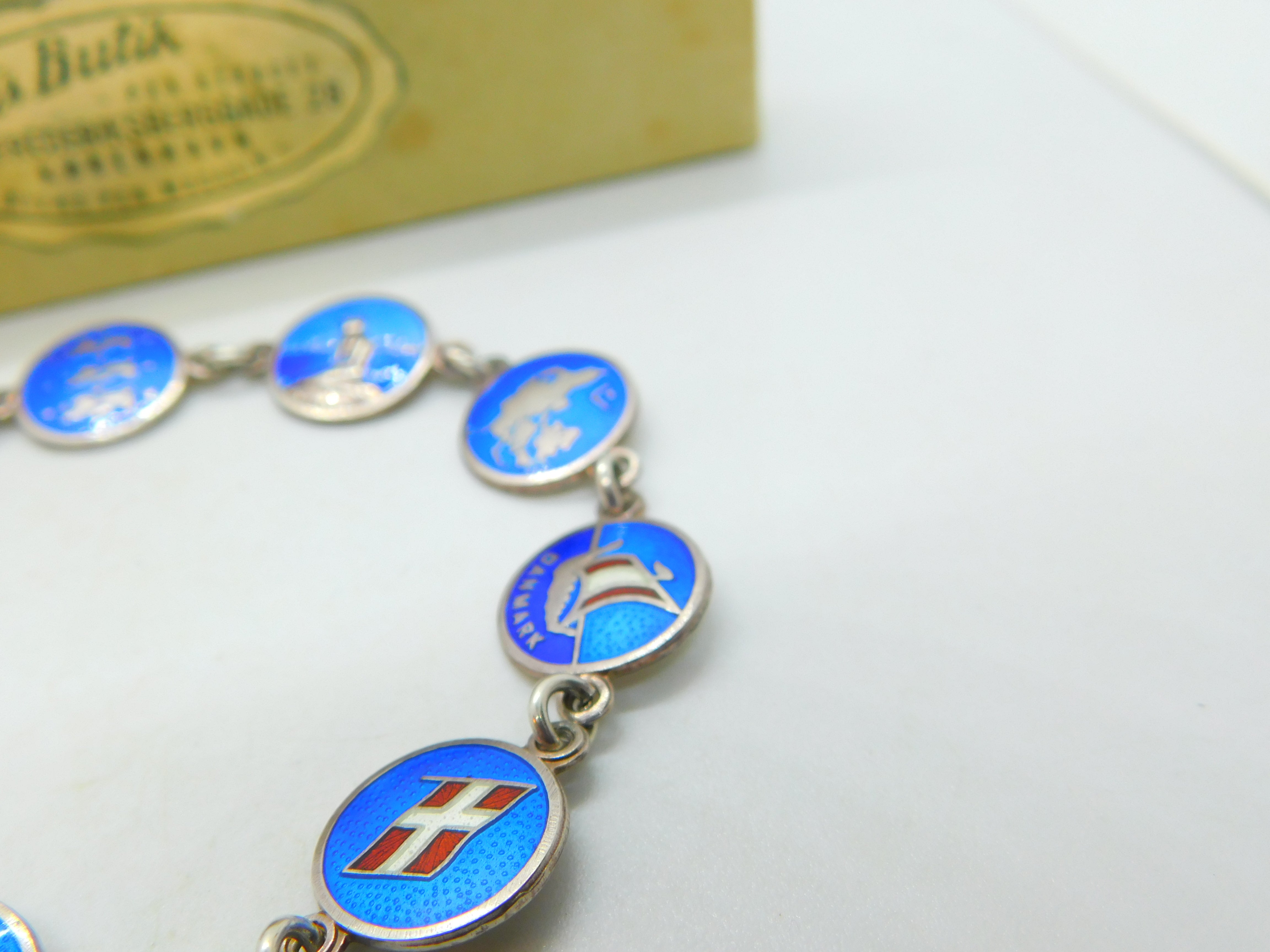 Details: A fantastic and wonderfully designed mid-century sterling silver and colourful enamel Danish panel bracelet with Viking ship, map and other outlines hallmarked to the reverse and sold with the original box by Emis Butik of Copenhagen c1950. This is a wonderful item that would make a perfect gift or addition to any collection.