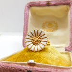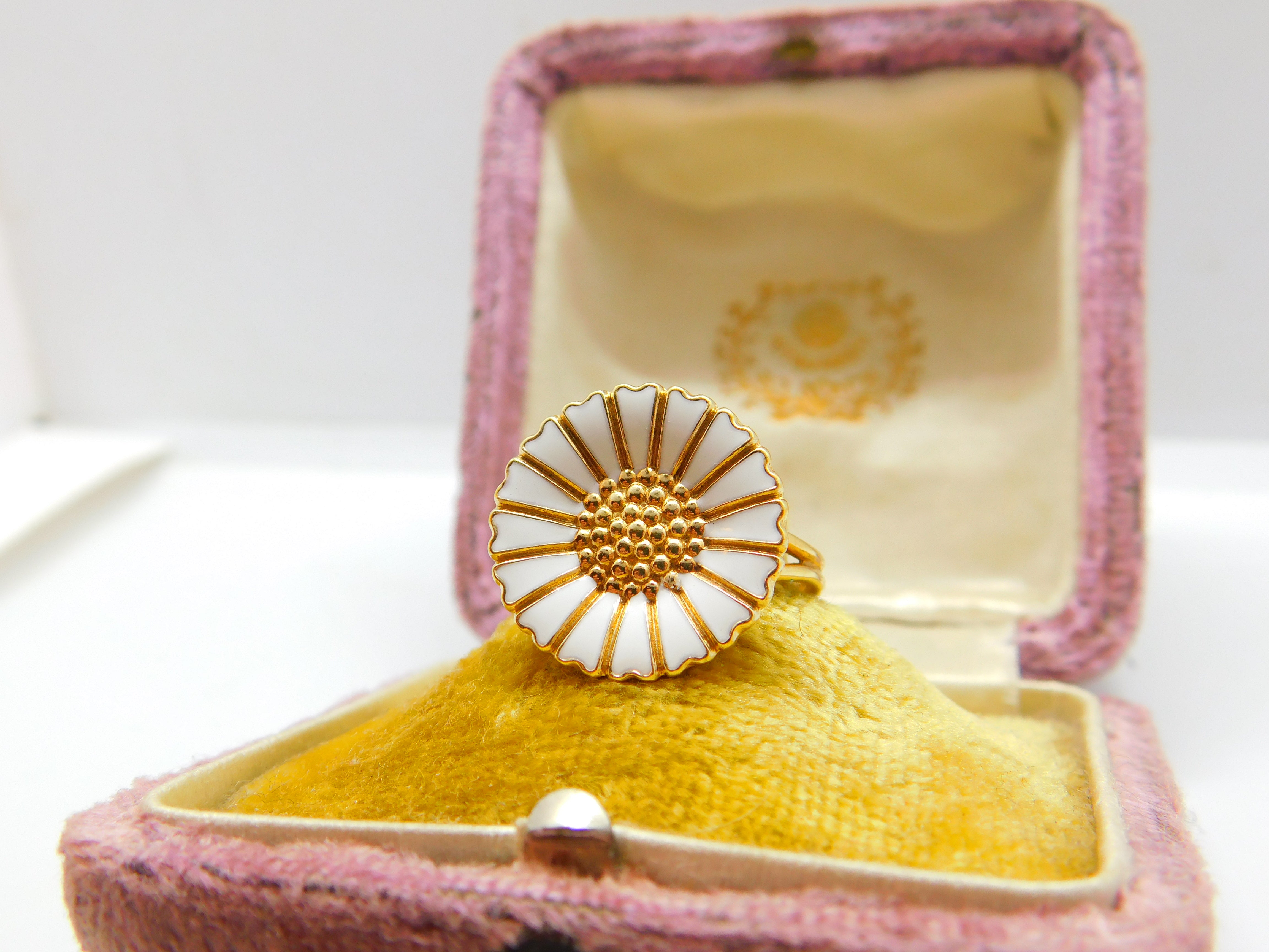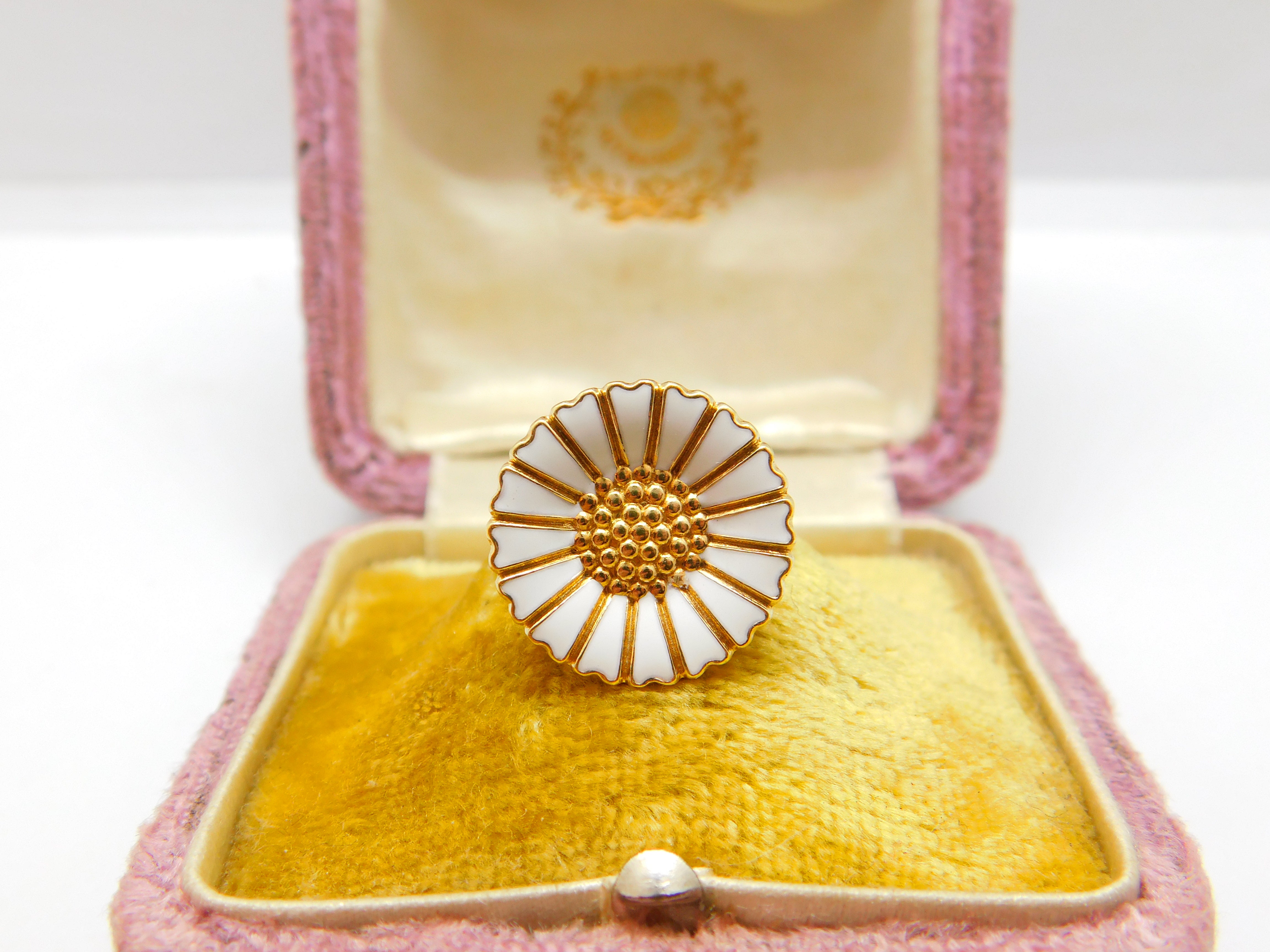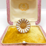 Details: A fantastic and wonderfully designed mid-century Danish sterling silver gilt and white enamel daisy flower band ring with charming design marked 925S HB to the reverse. This is a wonderful item that would make a perfect gift or addition to any collection. The BOX pictured is for PRESENTATION ONLY and is NOT included in the listings but used to frame the pictures unless specifically stated otherwise.