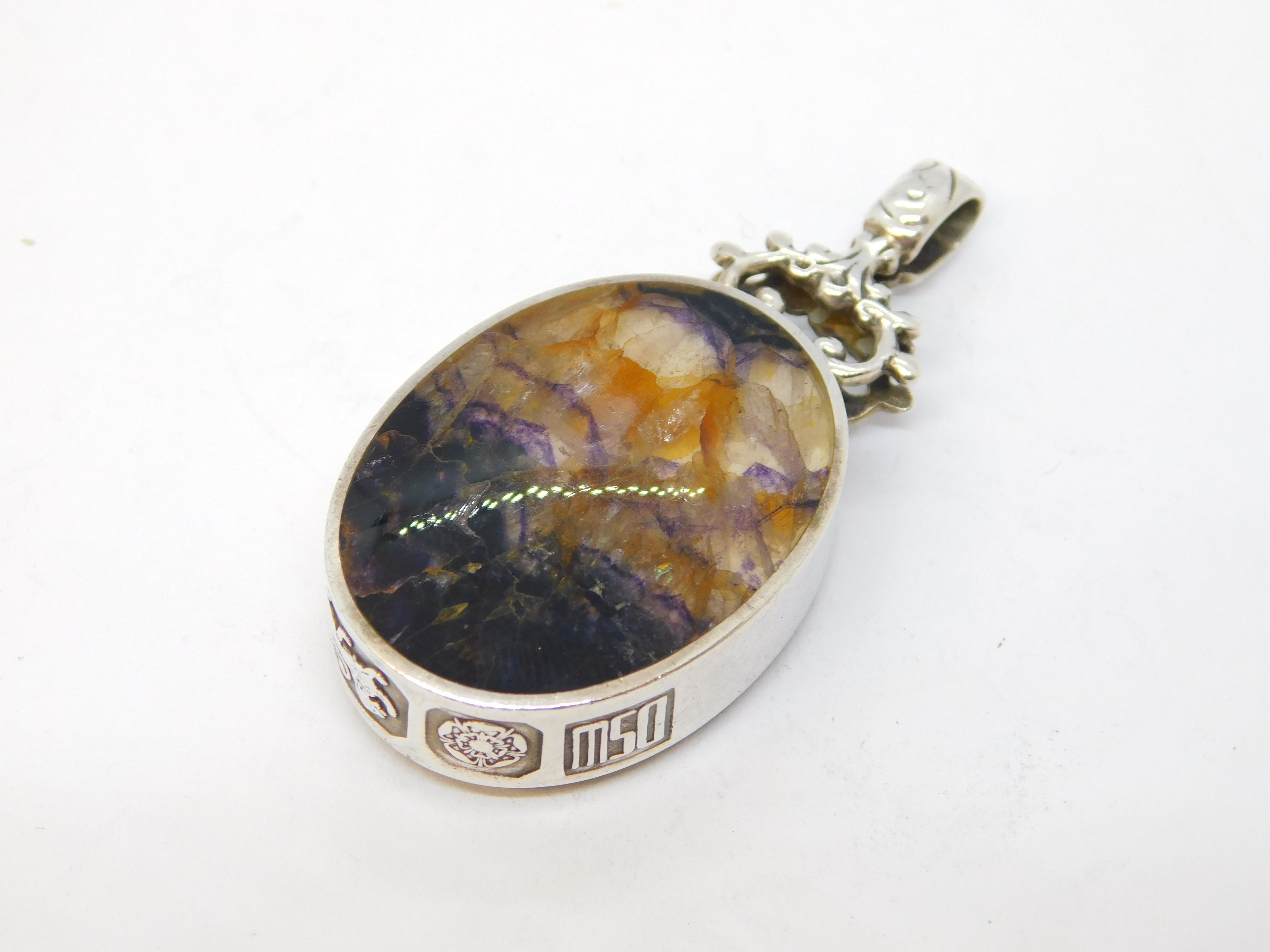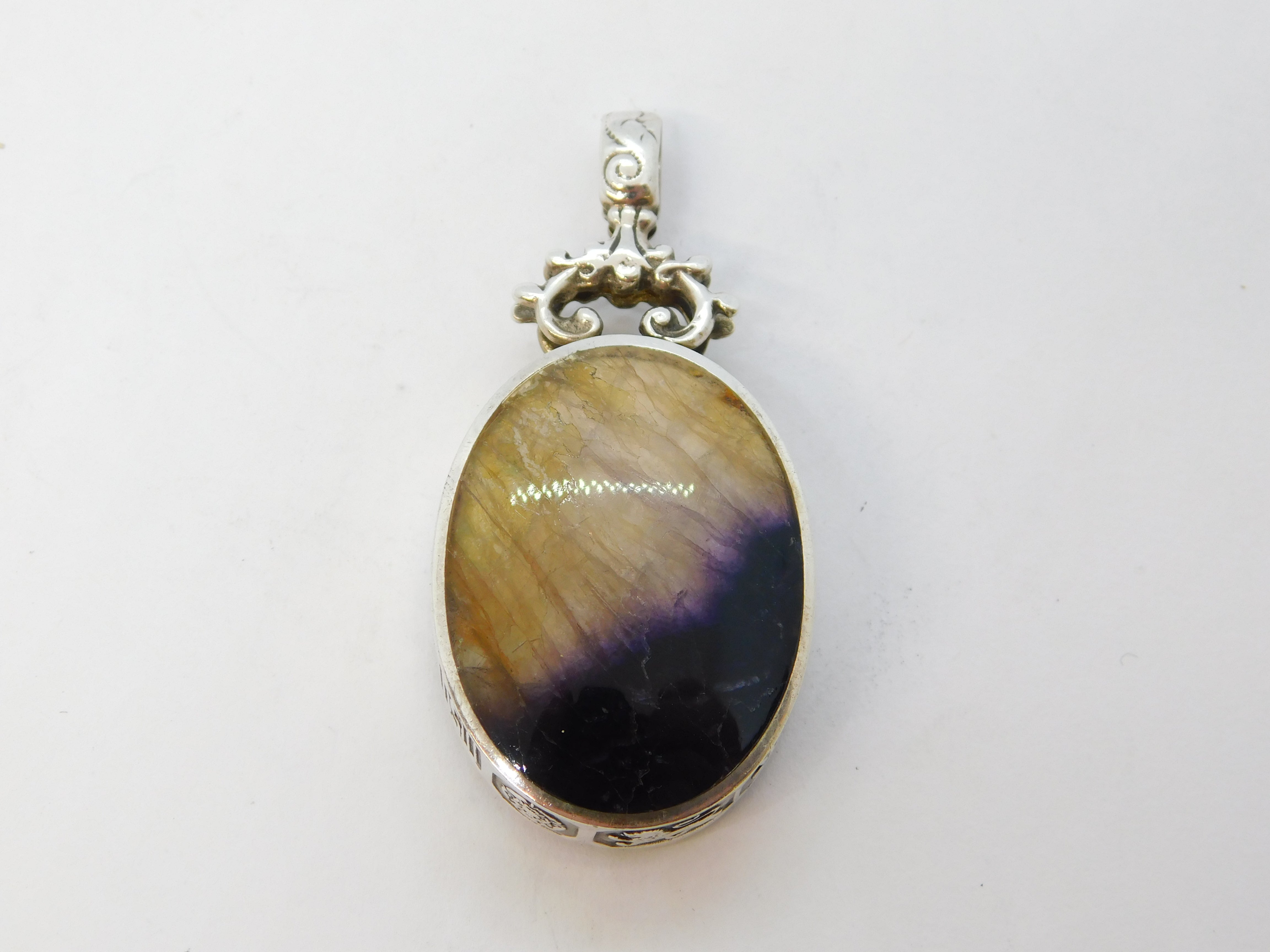 Details: A fantastic and wonderfully designed vintage large sterling silver mounted double sided Derbyshire Blue John set pendant with superb colour and detailing hallmarked Sheffield 1979 by studio jewellery David Scott-Walker. This is a wonderful item that would make a perfect gift or addition to any collection. We are more than happy to provide XRF reports for items upon request.