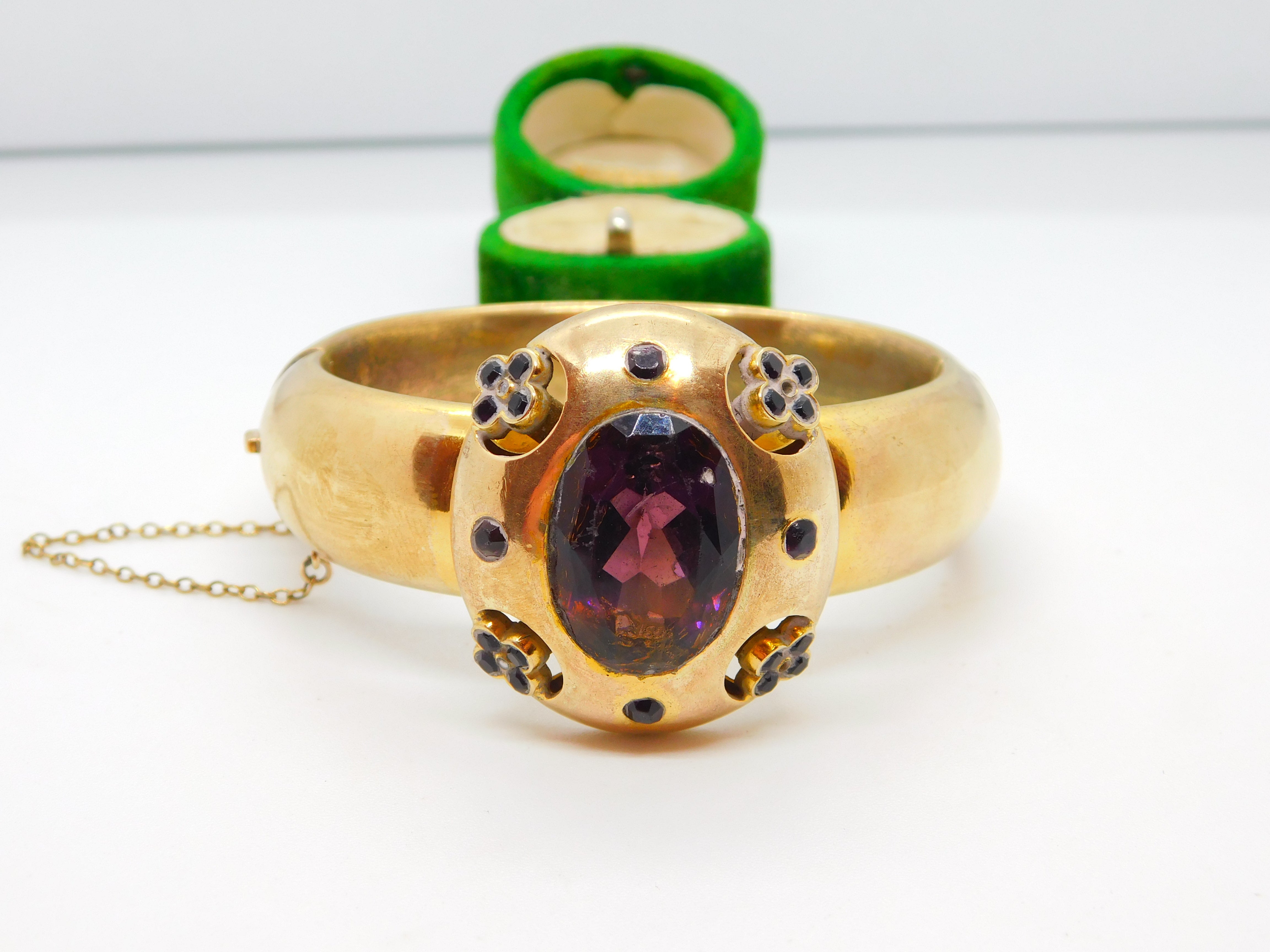 Details: A fantastic and wonderfully designed antique early Victorian pinchbeck cuff bangle in floral style set with amethyst paste stones c1840. This is a wonderful item that would make a perfect gift or addition to any collection. The BOX pictured is for PRESENTATION ONLY and is NOT included in the listings but used to frame the pictures unless specifically stated otherwise.