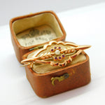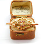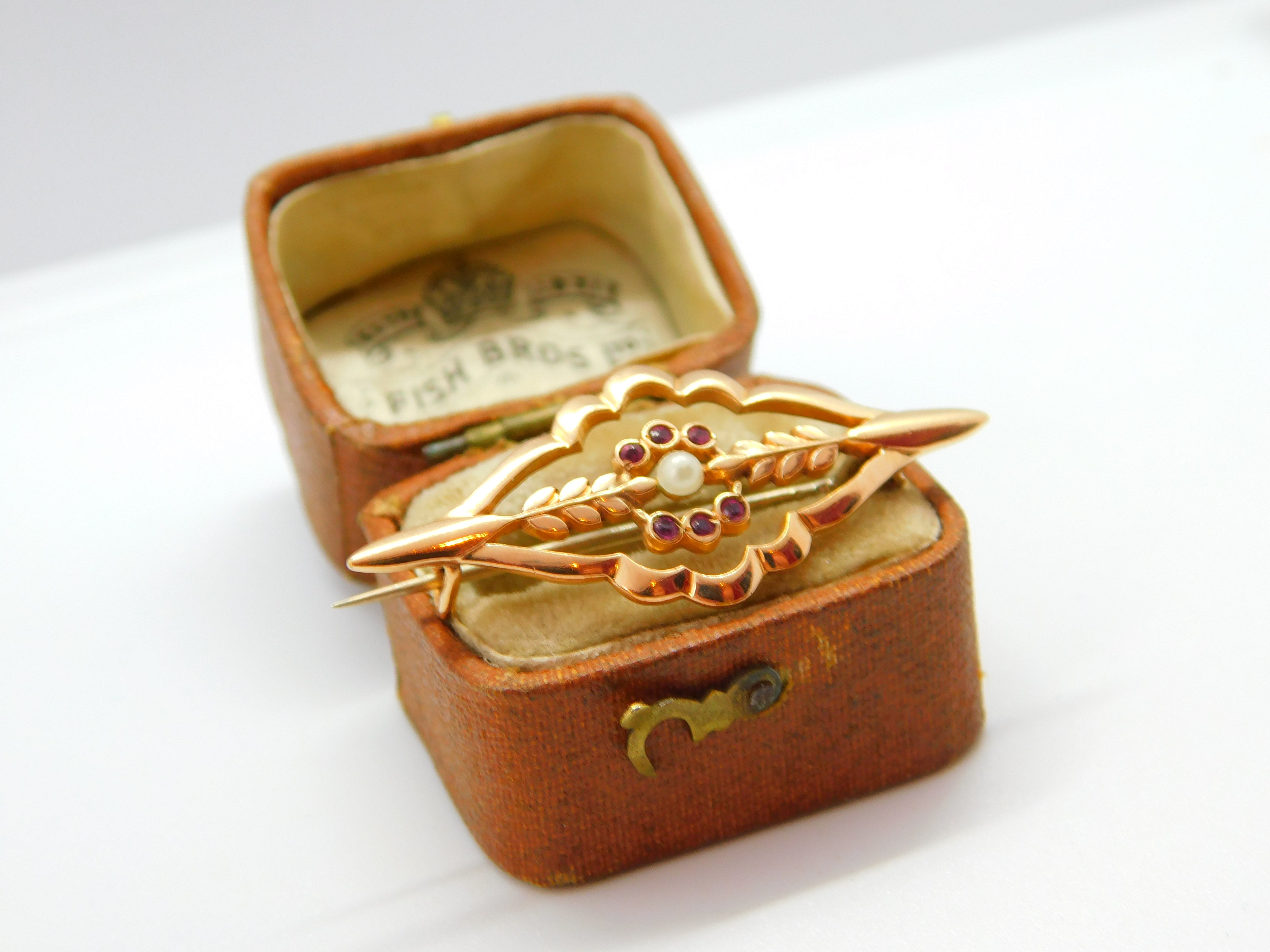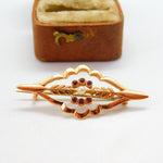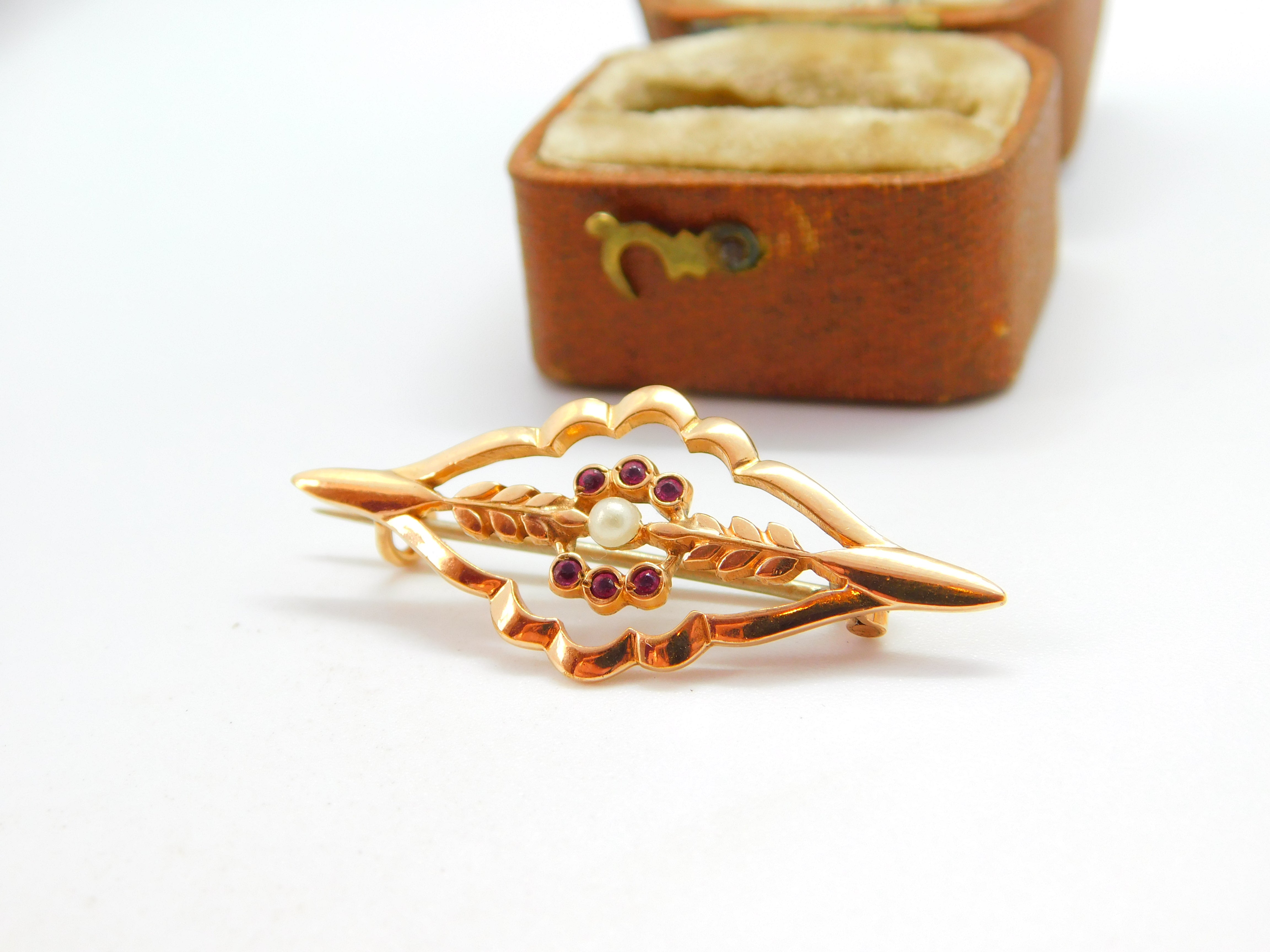 Edwardian 14ct Rose Gold, Ruby & Pearl Set Wreath Sweetheart Brooch c1910