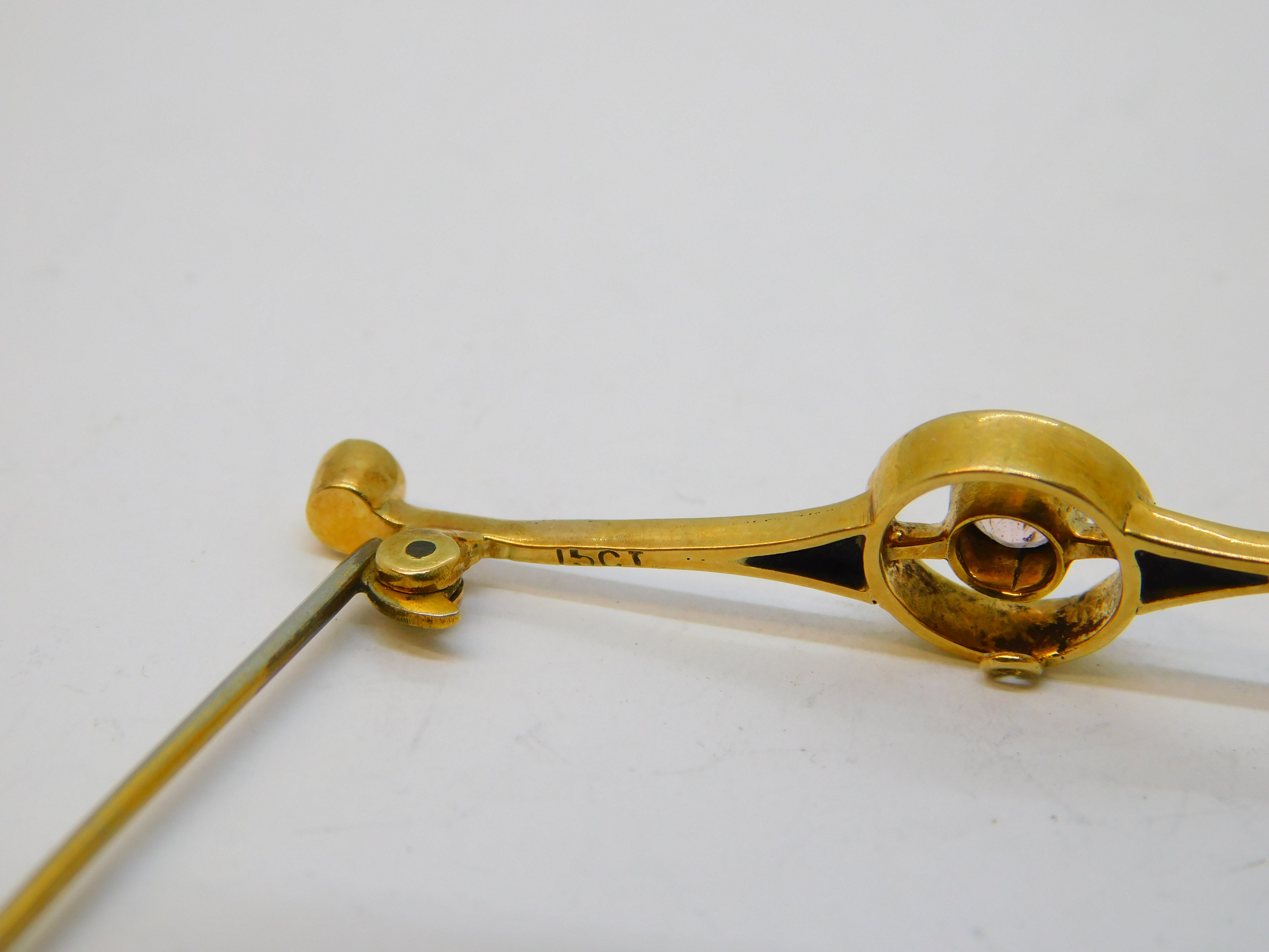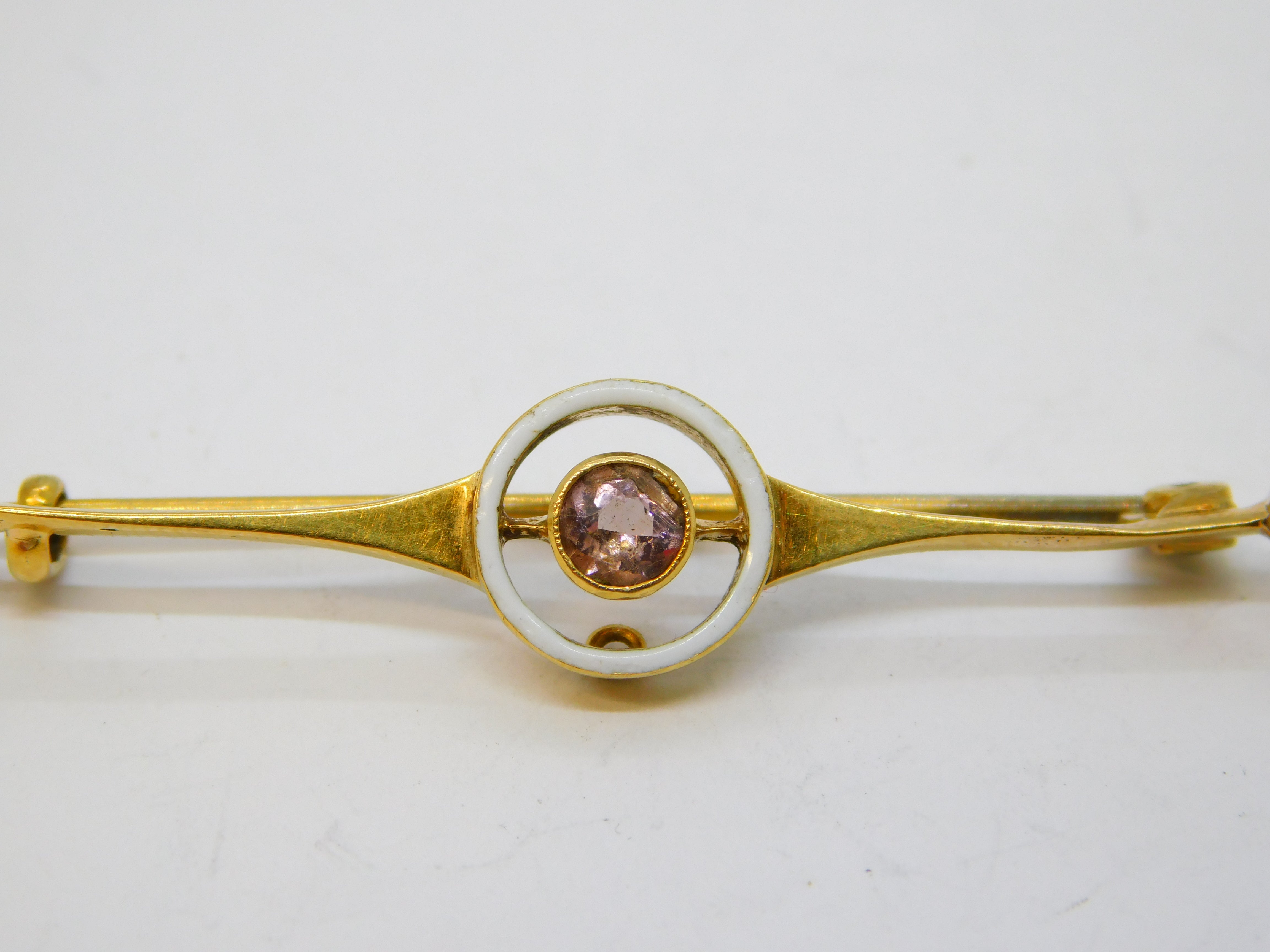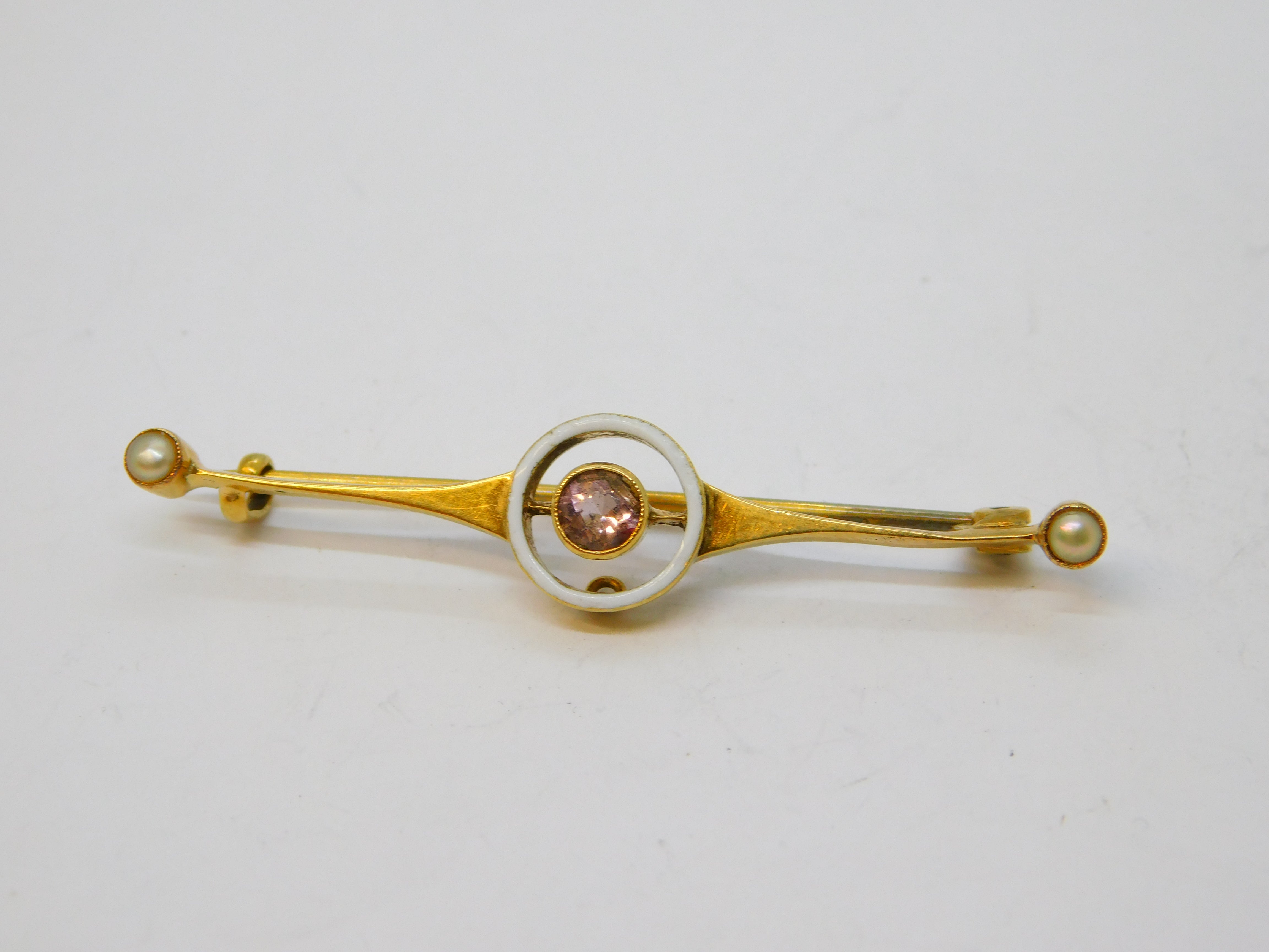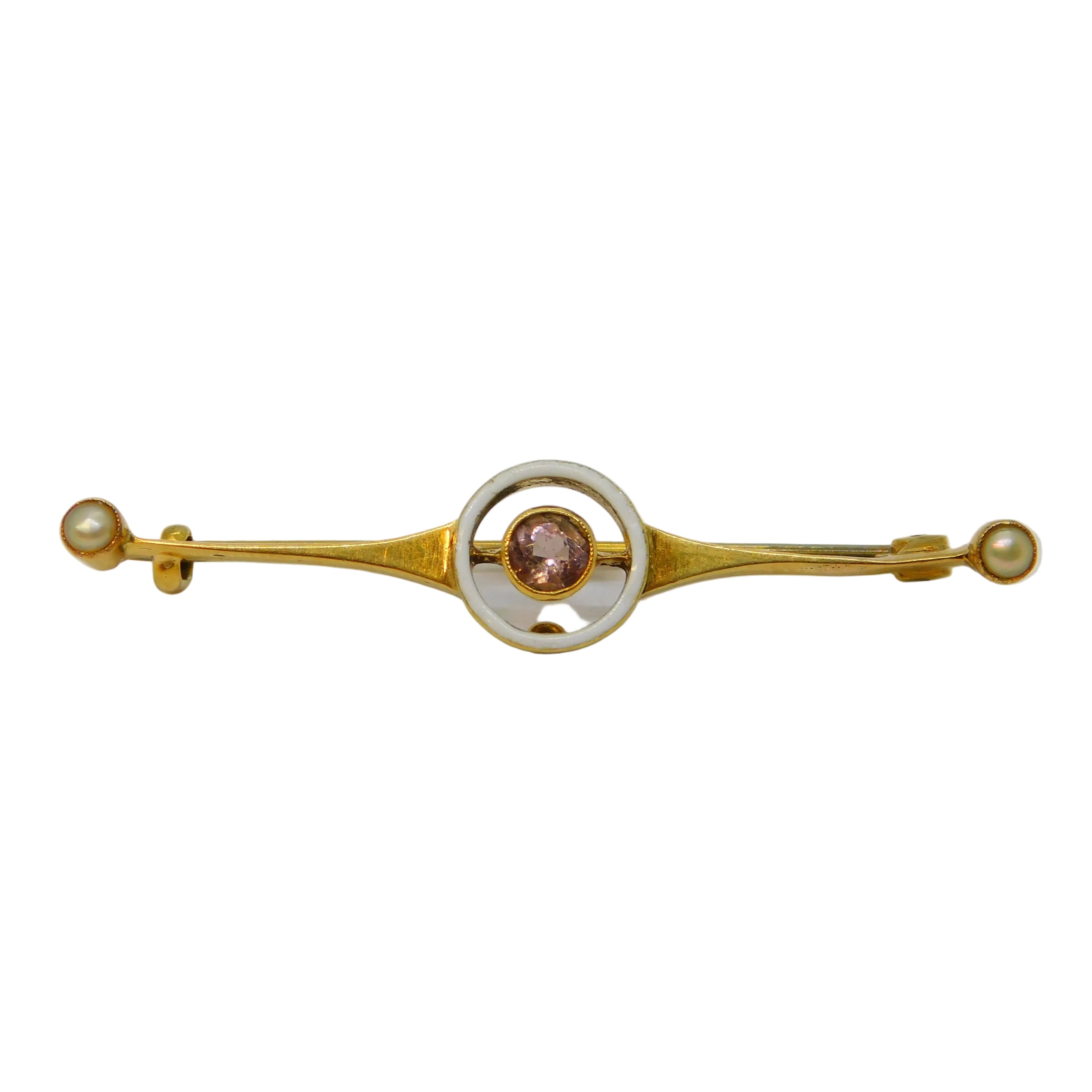 Details: A fantastic and wonderfully designed antique edwardian 15ct yellow gold target brooch with white enamel surrounding a central pink tourmaline with pearls to each end, hallmarked to the reverse c1910. This is a wonderful item that would make a perfect gift or addition to any collection. We are more than happy to provide XRF reports for items upon request.