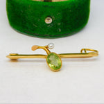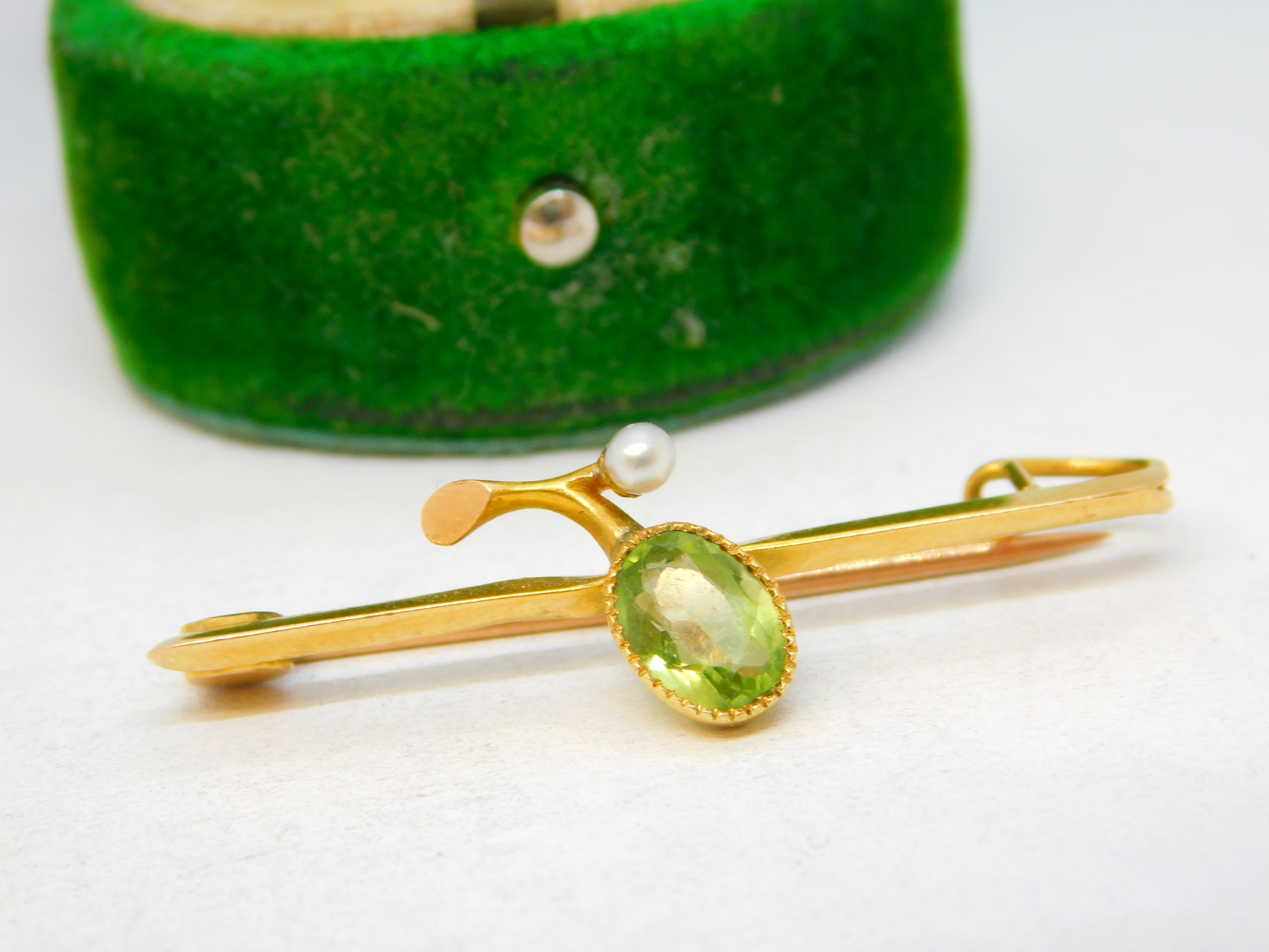 Details: A fantastic and wonderfully designed antique Edwardian 15ct yellow gold, peridot & pearl set suffragette brooch with lovely detailing hallmarked '15ct' to the reverse c1910. This is a wonderful item that would make a perfect gift or addition to any collection. The BOX pictured is for PRESENTATION ONLY and is NOT included in the listings but used to frame the pictures unless specifically stated otherwise.