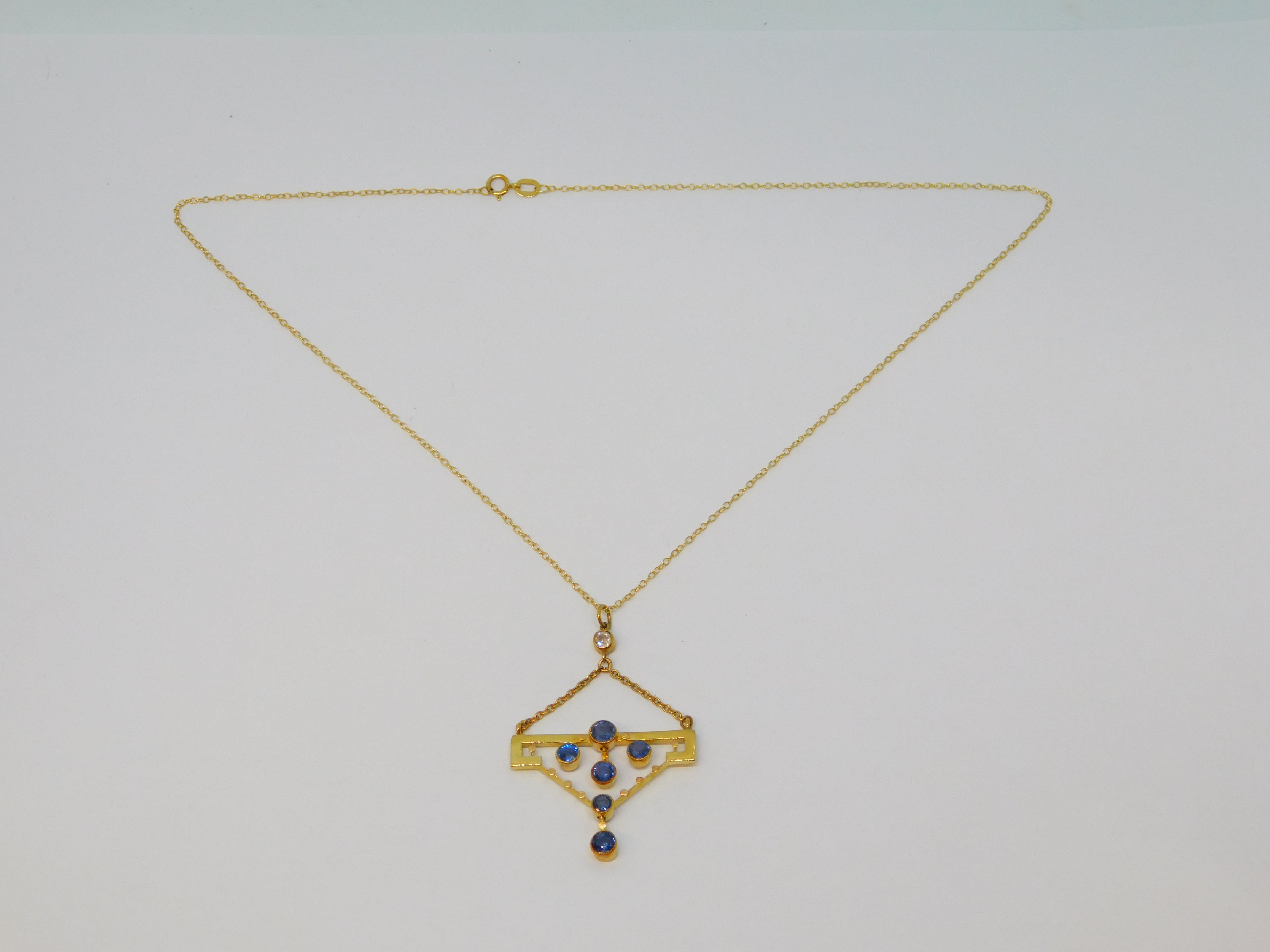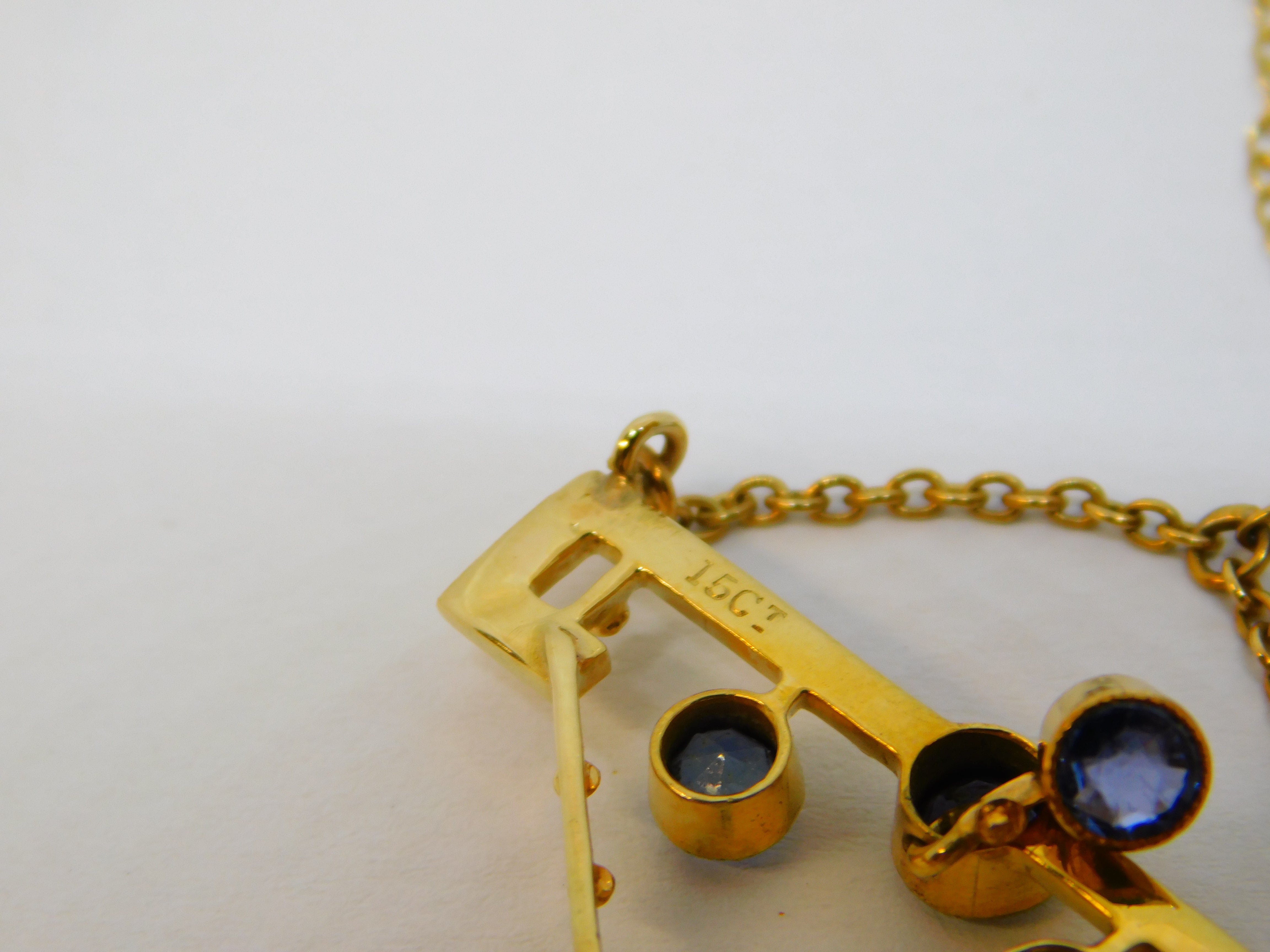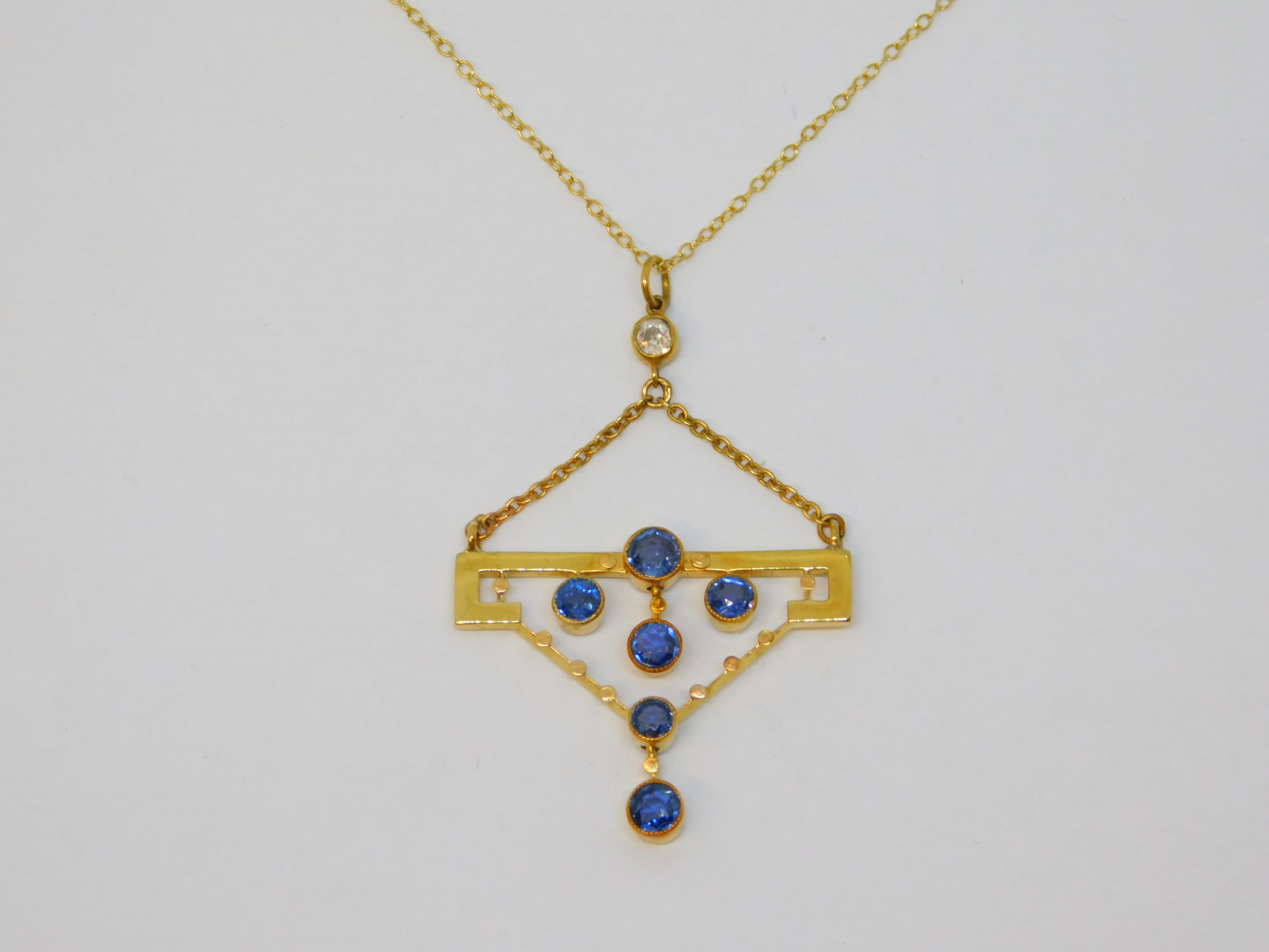 Details: A fantastic and wonderfully designed antique Edwardian 15ct yellow gold lavalier drop pendant necklace set with six sapphires below a brilliant cut 0.15ct diamond hallmarked 15ct to the reverse, set on a later 9ct yellow gold cable chain. This is a wonderful item that would make a perfect gift or addition to any collection.