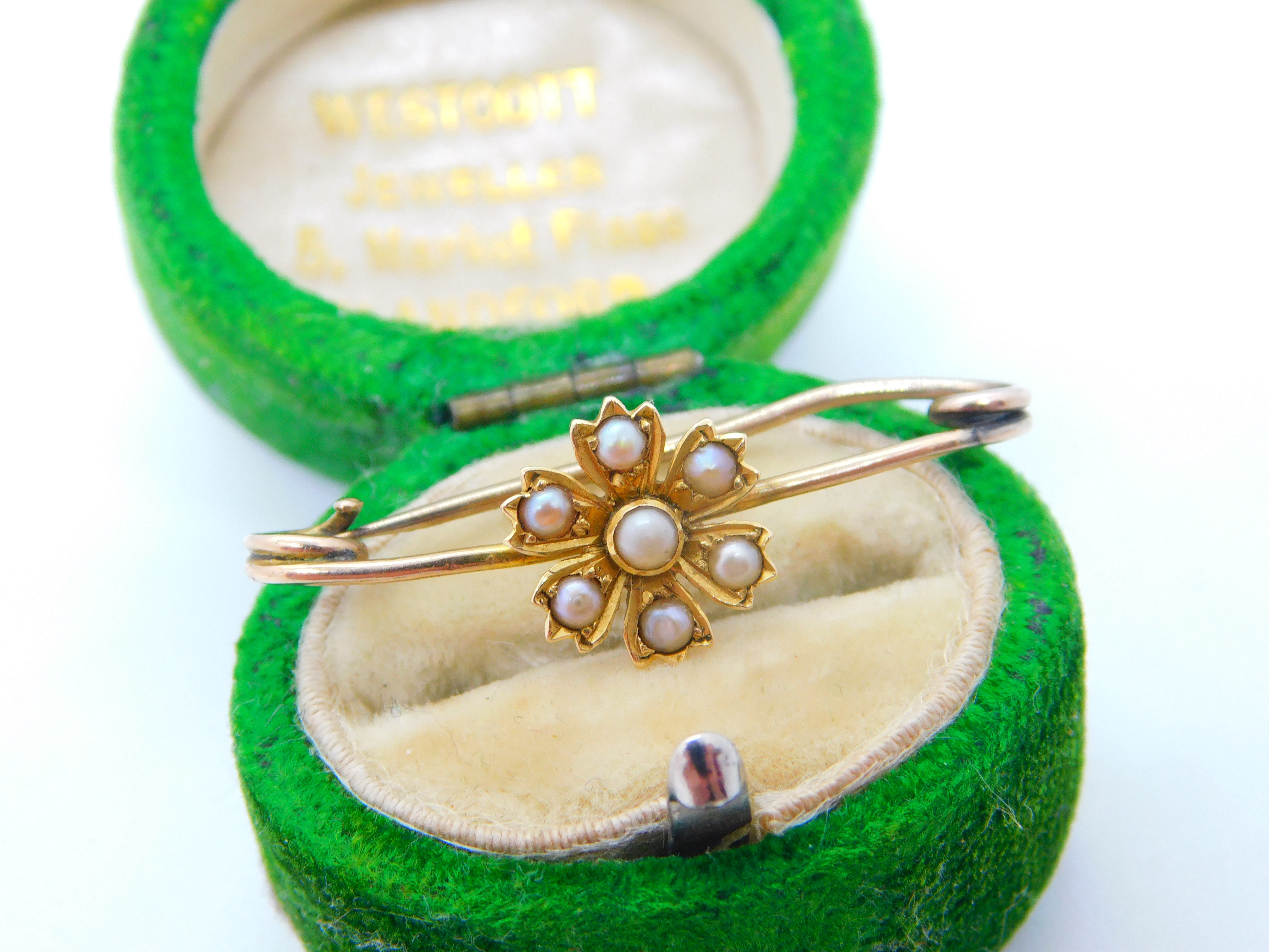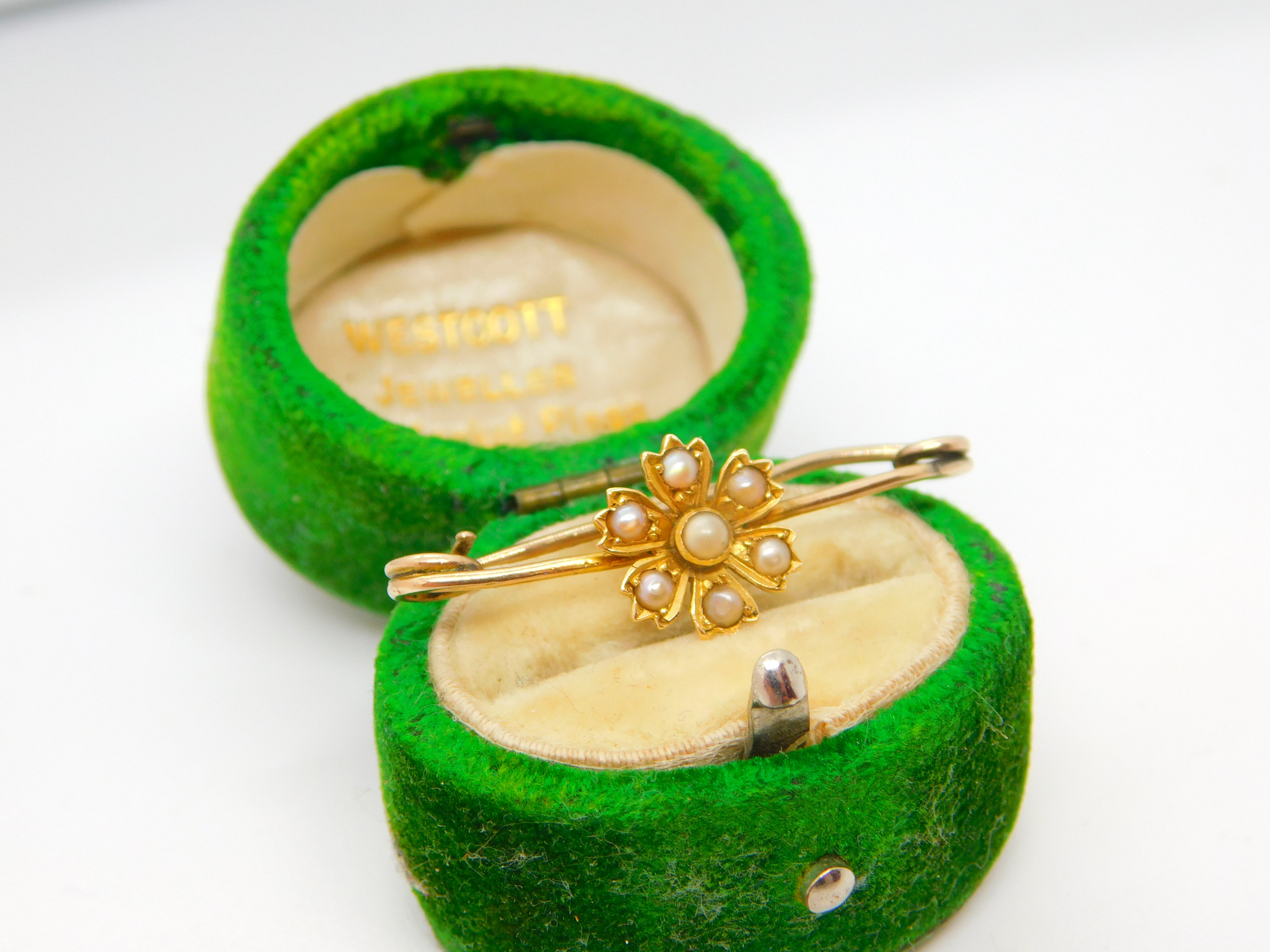 Details: A fantastic and wonderfully designed antique Edwardian 15ct yellow gold seed pearl set floral bar brooch c1910. The gold has been XRF tested as it is unmarked. This is a wonderful item that would make a perfect gift or addition to any collection. The BOX pictured is for PRESENTATION ONLY and is NOT included in the listings but used to frame the pictures unless specifically stated otherwise.