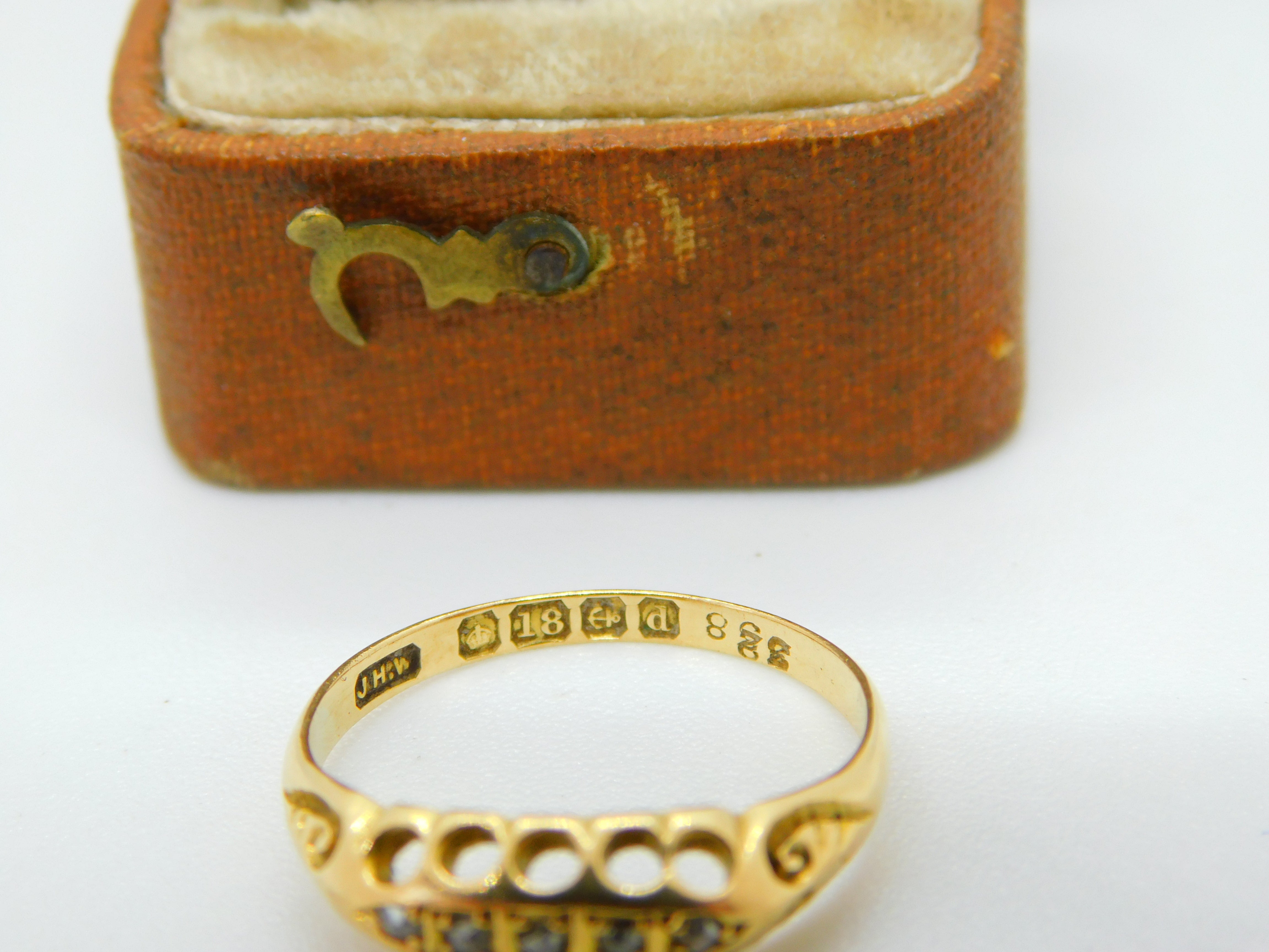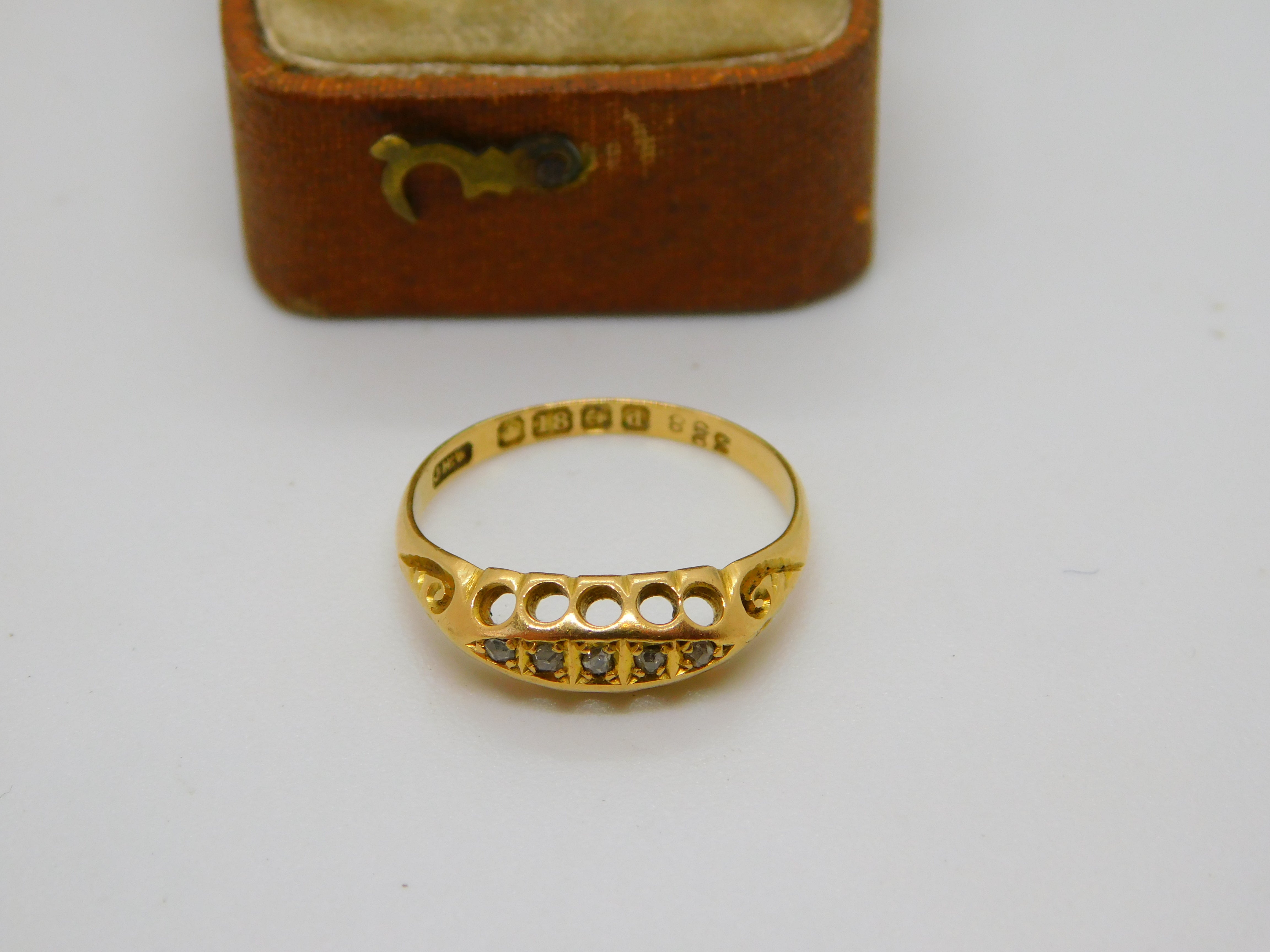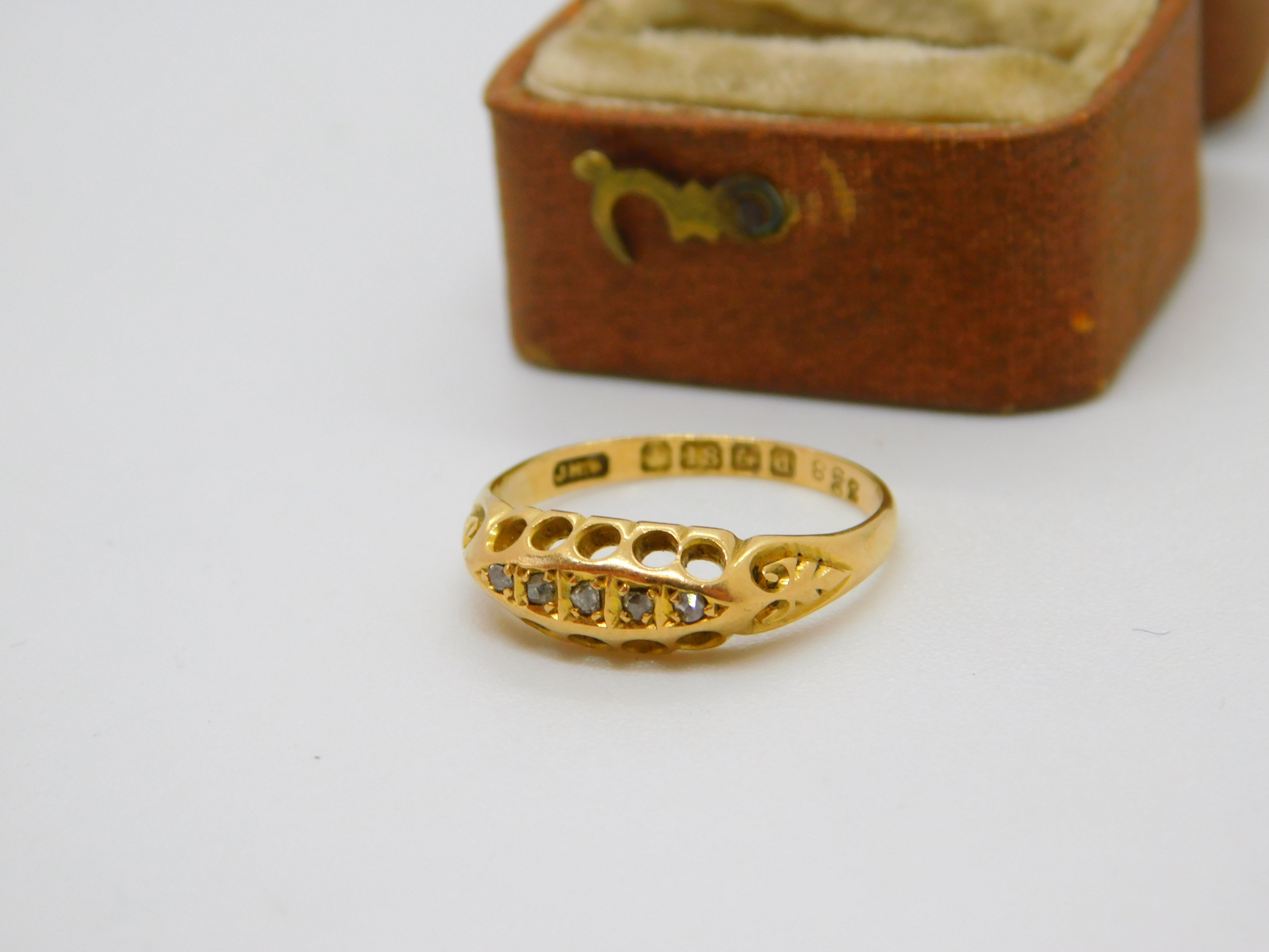 Details: A fantastic and wonderfully designed antique Edwardian 18ct yellow gold boat ring set with five diamonds hallmarked Birmingham 1903 to the interior. This is a wonderful item that would make a perfect gift or addition to any collection. The BOX pictured is for PRESENTATION ONLY and is NOT included in the listings but used to frame the pictures unless specifically stated otherwise.