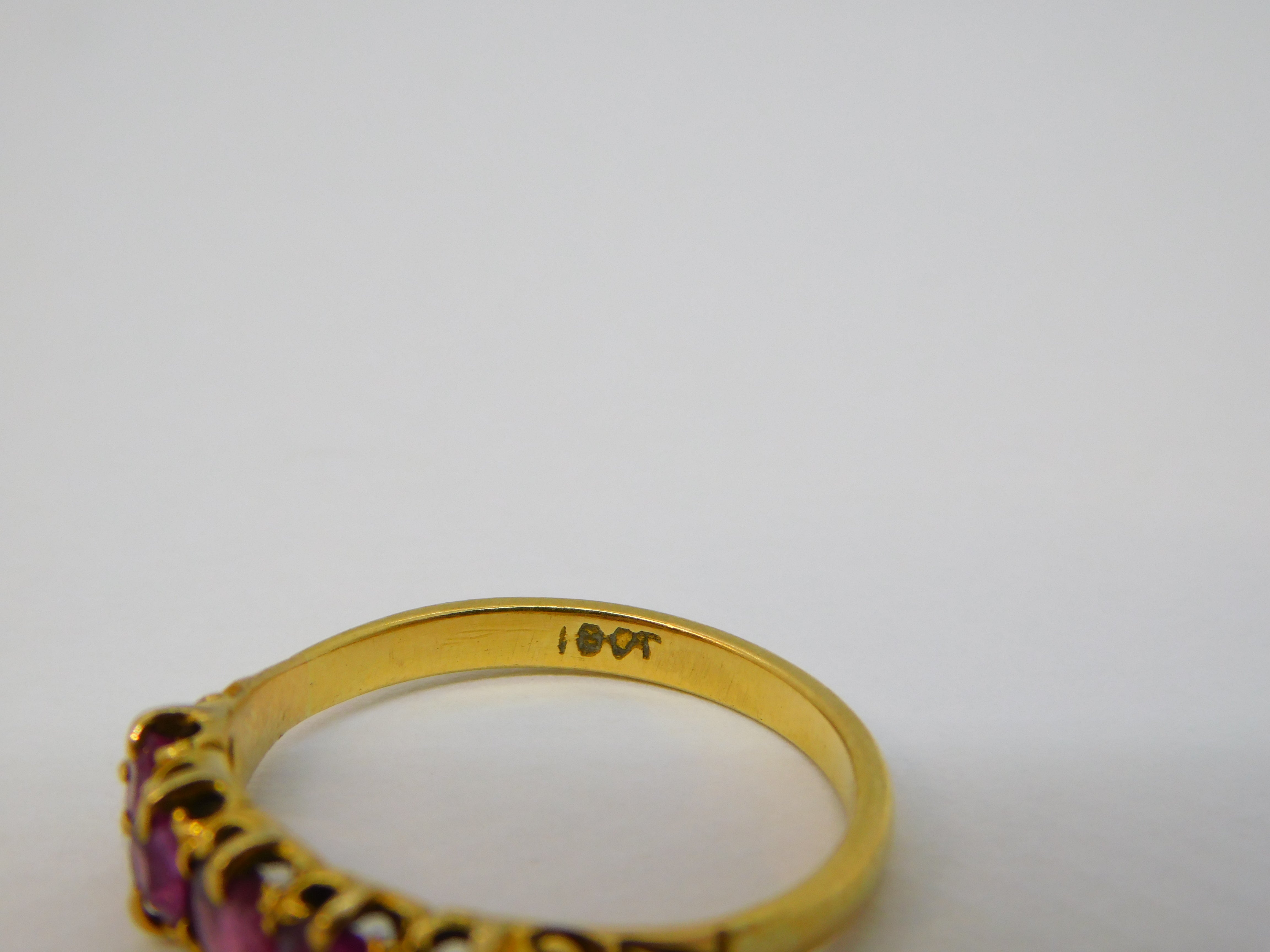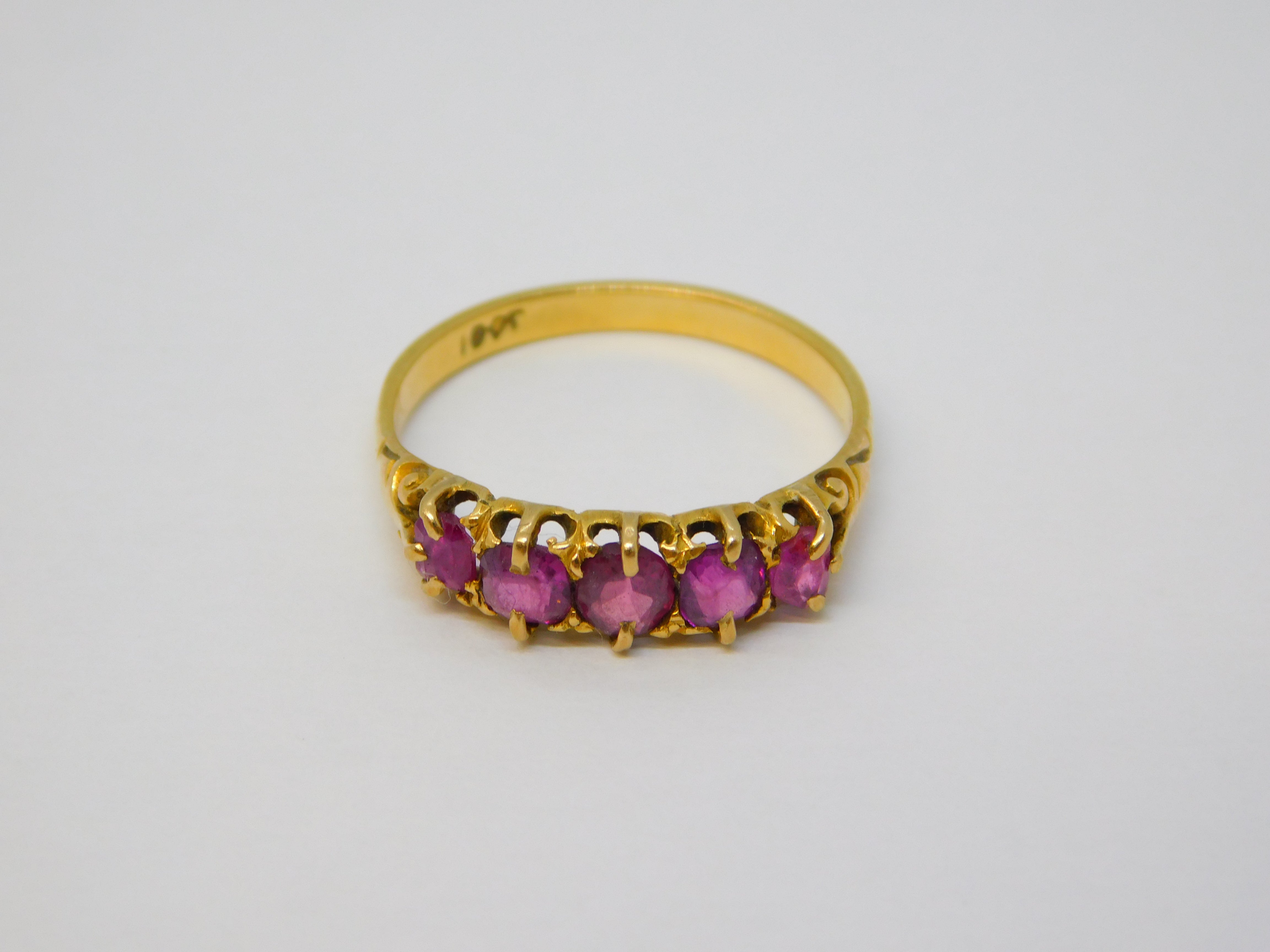 Details: A fantastic and wonderfully designed antique Edwardian 18ct yellow gold five-stone ruby set dress ring with lovely detailing hallmarked '18ct' to the interior band, the rubies have been tested. This is a wonderful item that would make a perfect gift or addition to any collection.