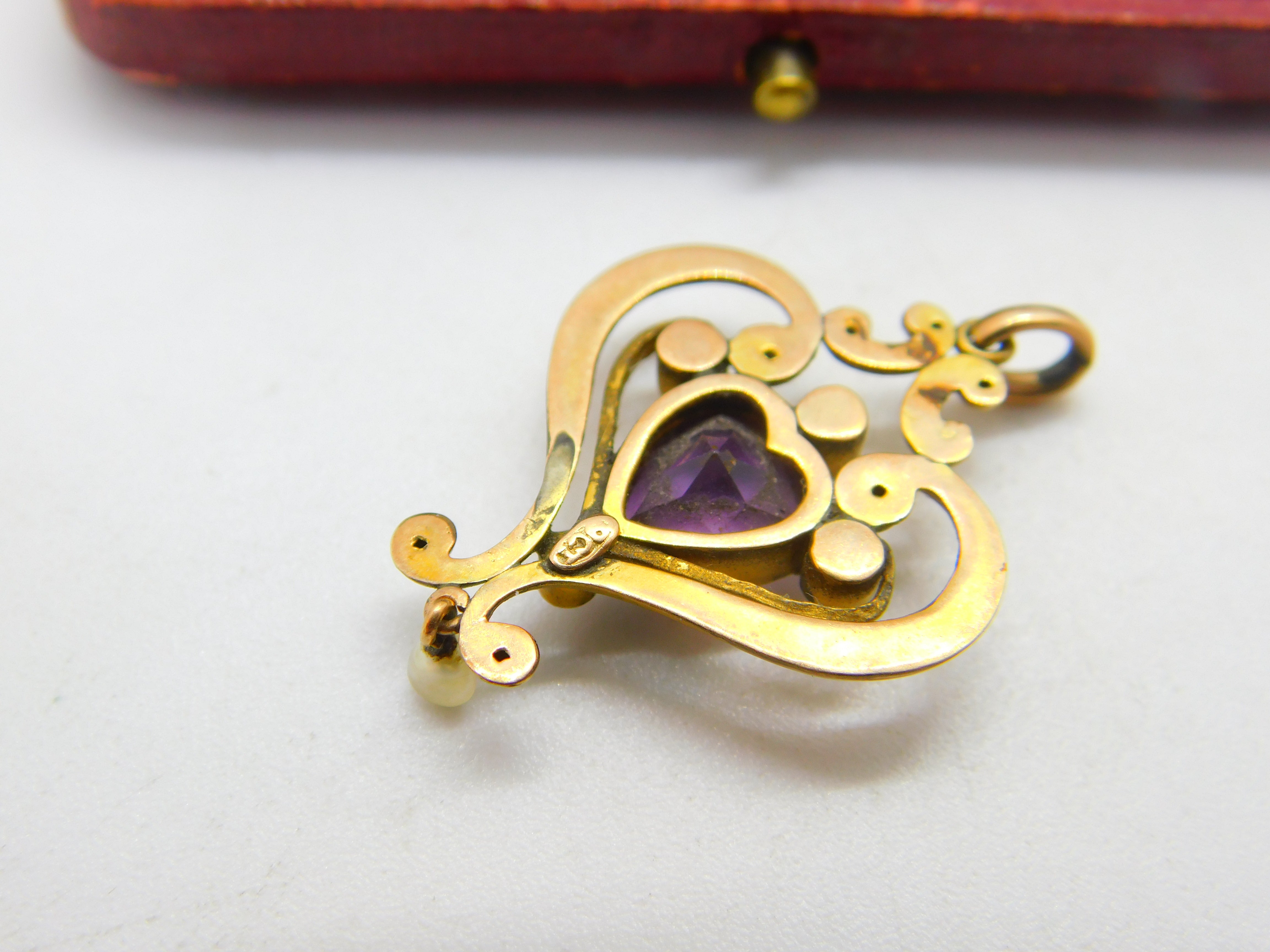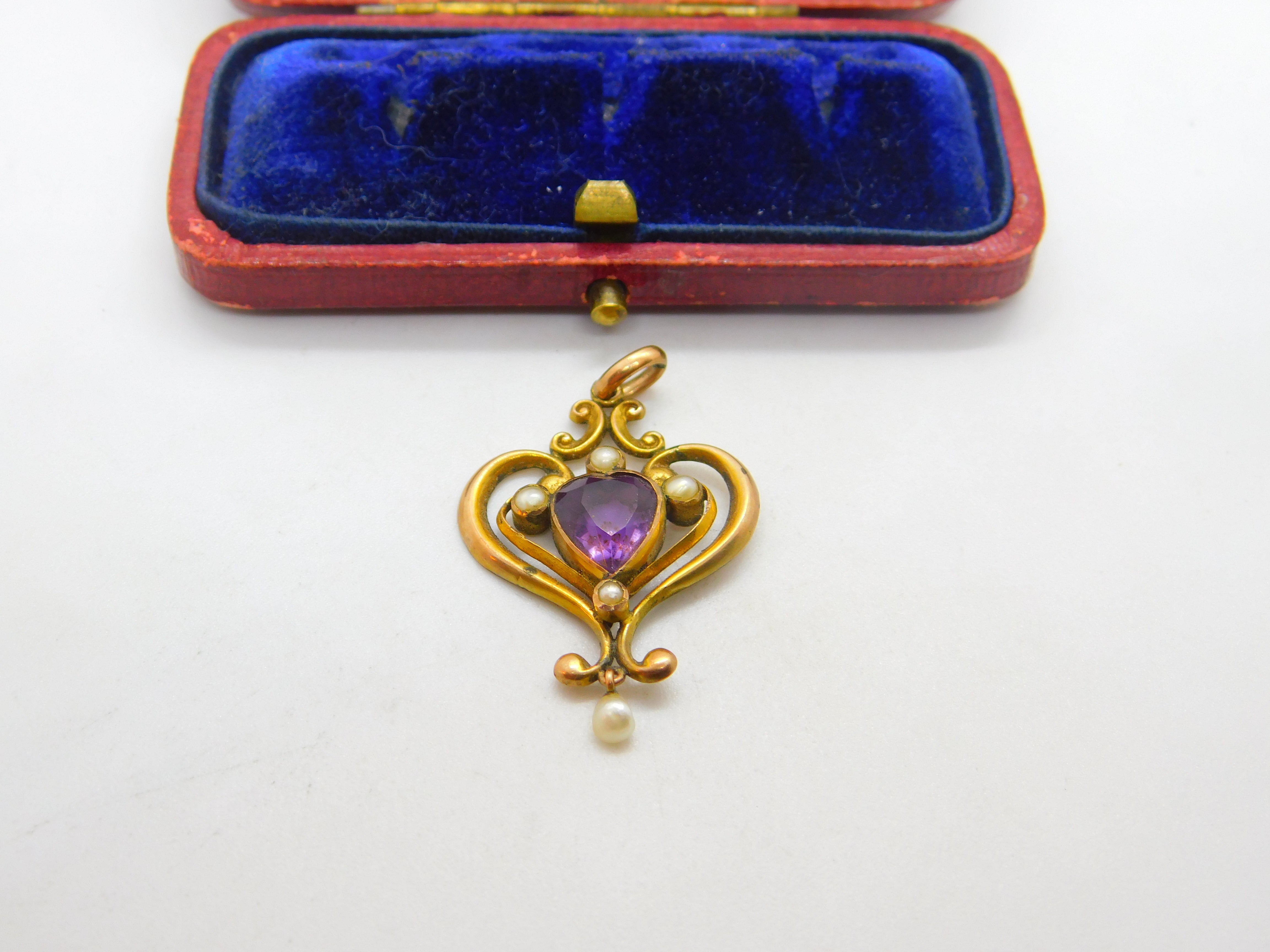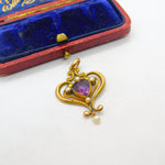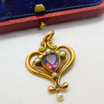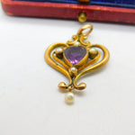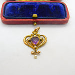 Edwardian 9ct Gold, Amethyst & Pearl Lavalier Drop Pendant Antique c1910