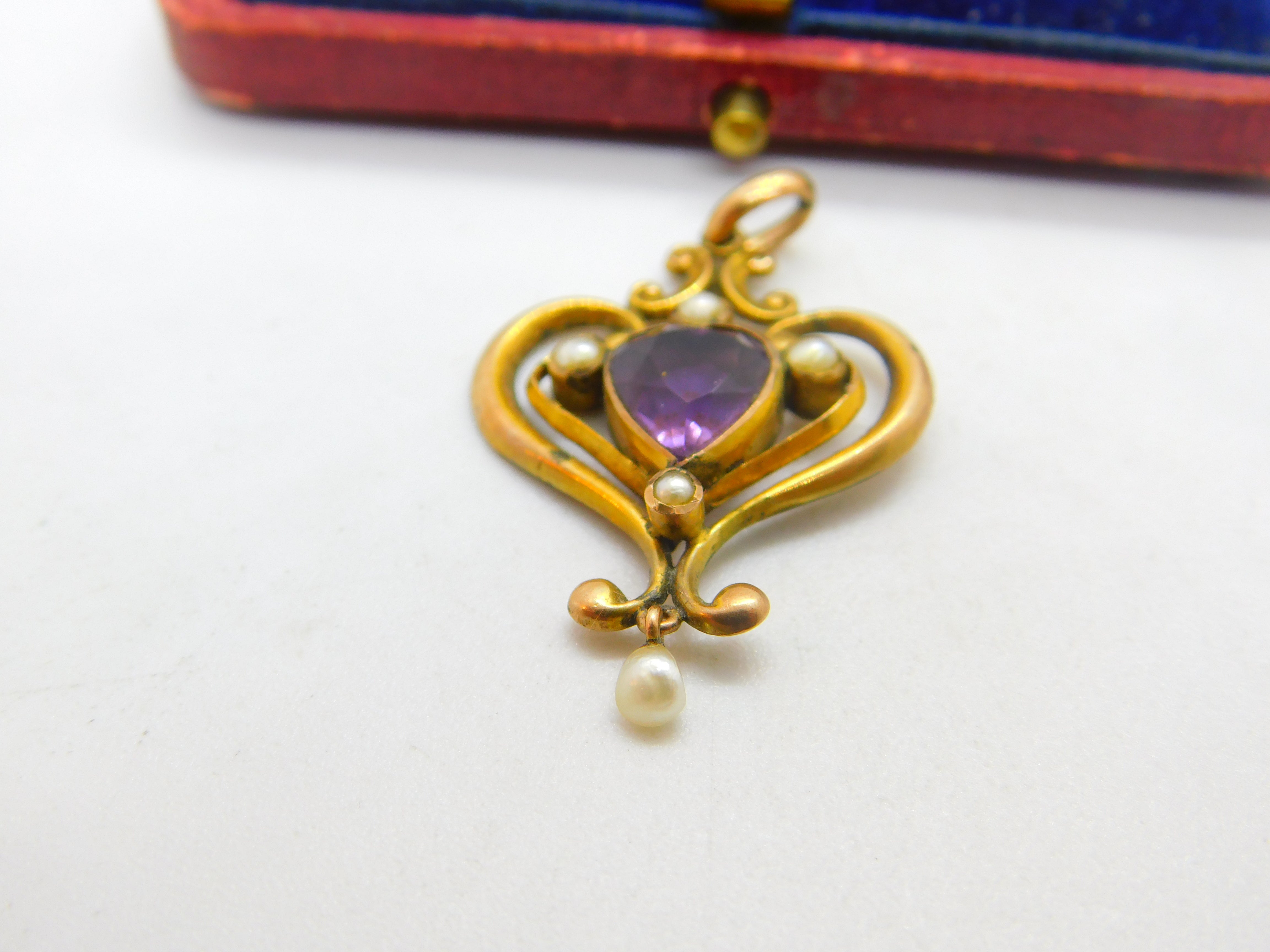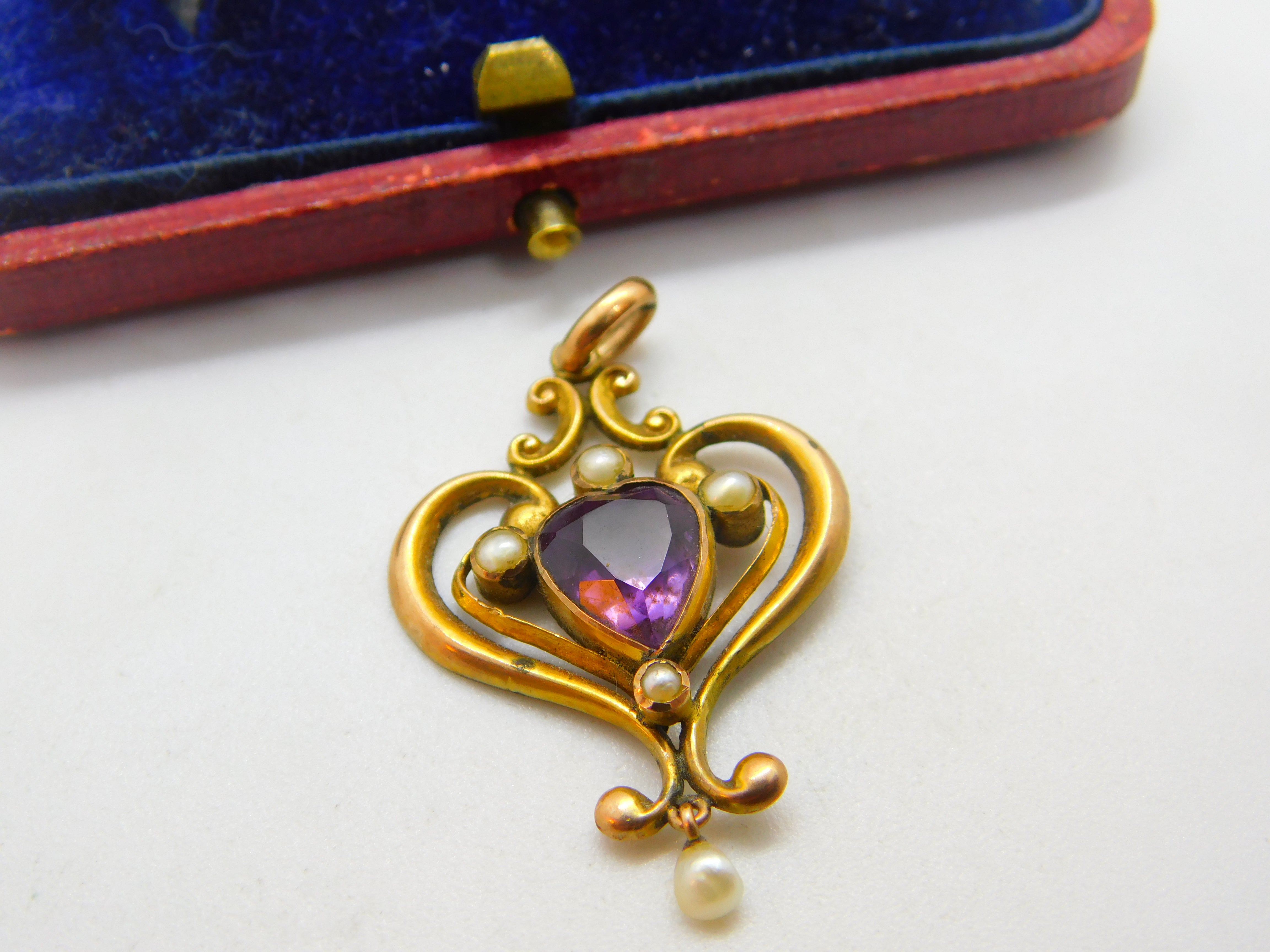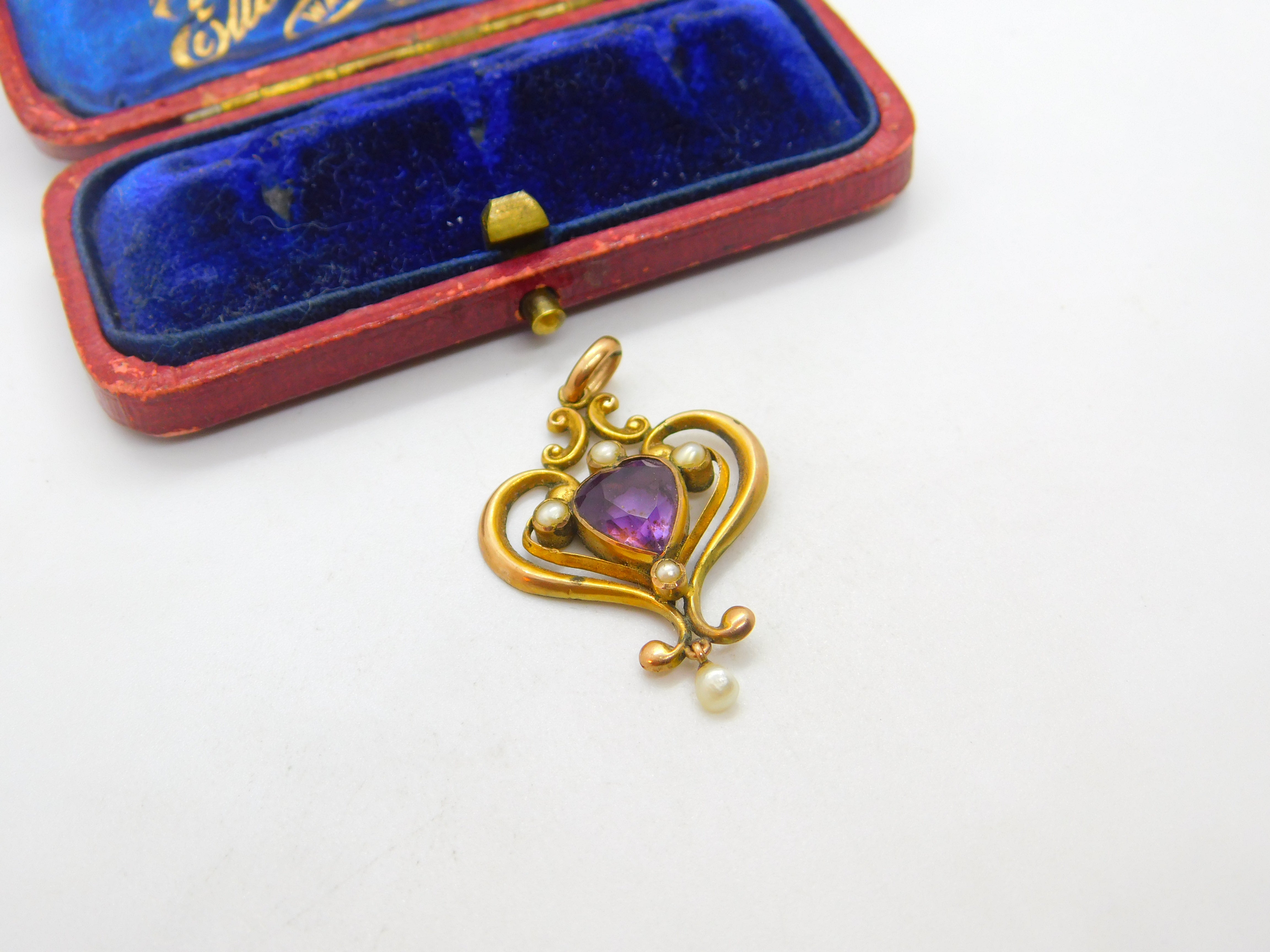 Details: A fantastic and wonderfully designed antique Edwardian 9ct yellow gold lavalier drop pendant set with amethyst and seed pearl marked 9ct to the reverse c1910. This is a wonderful item that would make a perfect gift or addition to any collection. The BOX pictured is for PRESENTATION ONLY and is NOT included in the listings but used to frame the pictures unless specifically stated otherwise.