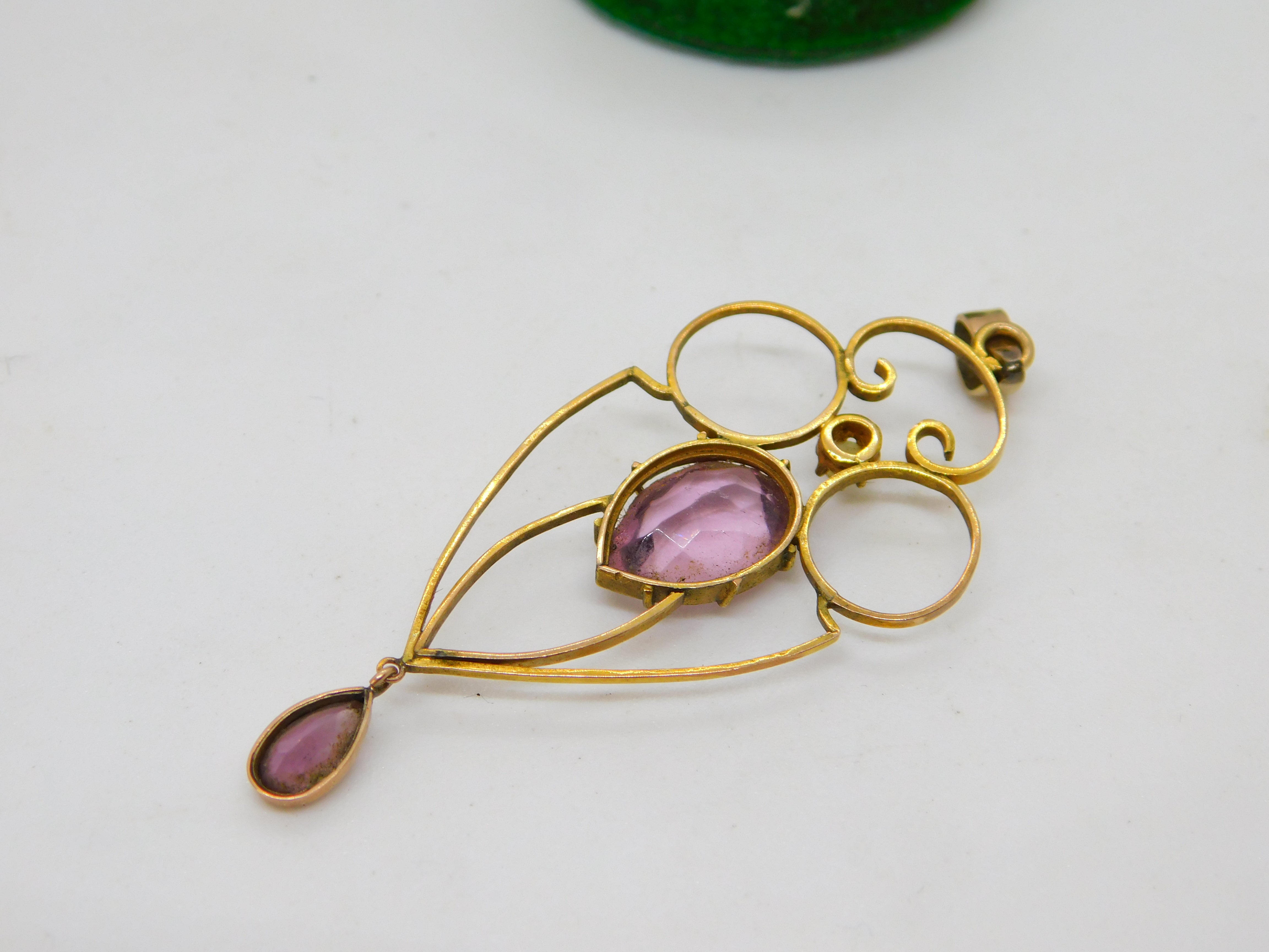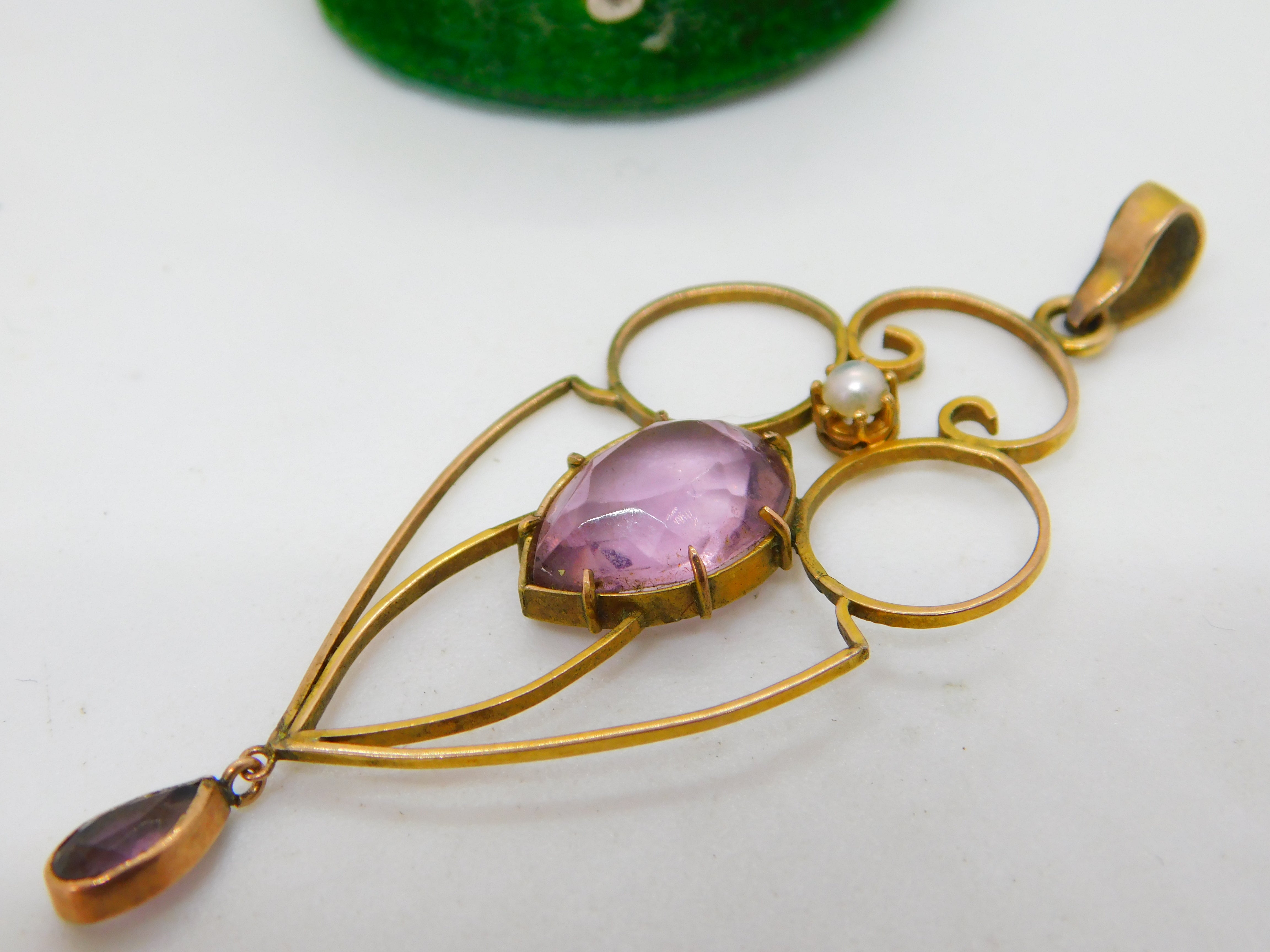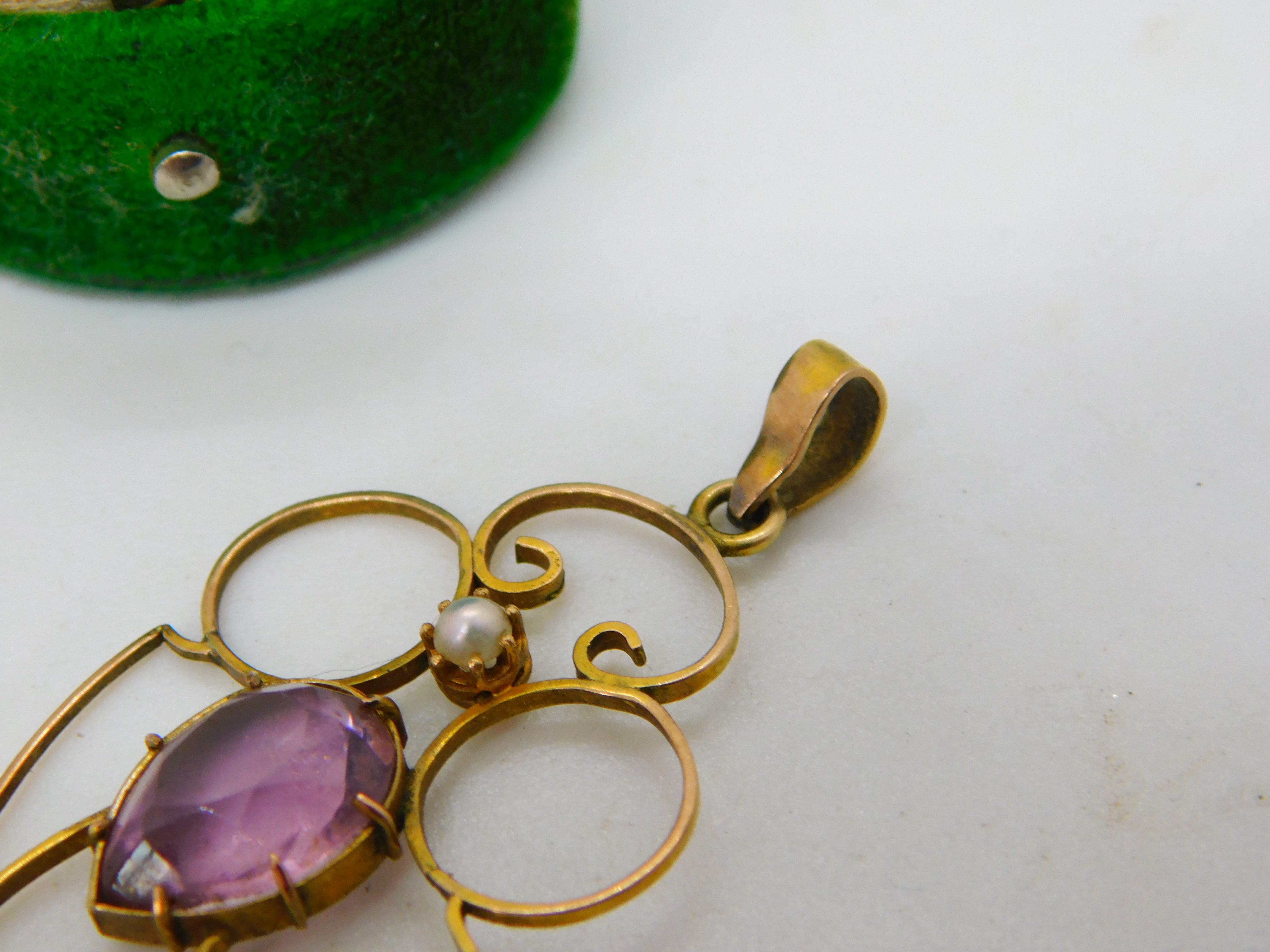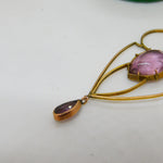 Edwardian 9ct Gold, Amethyst & Pearl Lavalier Drop Pendant Antique c1910