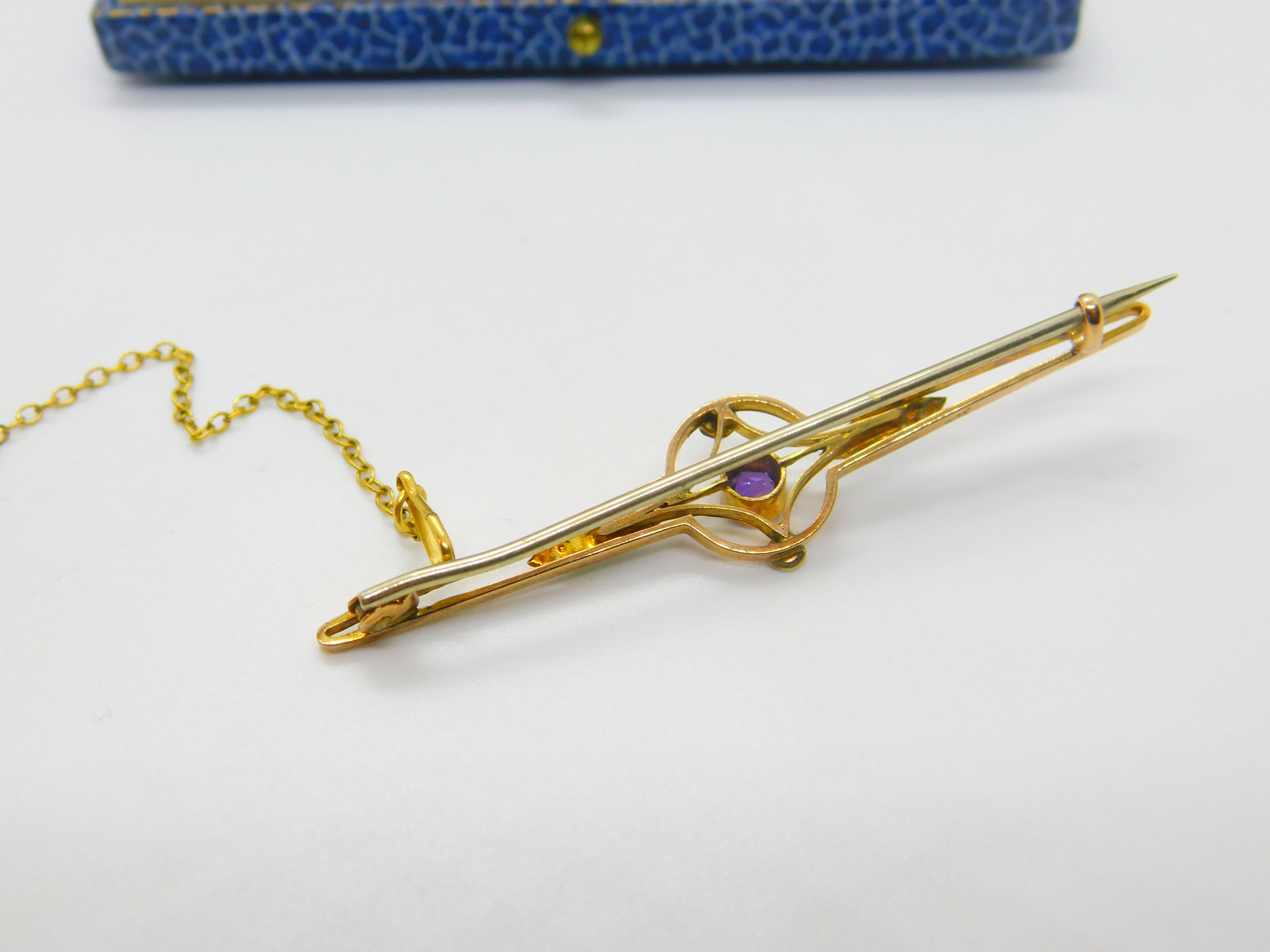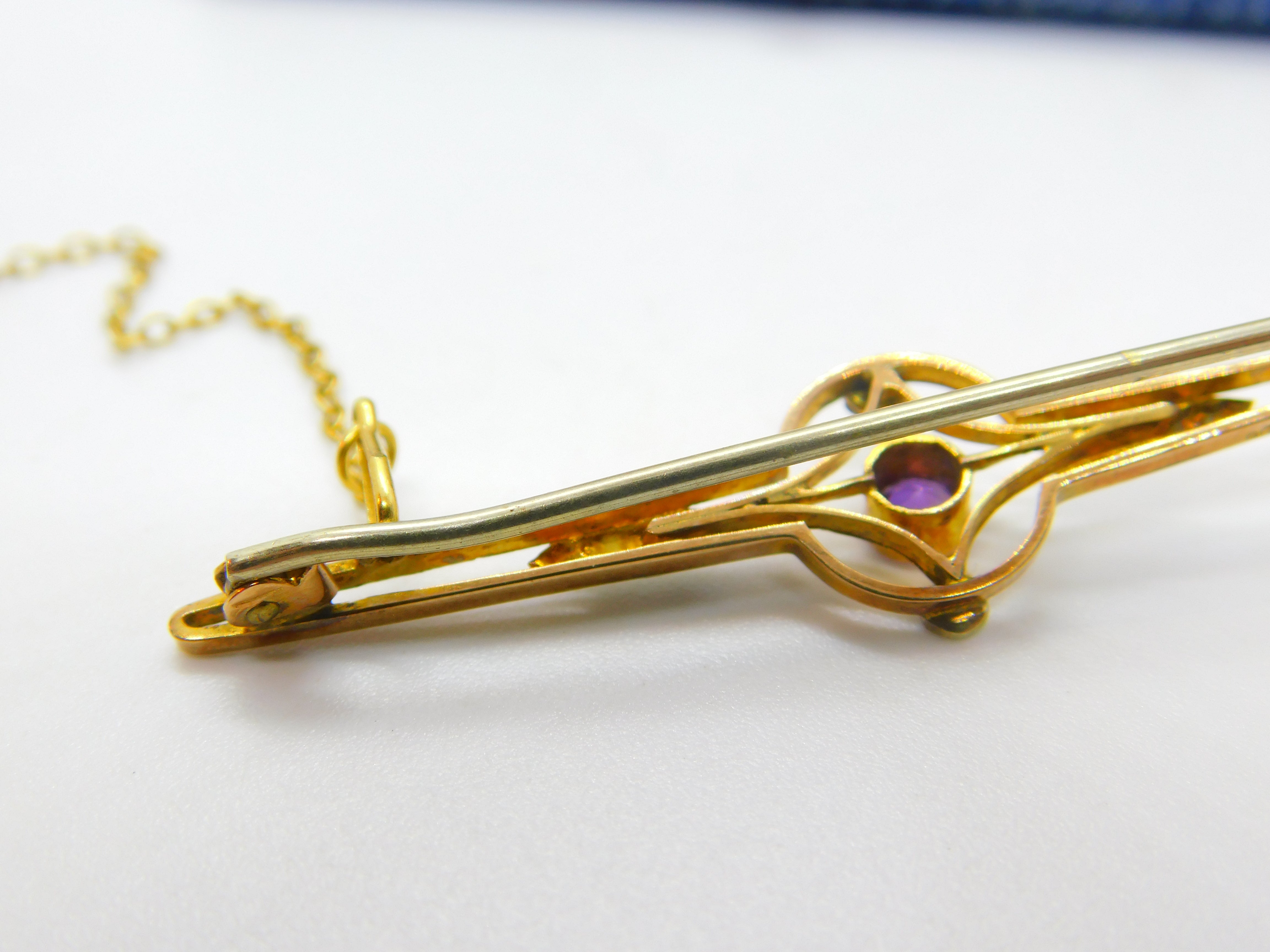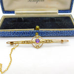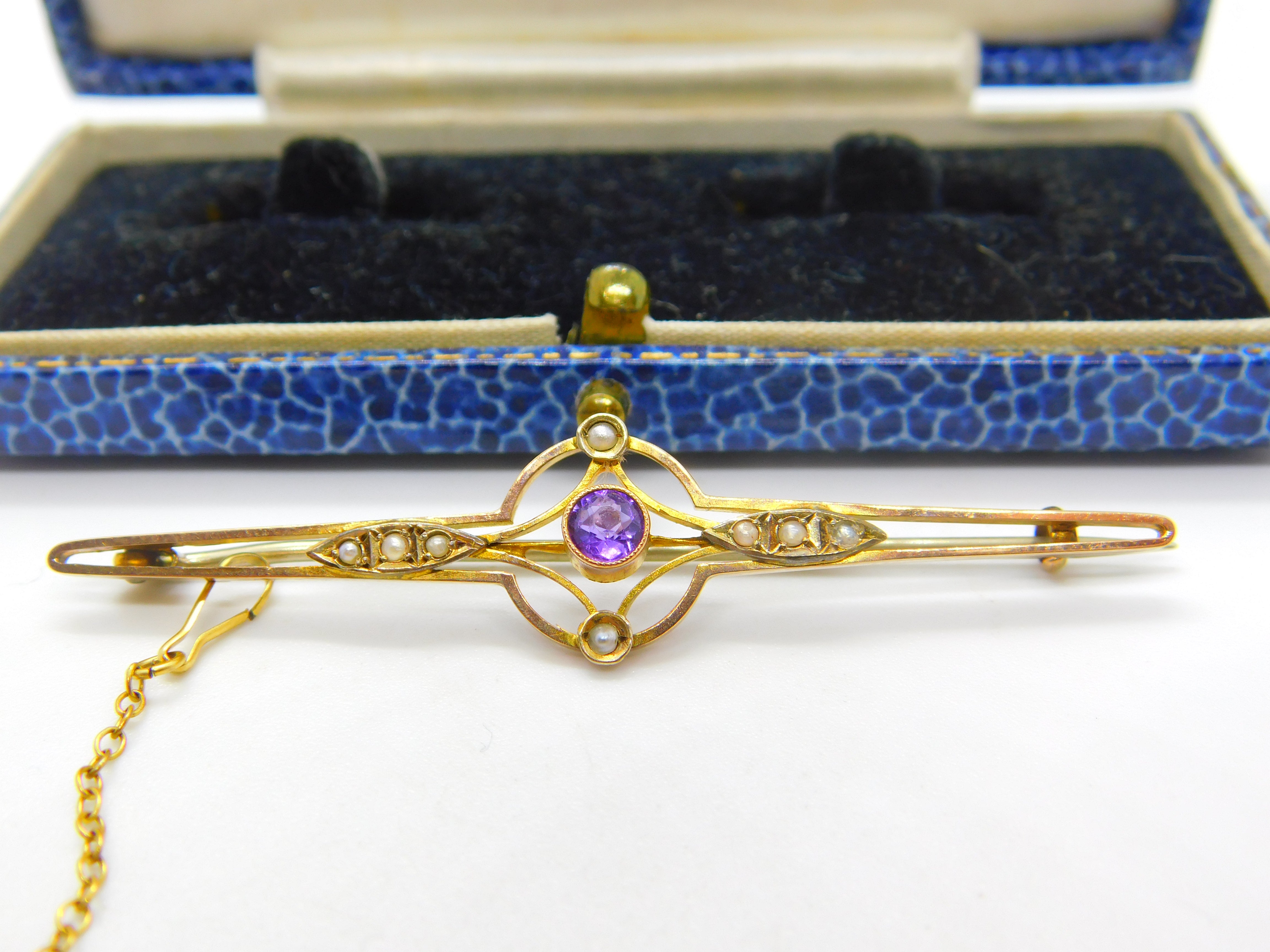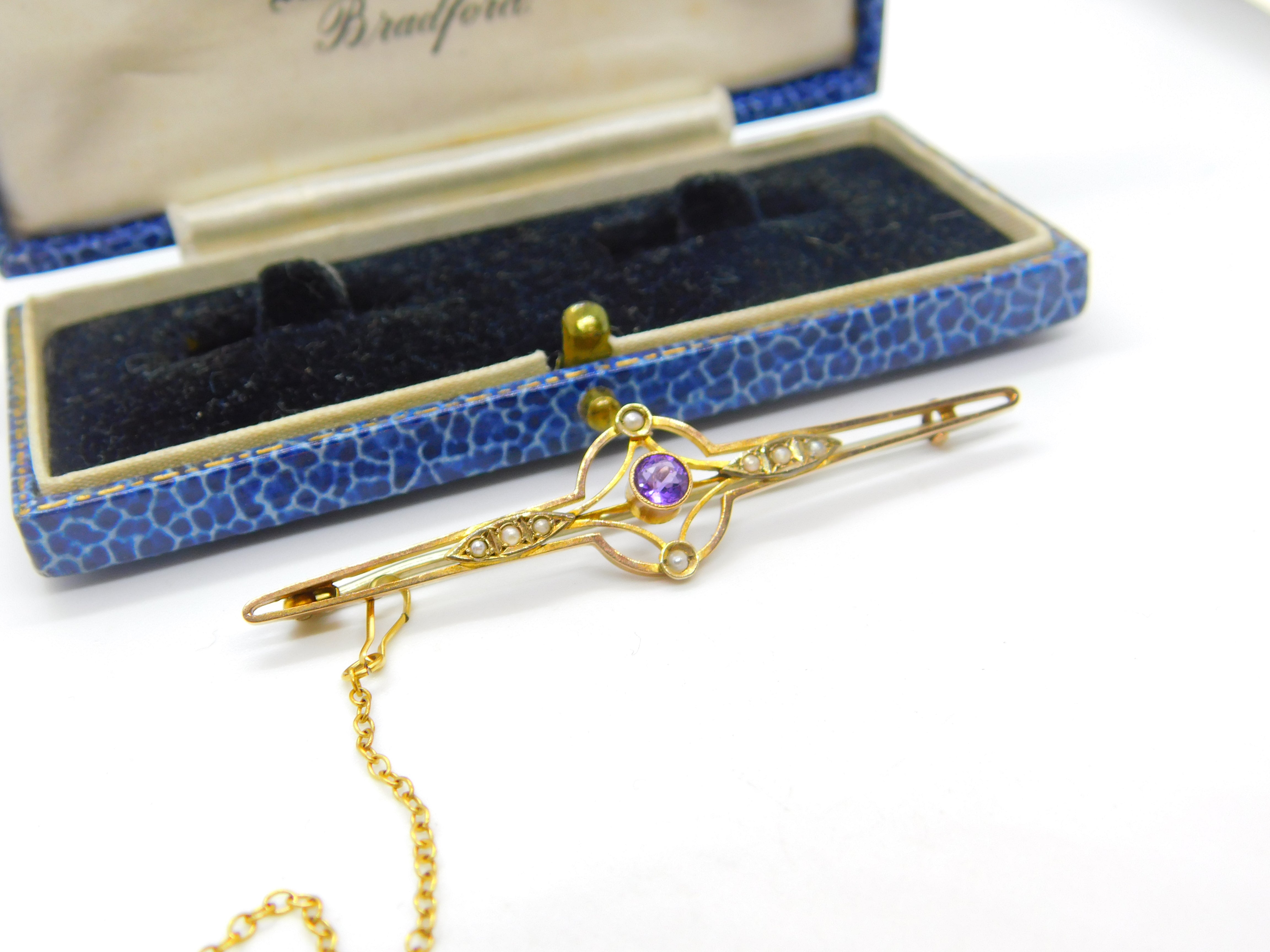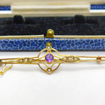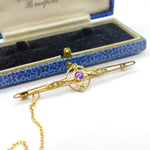 Edwardian 9ct Gold, Amethyst & Seed Pearl Bar Brooch Antique c1910