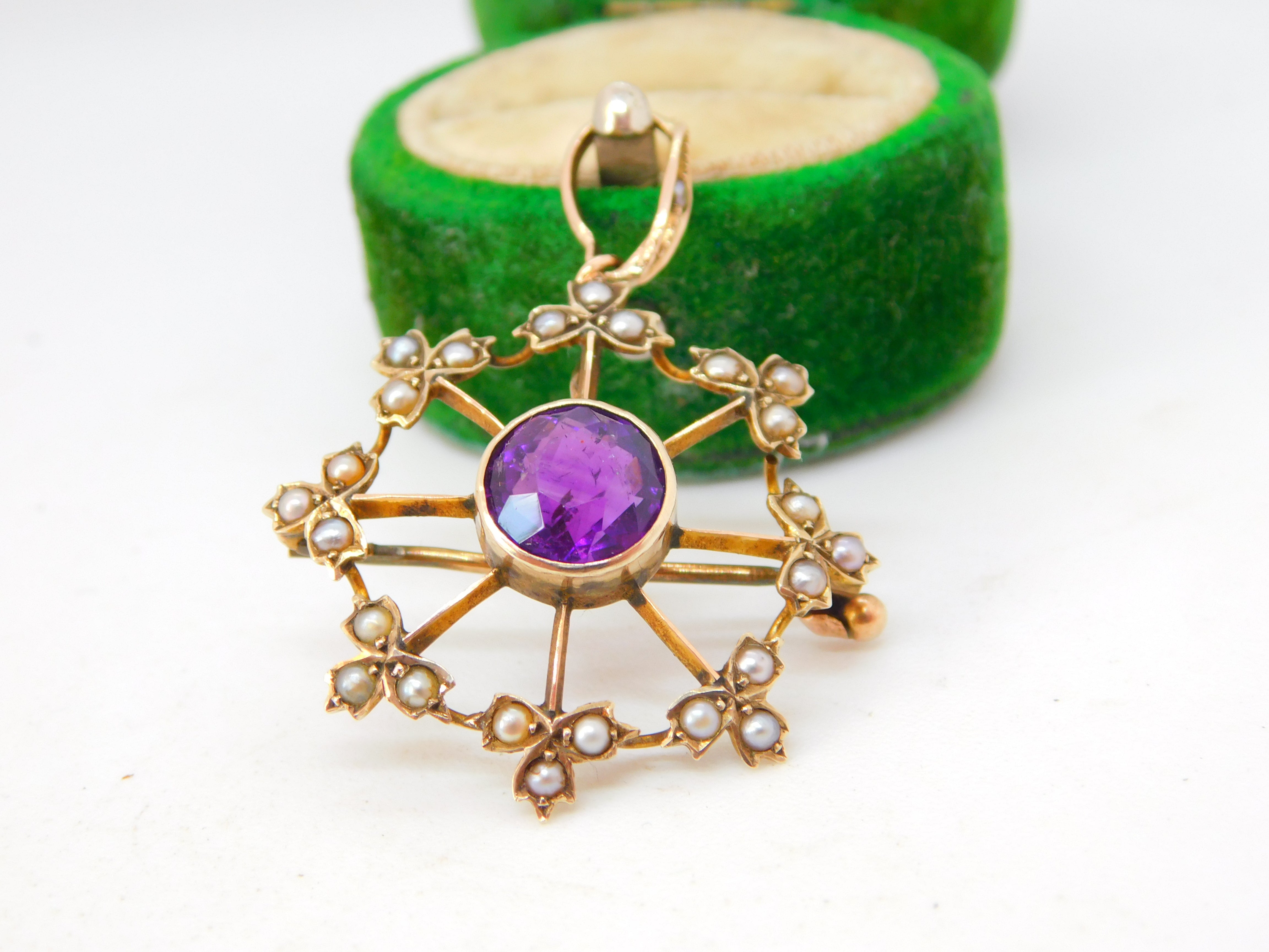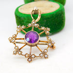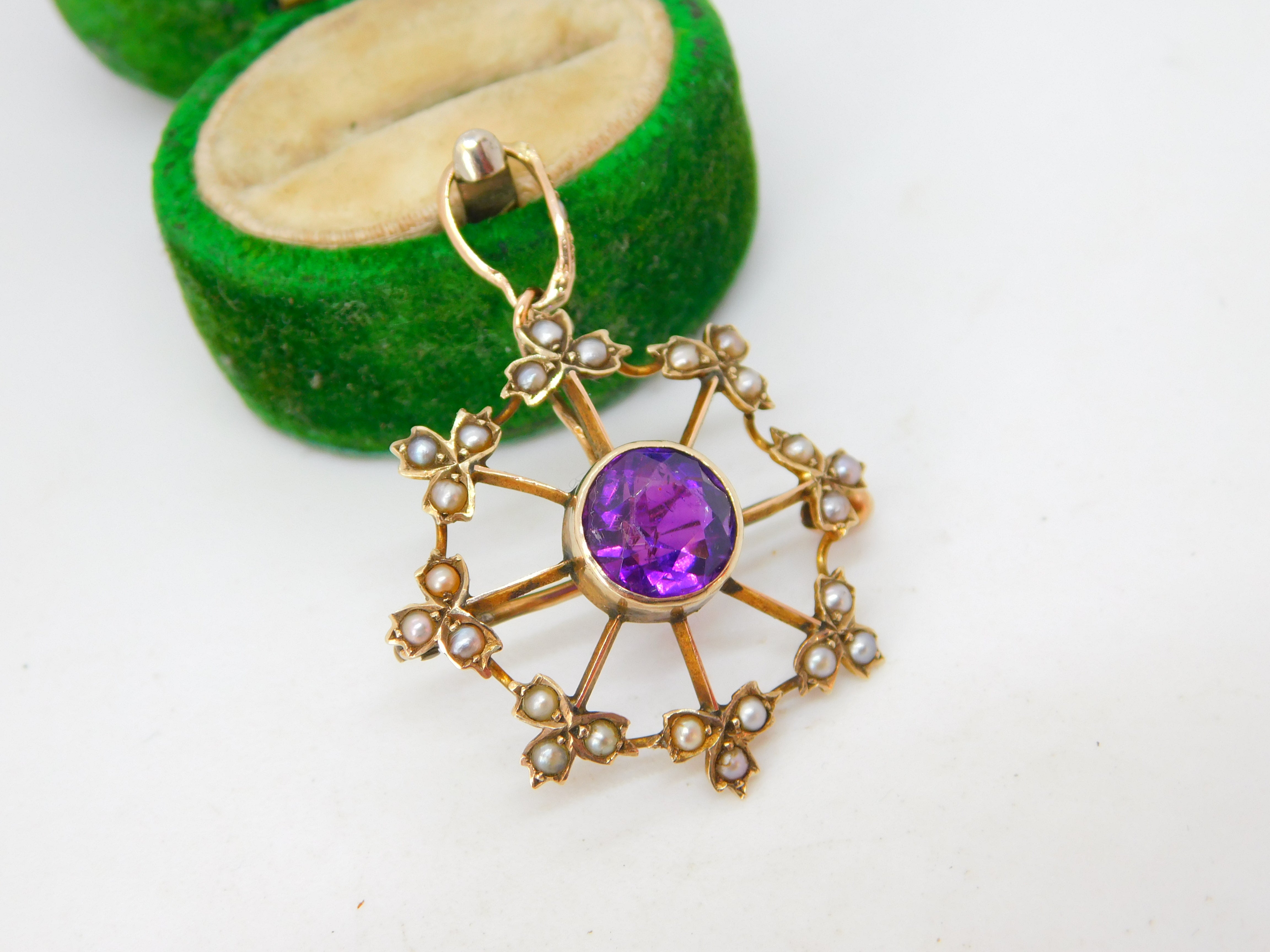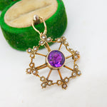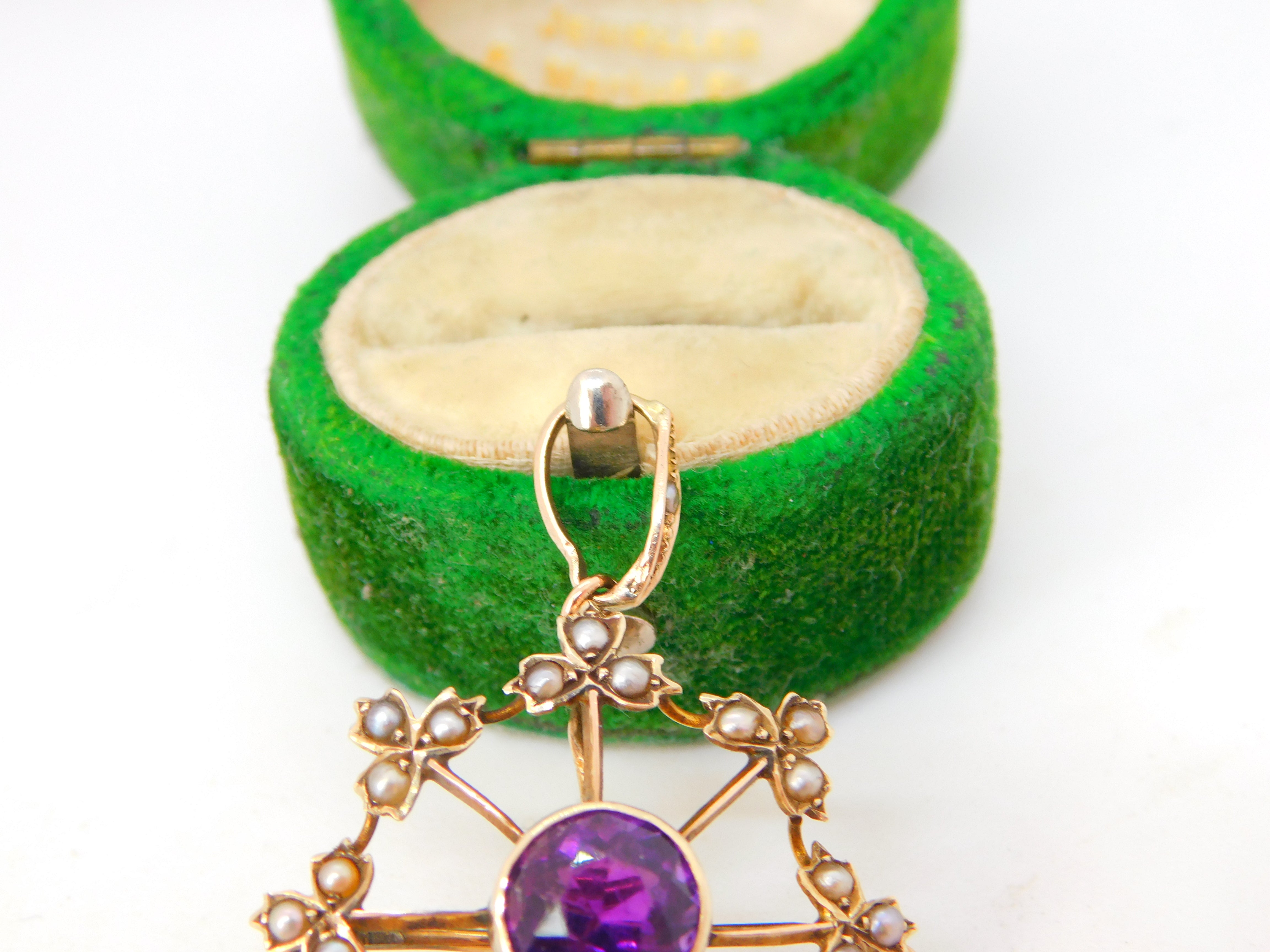 Edwardian 9ct Gold, Amethyst & Seed Pearl Floral Drop Pendant Antique c1910