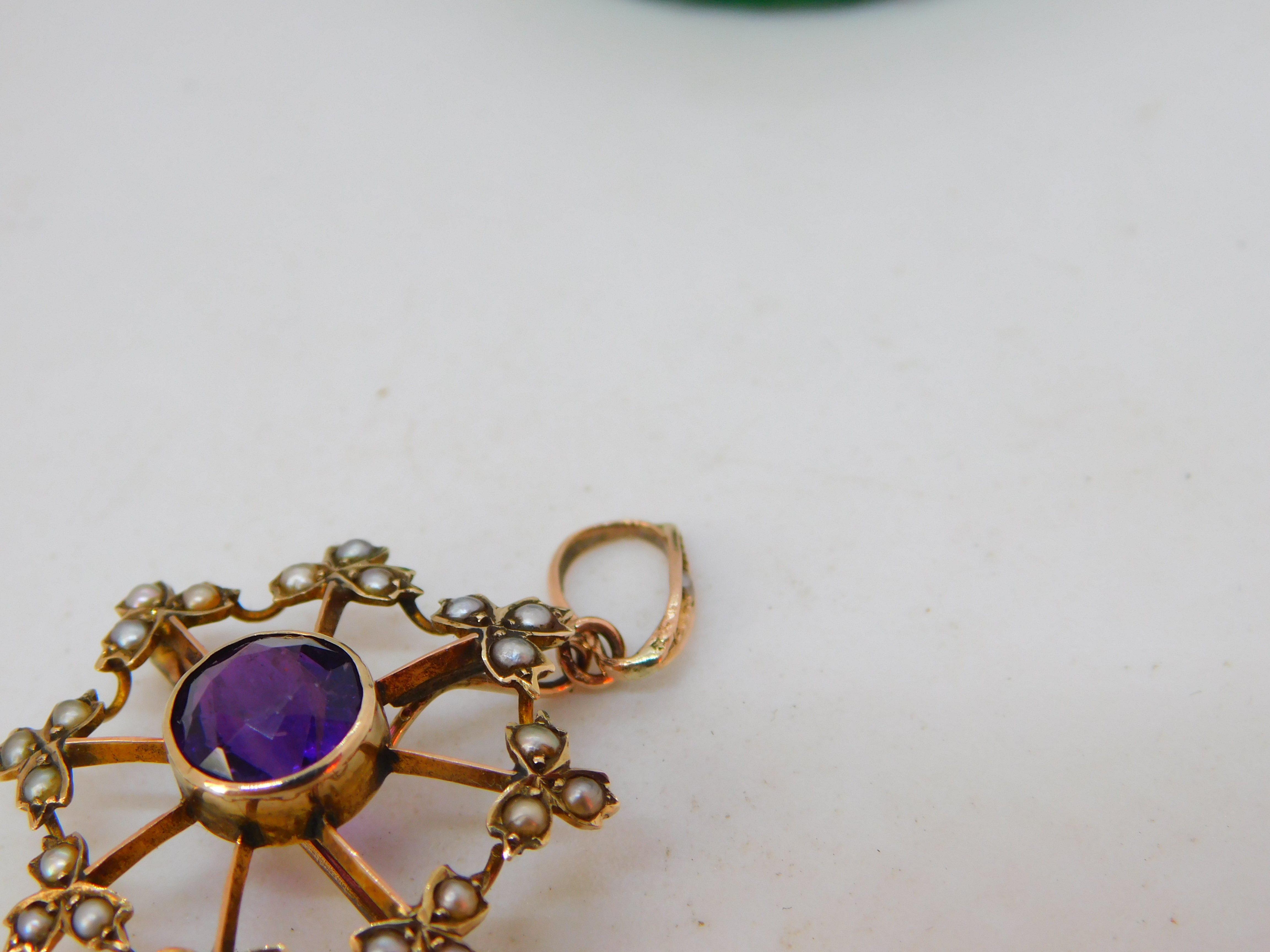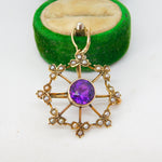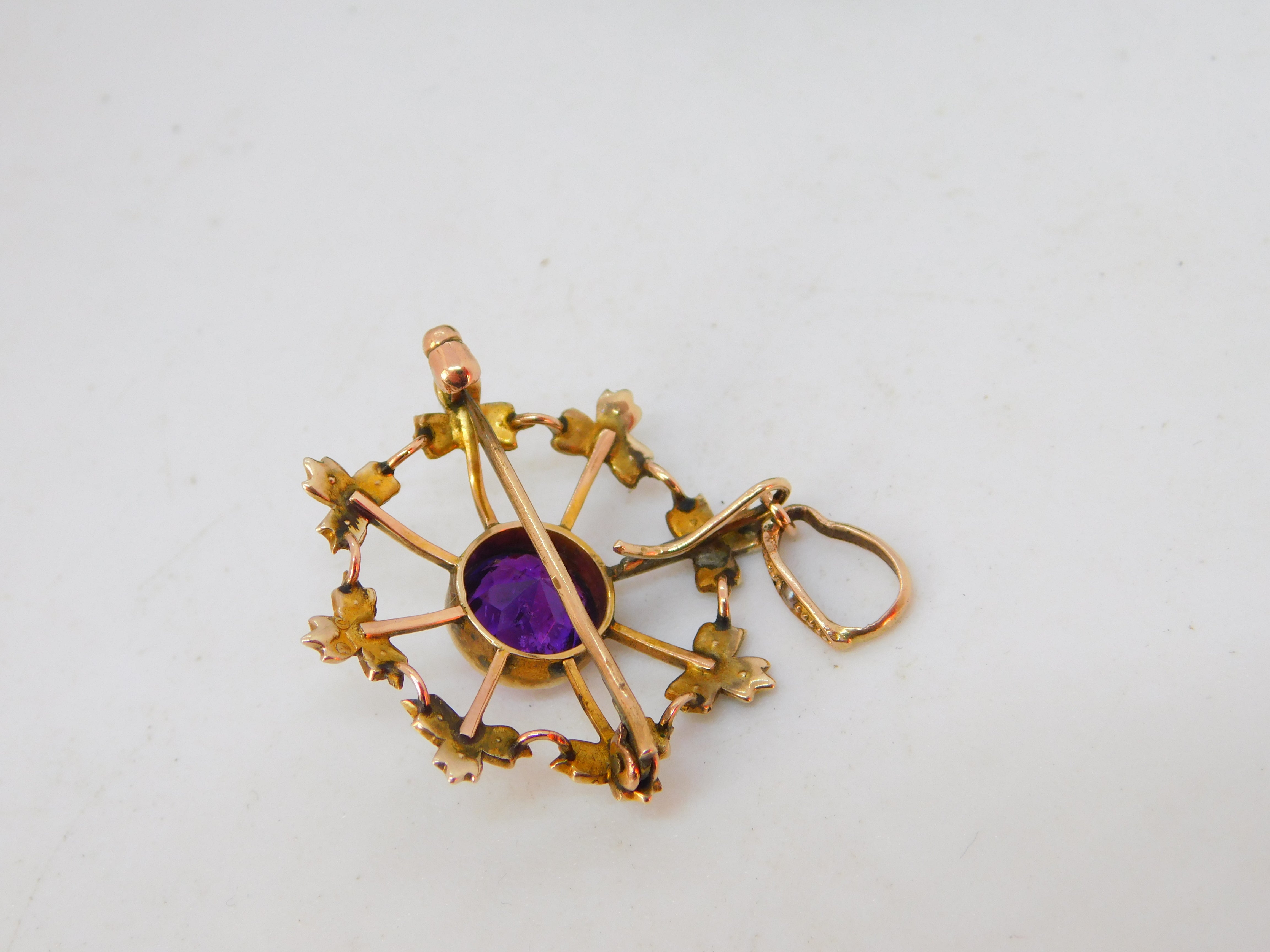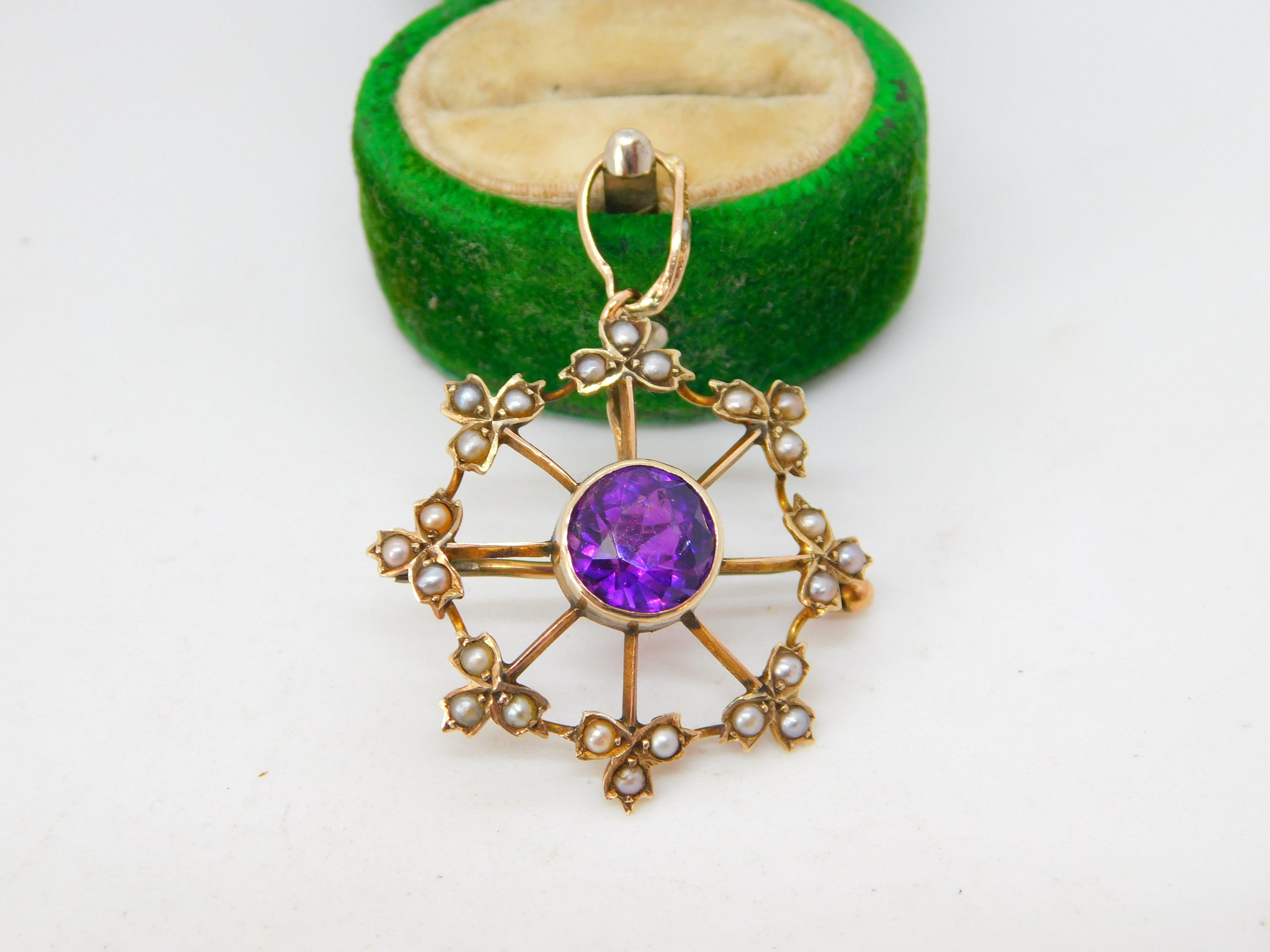 Edwardian 9ct Gold, Amethyst & Seed Pearl Floral Drop Pendant Antique c1910