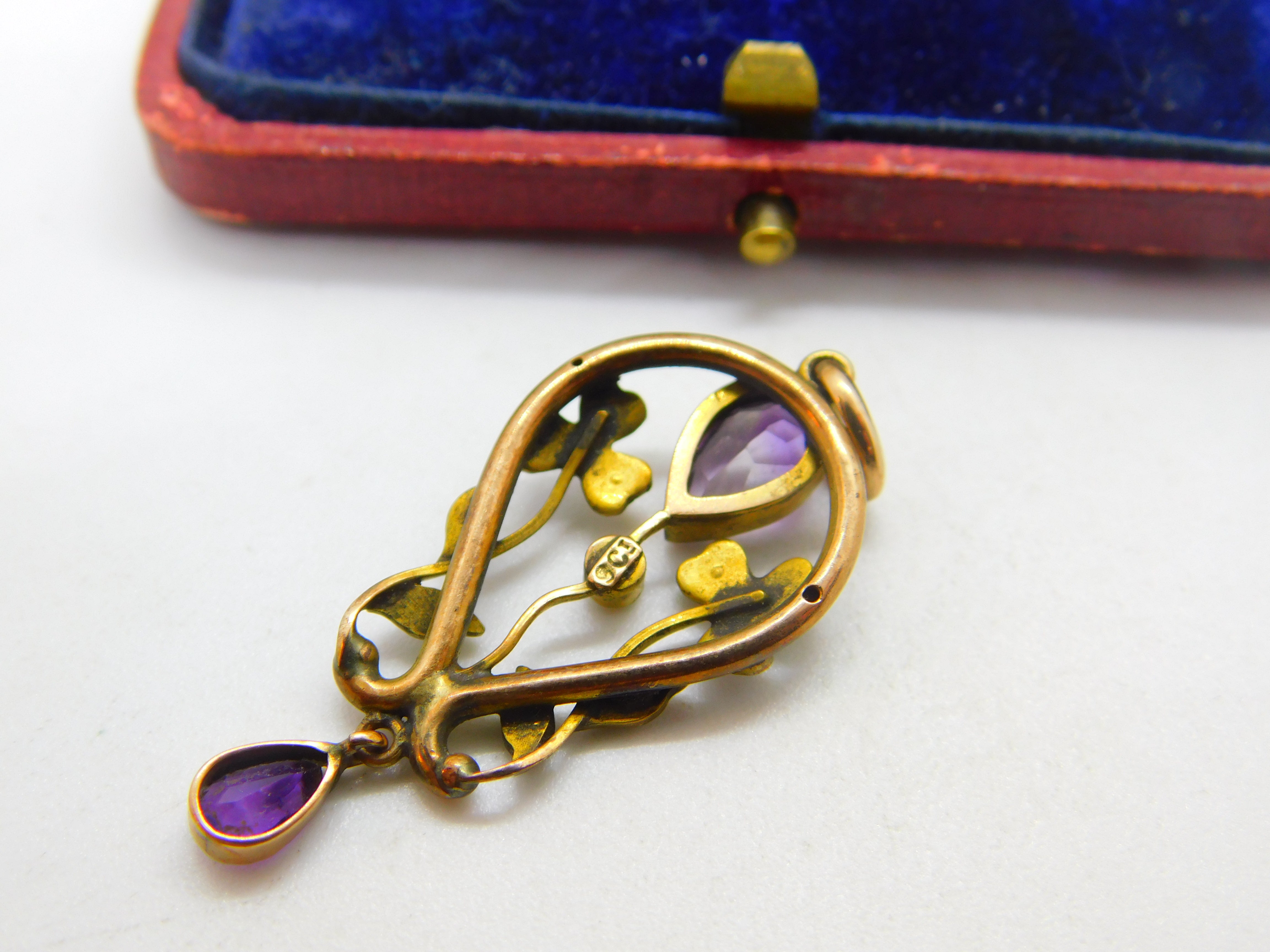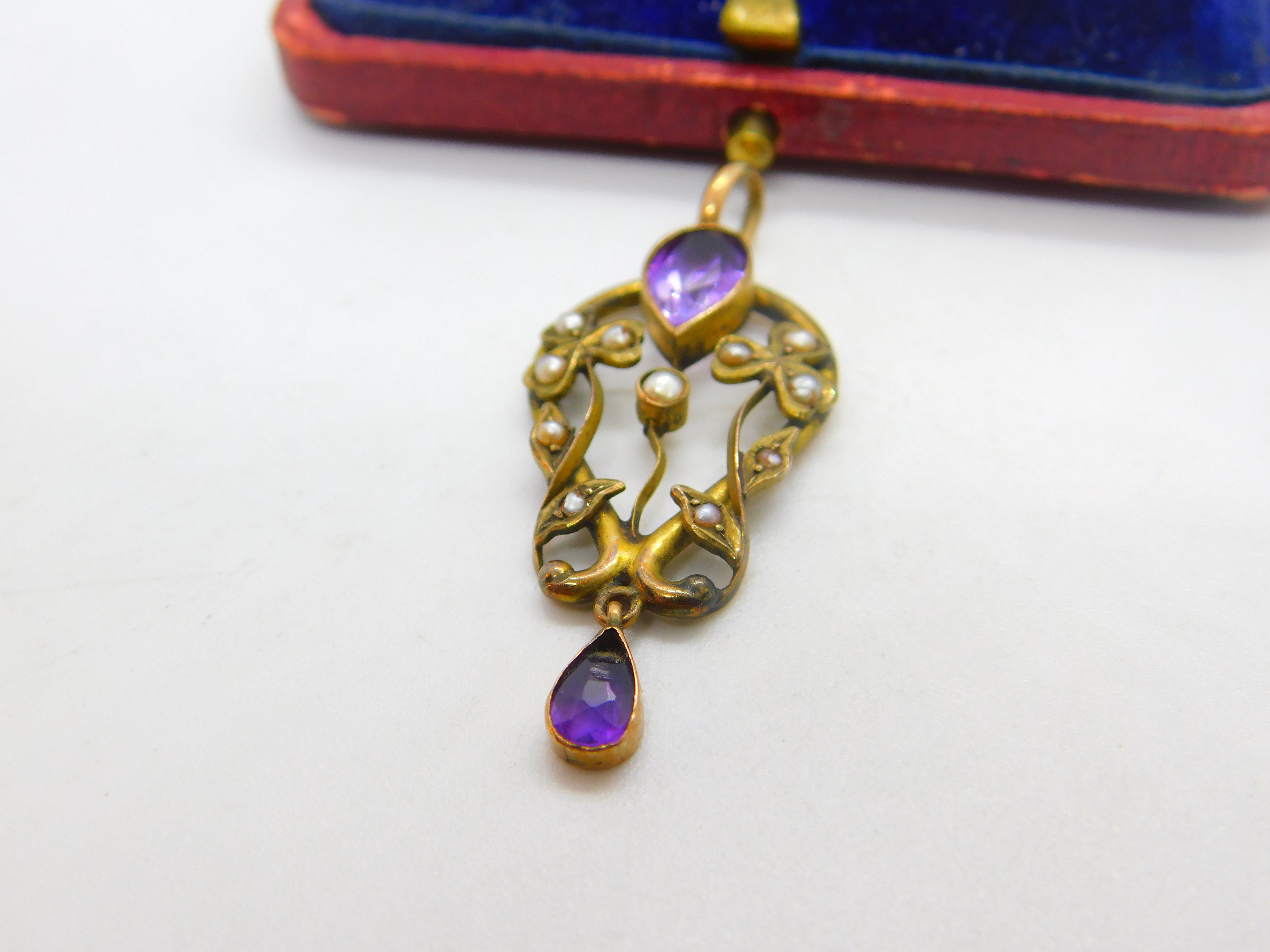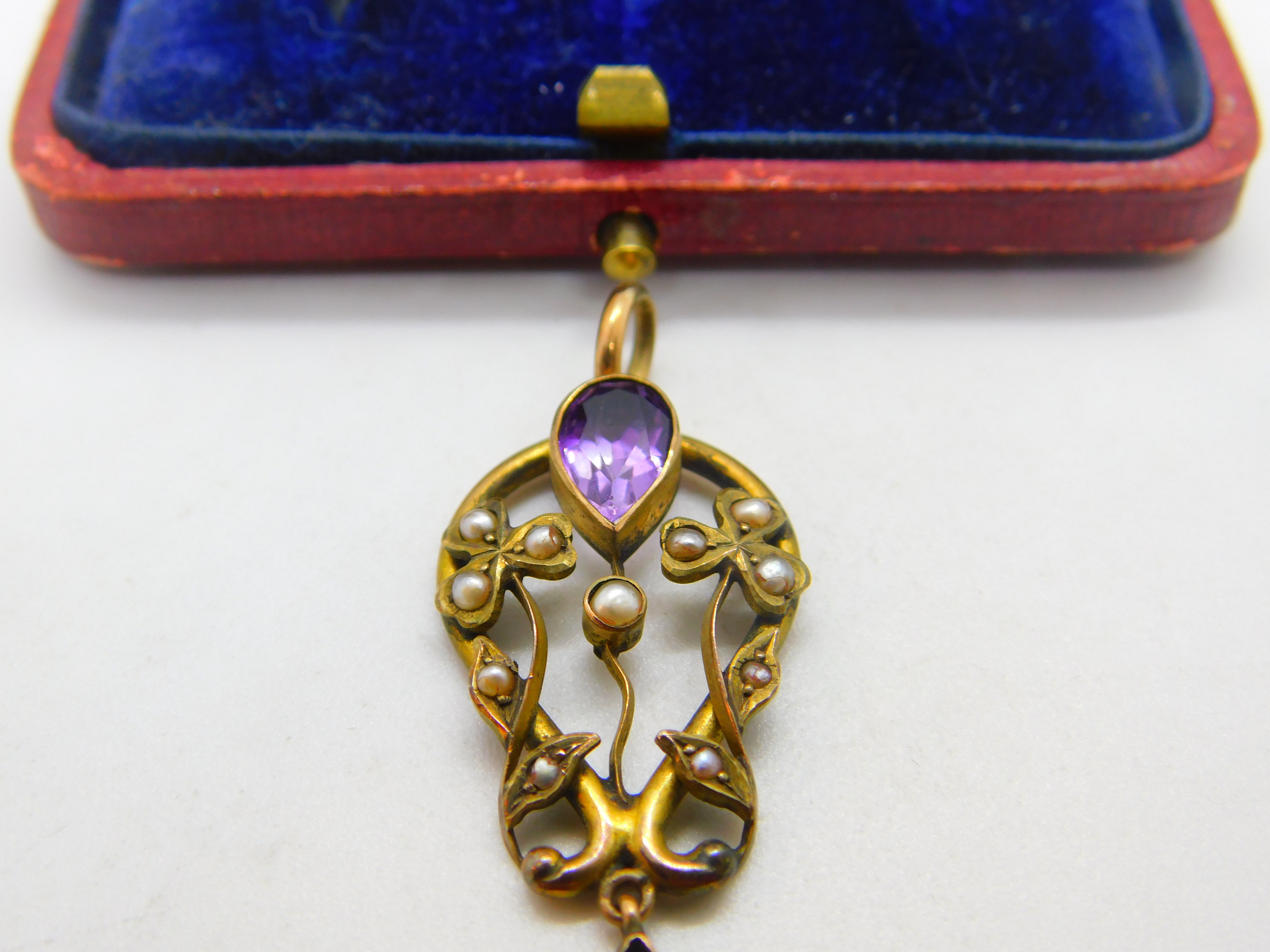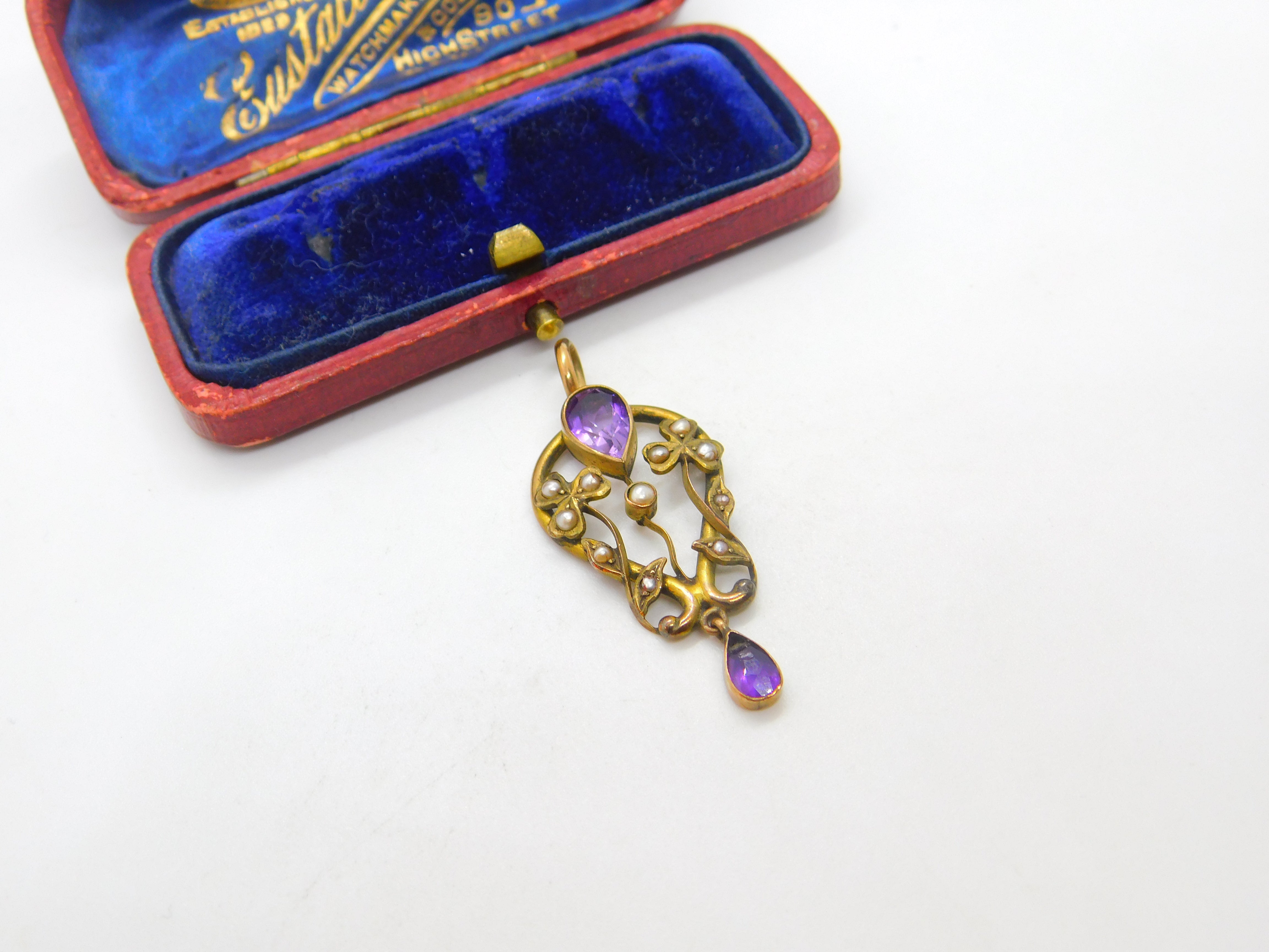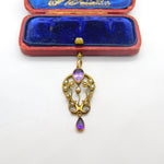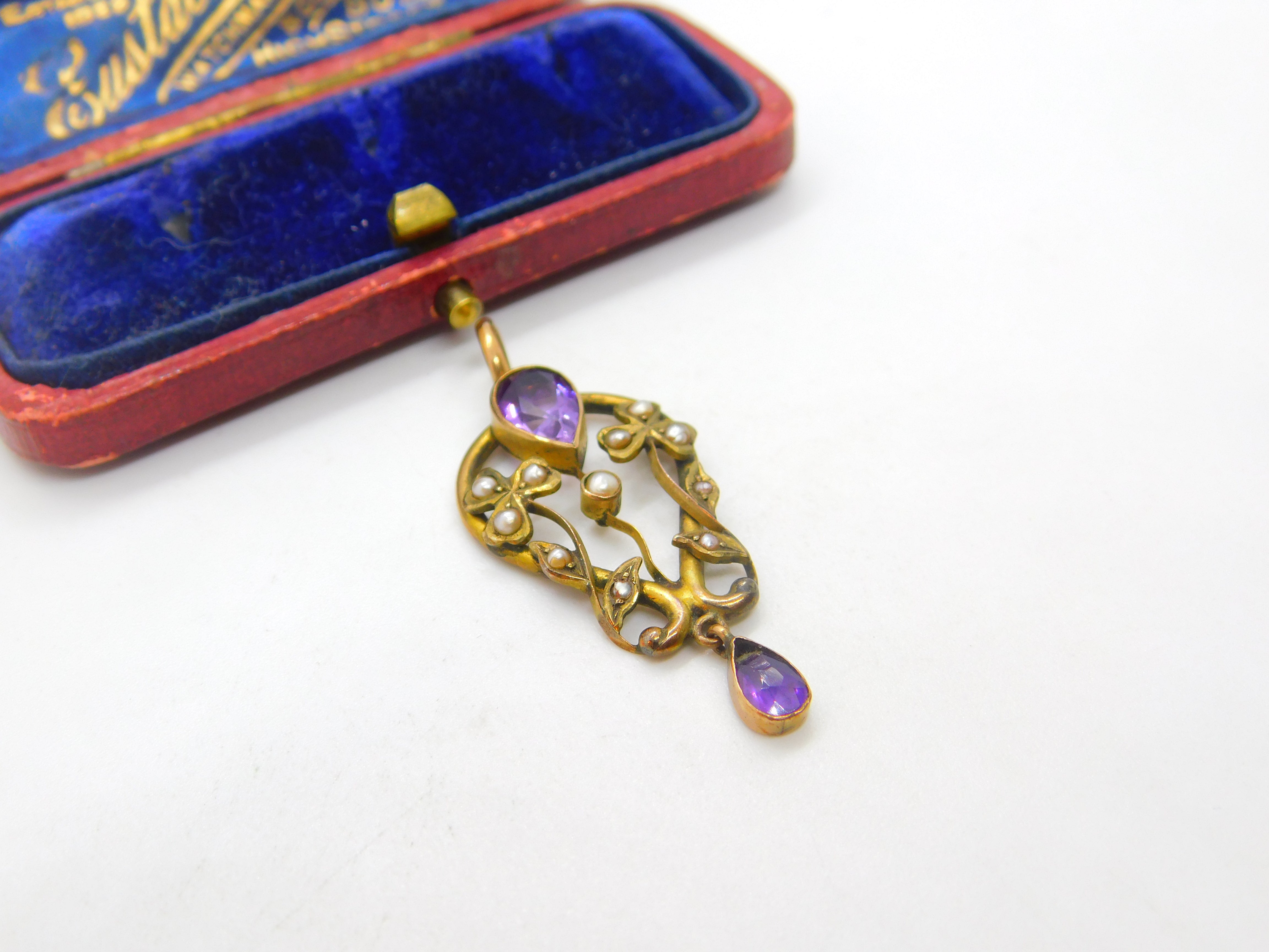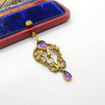 Edwardian 9ct Gold, Amethyst & Seed Pearl Lavalier Drop Pendant Antique c1910