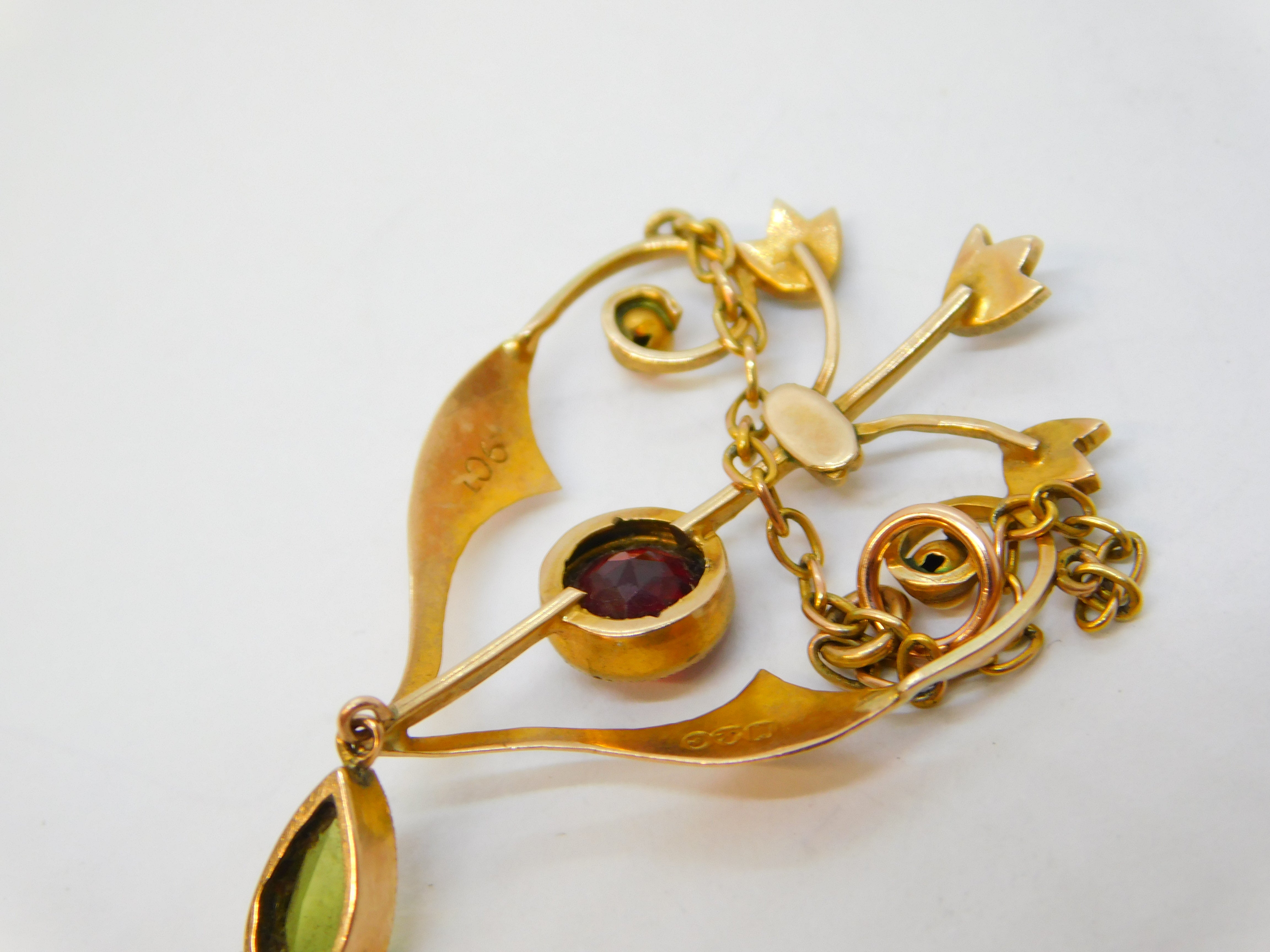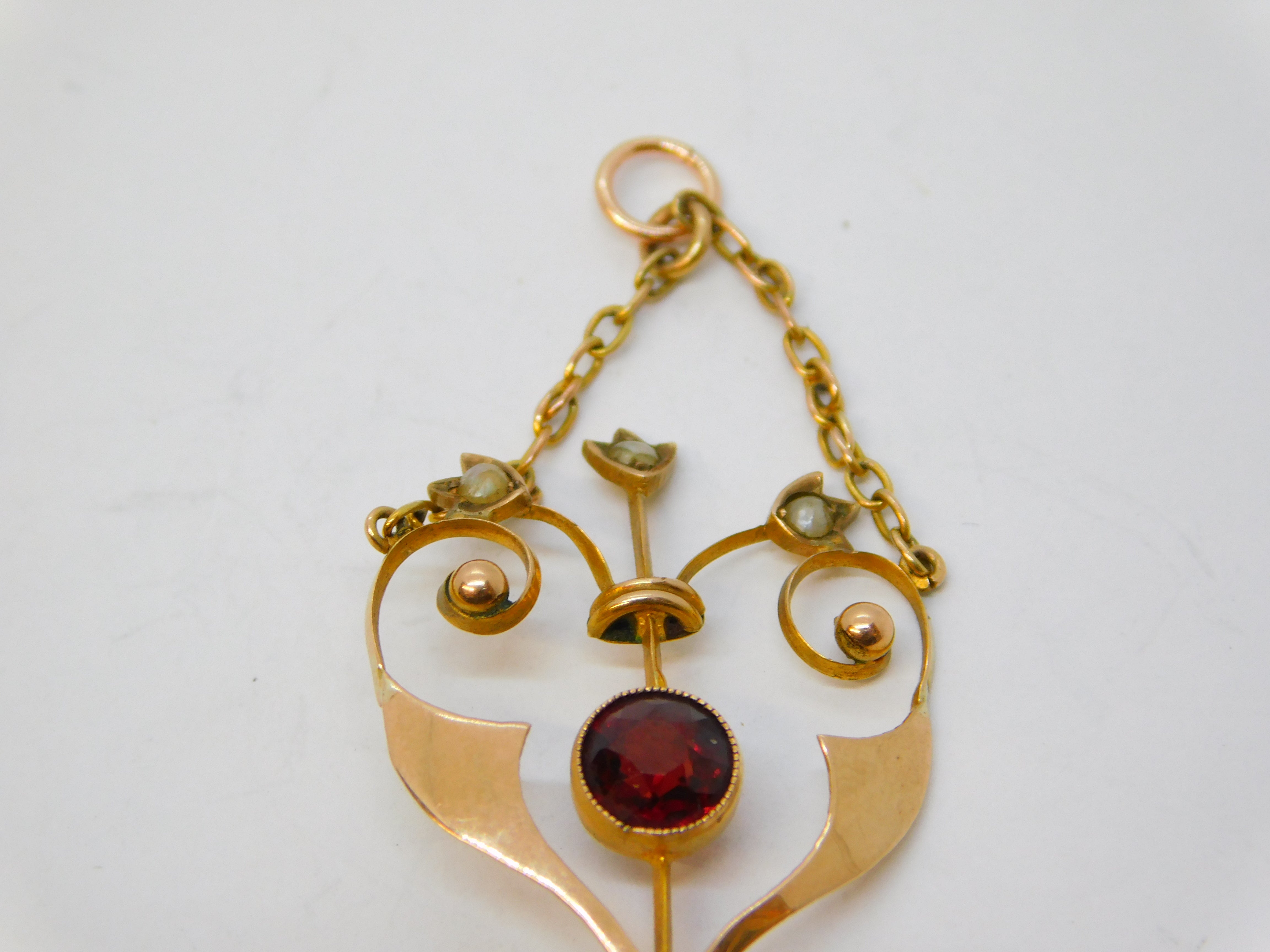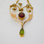 Edwardian 9ct Gold, Garnet, Peridot, Seed Pearl Lavalier Pendant Antique c1910