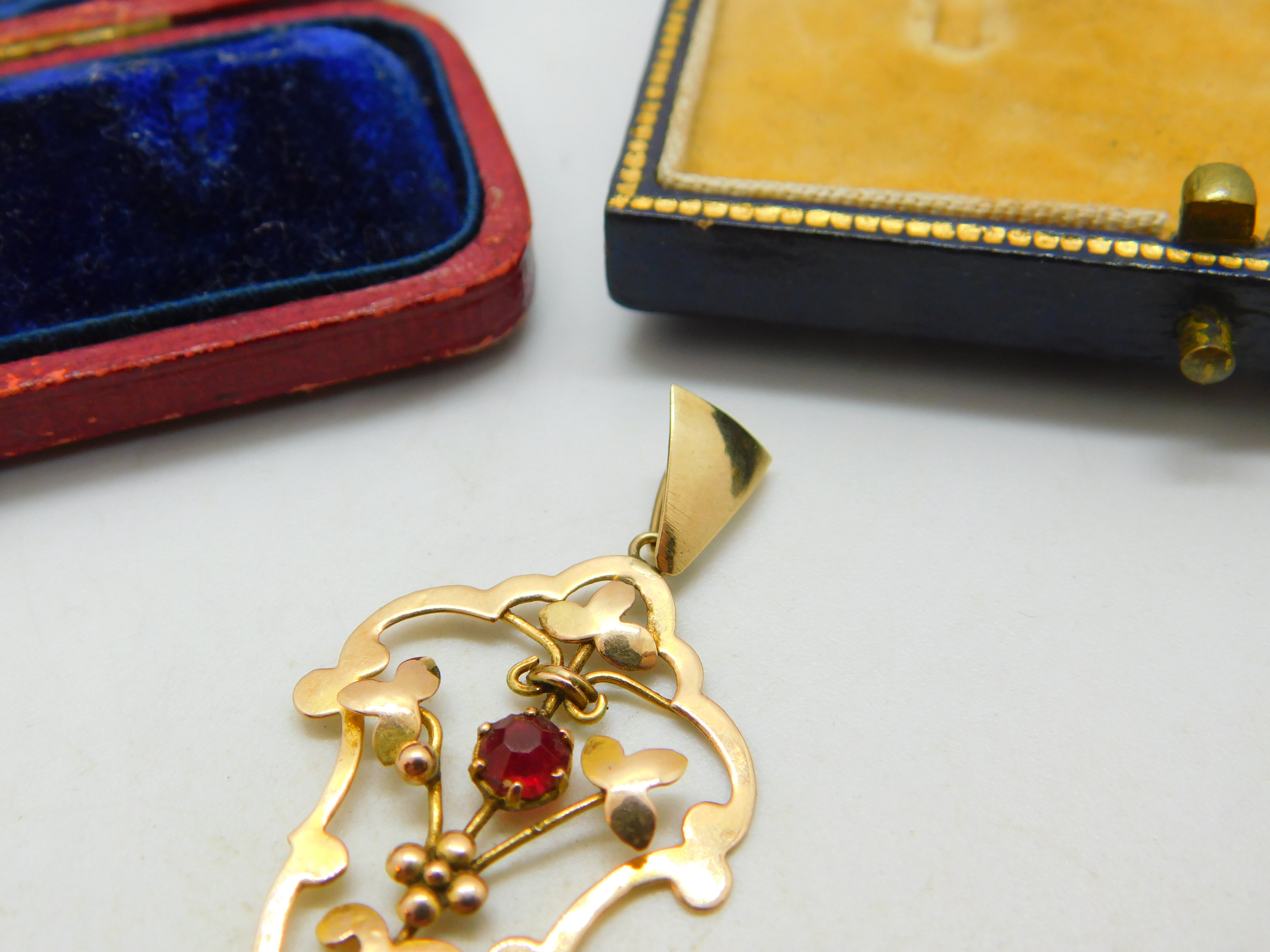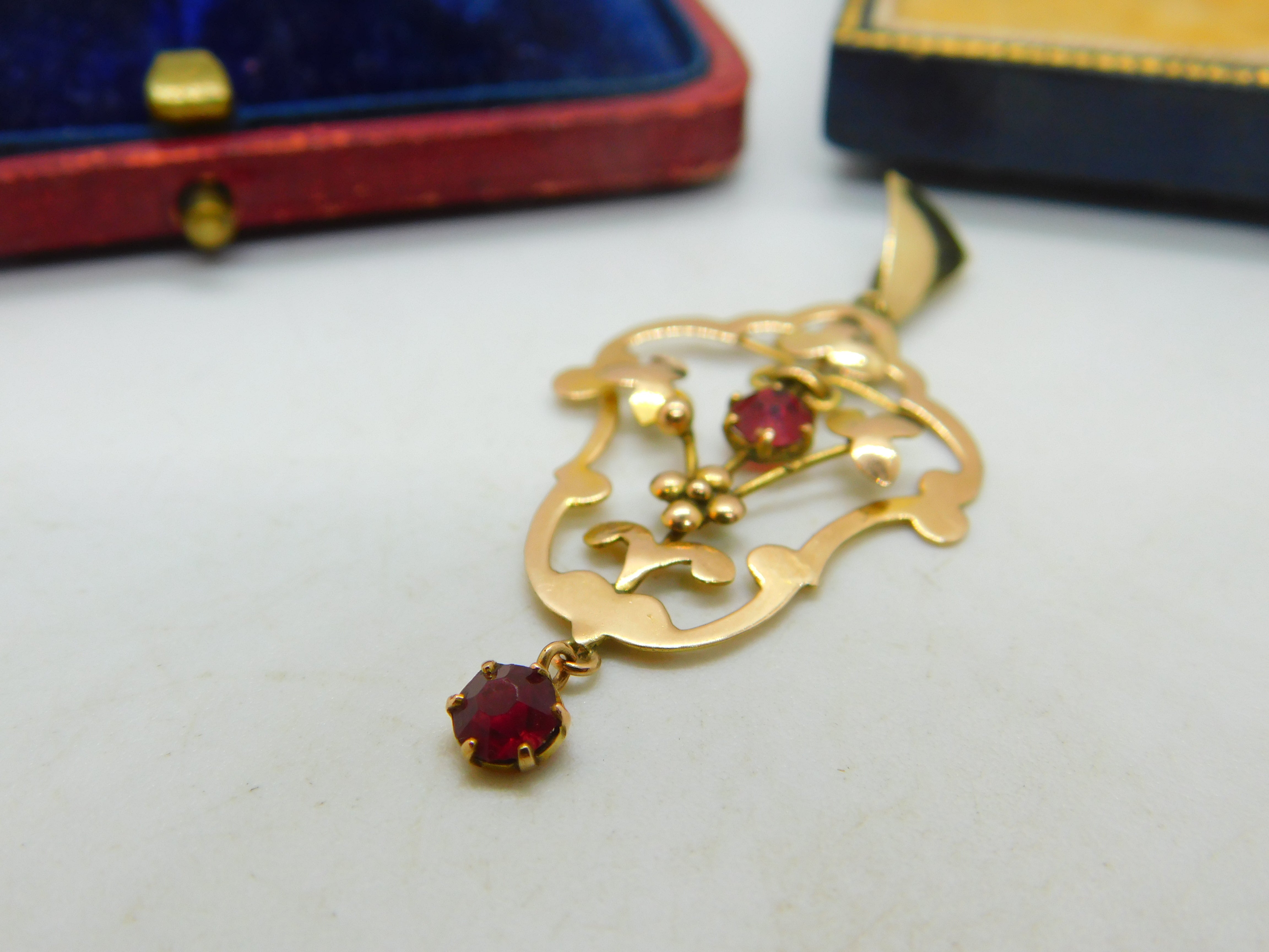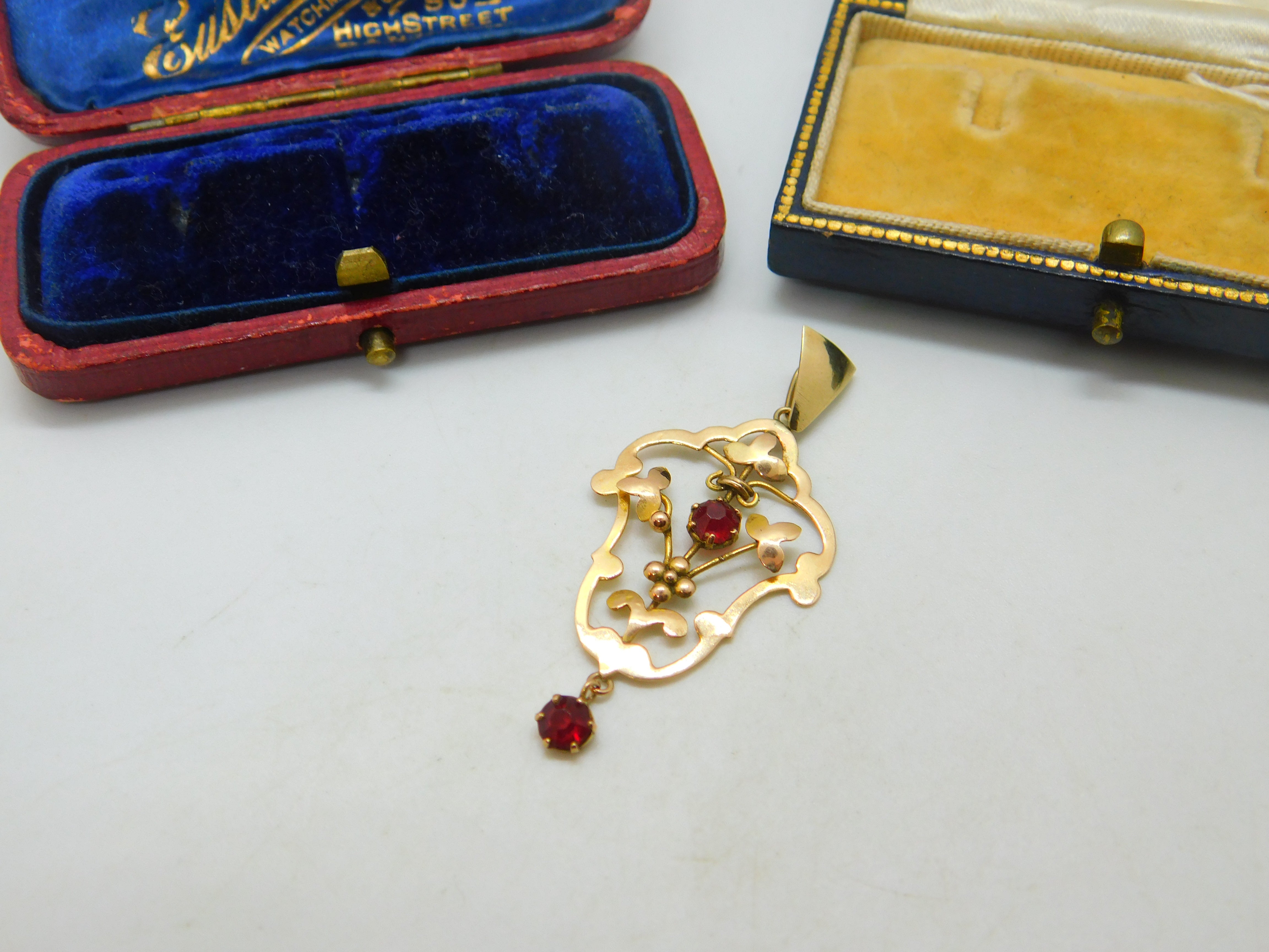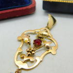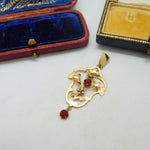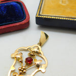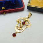 Edwardian 9ct Gold Garnet Set Floral Lavalier Form Drop Pendant Antique c1910