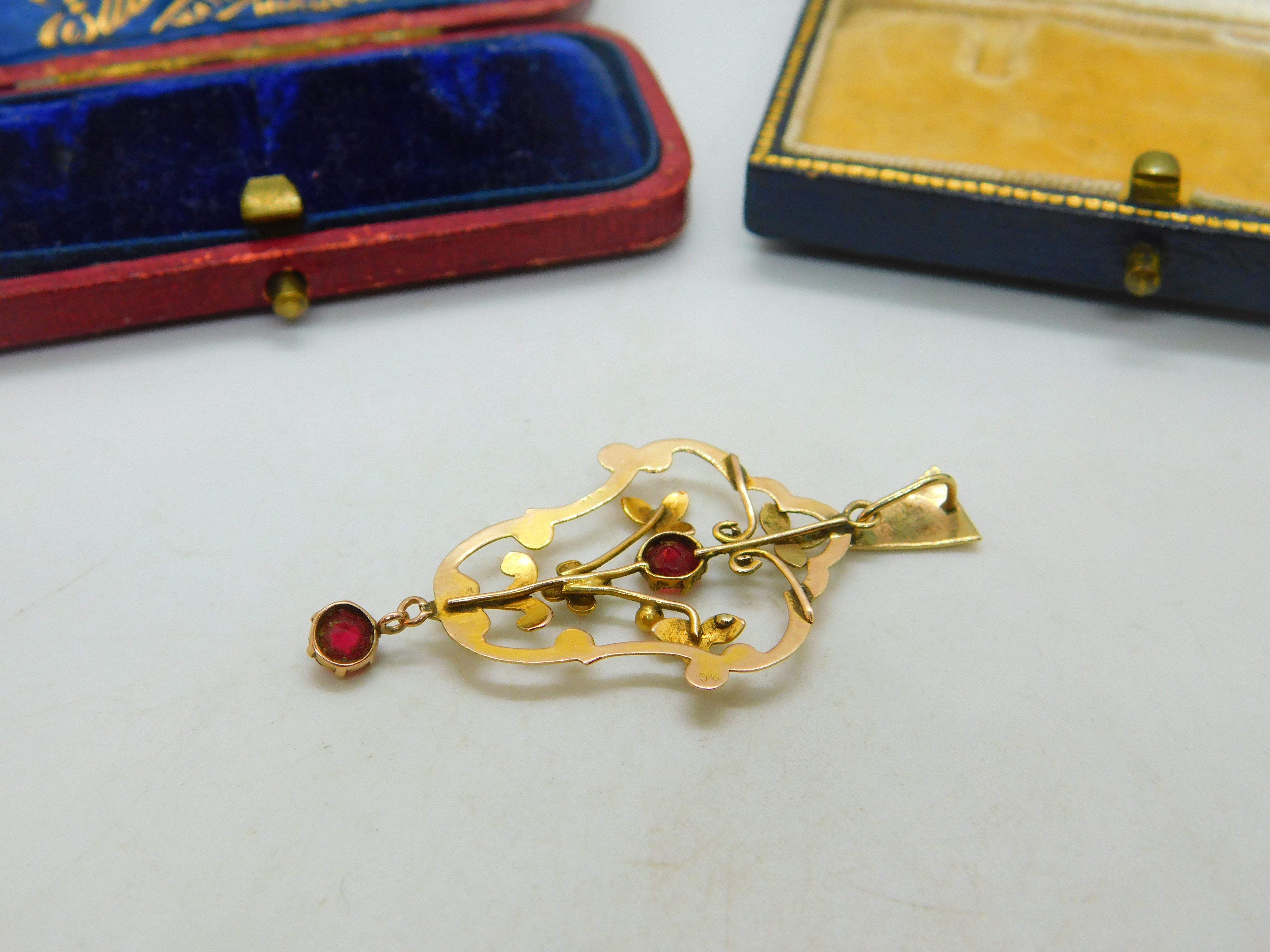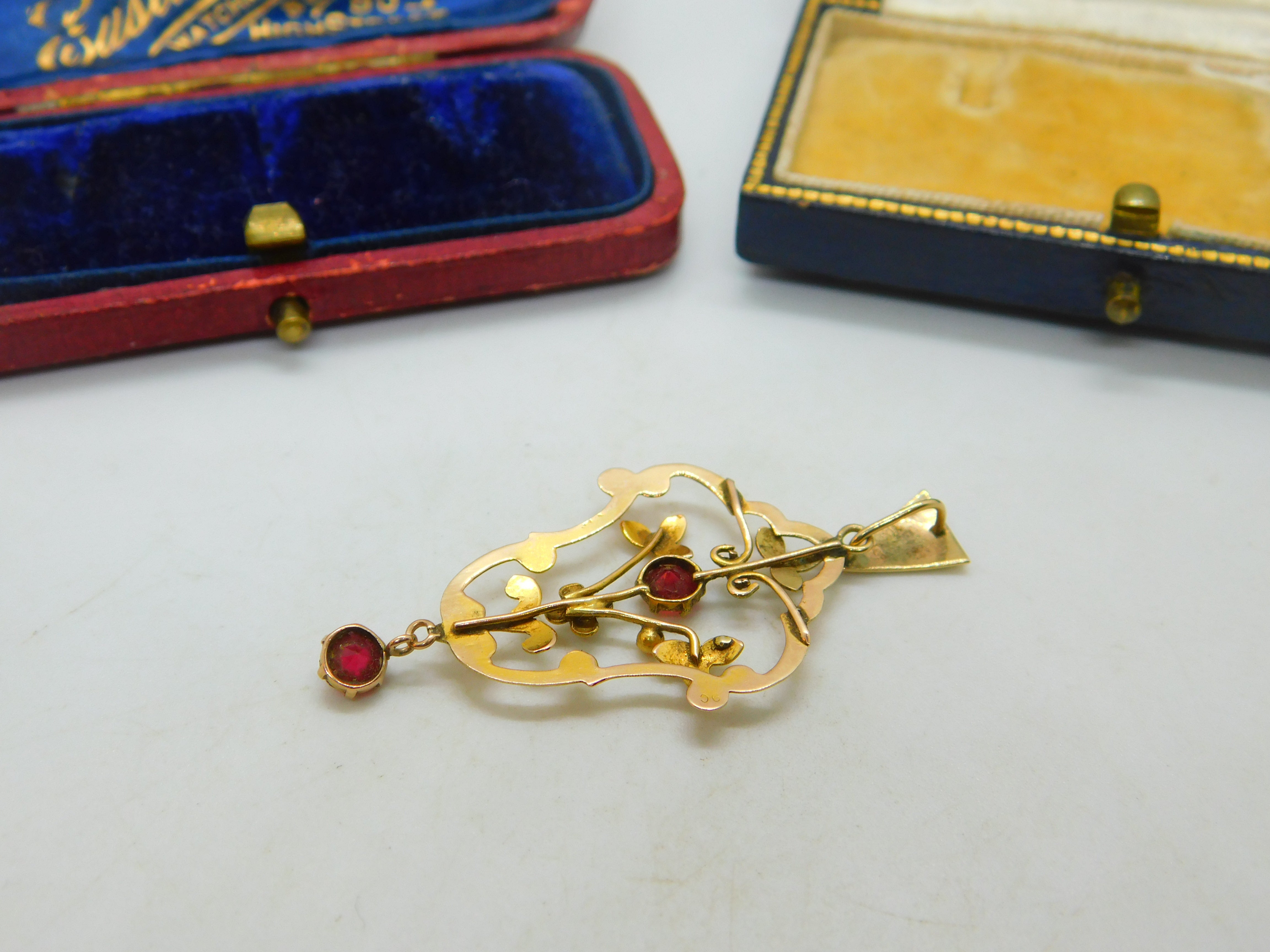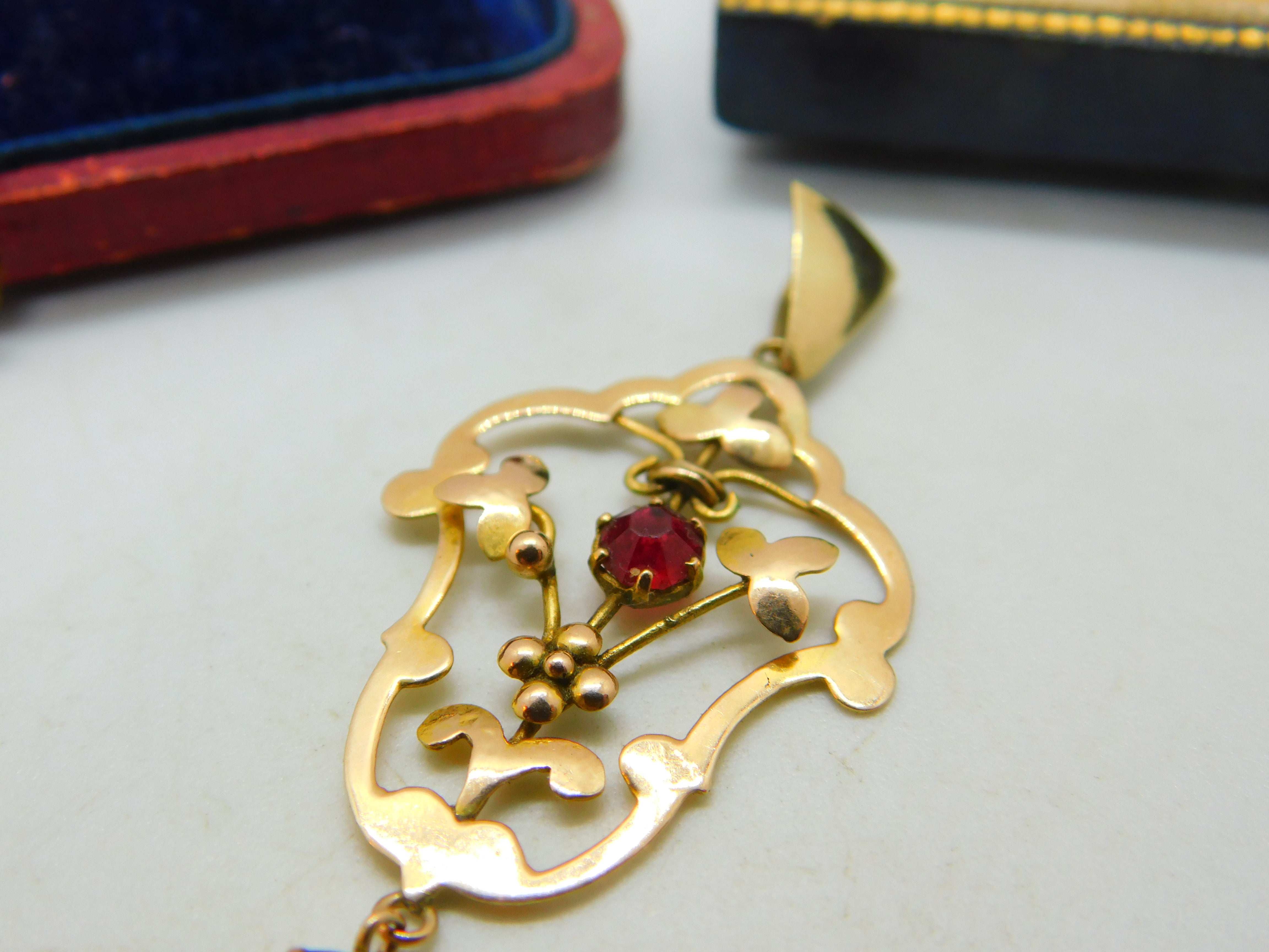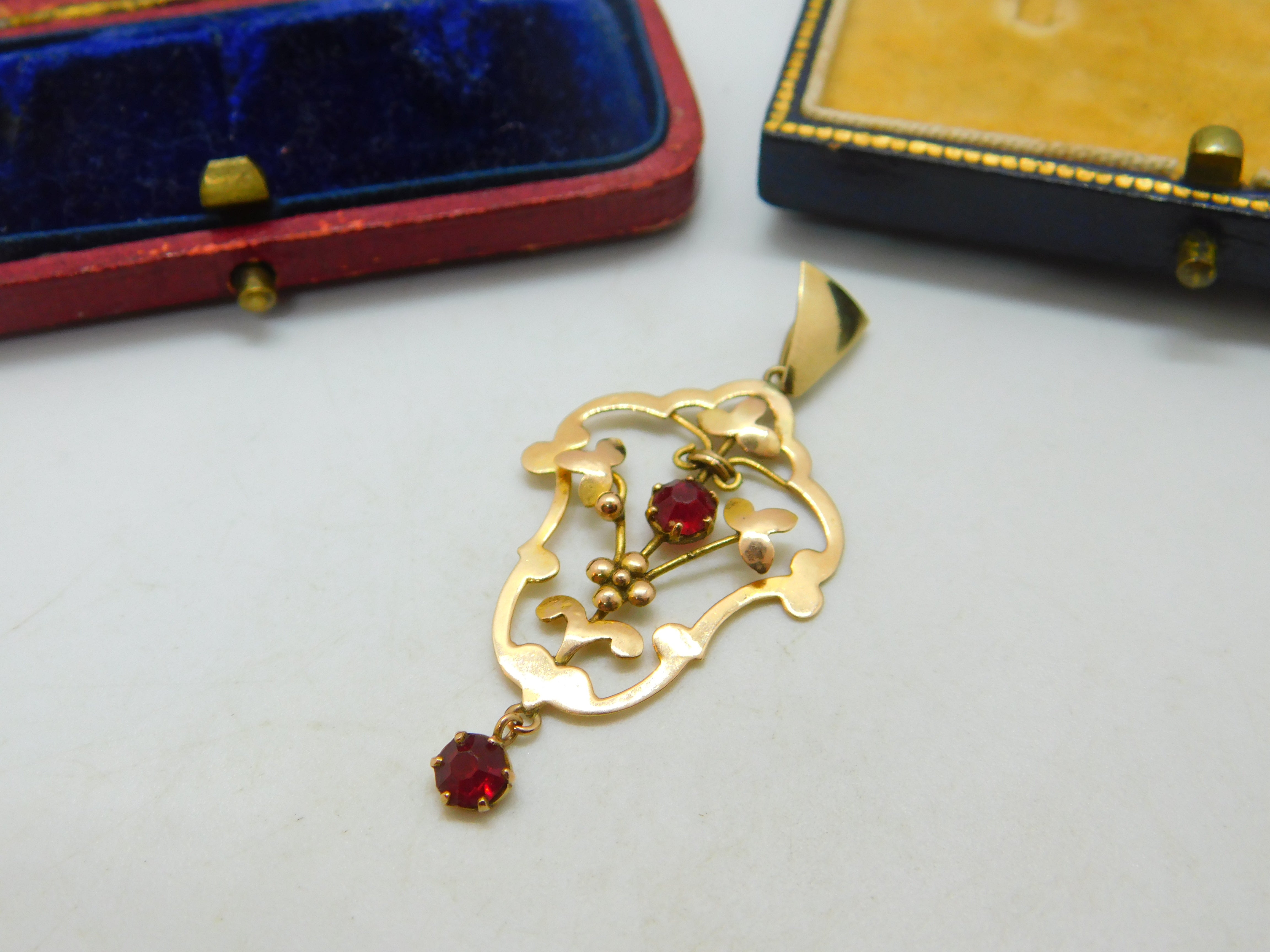 Edwardian 9ct Gold Garnet Set Floral Lavalier Form Drop Pendant Antique c1910