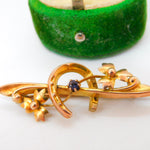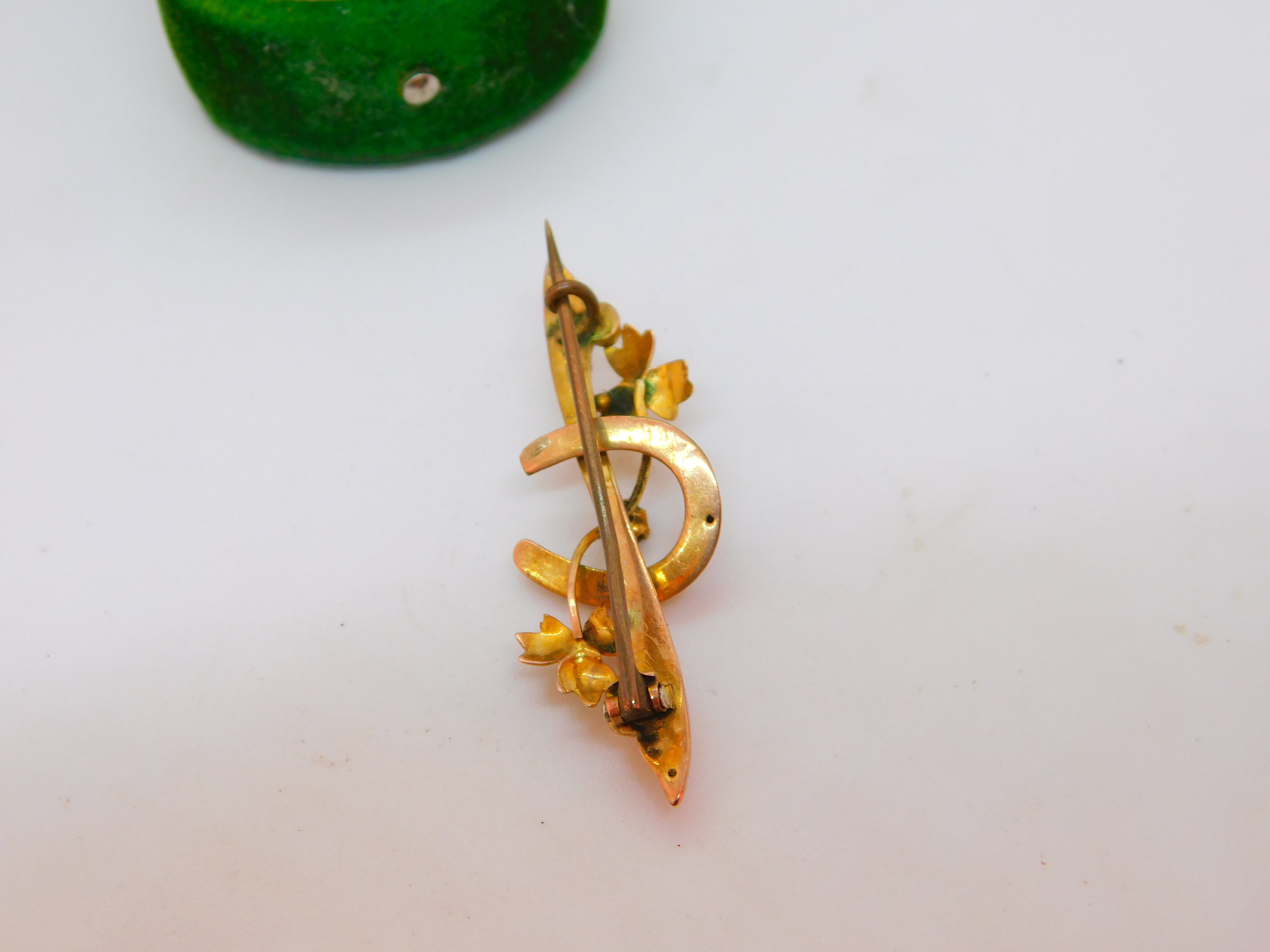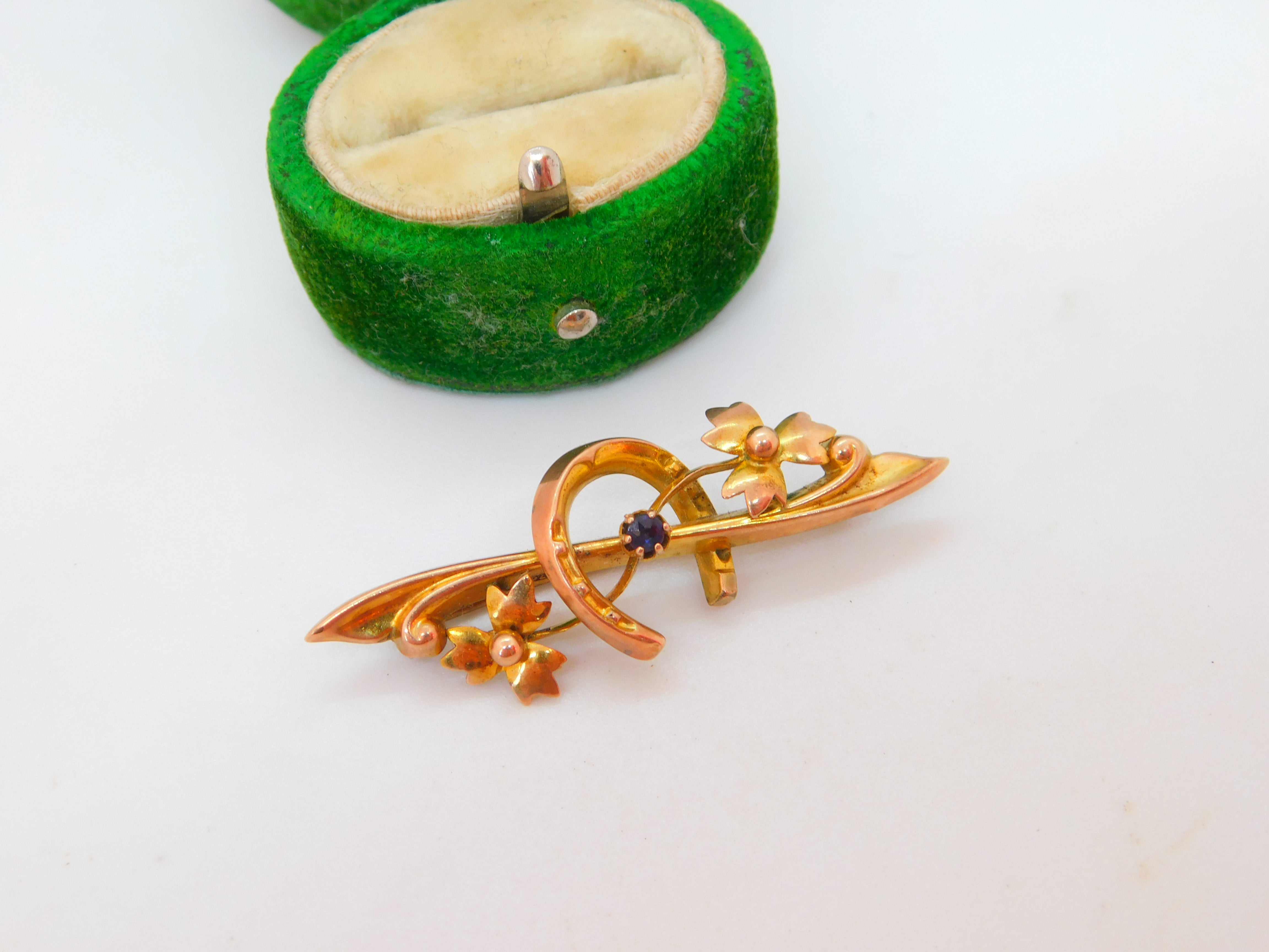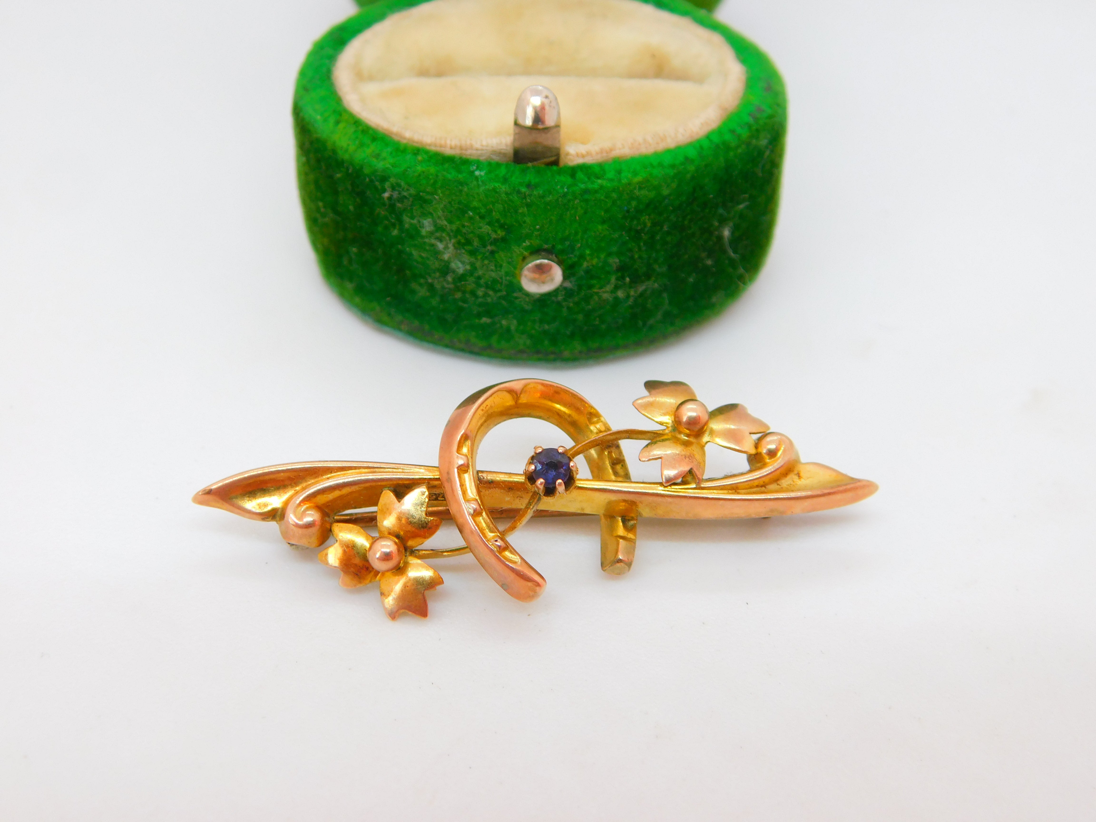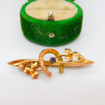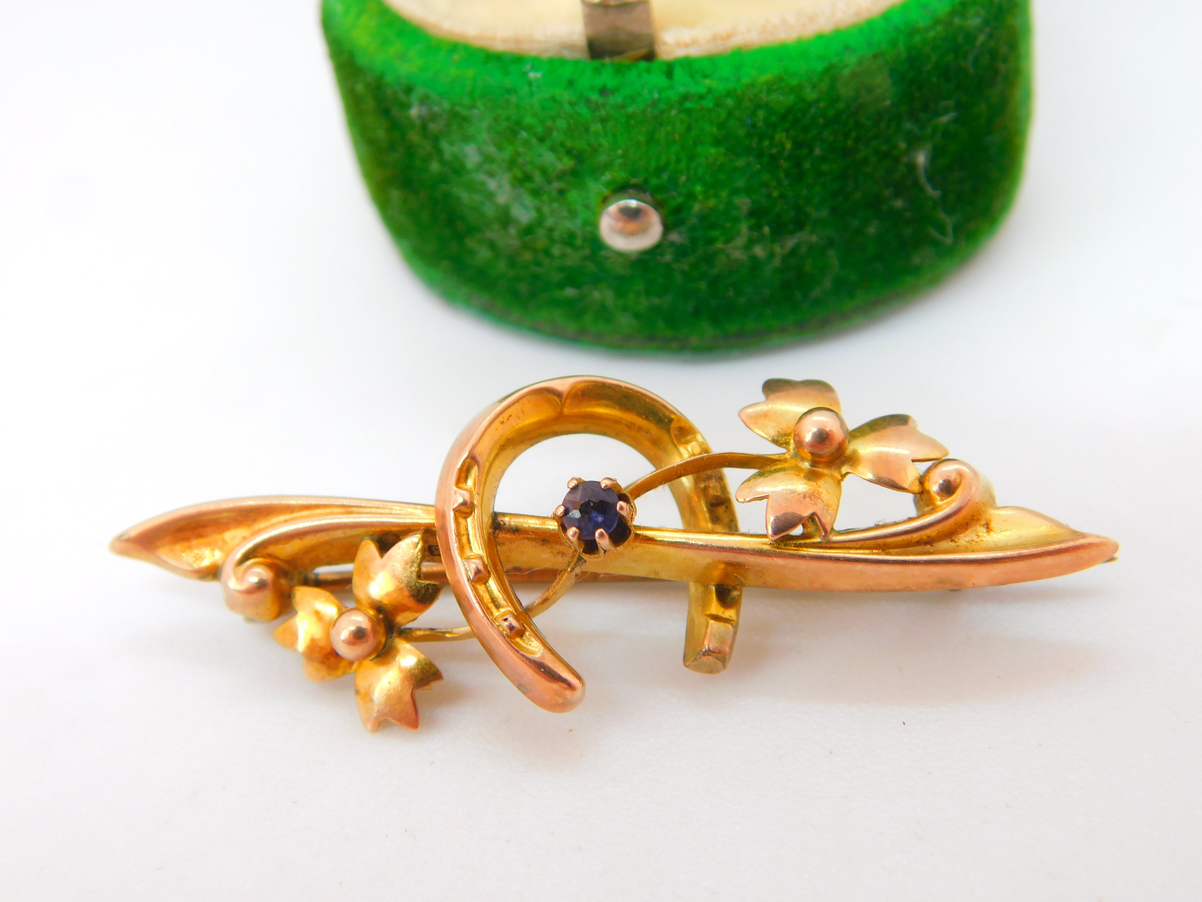 Edwardian 9ct Gold, Horseshoe & Leaf Pattern Sweetheart Brooch Antique 1907