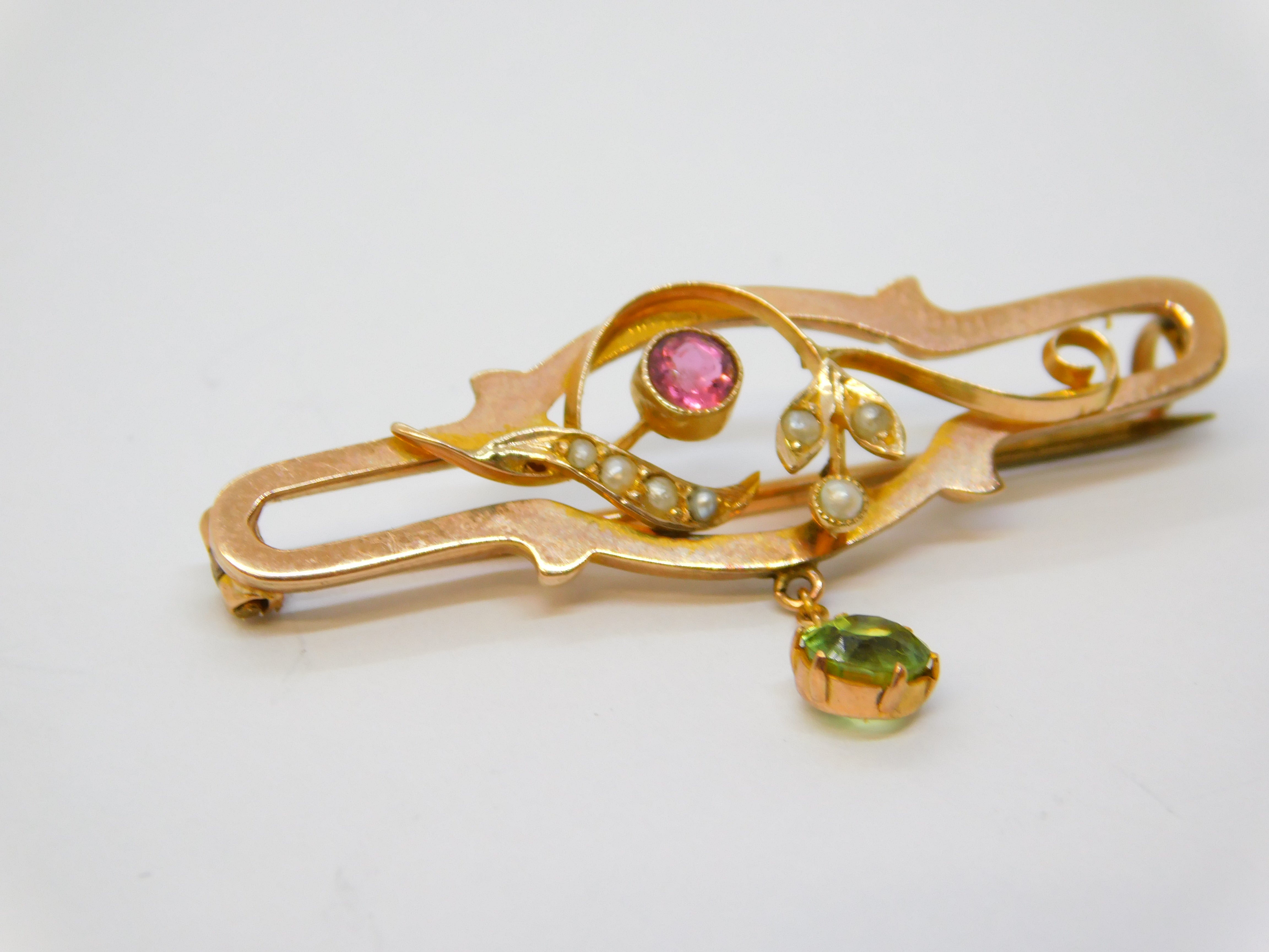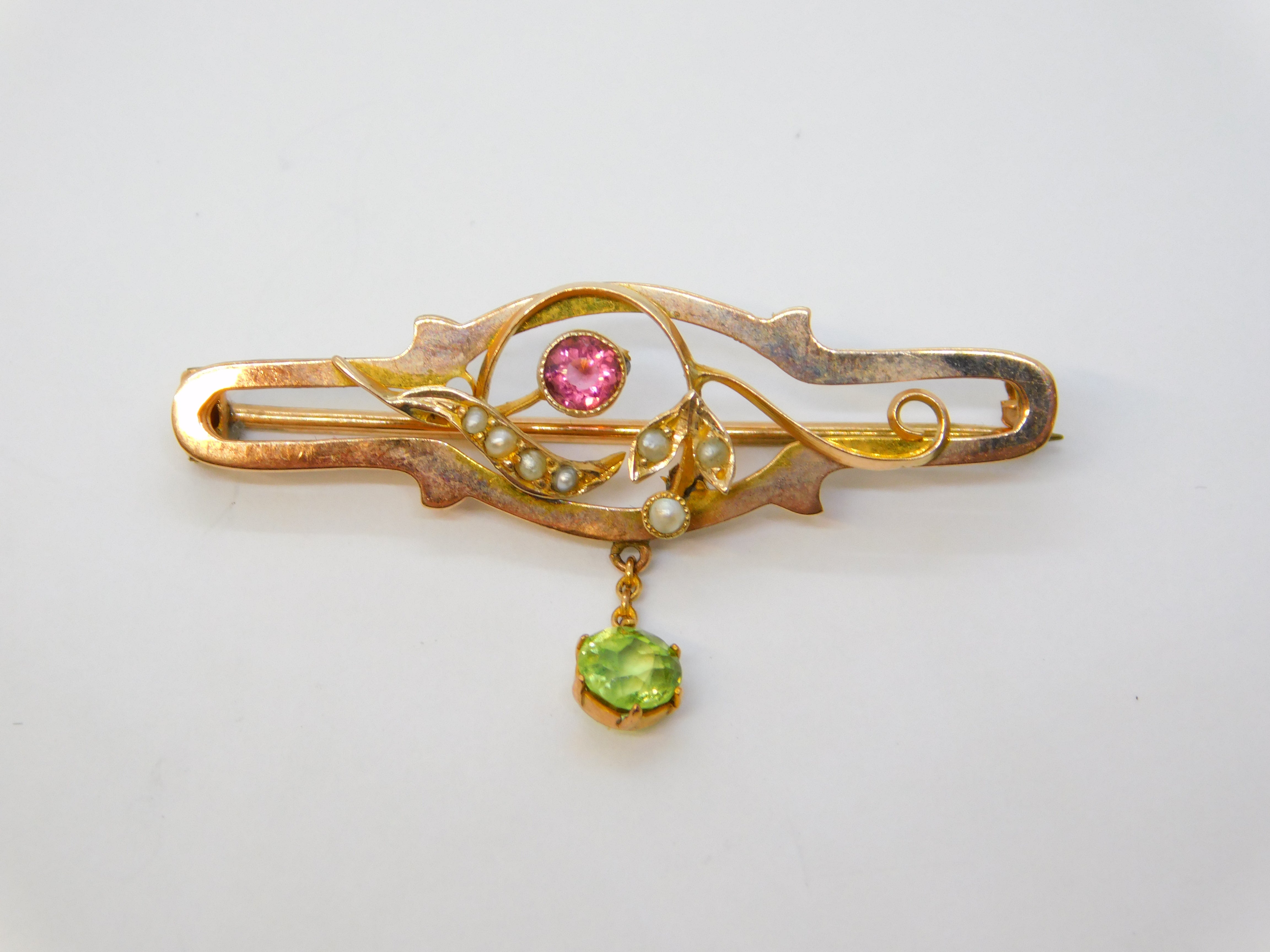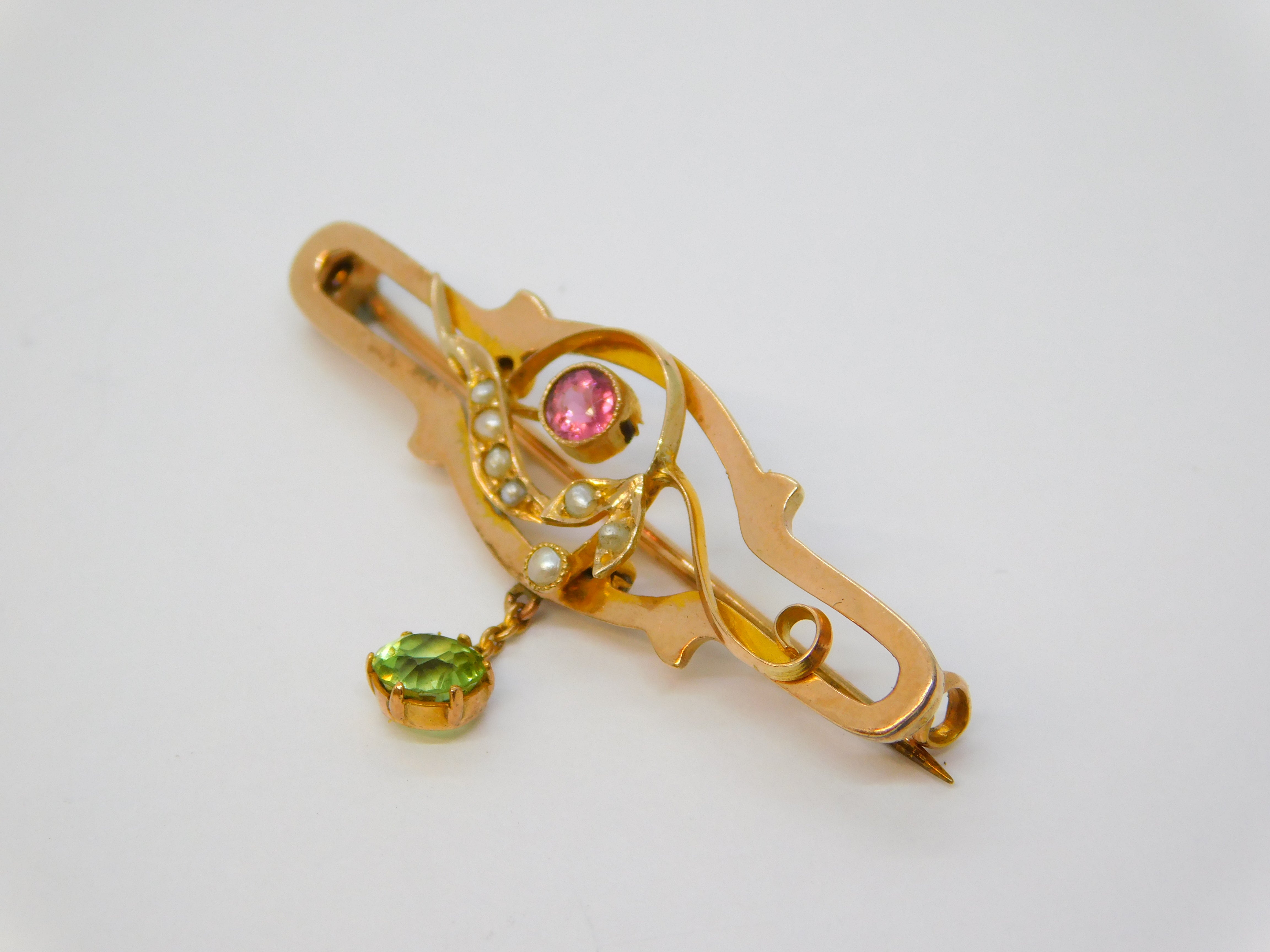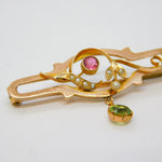 Details: A fantastic and wonderfully designed antique edwardian 9ct yellow gold suffragette form lavalier drop brooch set with pink topaz, peridot & seed pearls hallmarked to the reverse c1910. This is a wonderful item that would make a perfect gift or addition to any collection. We are more than happy to provide XRF reports for items upon request.