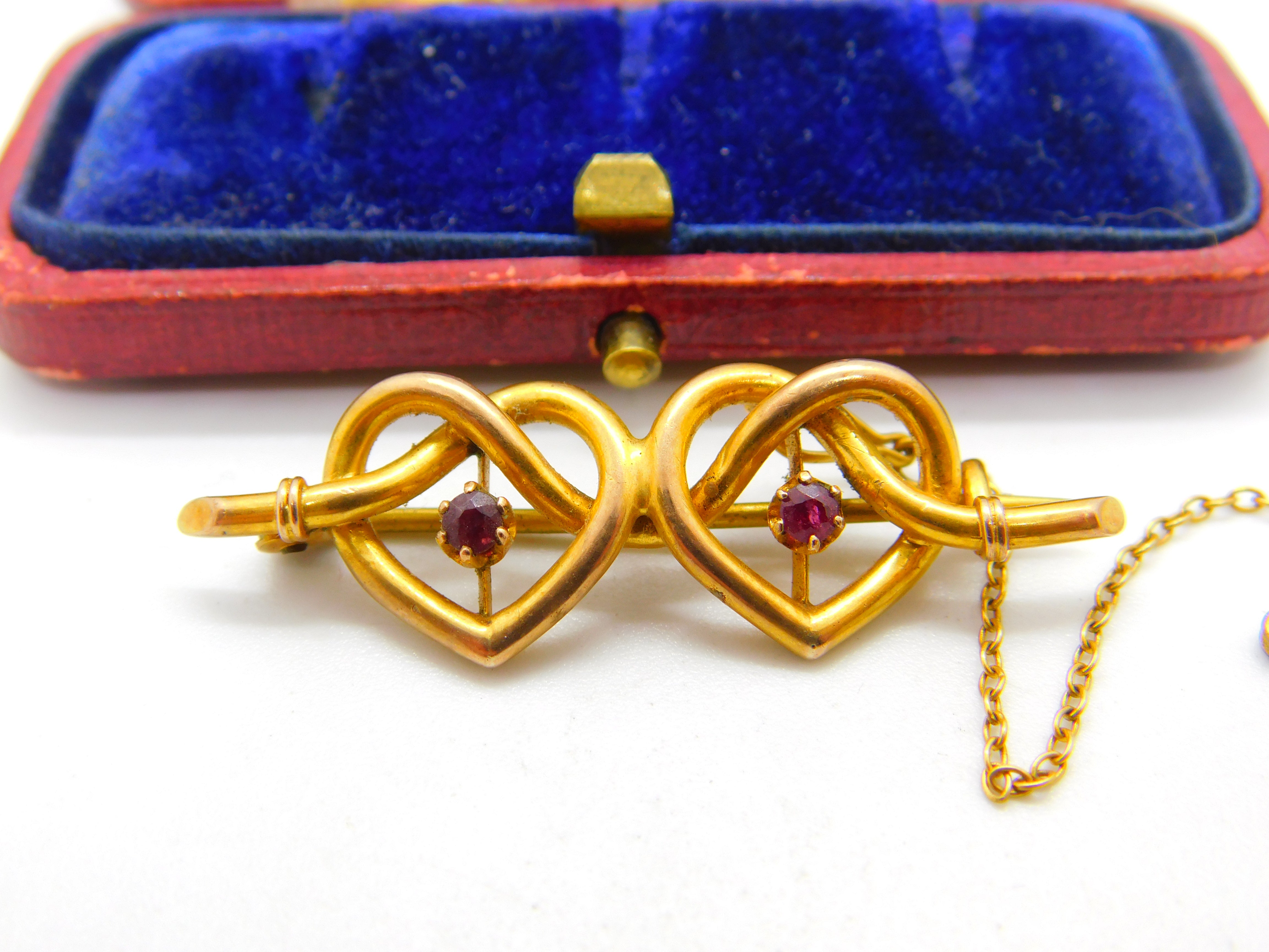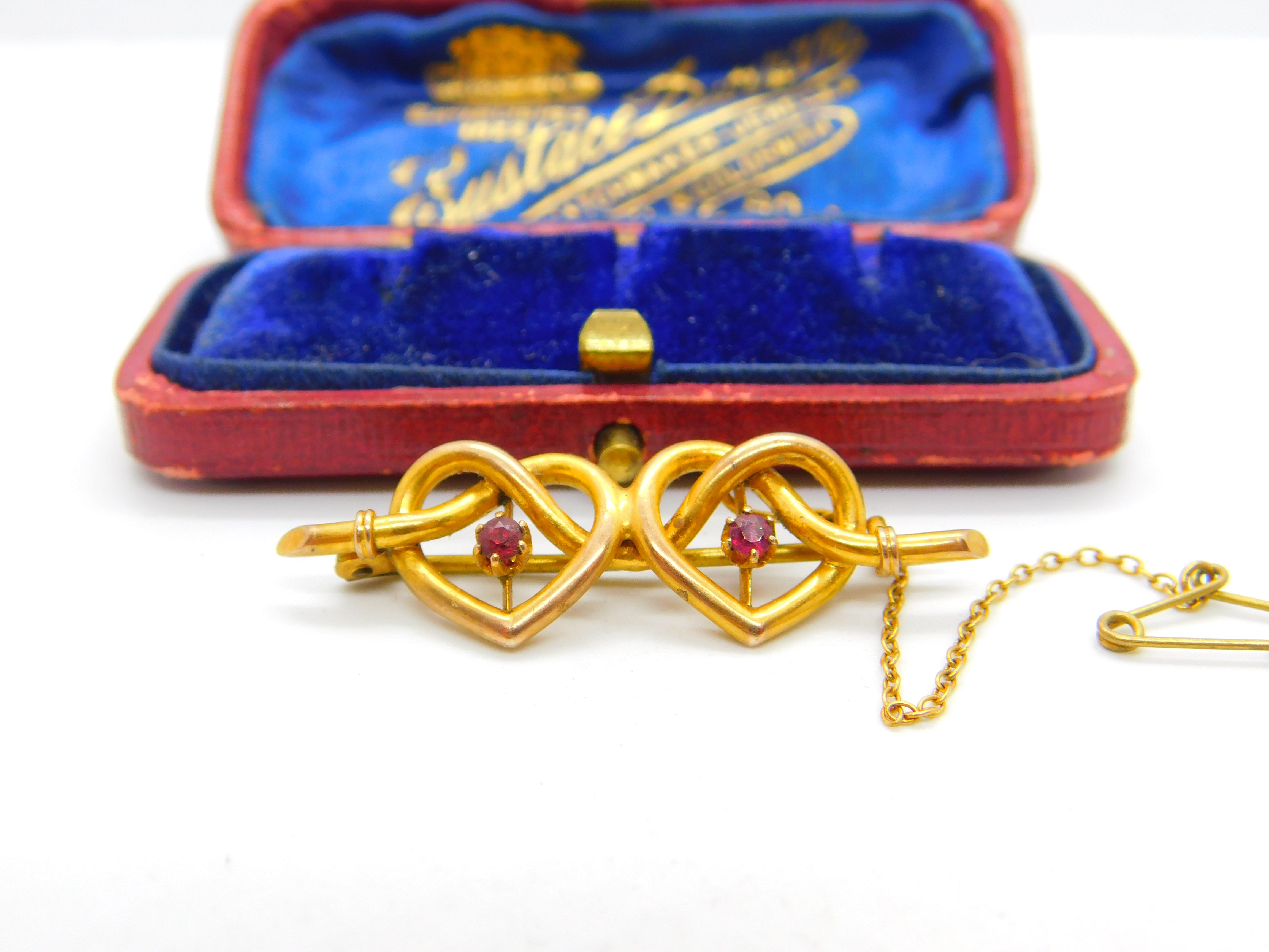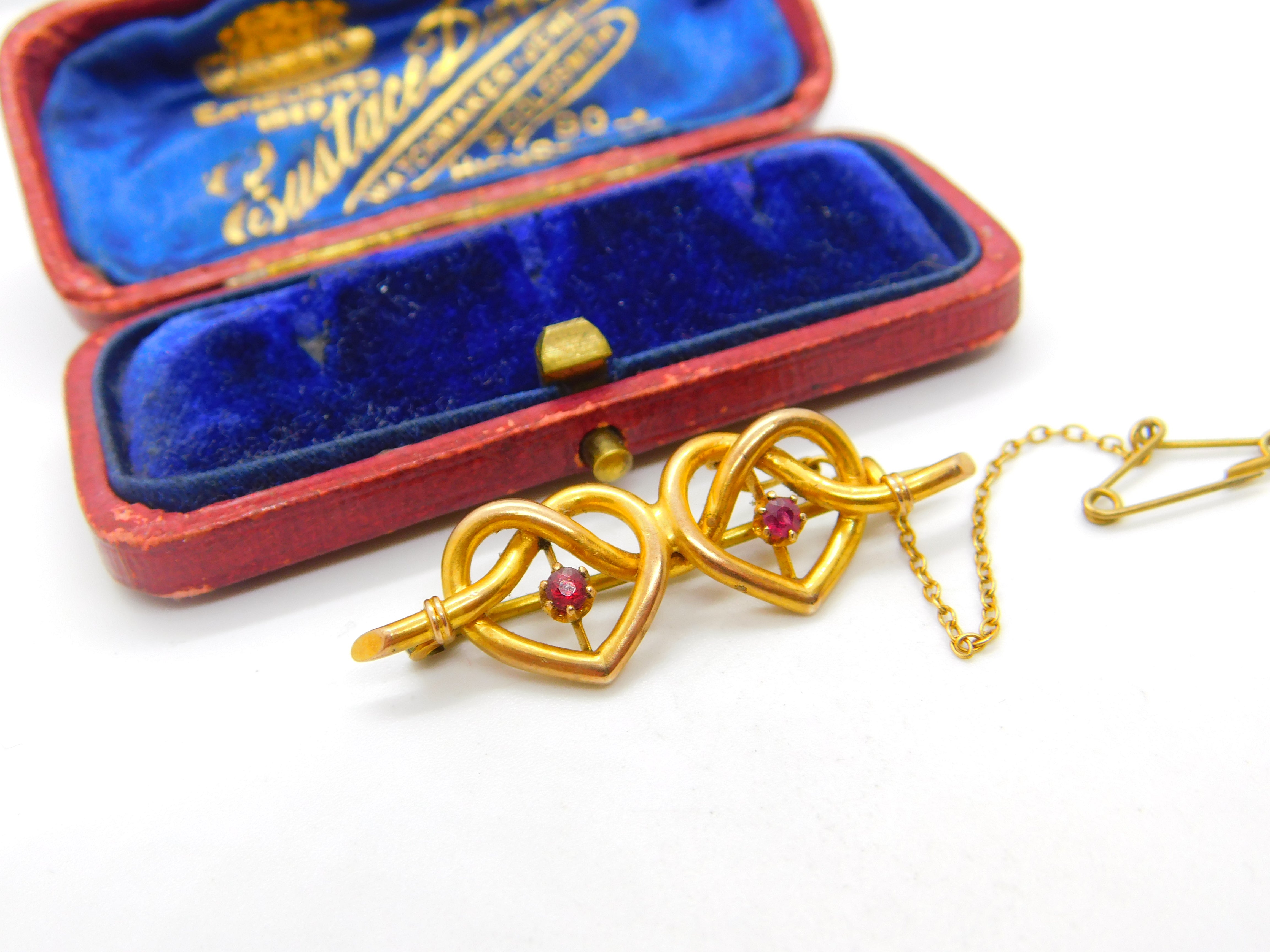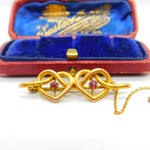 Edwardian 9ct Gold & Ruby Set Double Heart Sweetheart Brooch Antique c1910