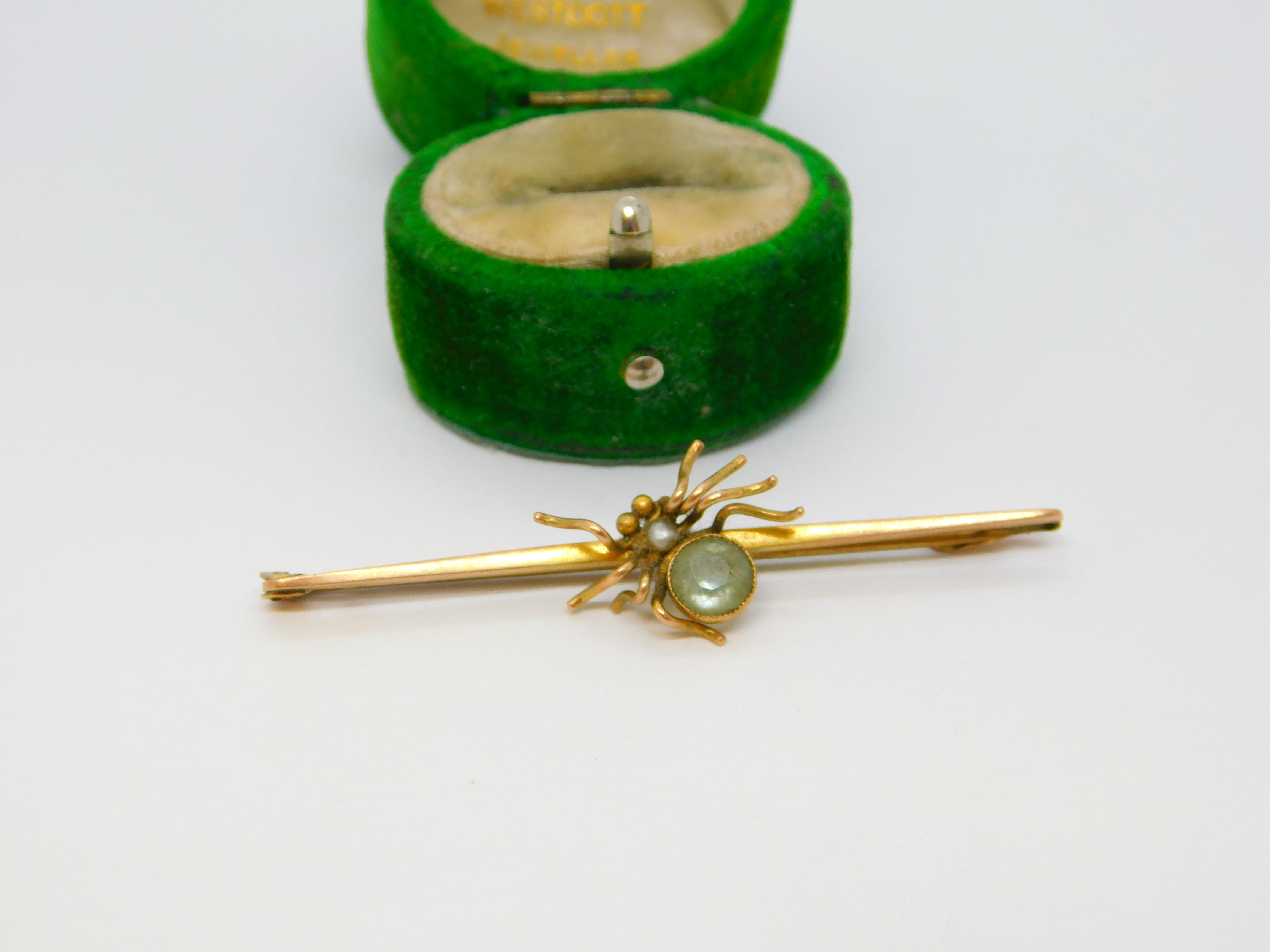Details: A fantastic and wonderfully designed antique Edwardian 9ct yellow gold spider or insect sweetheart suffragette brooch set with topaz and seed pearl c1910 marked to the reverse. This is a wonderful item that would make a perfect gift or addition to any collection. The BOX pictured is for PRESENTATION ONLY and is NOT included in the listings but used to frame the pictures unless specifically stated otherwise.