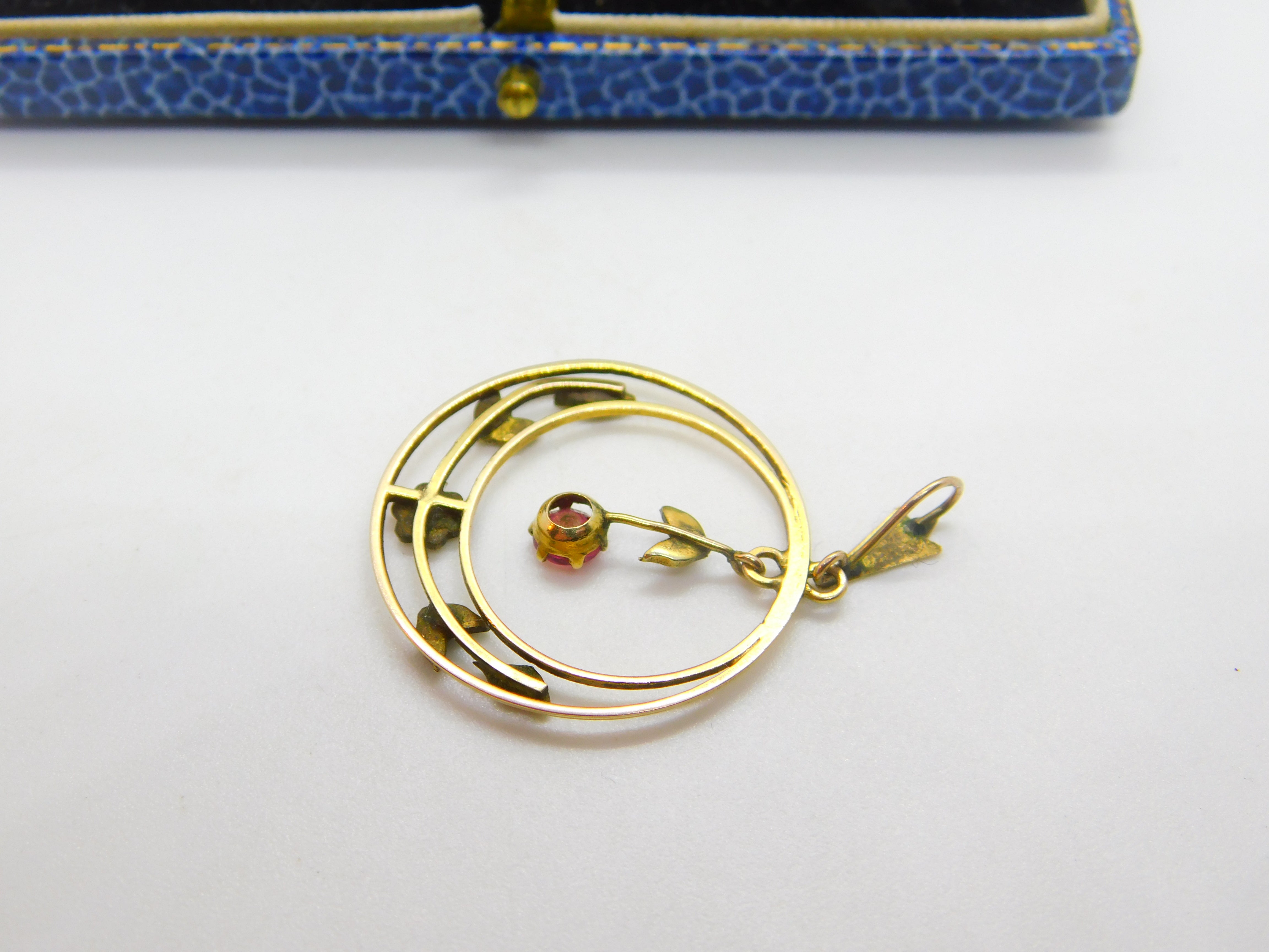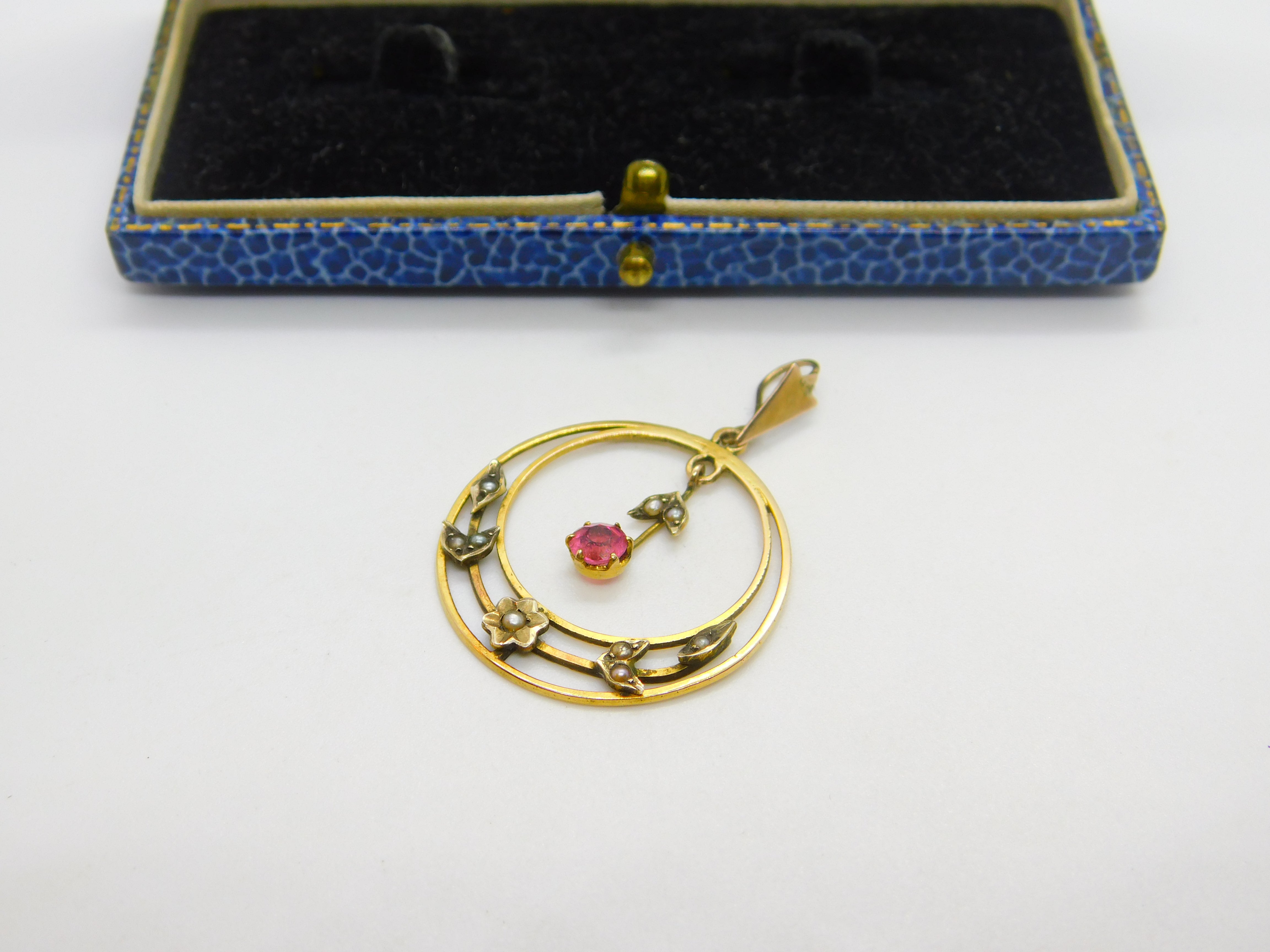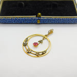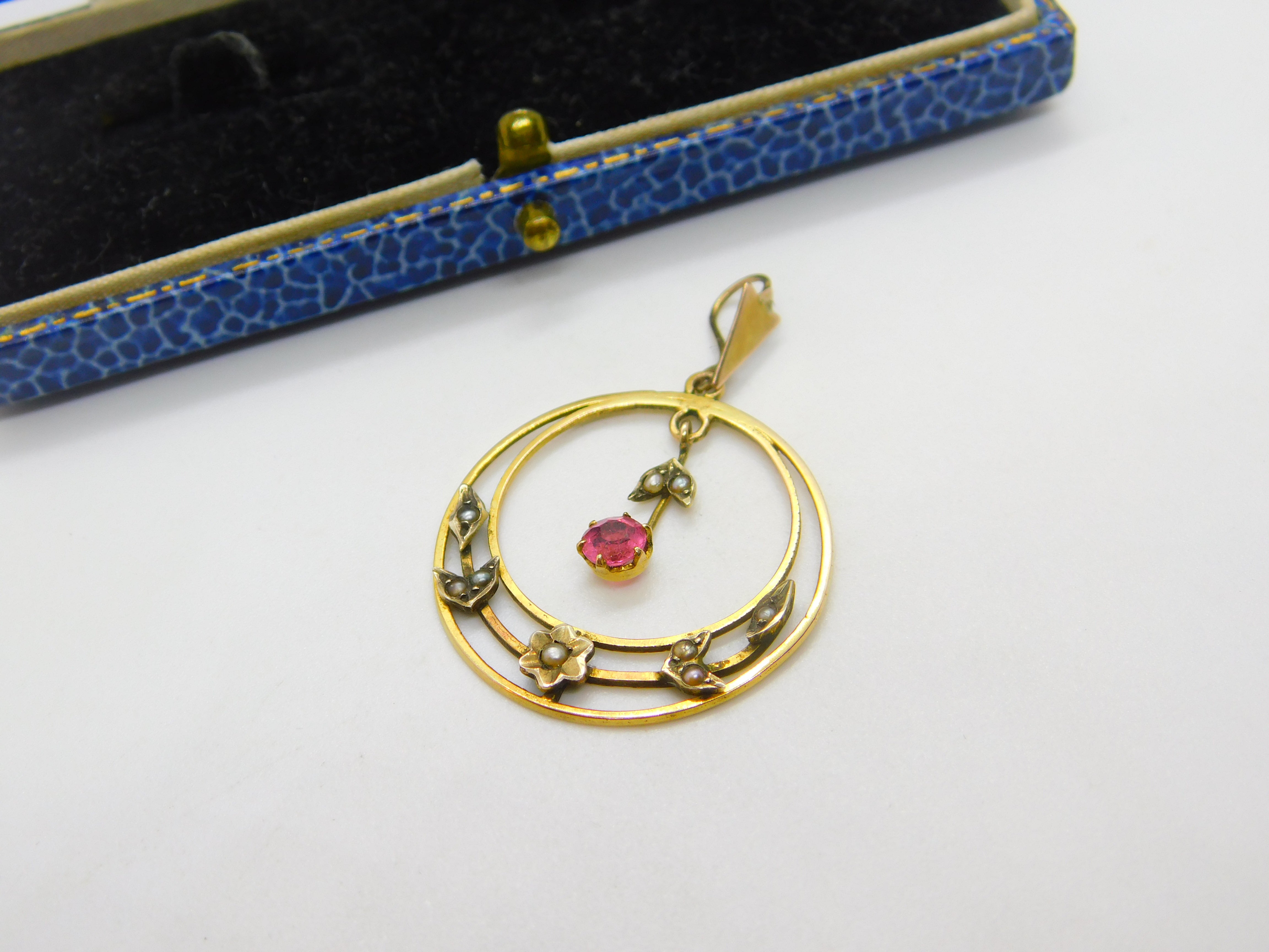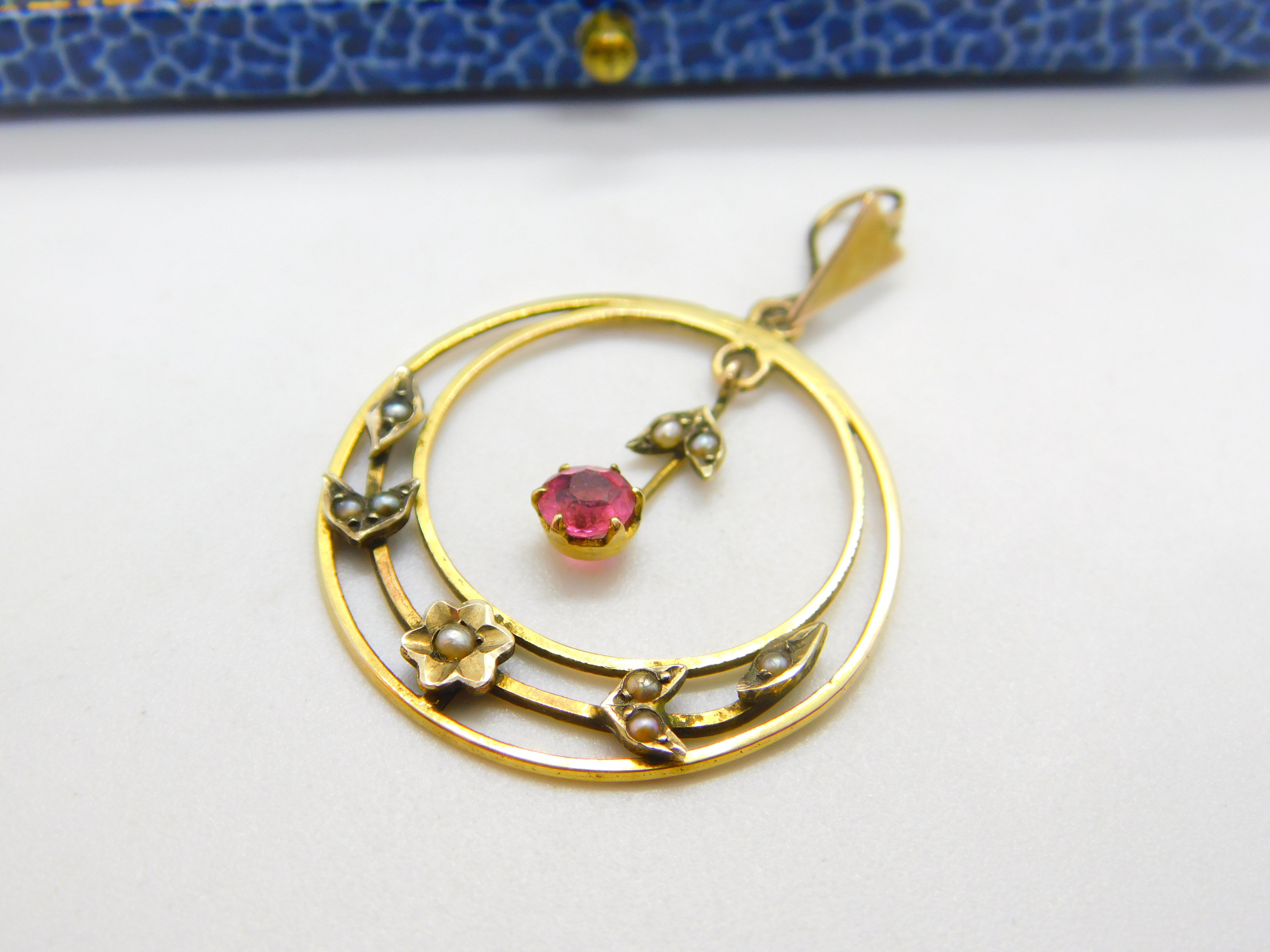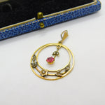 Details: A fantastic and wonderfully designed antique Edwardian 9ct yellow gold, pink topaz and seed pearl lavalier drop pendant in the form of a moon with lovely floral design c1910. The gold has been XRF tested. This is a wonderful item that would make a perfect gift or addition to any collection. The BOX pictured is for PRESENTATION ONLY and is NOT included in the listings but used to frame the pictures unless specifically stated otherwise.