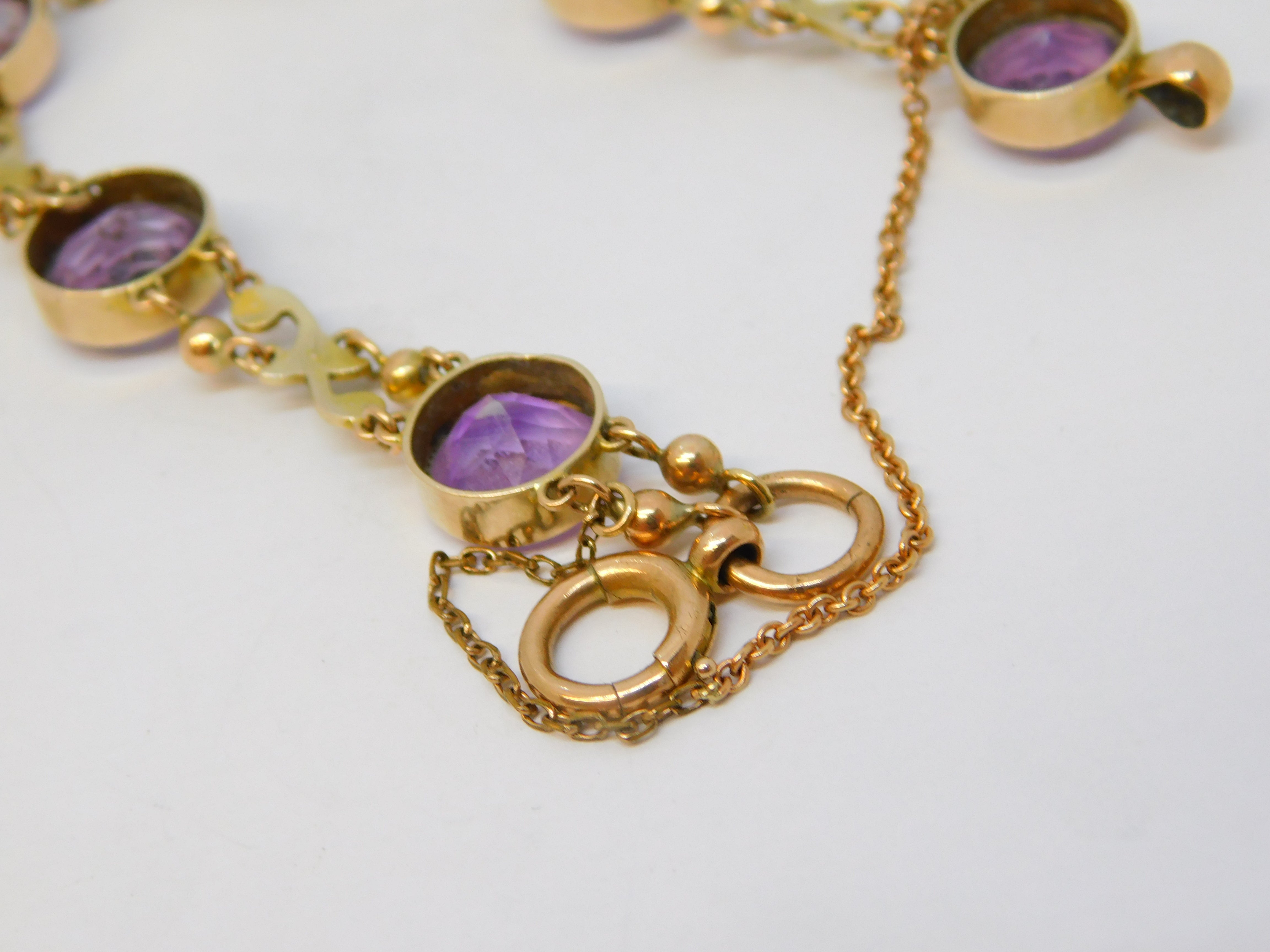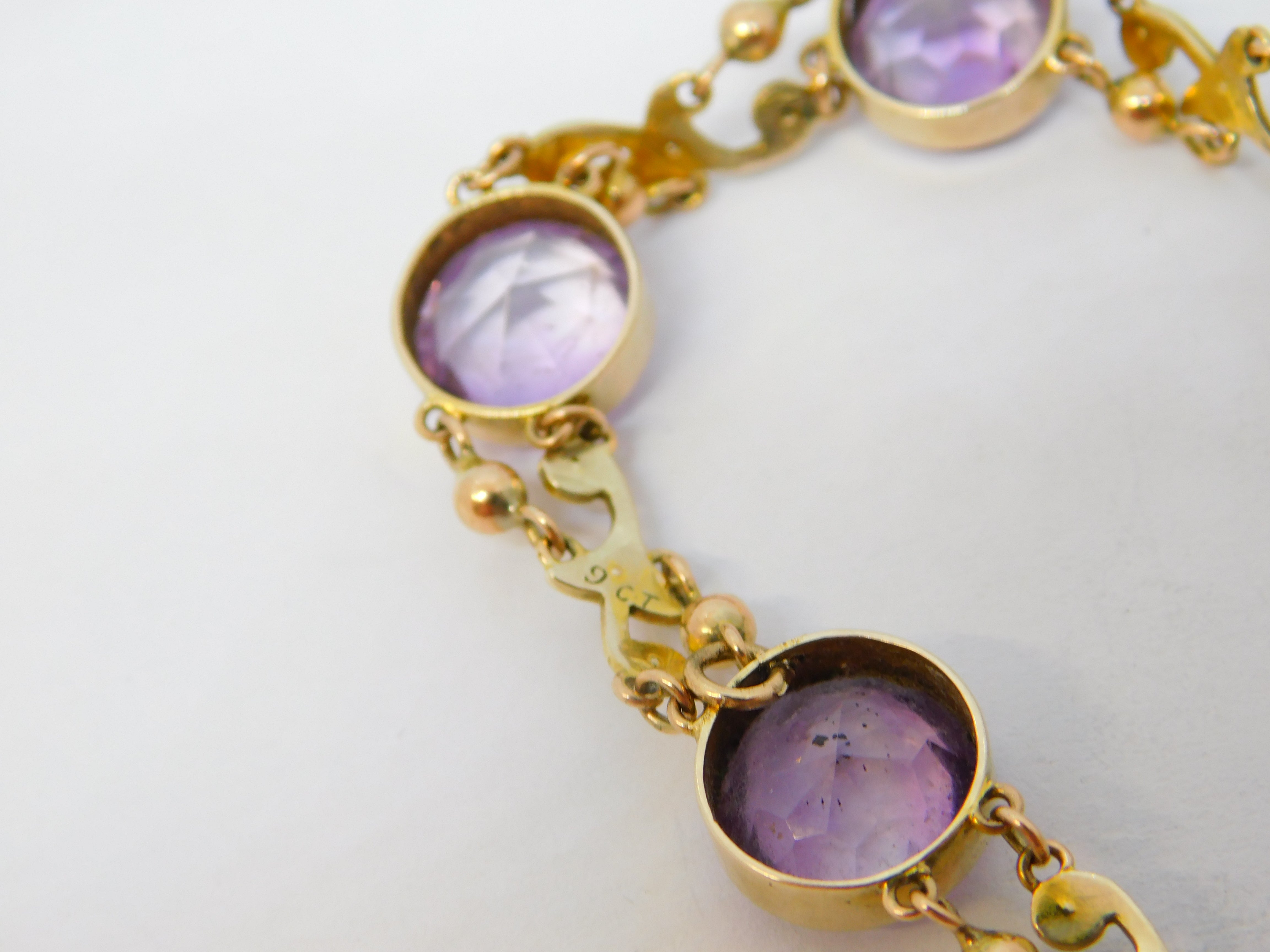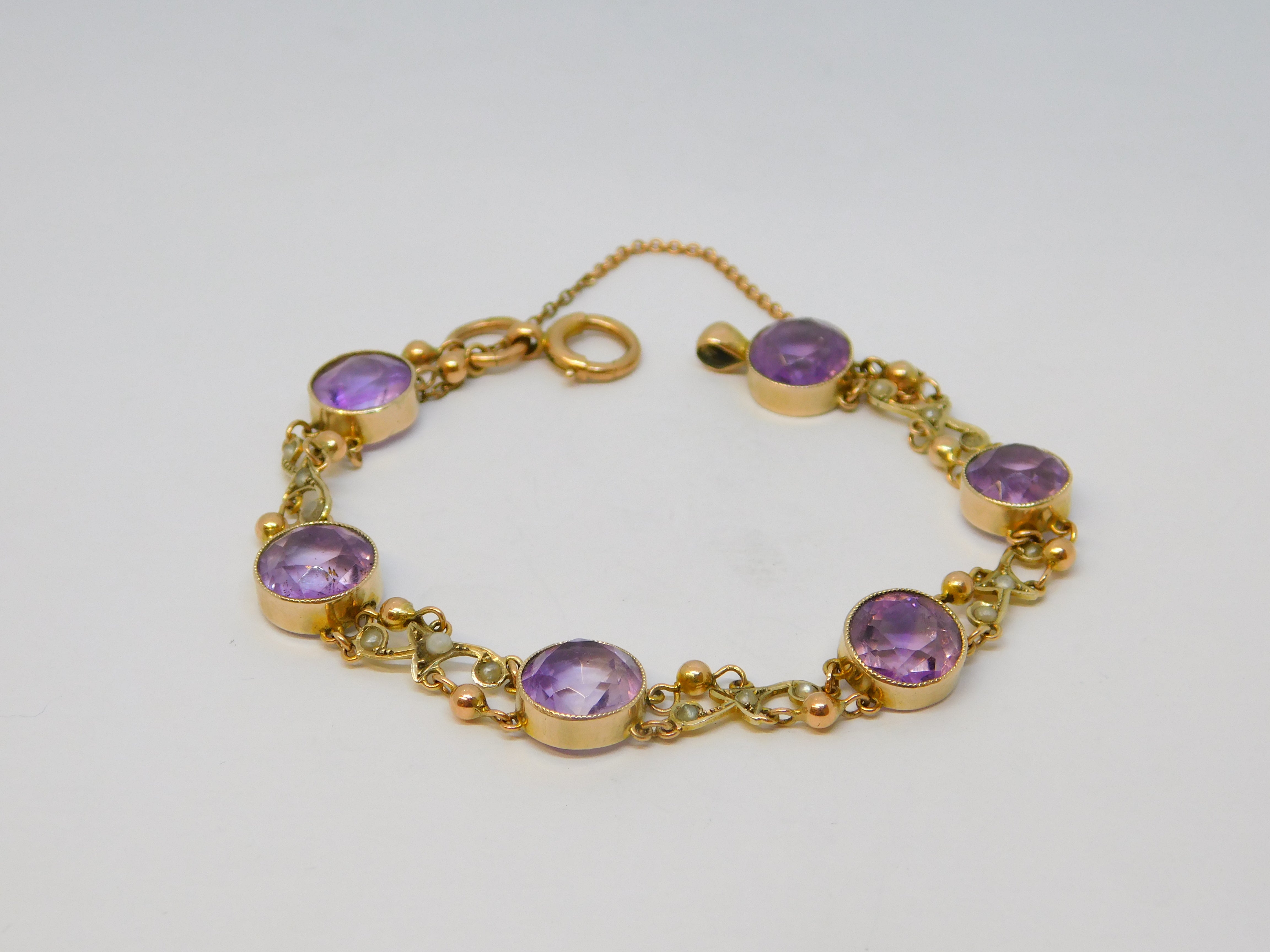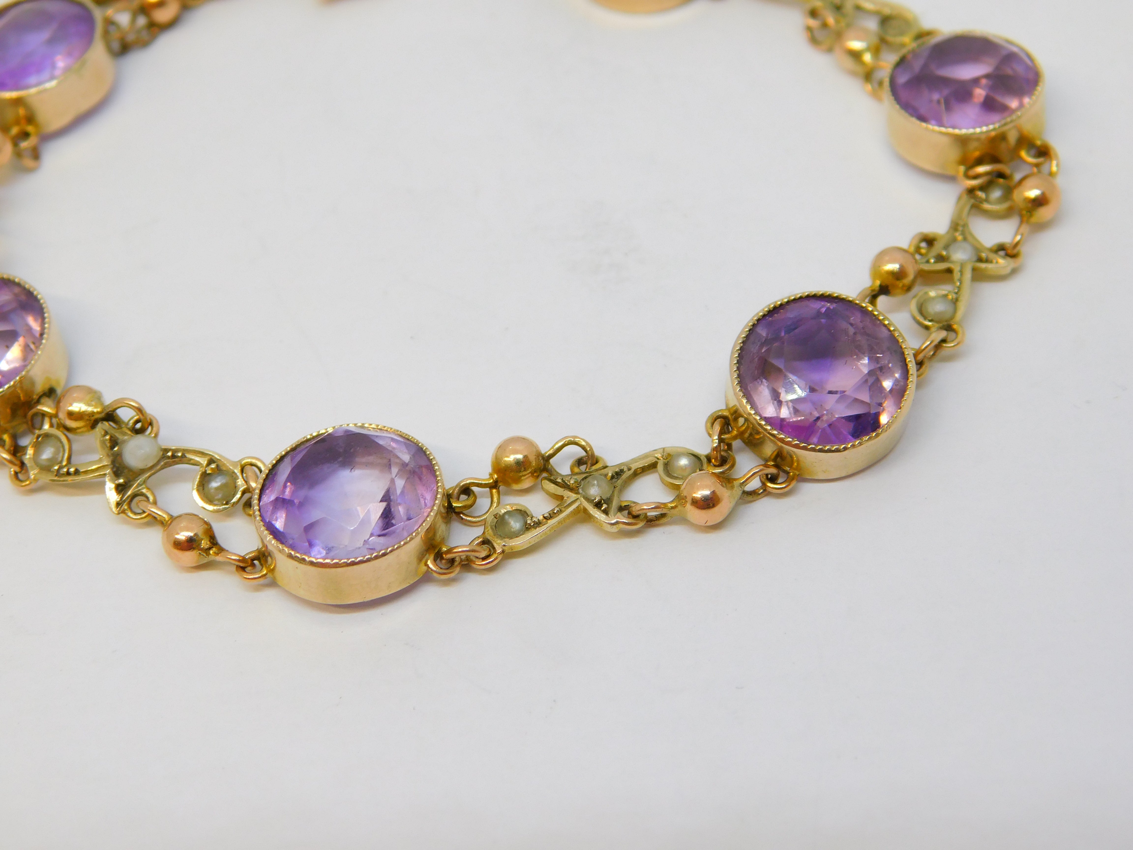 Details: A fantastic and wonderfully designed antique Edwardian 9ct rose gold floral bracelet set with faceted purple amethyst stones alongside interlinking seed pearl panels hallmarked '9ct' to the reverse c1910 and XRF tested, secured with a bolt ring clasp. This is a wonderful item that would make a perfect gift or addition to any collection. The BOX pictured is for PRESENTATION ONLY and is NOT included in the listings but used to frame the pictures unless specifically stated otherwise.