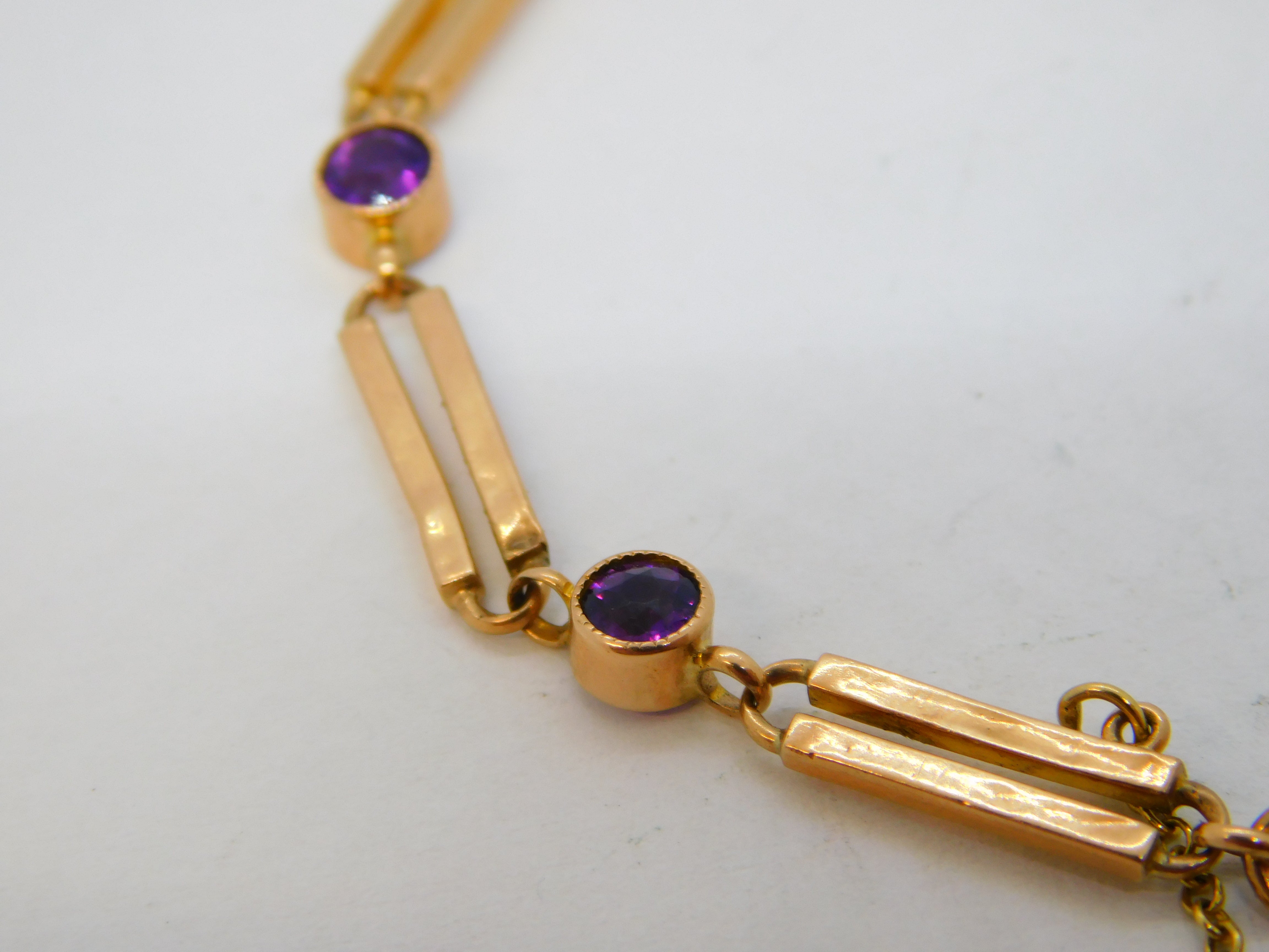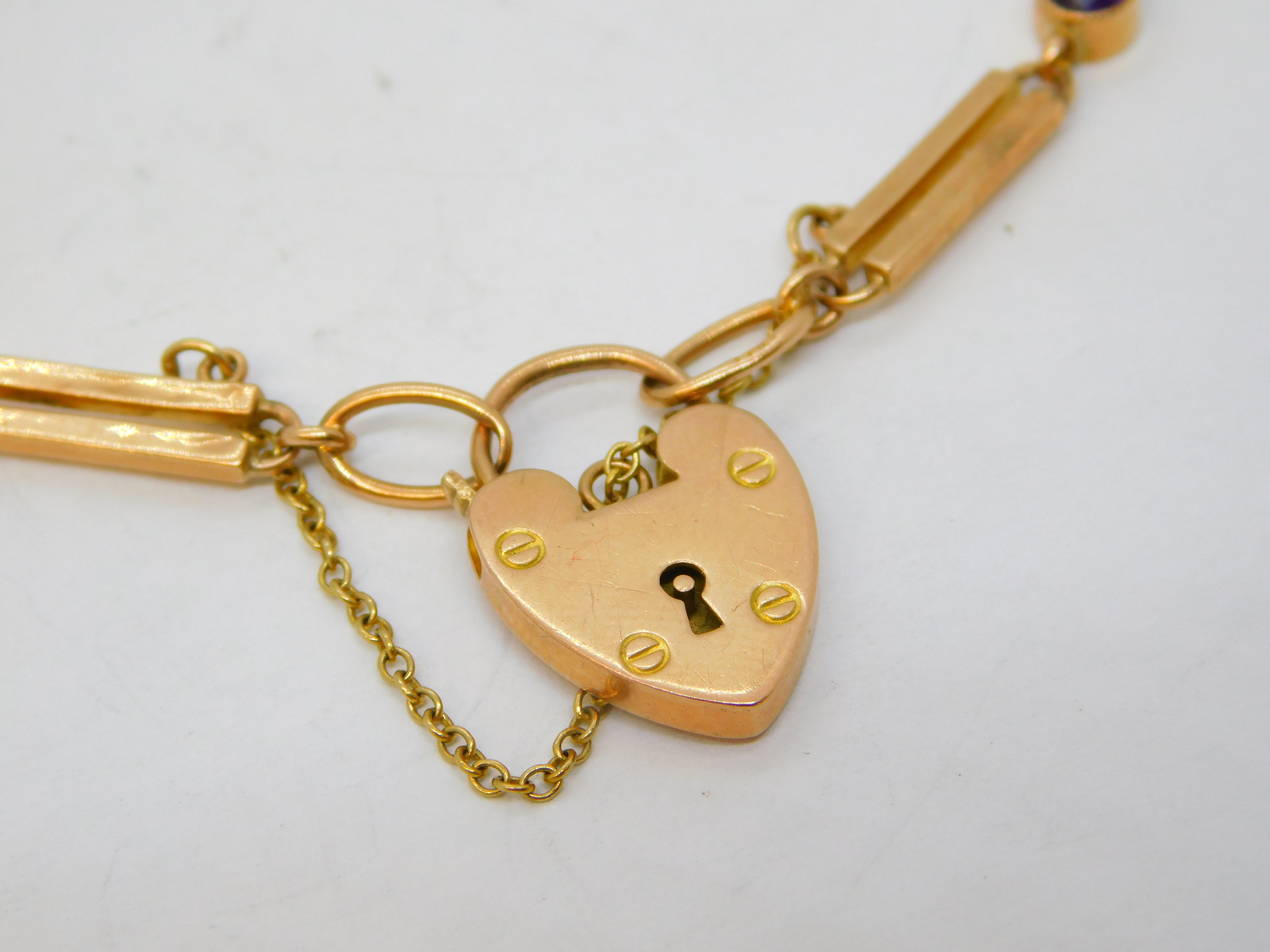 Edwardian 9ct Rose Gold & Amethyst Trombone Link Charm Bracelet Antique c1910