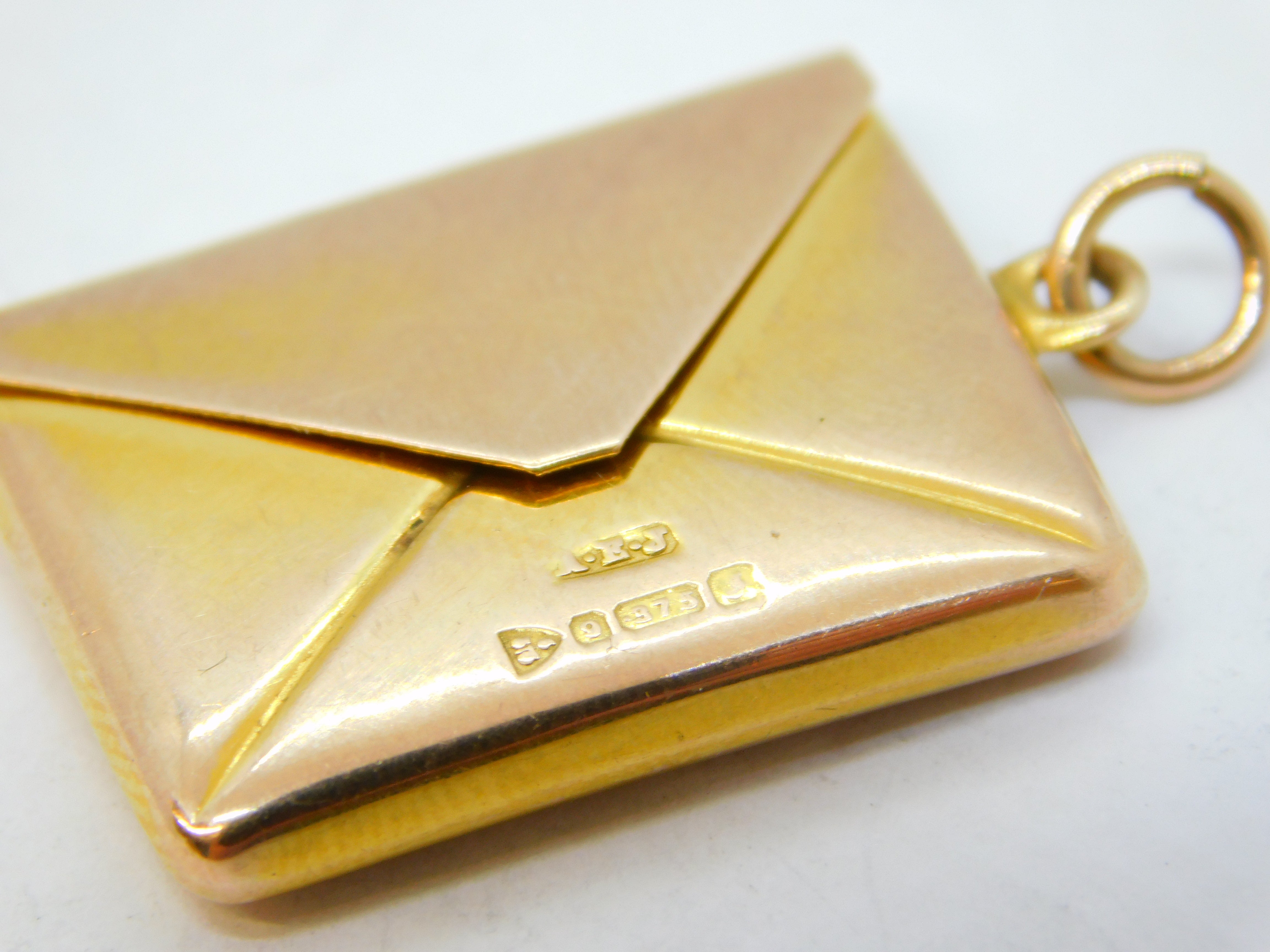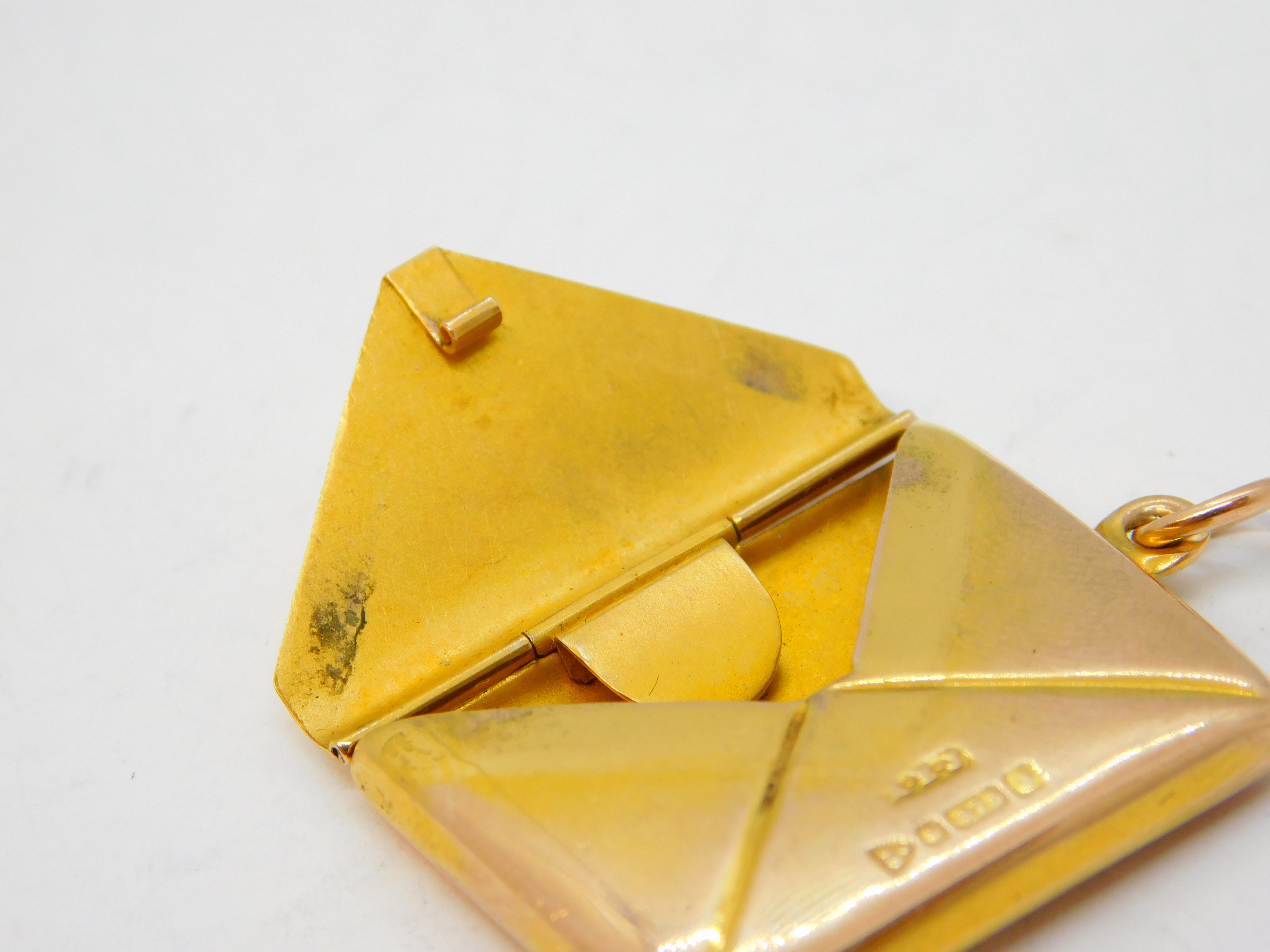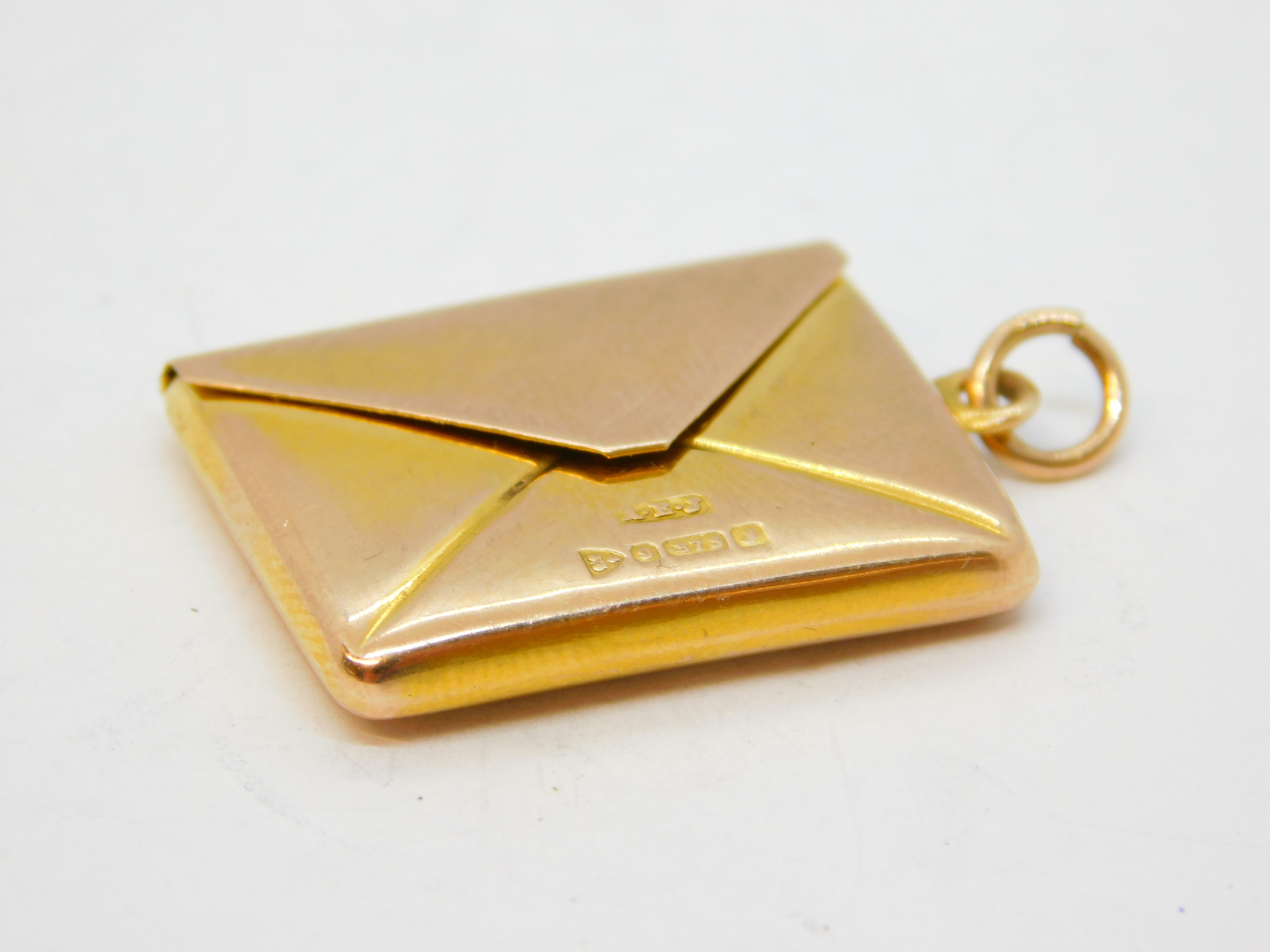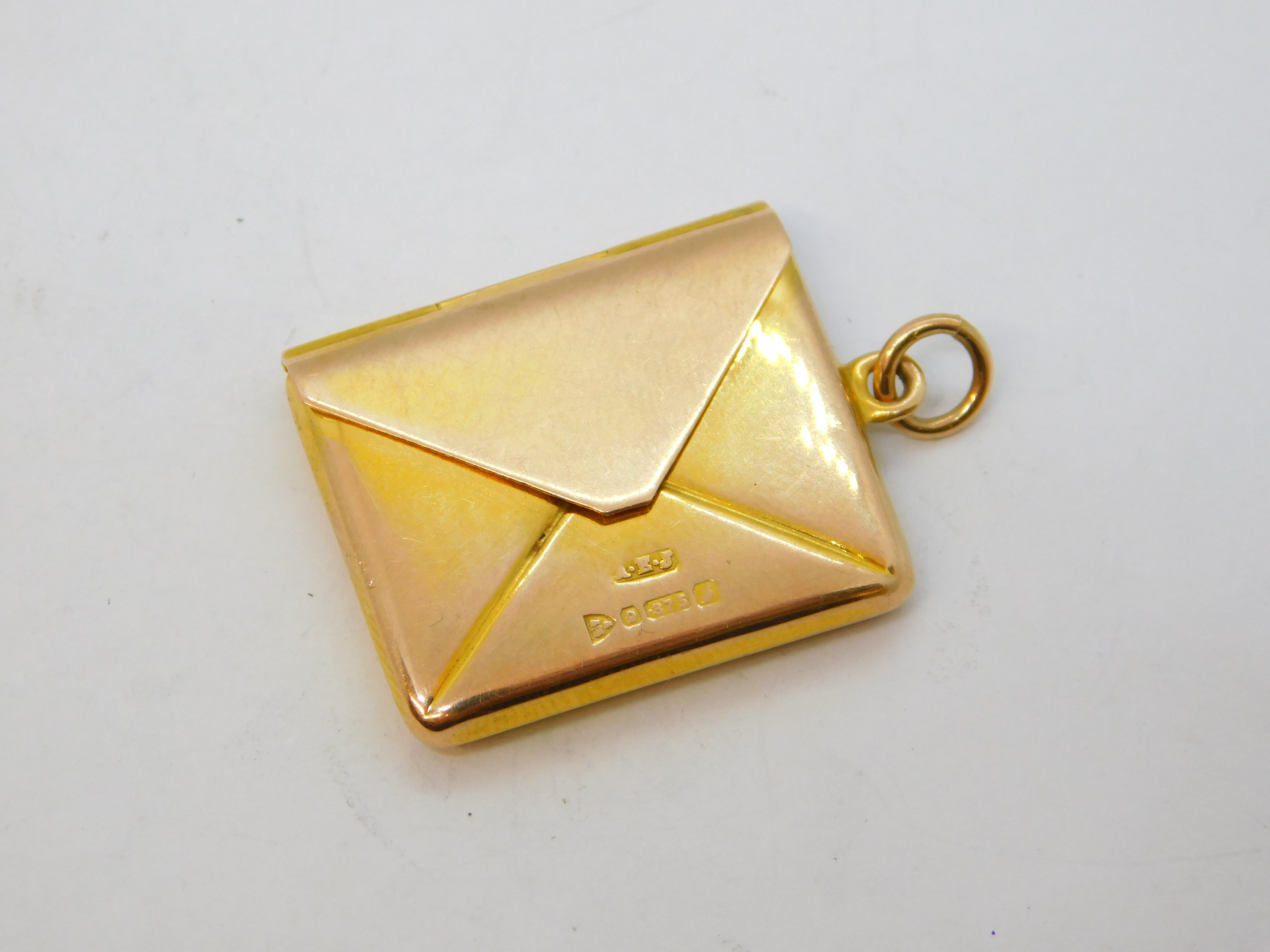Details: A fantastic and wonderfully designed antique edwardian 9ct rose gold envelope form novelty stamp holder fob pendant hallmarked Chester 1909 by Albert Ernest Jenkins, lovely condition clips shut beautifully and the hinge is in great order. This is a wonderful item that would make a perfect gift or addition to any collection. We are more than happy to provide XRF reports for items upon request.