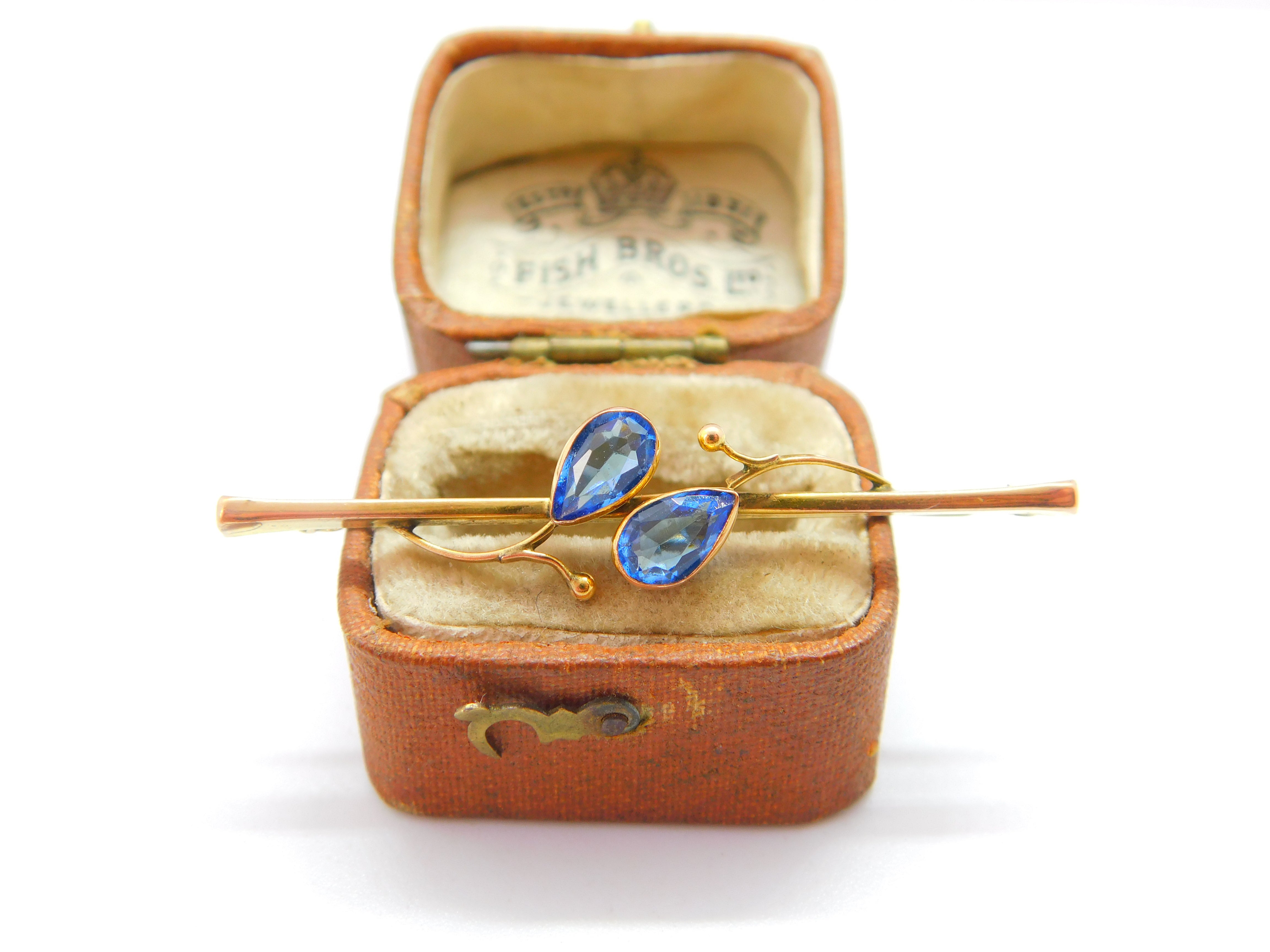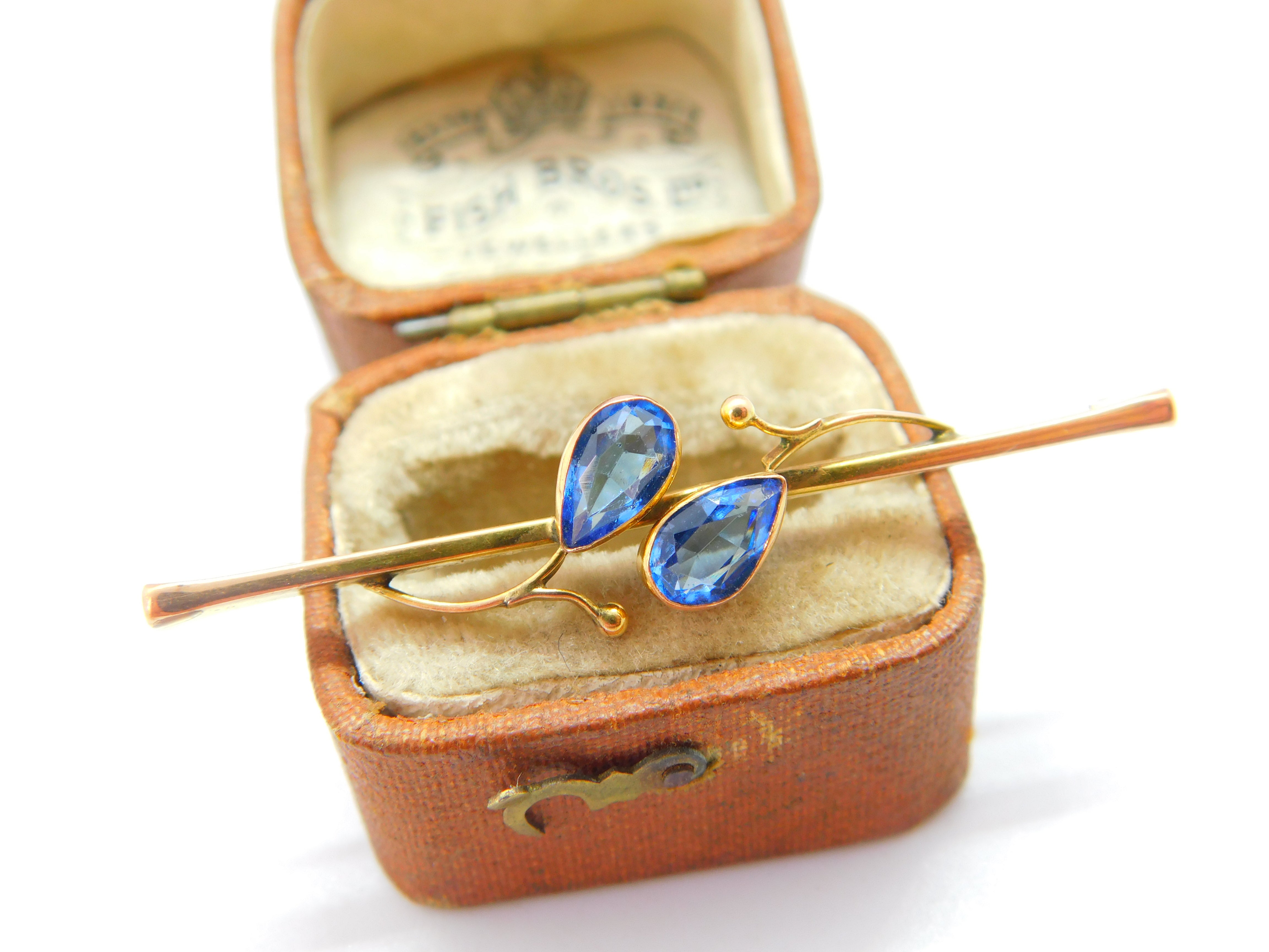 Details: A fantastic and wonderfully designed antique Edwardian 9ct yellow gold blue sapphire set crossover brooch hallmarked to the reverse c1910. This is a wonderful item that would make a perfect gift or addition to any collection. The BOX pictured is for PRESENTATION ONLY and is NOT included in the listings but used to frame the pictures unless specifically stated otherwise.